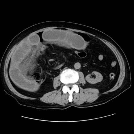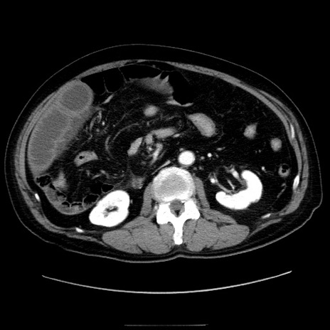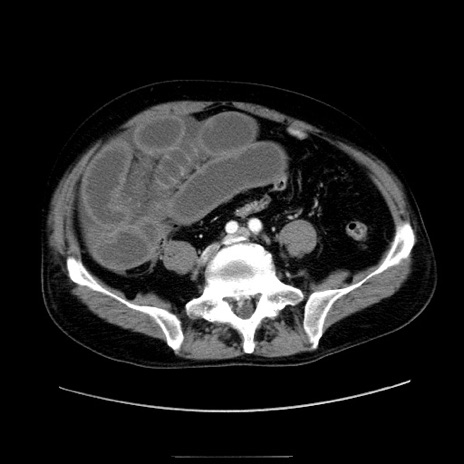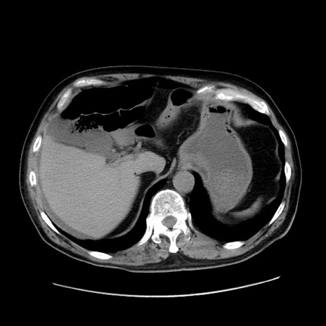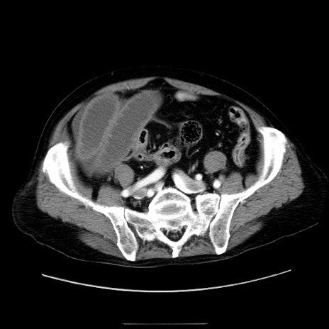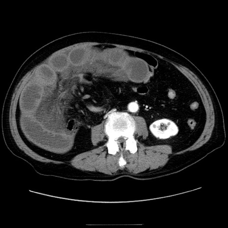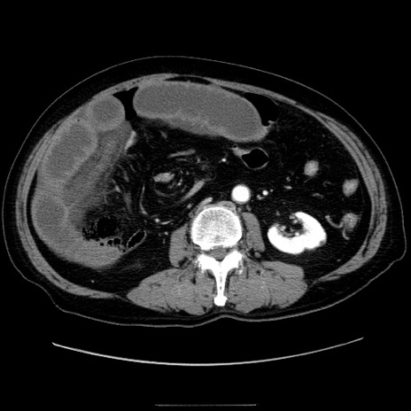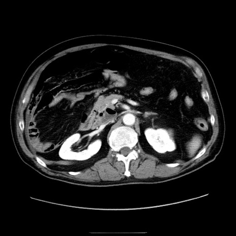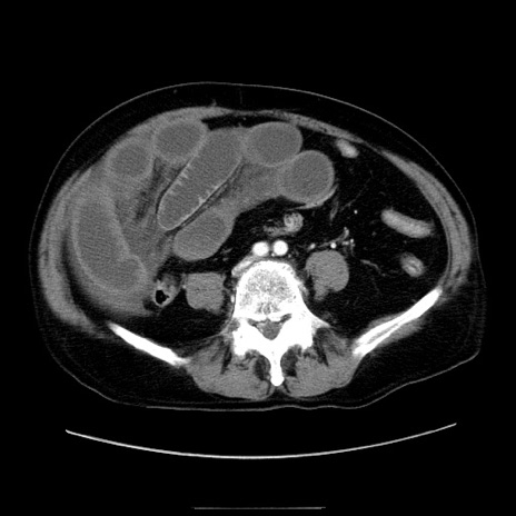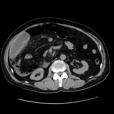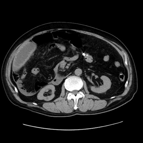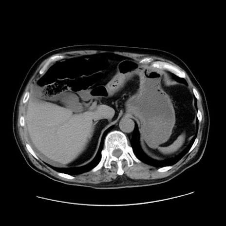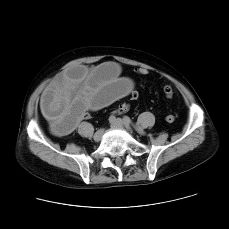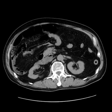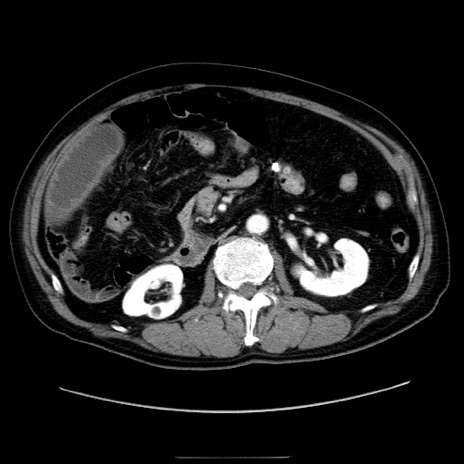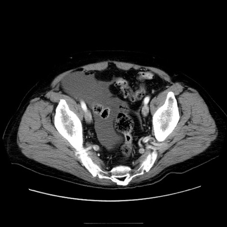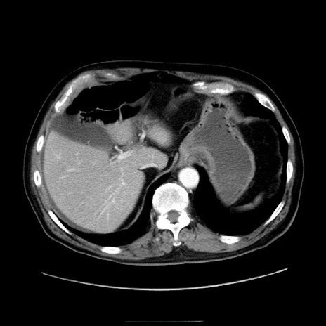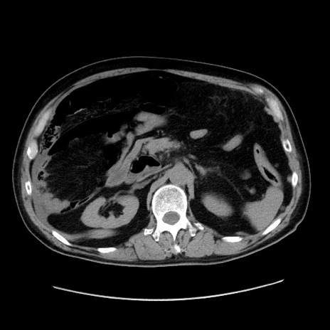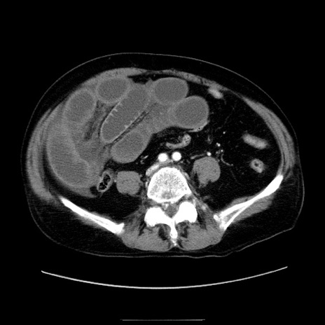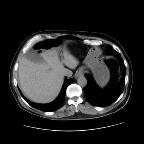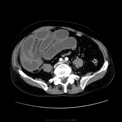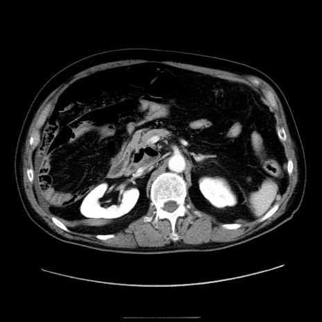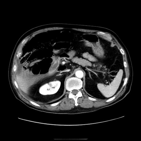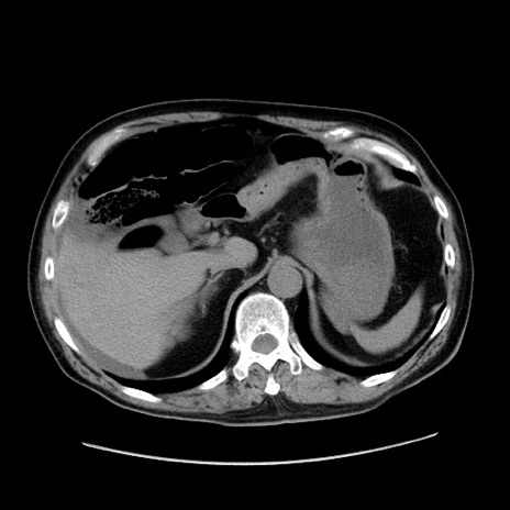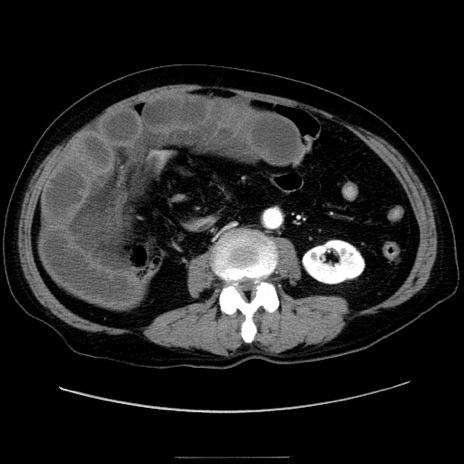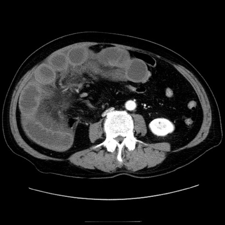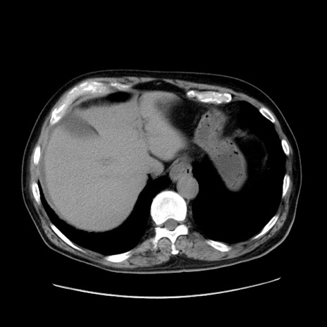 【症例】80歳代男性 【主訴】臍周囲痛 【現病歴】約6時間前から臍下部痛が出現。次第に腹部膨隆・背部痛も生じてきたため来院。背部痛の場所は変化しない。 【既往歴】腎盂腎炎 【身体所見】意識清明、BT 36.3℃、BP 131/87mmHg、P 87bpm、SpO2 100%(RA)、臍周囲自発痛・圧痛あり、反跳痛なし、自発痛部位に一致して板状硬あり、腹部膨隆、腸雑音減弱、CVA tenderness両側陰性。 【データ】WBC 19600、CRP 0.33