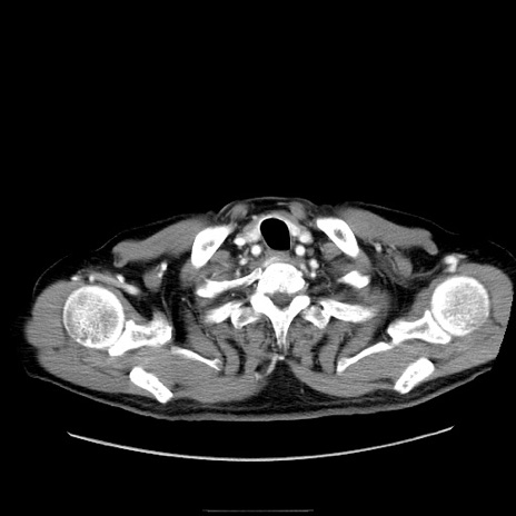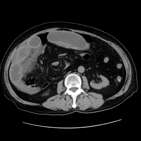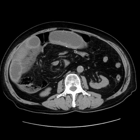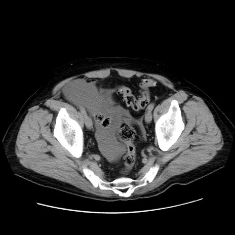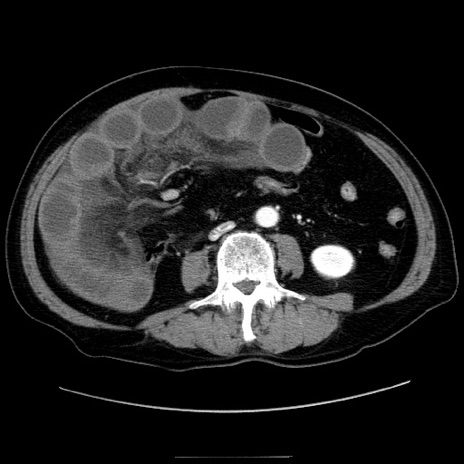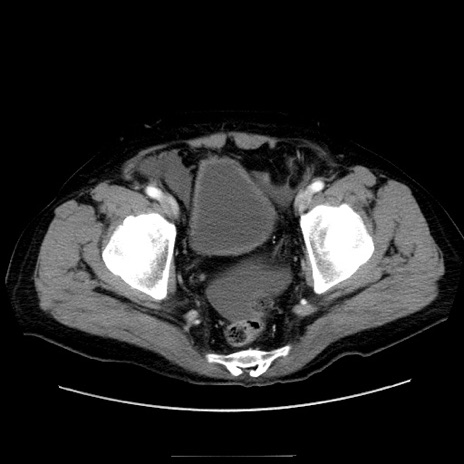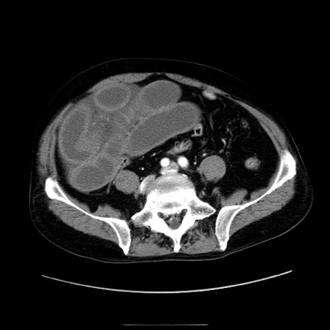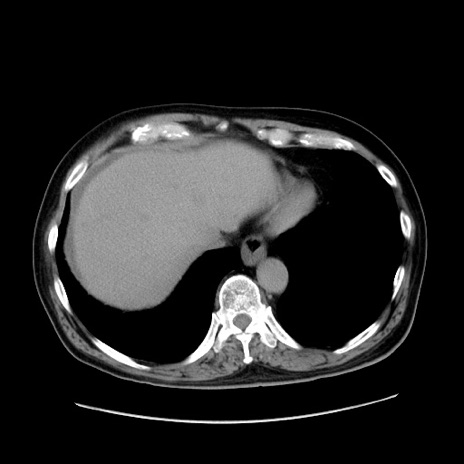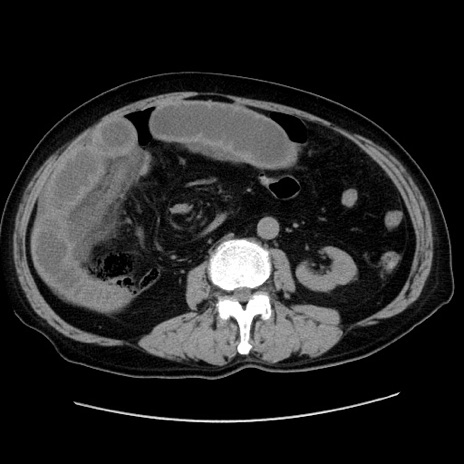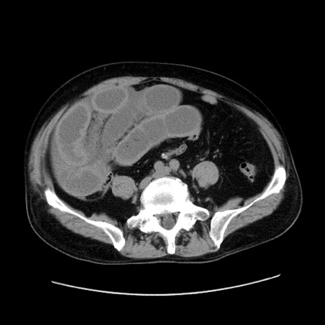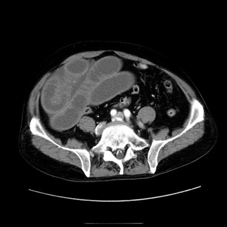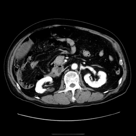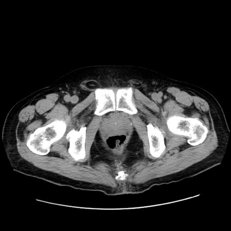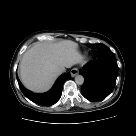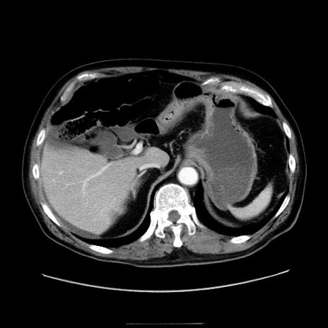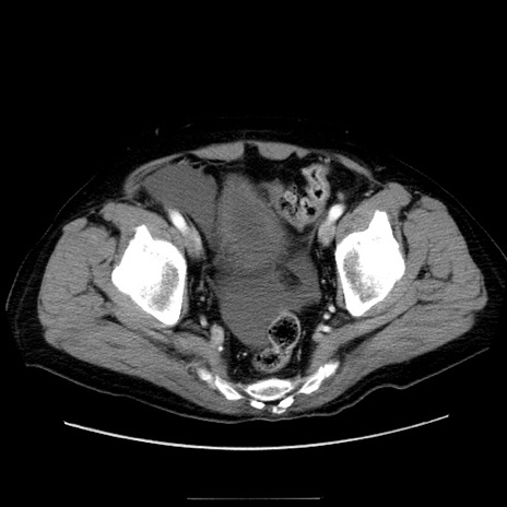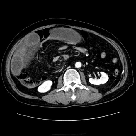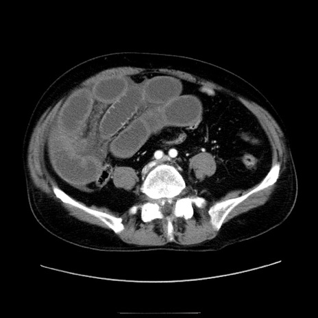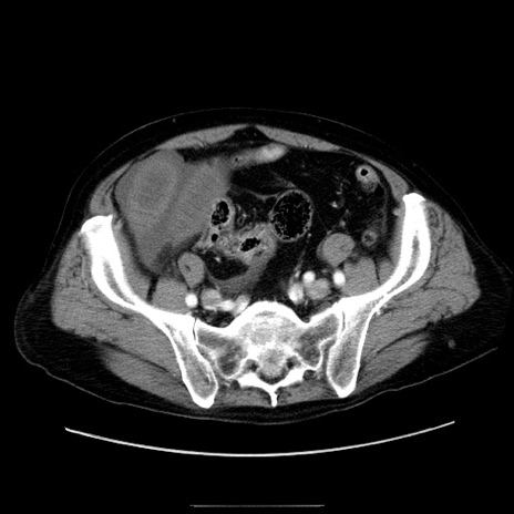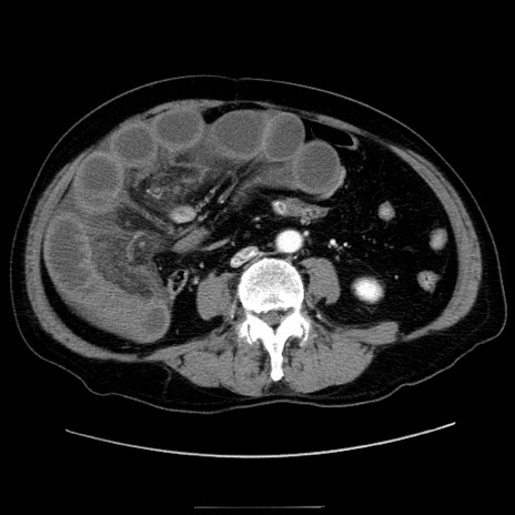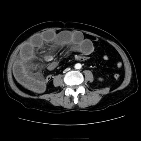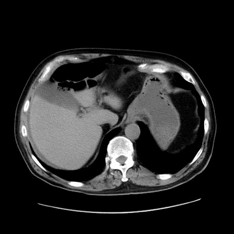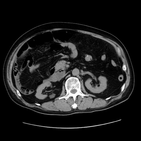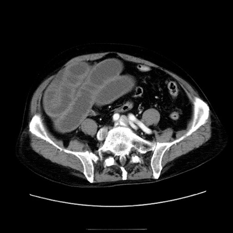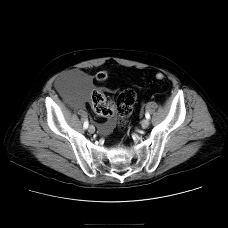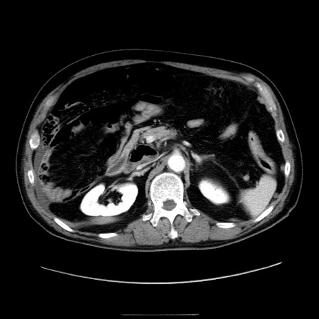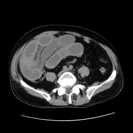 【症例】80歳代男性 【主訴】臍周囲痛 【現病歴】約6時間前から臍下部痛が出現。次第に腹部膨隆・背部痛も生じてきたため来院。背部痛の場所は変化しない。 【既往歴】腎盂腎炎 【身体所見】意識清明、BT 36.3℃、BP 131/87mmHg、P 87bpm、SpO2 100%(RA)、臍周囲自発痛・圧痛あり、反跳痛なし、自発痛部位に一致して板状硬あり、腹部膨隆、腸雑音減弱、CVA tenderness両側陰性。 【データ】WBC 19600、CRP 0.33