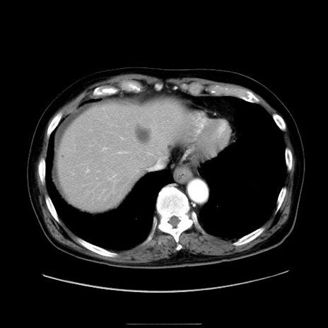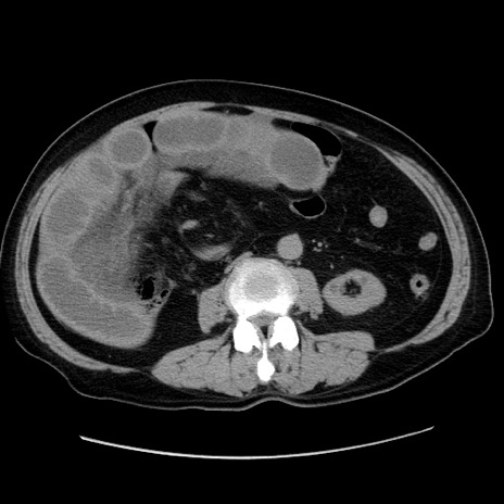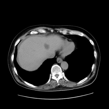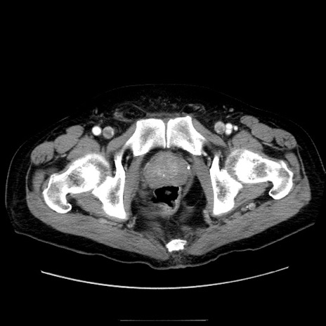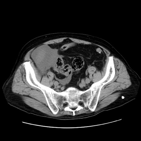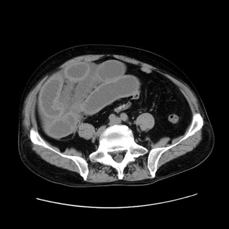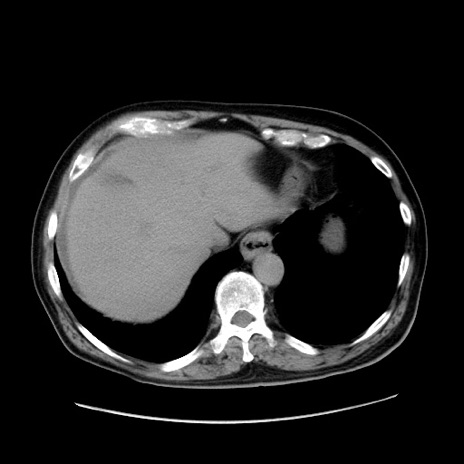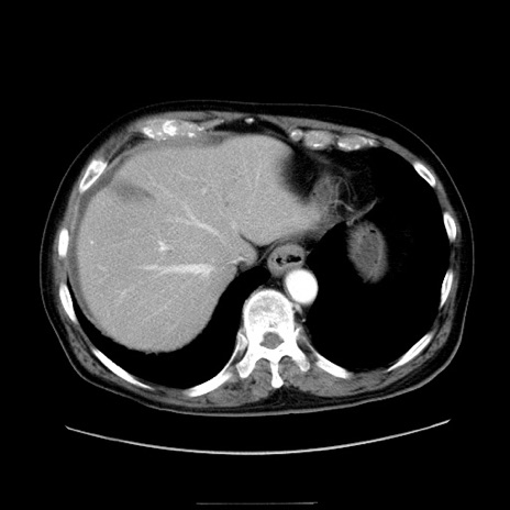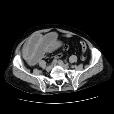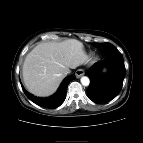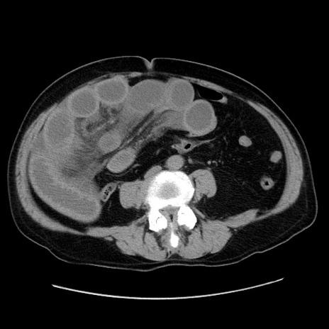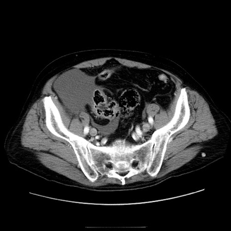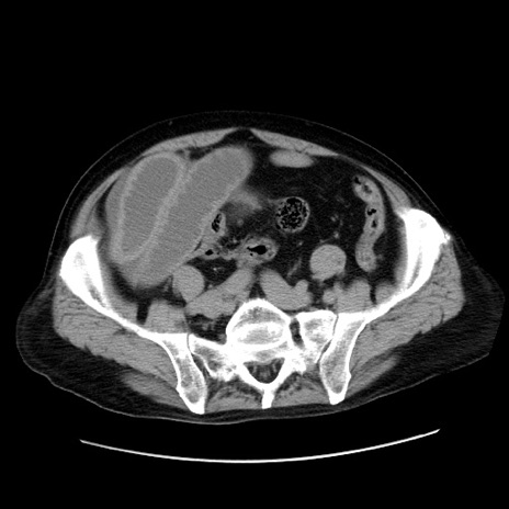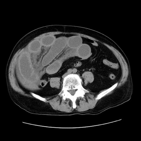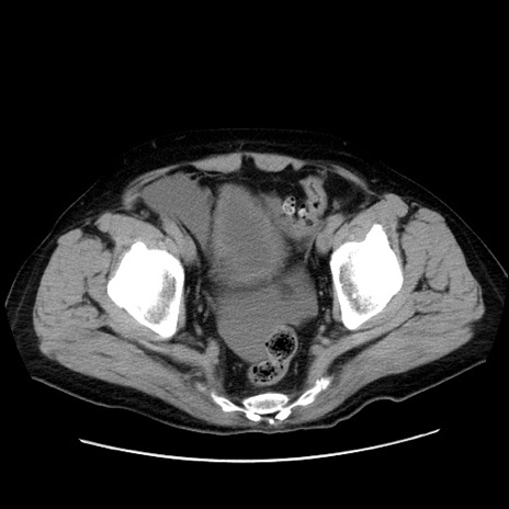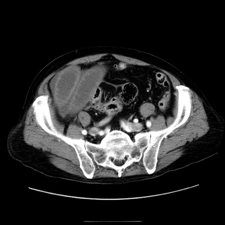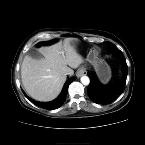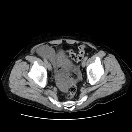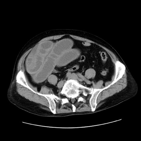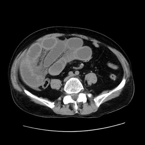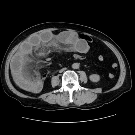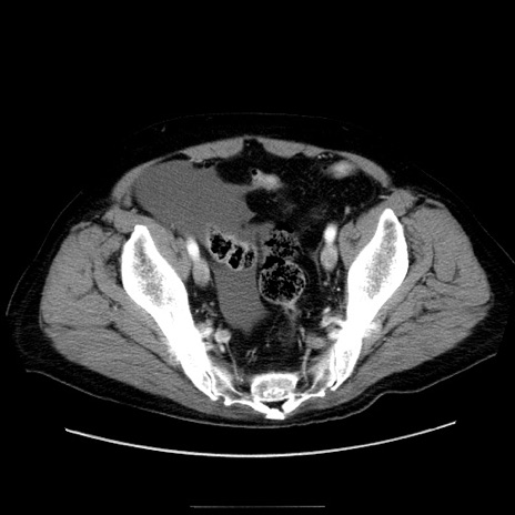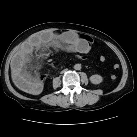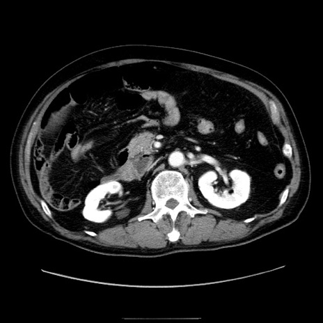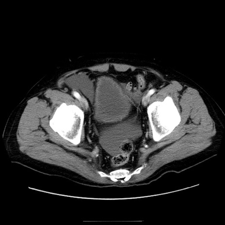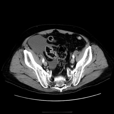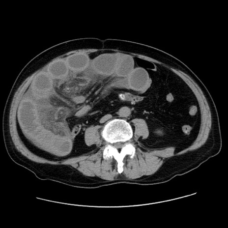 【症例】80歳代男性 【主訴】臍周囲痛 【現病歴】約6時間前から臍下部痛が出現。次第に腹部膨隆・背部痛も生じてきたため来院。背部痛の場所は変化しない。 【既往歴】腎盂腎炎 【身体所見】意識清明、BT 36.3℃、BP 131/87mmHg、P 87bpm、SpO2 100%(RA)、臍周囲自発痛・圧痛あり、反跳痛なし、自発痛部位に一致して板状硬あり、腹部膨隆、腸雑音減弱、CVA tenderness両側陰性。 【データ】WBC 19600、CRP 0.33
