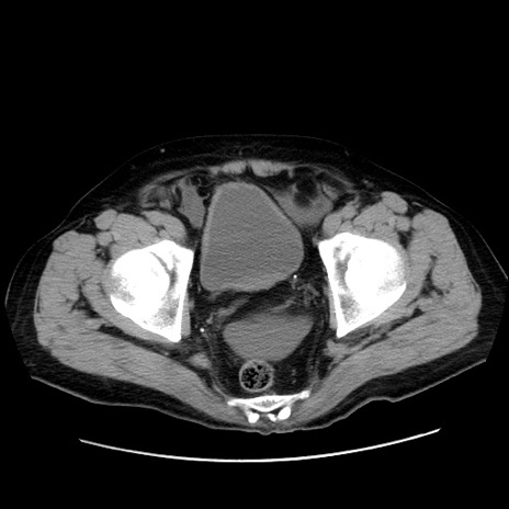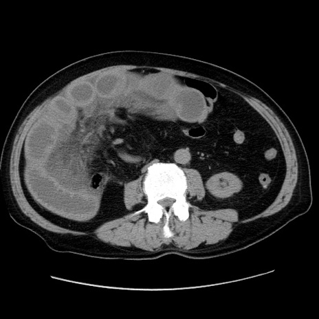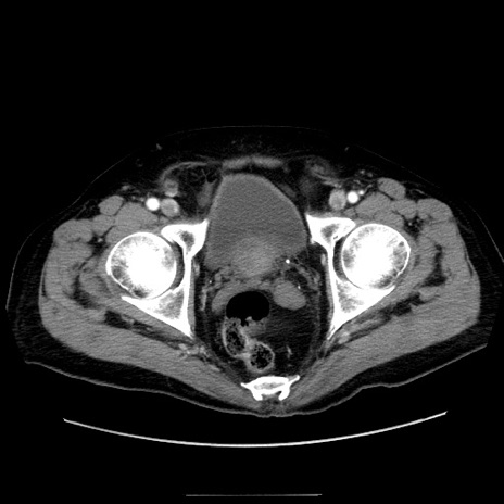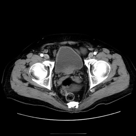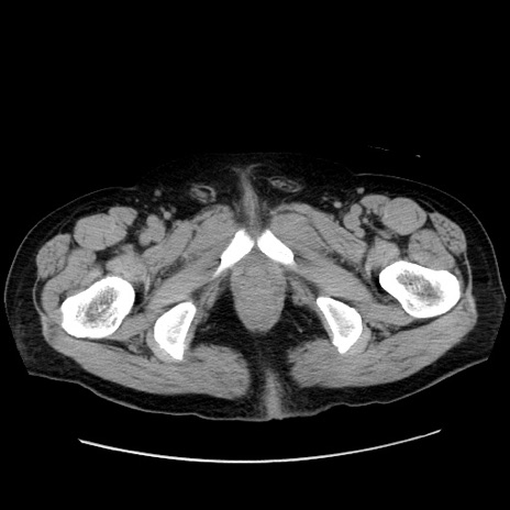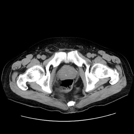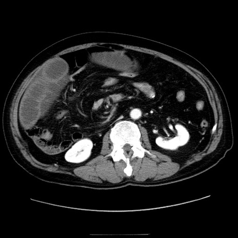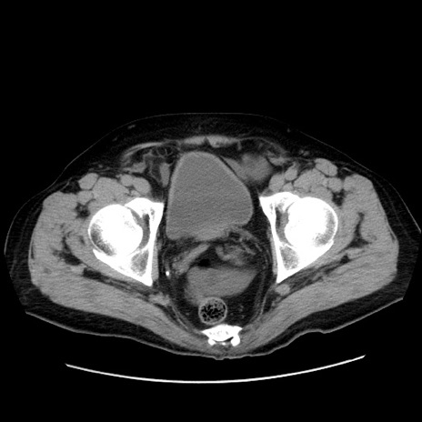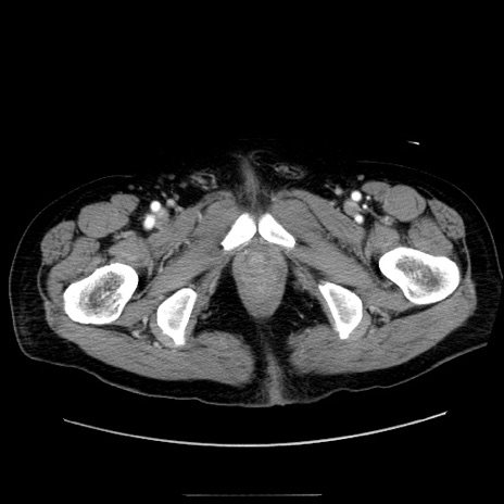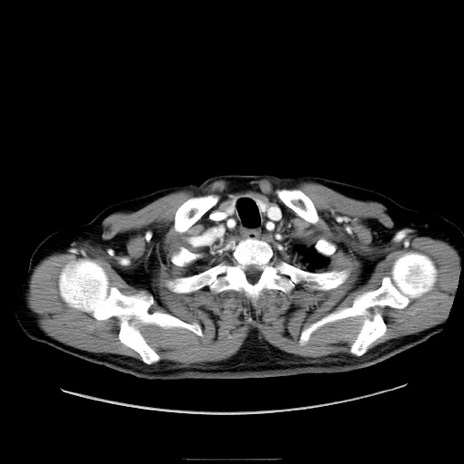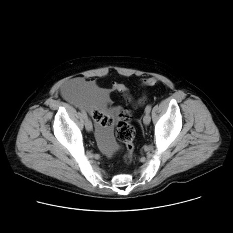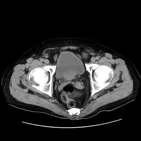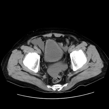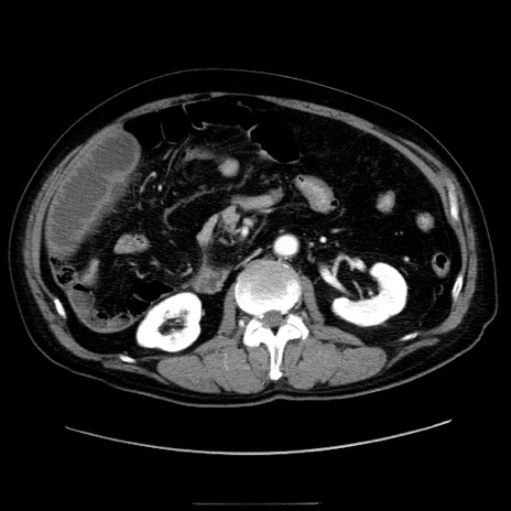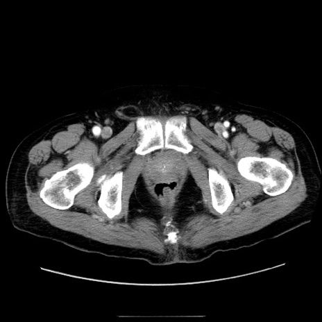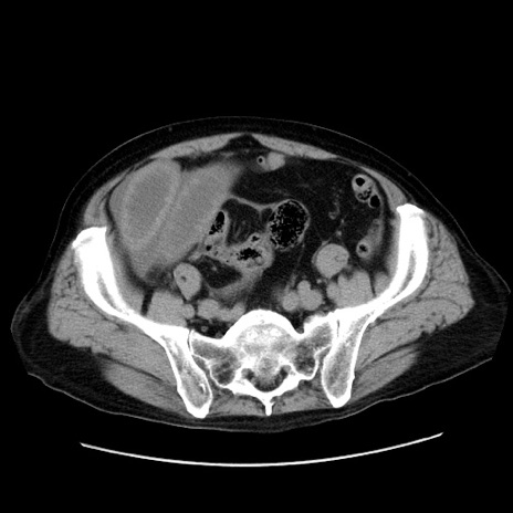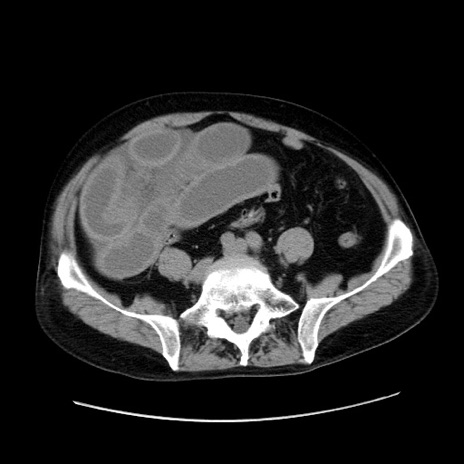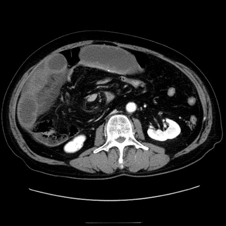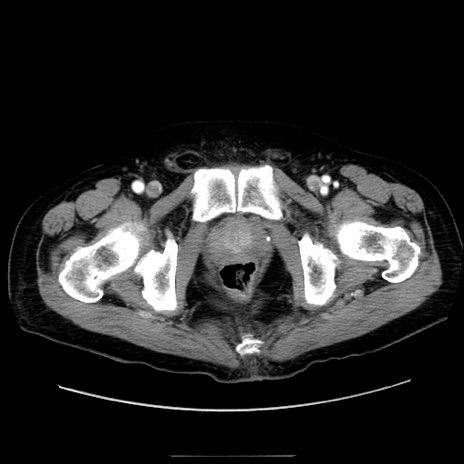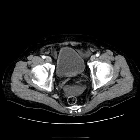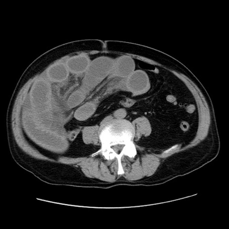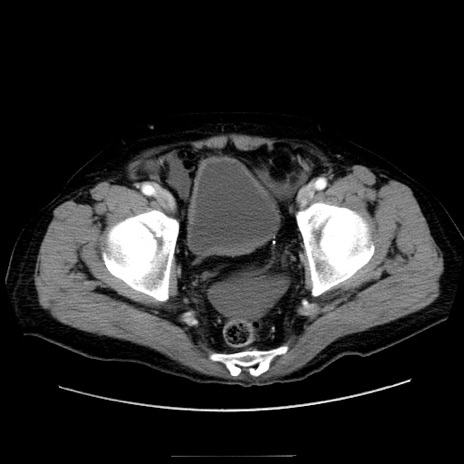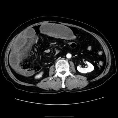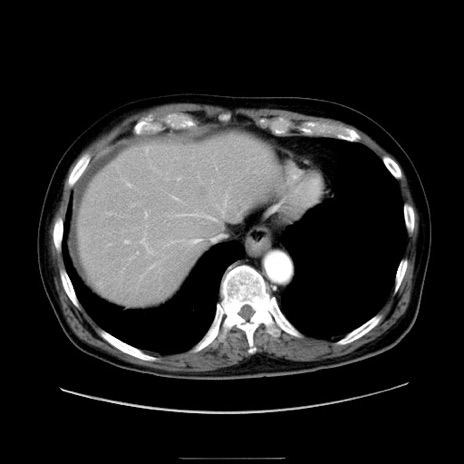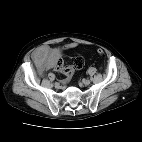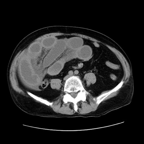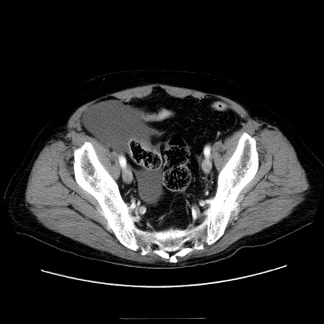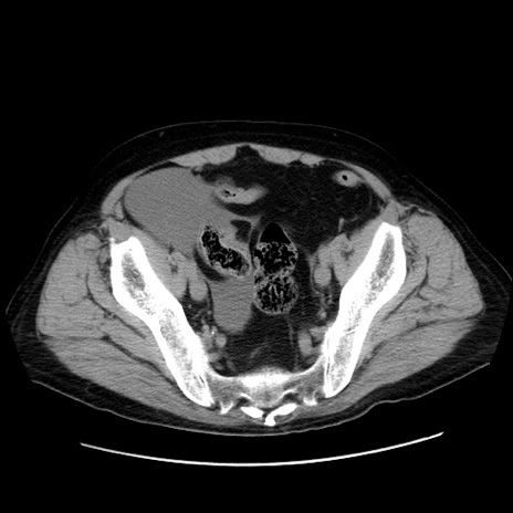 【症例】80歳代男性 【主訴】臍周囲痛 【現病歴】約6時間前から臍下部痛が出現。次第に腹部膨隆・背部痛も生じてきたため来院。背部痛の場所は変化しない。 【既往歴】腎盂腎炎 【身体所見】意識清明、BT 36.3℃、BP 131/87mmHg、P 87bpm、SpO2 100%(RA)、臍周囲自発痛・圧痛あり、反跳痛なし、自発痛部位に一致して板状硬あり、腹部膨隆、腸雑音減弱、CVA tenderness両側陰性。 【データ】WBC 19600、CRP 0.33