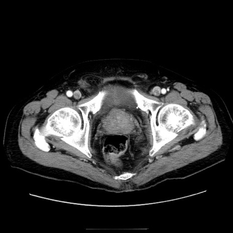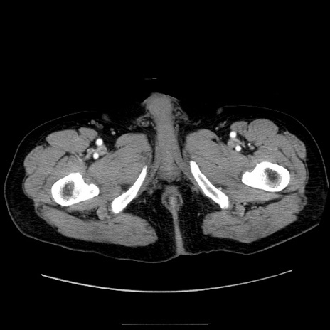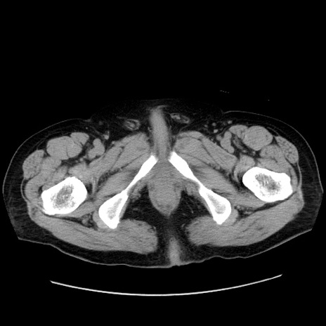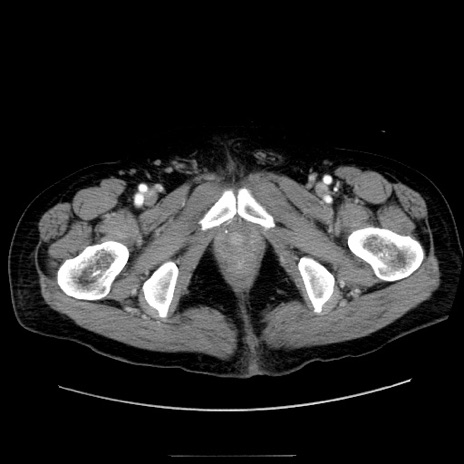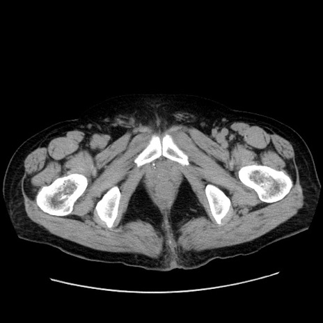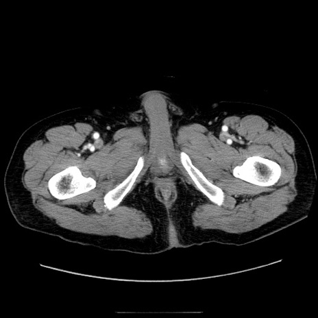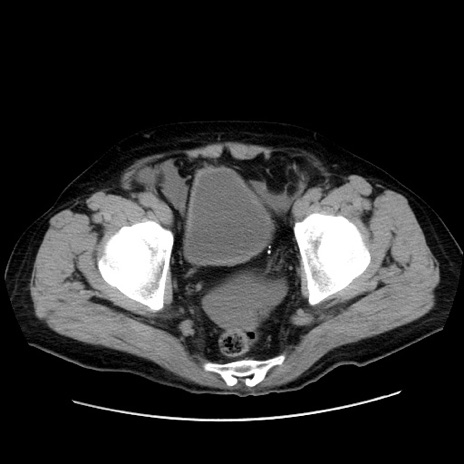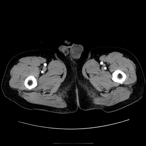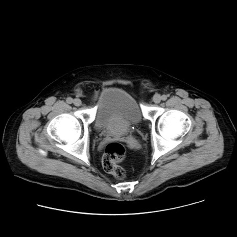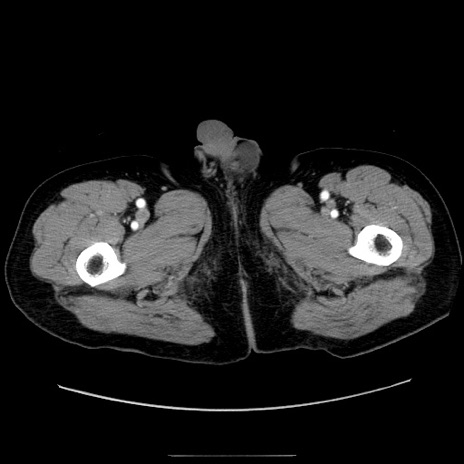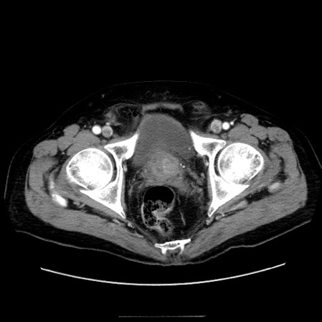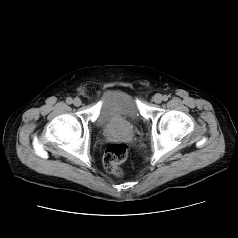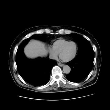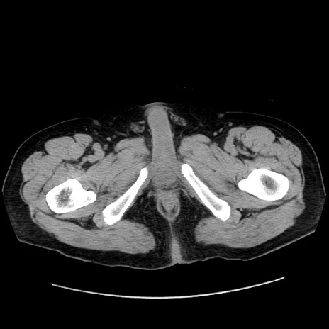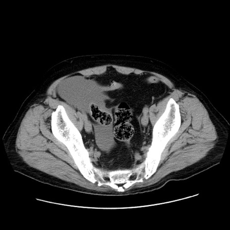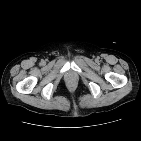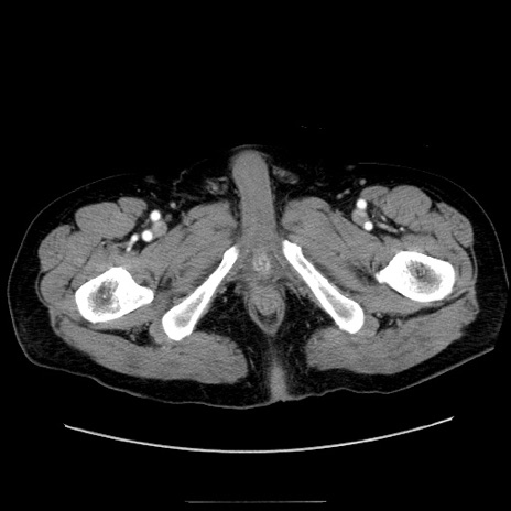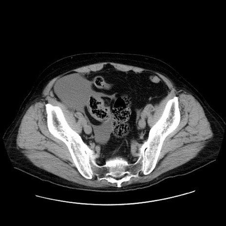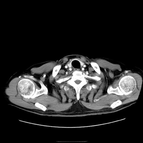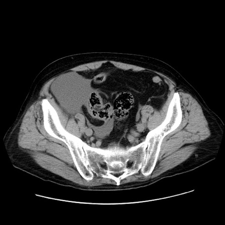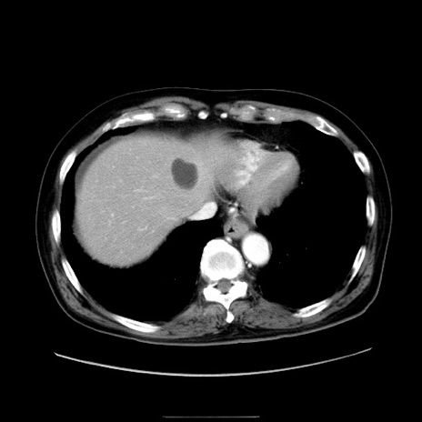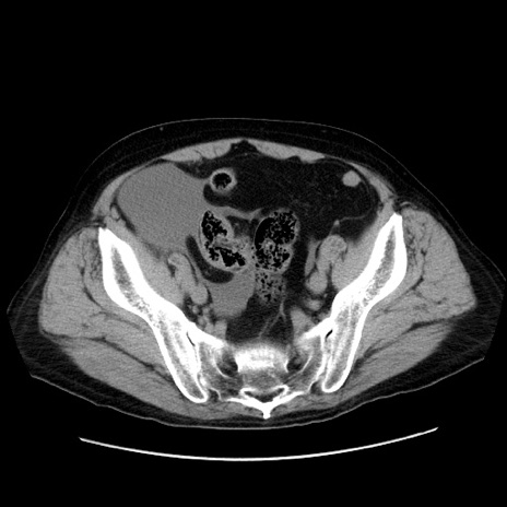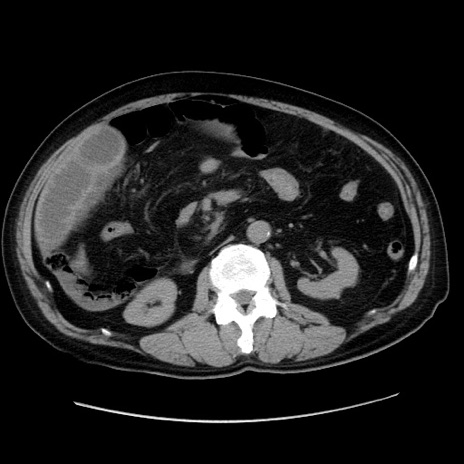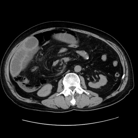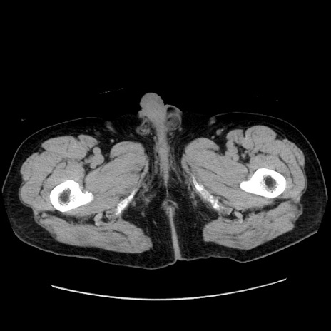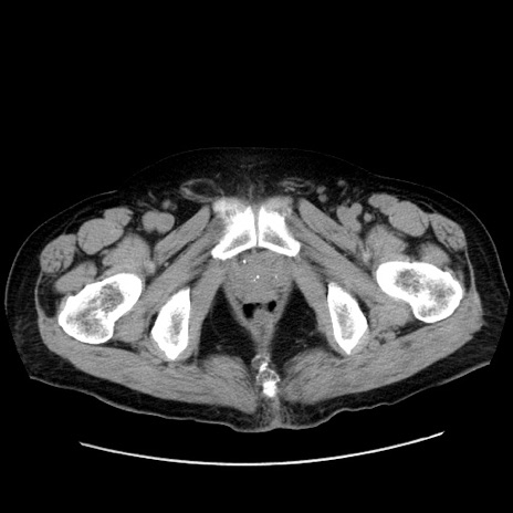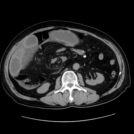 【症例】80歳代男性 【主訴】臍周囲痛 【現病歴】約6時間前から臍下部痛が出現。次第に腹部膨隆・背部痛も生じてきたため来院。背部痛の場所は変化しない。 【既往歴】腎盂腎炎 【身体所見】意識清明、BT 36.3℃、BP 131/87mmHg、P 87bpm、SpO2 100%(RA)、臍周囲自発痛・圧痛あり、反跳痛なし、自発痛部位に一致して板状硬あり、腹部膨隆、腸雑音減弱、CVA tenderness両側陰性。 【データ】WBC 19600、CRP 0.33