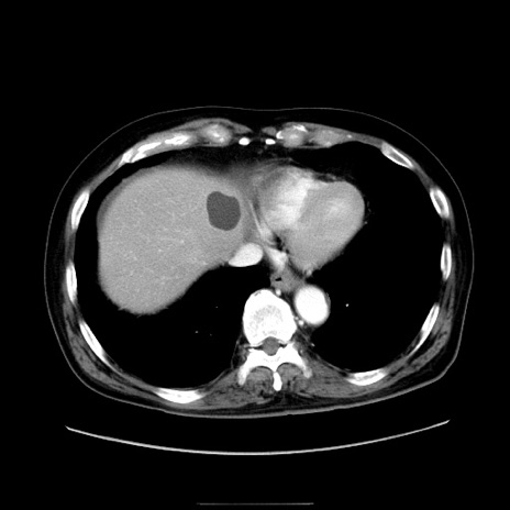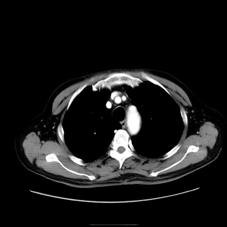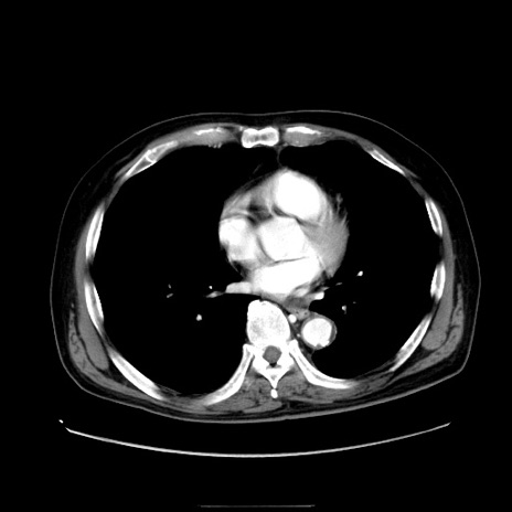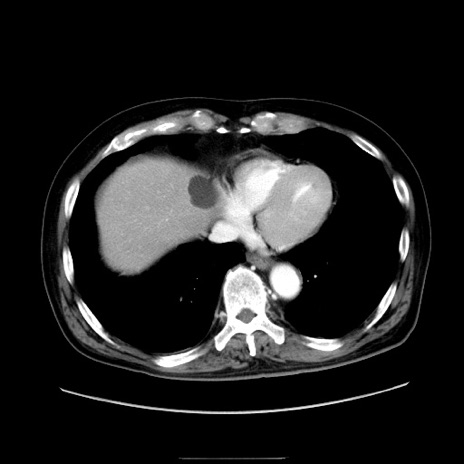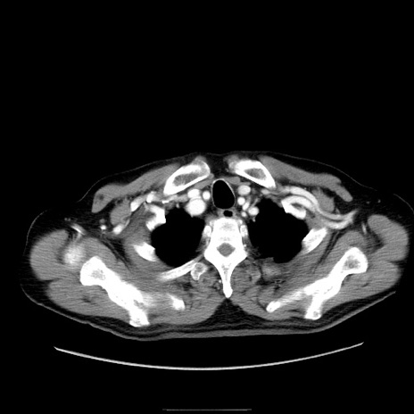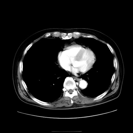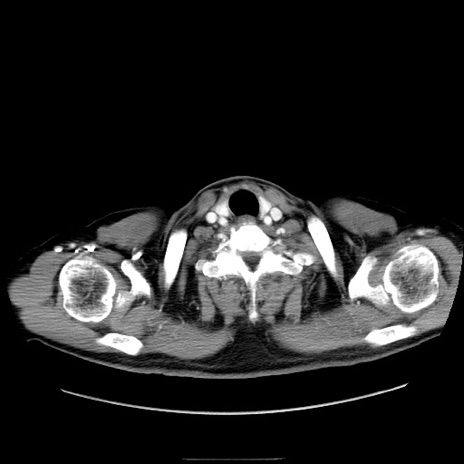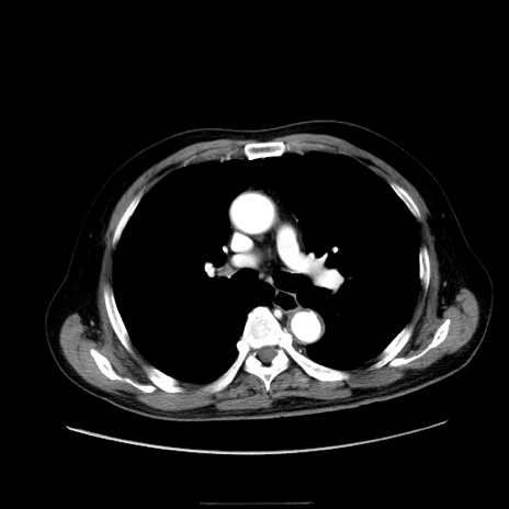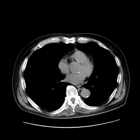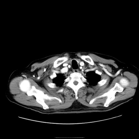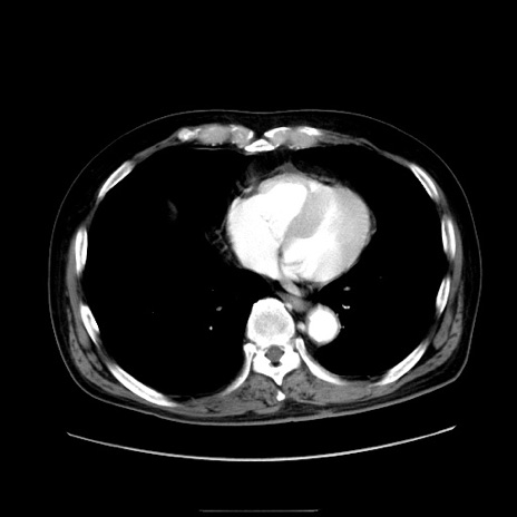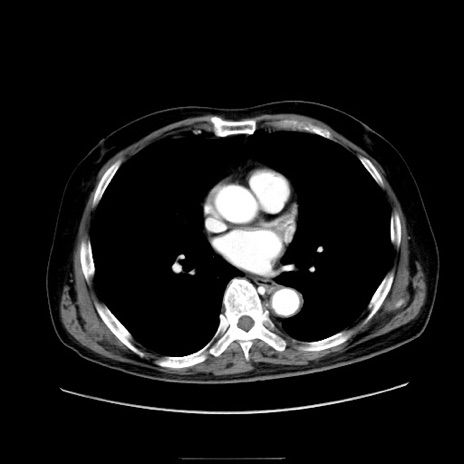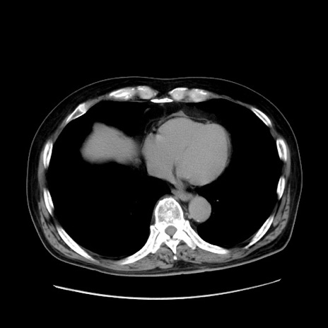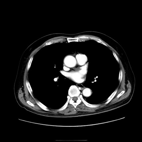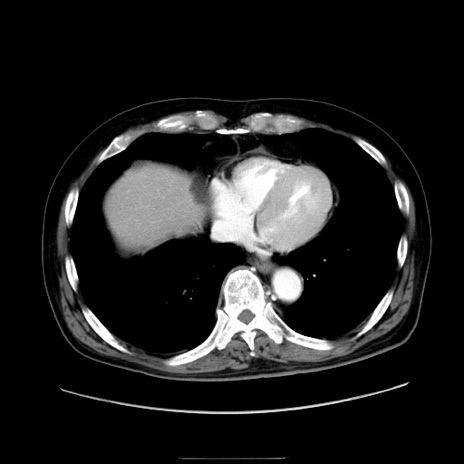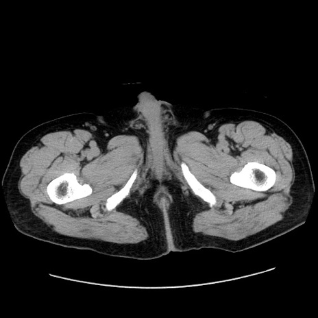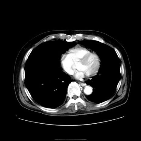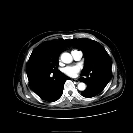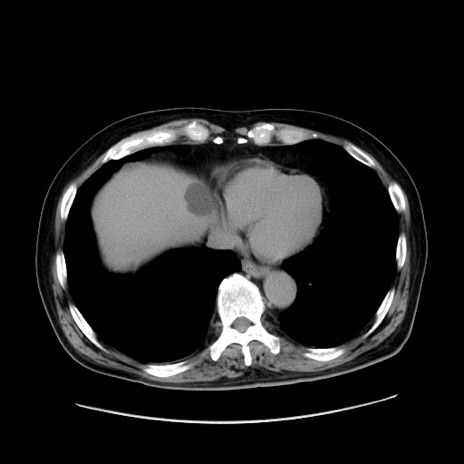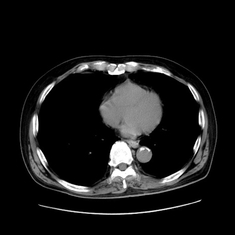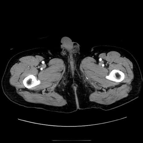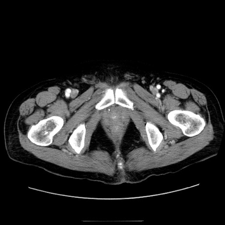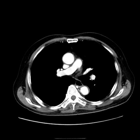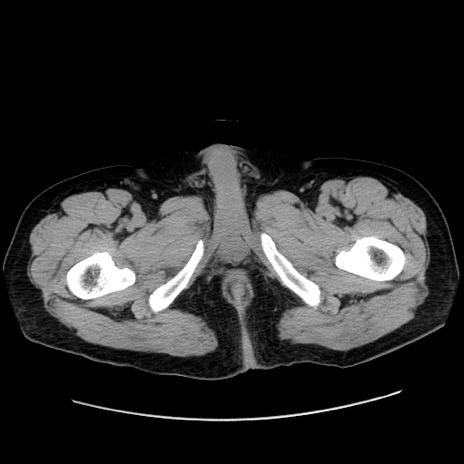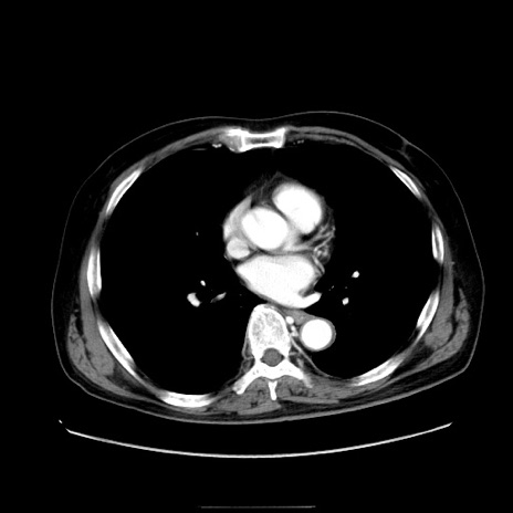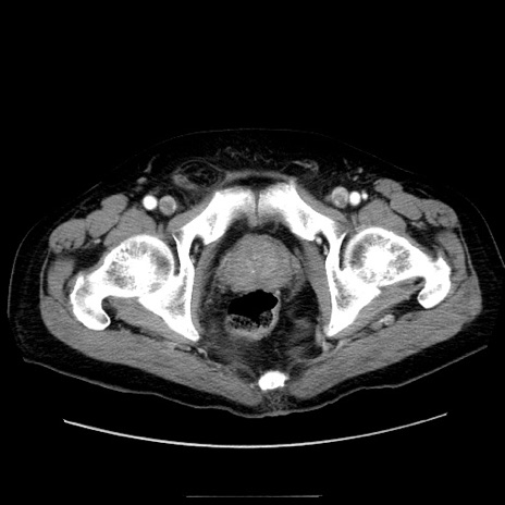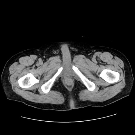 【症例】80歳代男性 【主訴】臍周囲痛 【現病歴】約6時間前から臍下部痛が出現。次第に腹部膨隆・背部痛も生じてきたため来院。背部痛の場所は変化しない。 【既往歴】腎盂腎炎 【身体所見】意識清明、BT 36.3℃、BP 131/87mmHg、P 87bpm、SpO2 100%(RA)、臍周囲自発痛・圧痛あり、反跳痛なし、自発痛部位に一致して板状硬あり、腹部膨隆、腸雑音減弱、CVA tenderness両側陰性。 【データ】WBC 19600、CRP 0.33