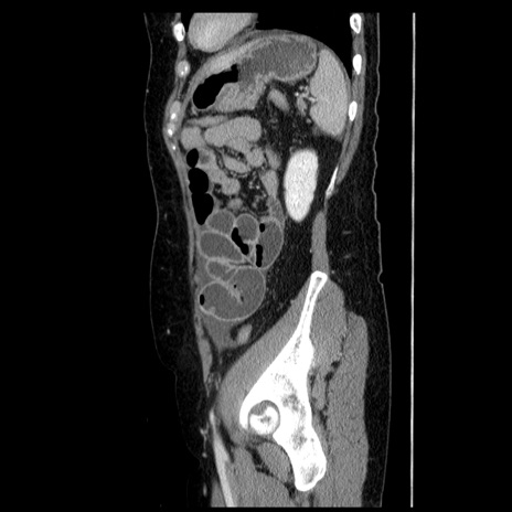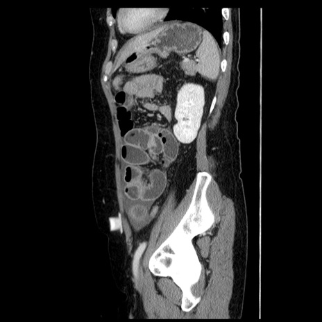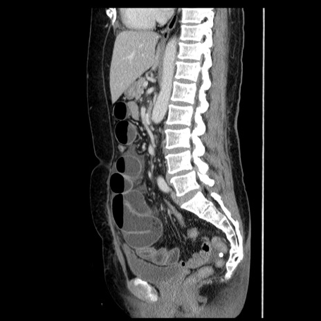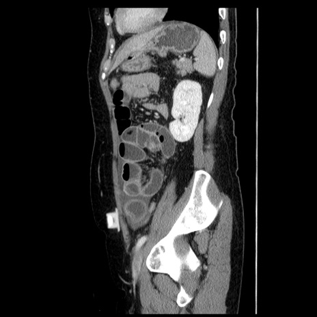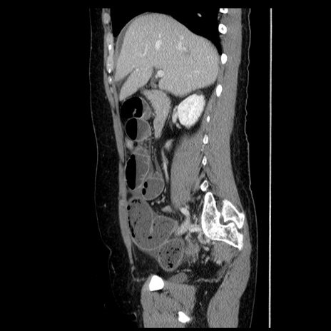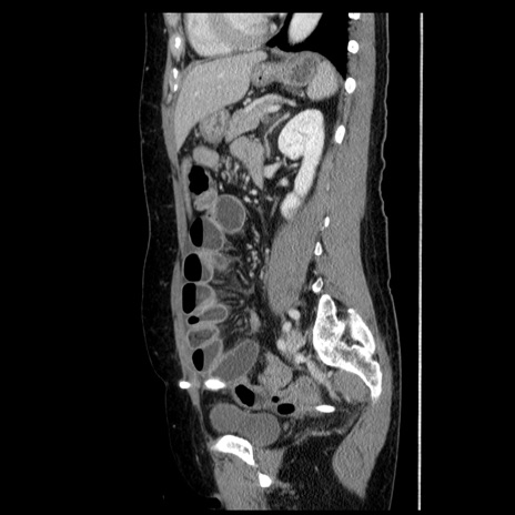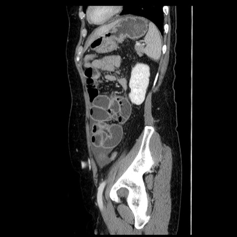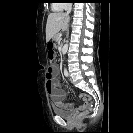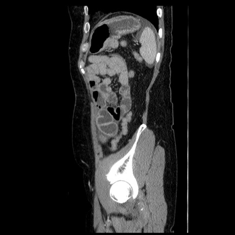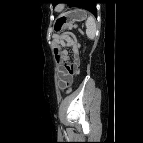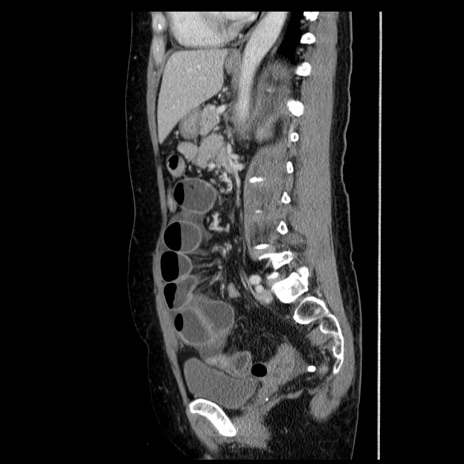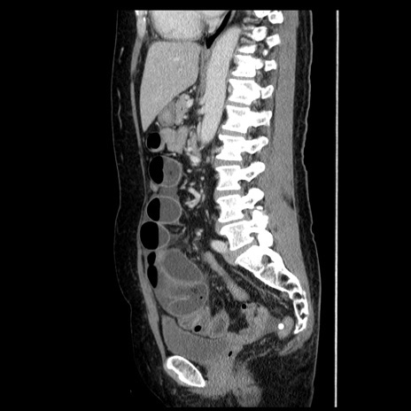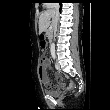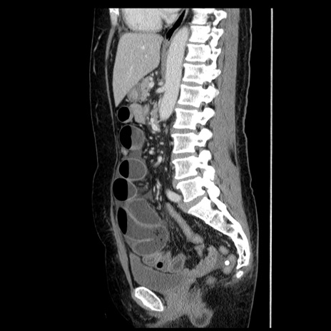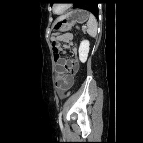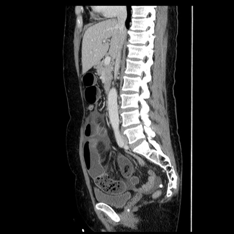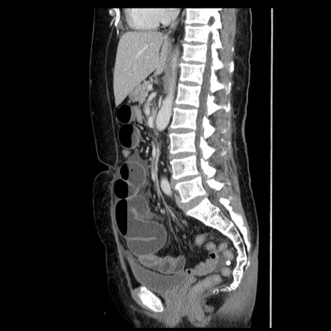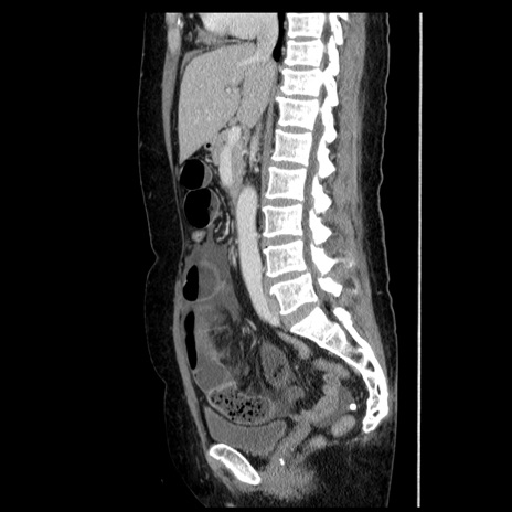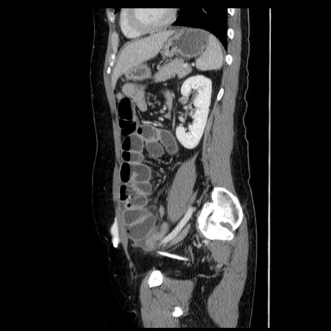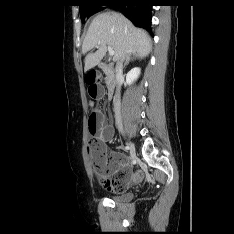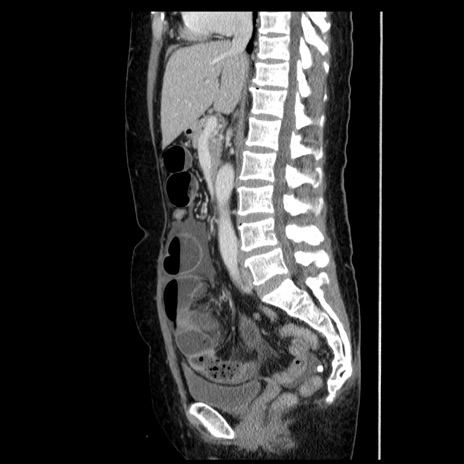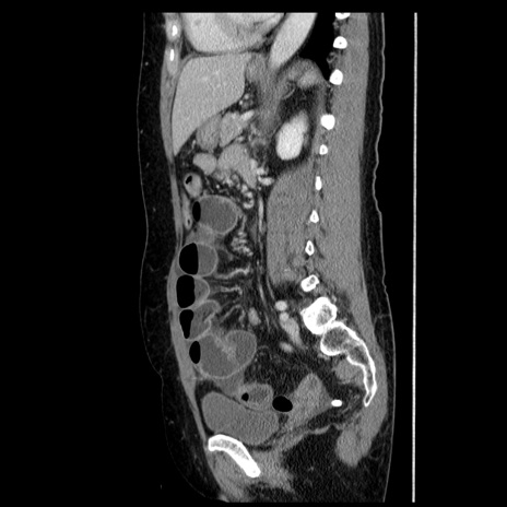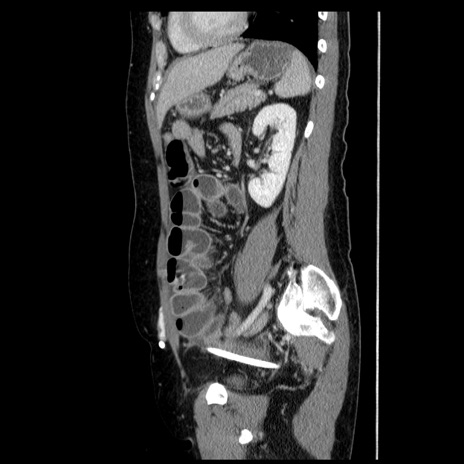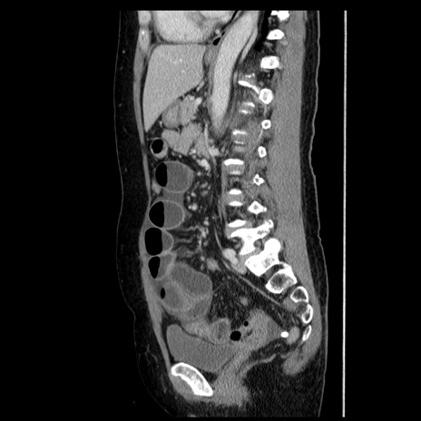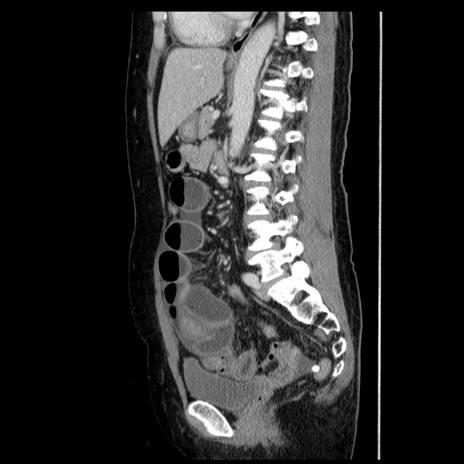 【症例】50歳代女性 【主訴】下腹部痛 【現病歴】本日朝より下痢2回あり。 昼食を食べた後、嘔吐3回、下腹部痛認め、症状軽快せず、当院救急搬送。 最終食事:本日昼(生ものなし)。 昨日の夜、刺身を食ぺたとのこと。周囲に同様の症状の者なし。普段、排便は毎日あるとのこと。 【既往歴】卵巣癌術後(8年前に当院で卵巣摘出) 【身体所見】 意識清明、腹部:平坦、腸蠕動音→、やや硬、下腹部自発痛・圧痛あり、反跳痛あり、筋性防御なし。 【データ】WBC 16000、CRP 0.01