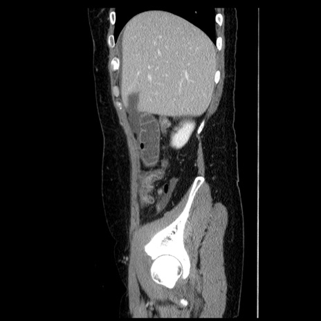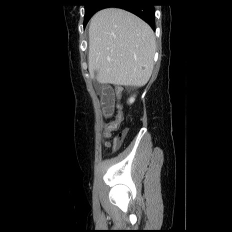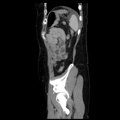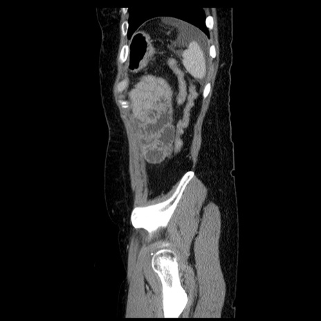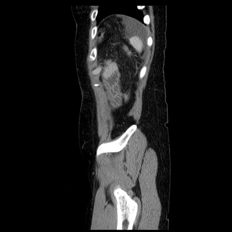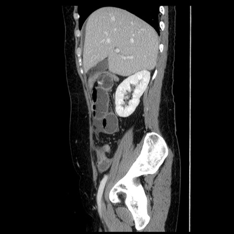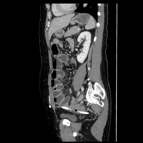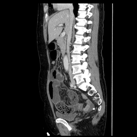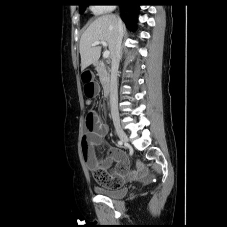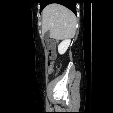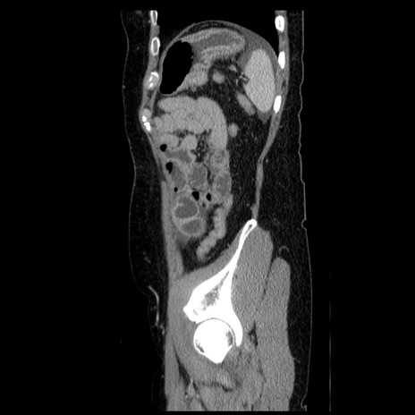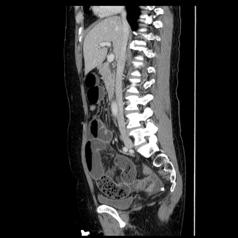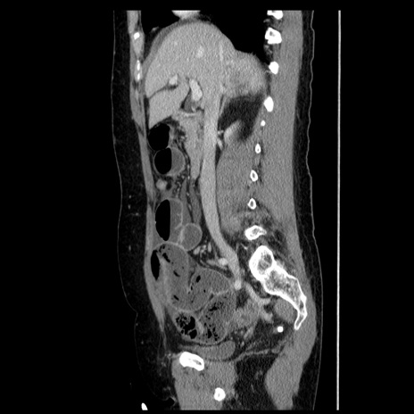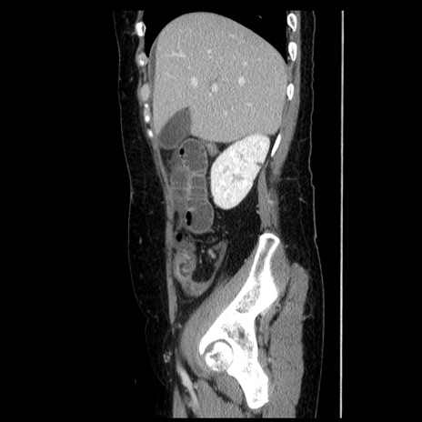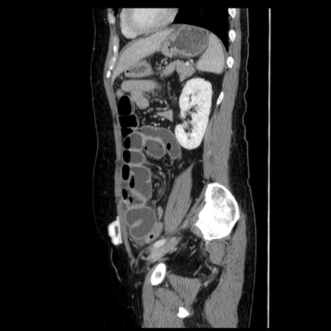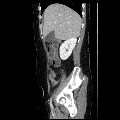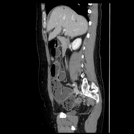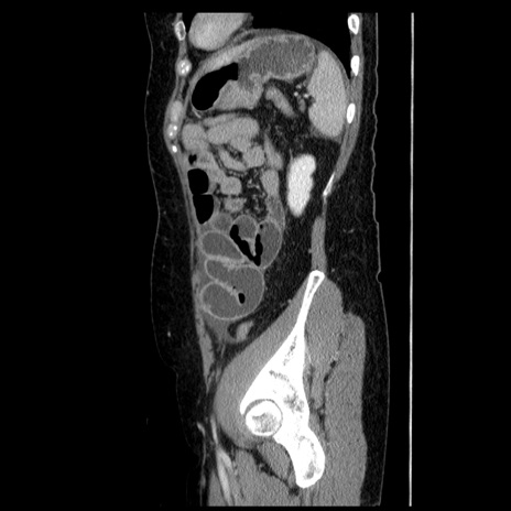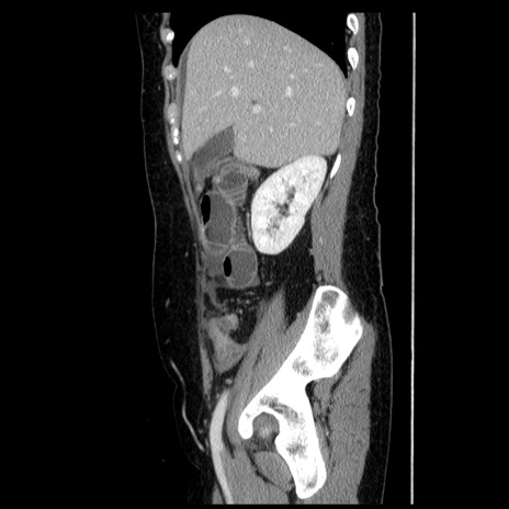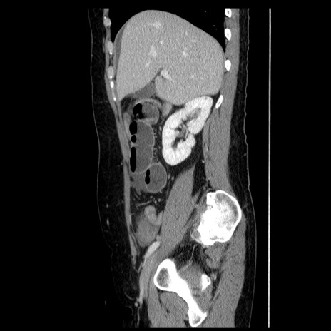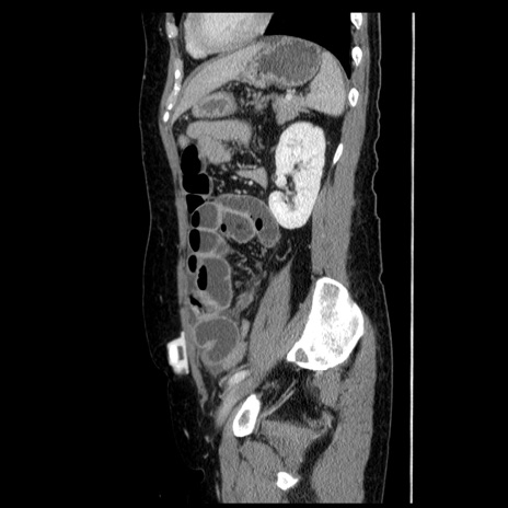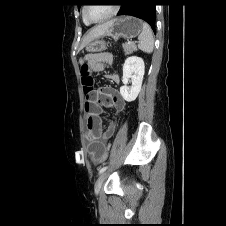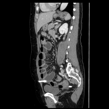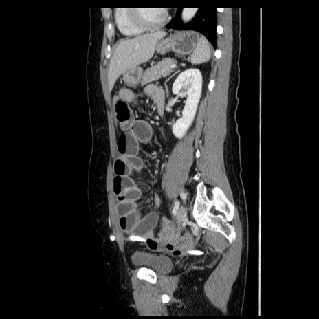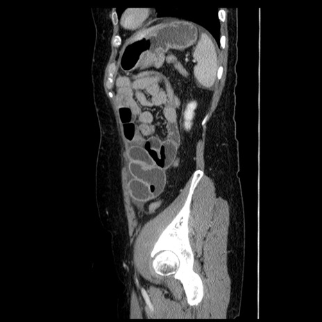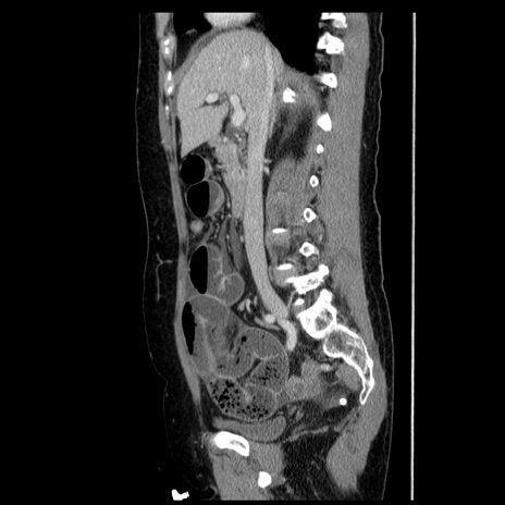 【症例】50歳代女性 【主訴】下腹部痛 【現病歴】本日朝より下痢2回あり。 昼食を食べた後、嘔吐3回、下腹部痛認め、症状軽快せず、当院救急搬送。 最終食事:本日昼(生ものなし)。 昨日の夜、刺身を食ぺたとのこと。周囲に同様の症状の者なし。普段、排便は毎日あるとのこと。 【既往歴】卵巣癌術後(8年前に当院で卵巣摘出) 【身体所見】 意識清明、腹部:平坦、腸蠕動音→、やや硬、下腹部自発痛・圧痛あり、反跳痛あり、筋性防御なし。 【データ】WBC 16000、CRP 0.01