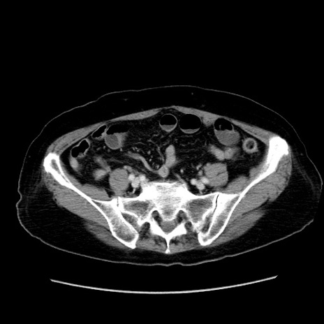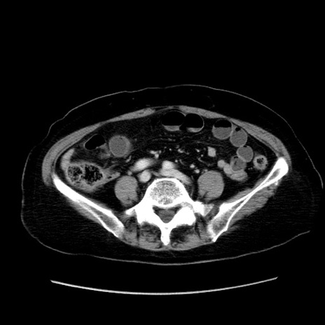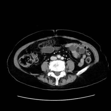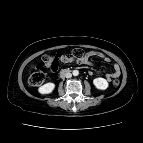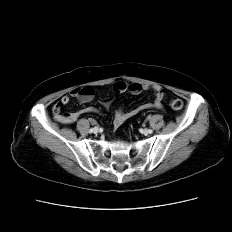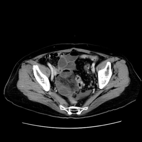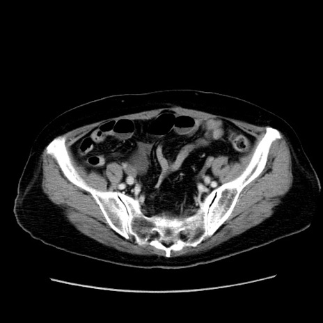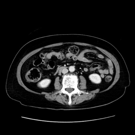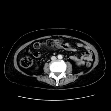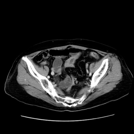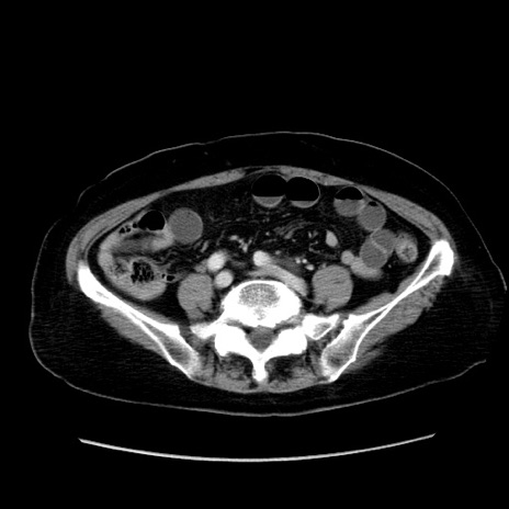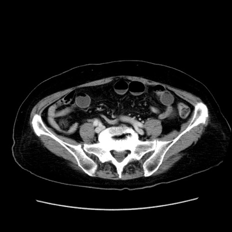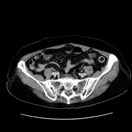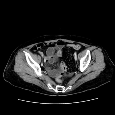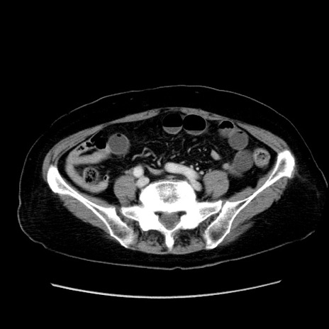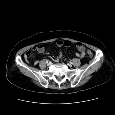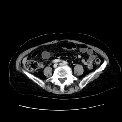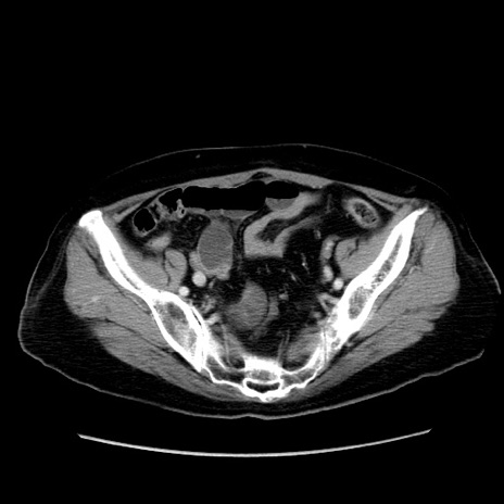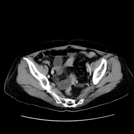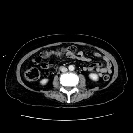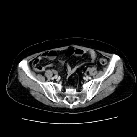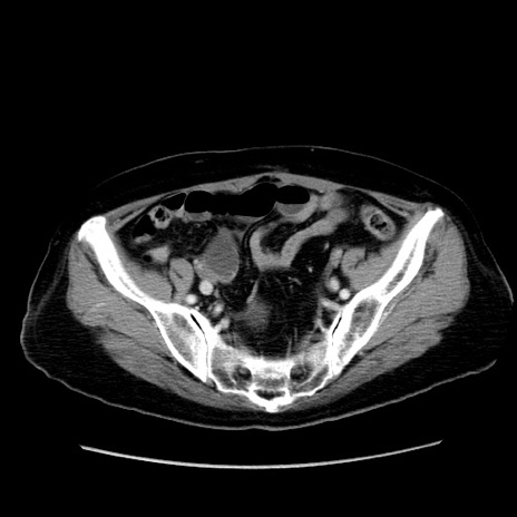 【症例】80歳代女性 【主訴】下腹部痛 【現病歴】約8時間前より下腹部痛の出現あり、救急外来受診。 【既往歴】両側付属器切除 【身体所見】意識清明、下腹部正中に手術痕あり、その部位に一致して圧痛と反跳痛あり。腸蠕動音は亢進。 【データ】WBC 9300、CRP 0.15