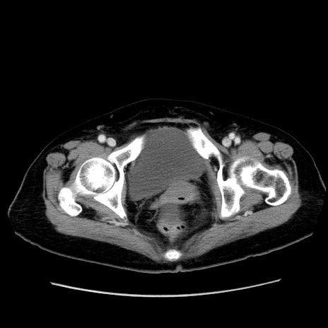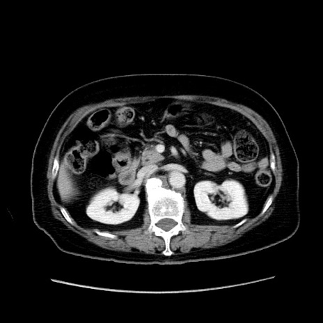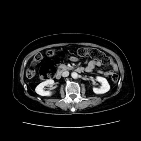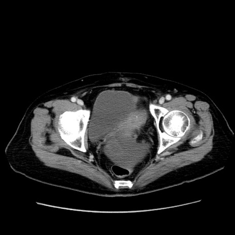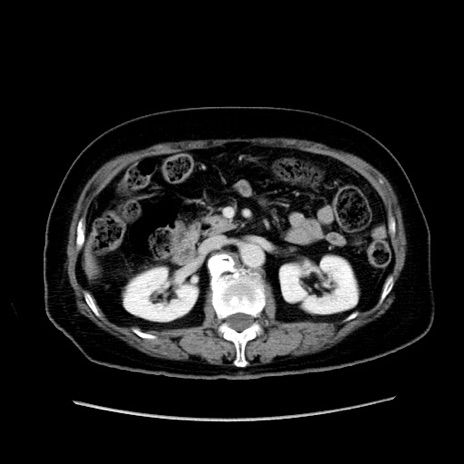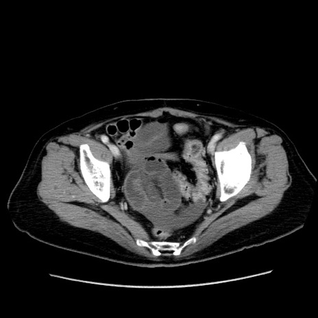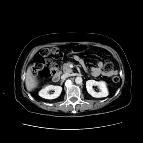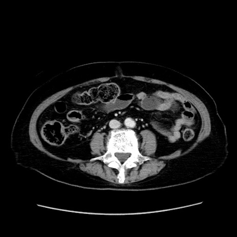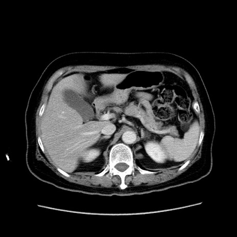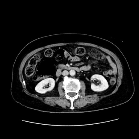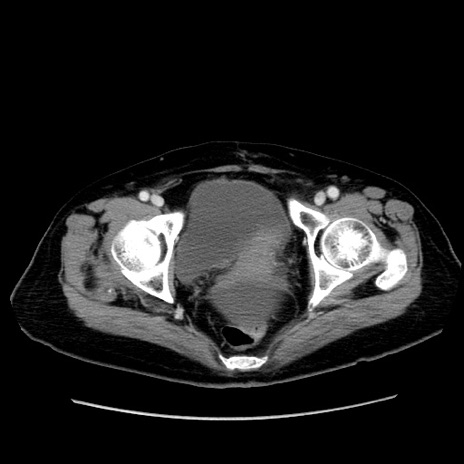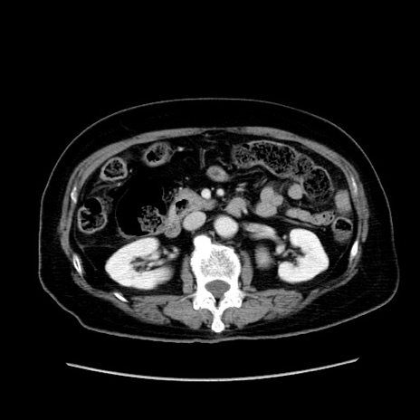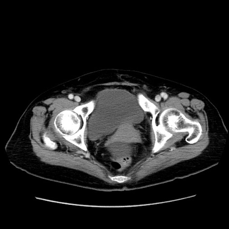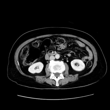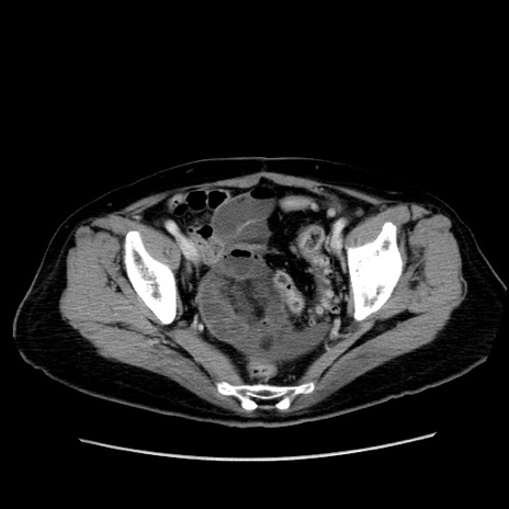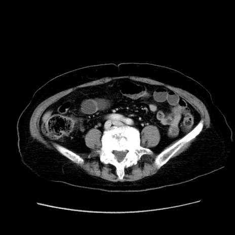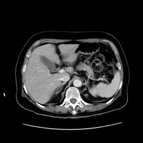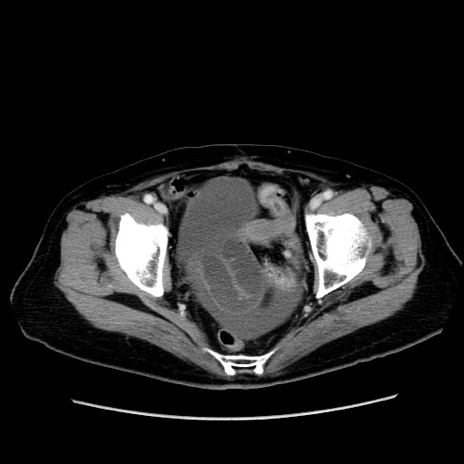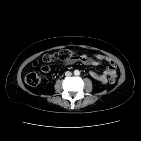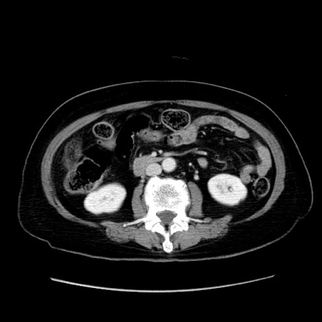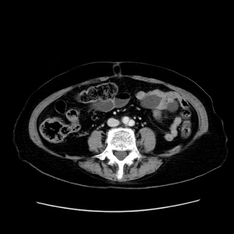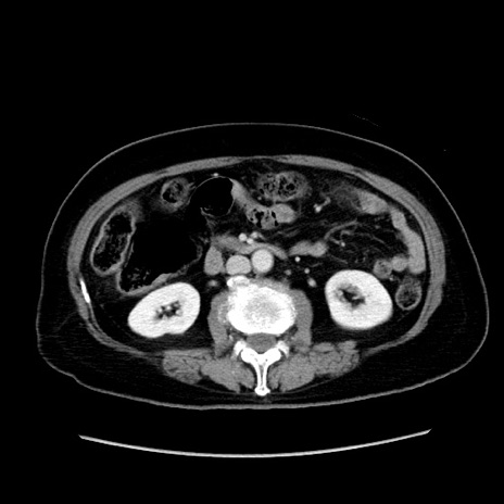 【症例】80歳代女性 【主訴】下腹部痛 【現病歴】約8時間前より下腹部痛の出現あり、救急外来受診。 【既往歴】両側付属器切除 【身体所見】意識清明、下腹部正中に手術痕あり、その部位に一致して圧痛と反跳痛あり。腸蠕動音は亢進。 【データ】WBC 9300、CRP 0.15