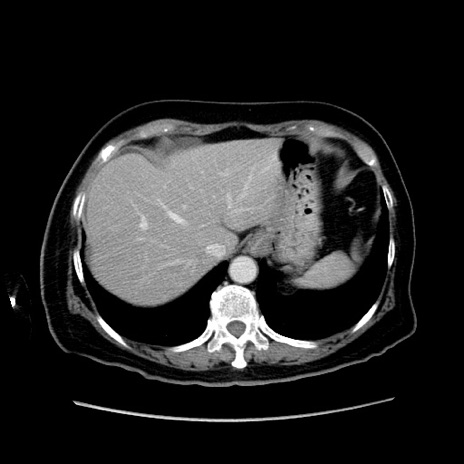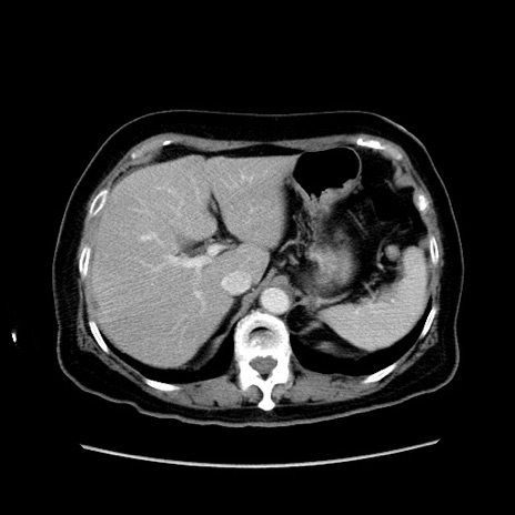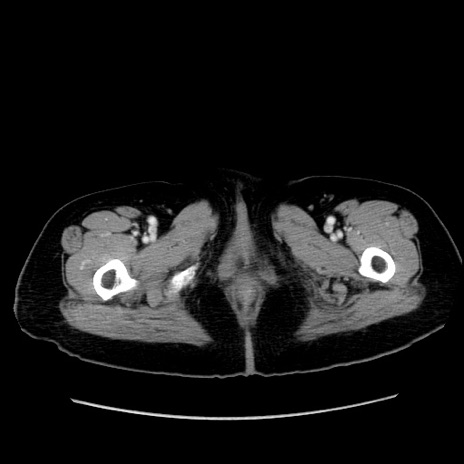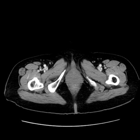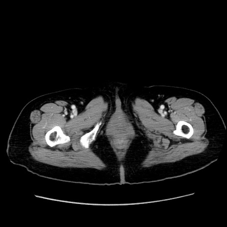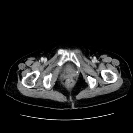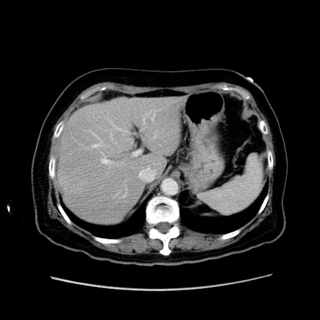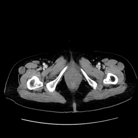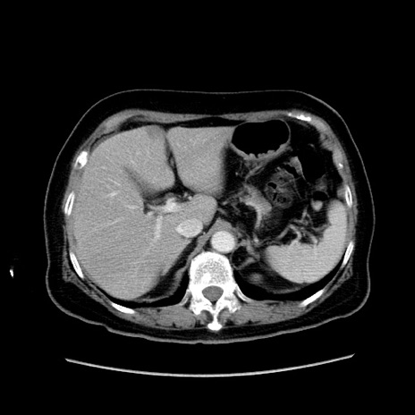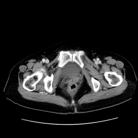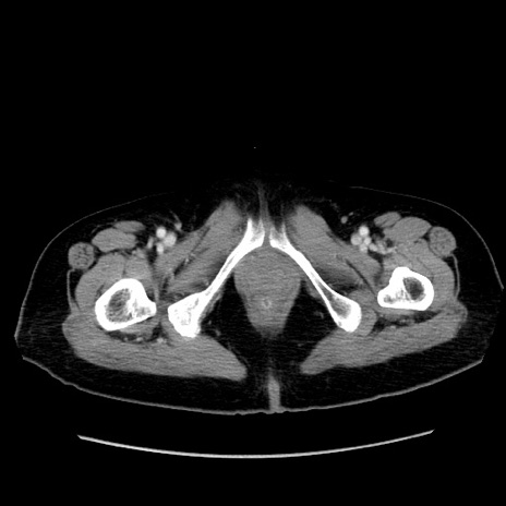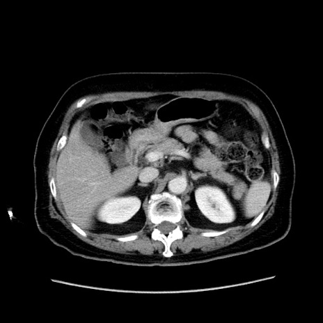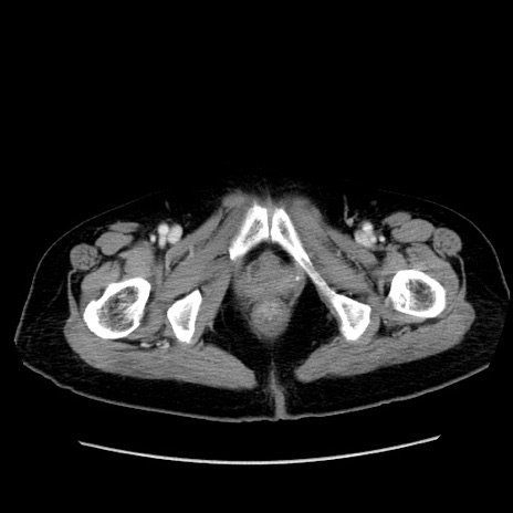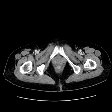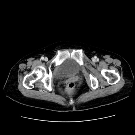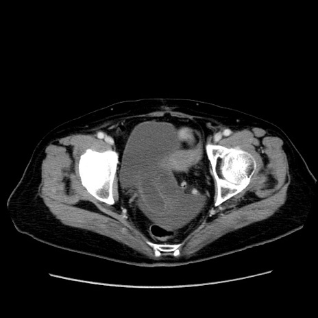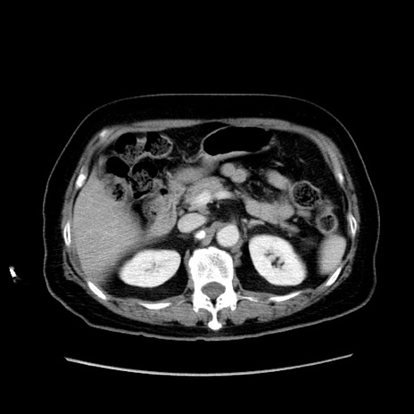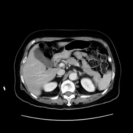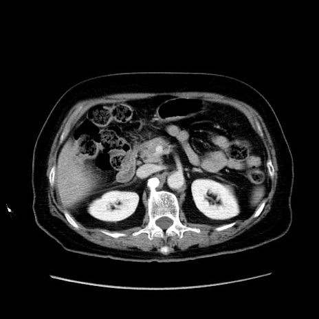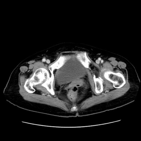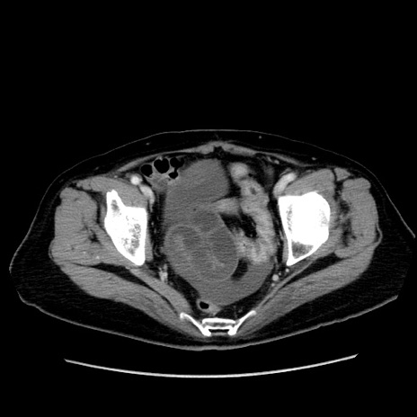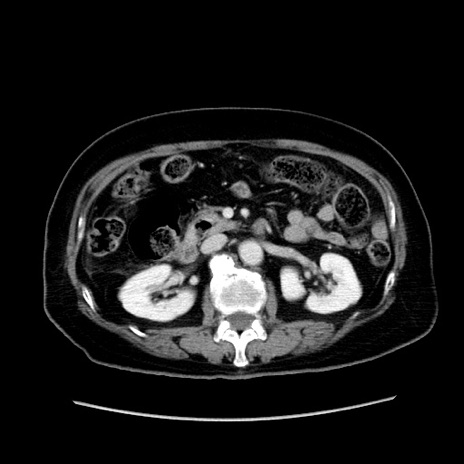 【症例】80歳代女性 【主訴】下腹部痛 【現病歴】約8時間前より下腹部痛の出現あり、救急外来受診。 【既往歴】両側付属器切除 【身体所見】意識清明、下腹部正中に手術痕あり、その部位に一致して圧痛と反跳痛あり。腸蠕動音は亢進。 【データ】WBC 9300、CRP 0.15