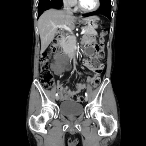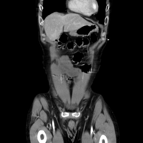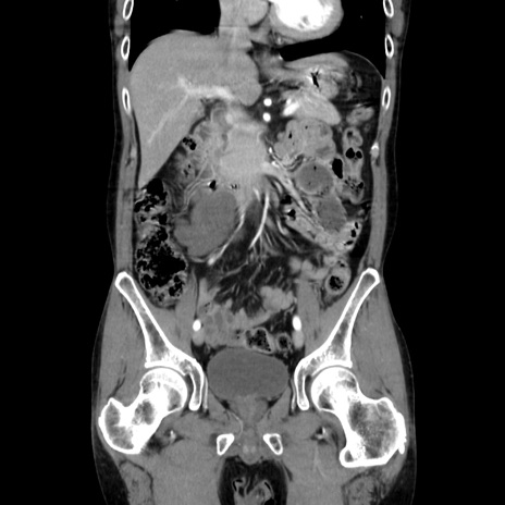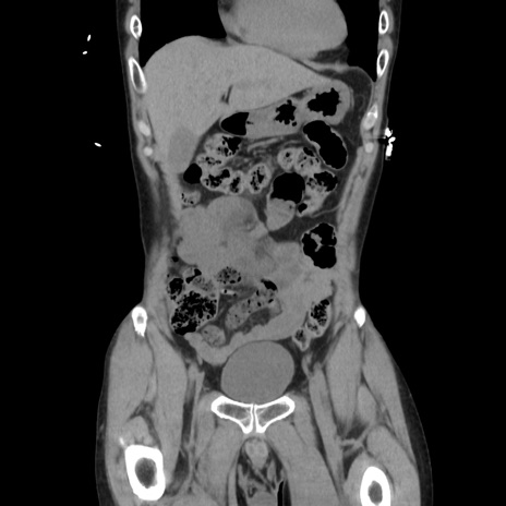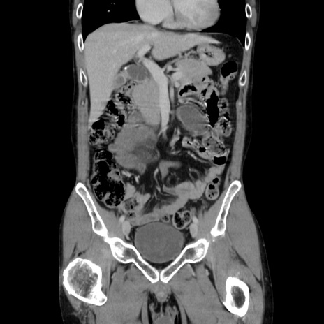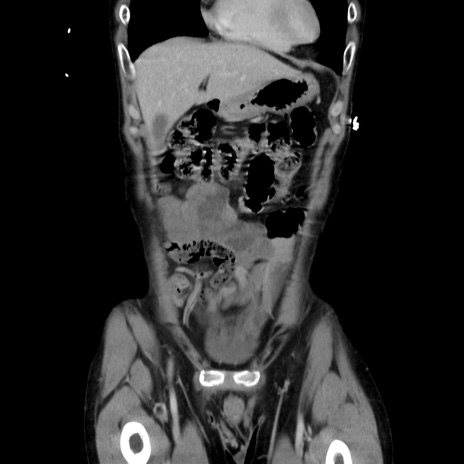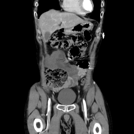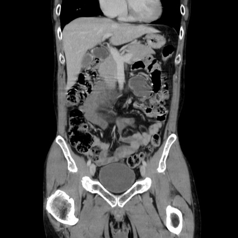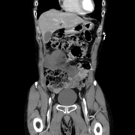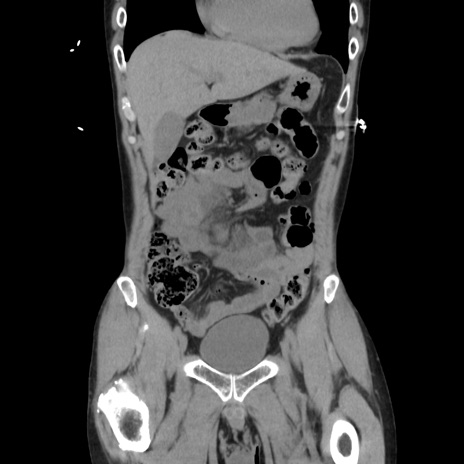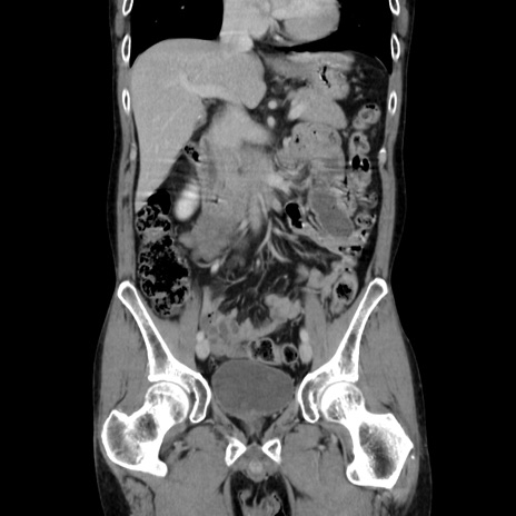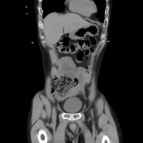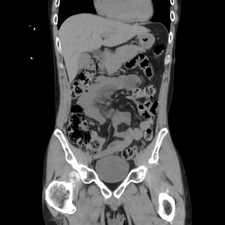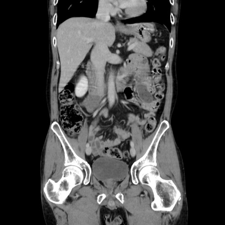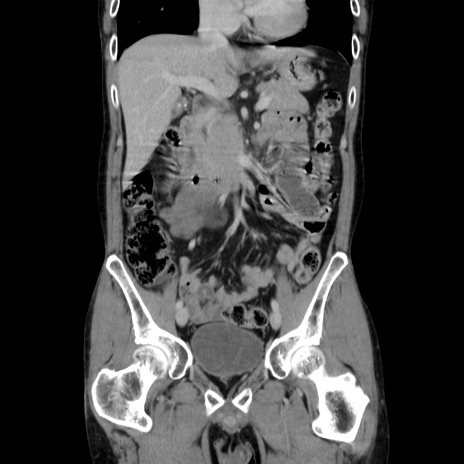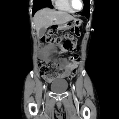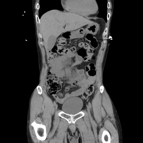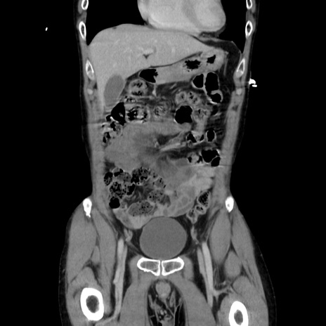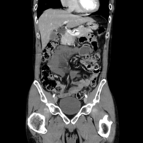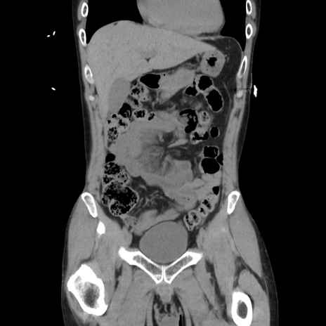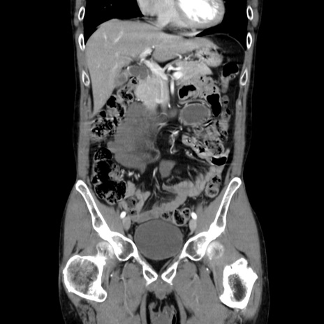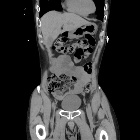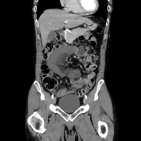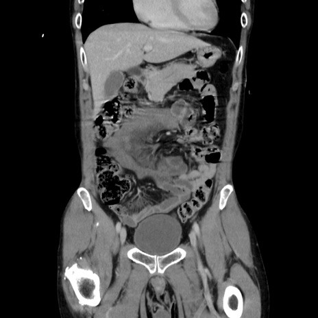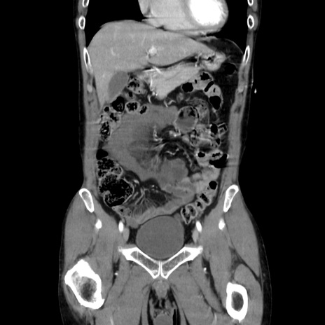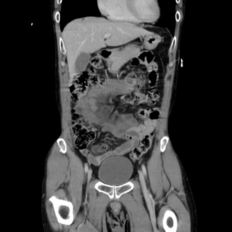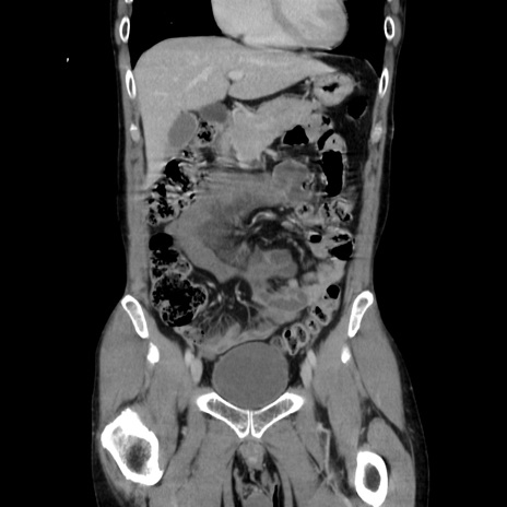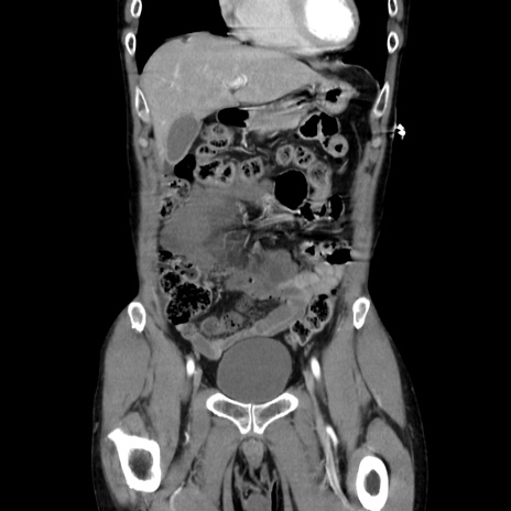【症例】40歳代 男性 【主訴】腹痛 【現病歴】4時間ほど前に電車に乗車中に臍部上より腹痛出現。徐々に増悪し起立困難となり、救急外来受診。生ものは数日食べていない。今朝お雑煮を食べた。 【既往歴】なし 【身体所見】BT 36.8℃、BP 117/84mmHg、HR 91/min、SpO2 97%、苦悶様、腹部:臍上部広範囲圧痛あり、反跳痛± 【データ】WBC 8100、CRP 0.03