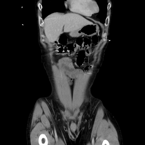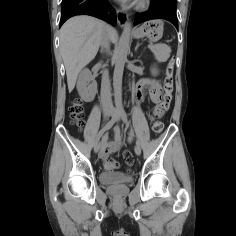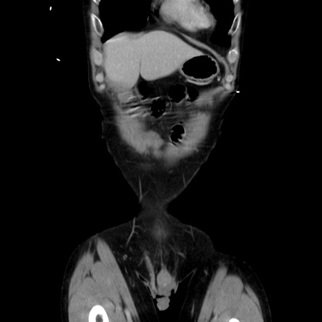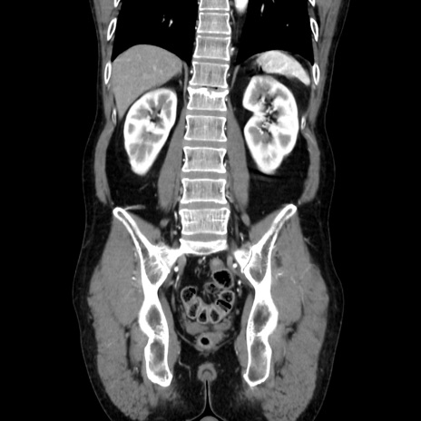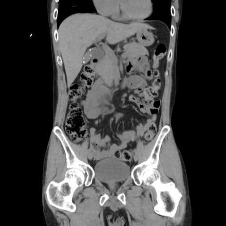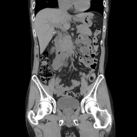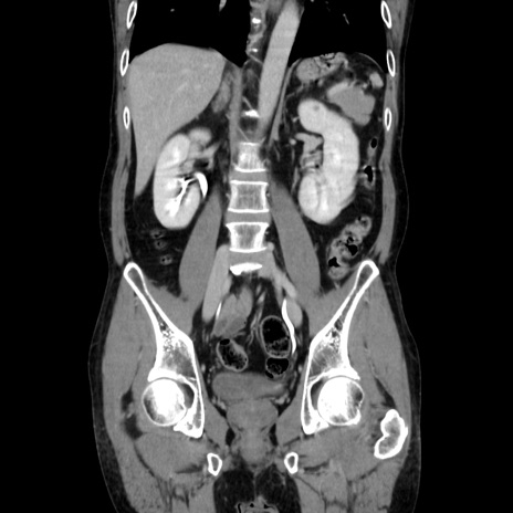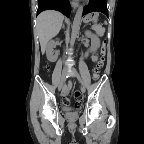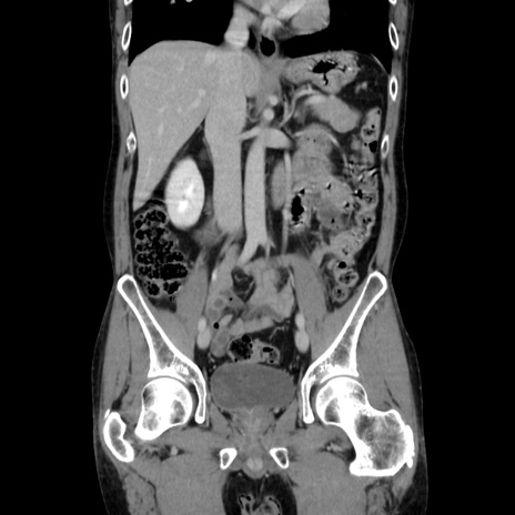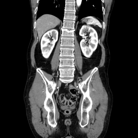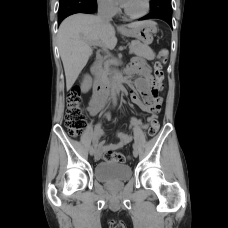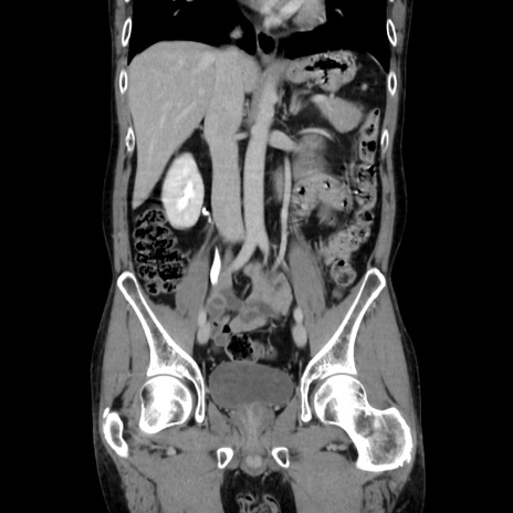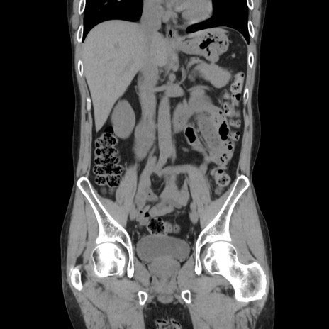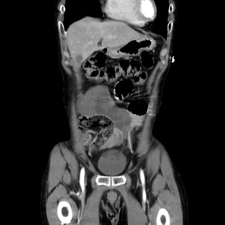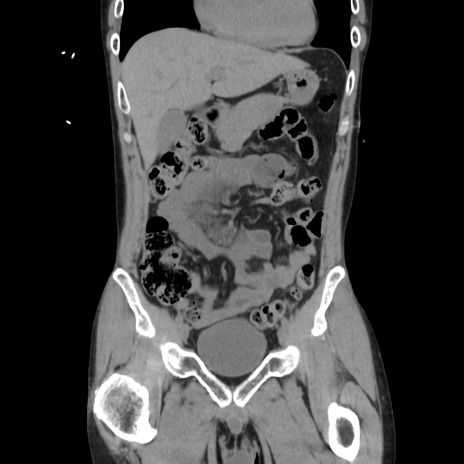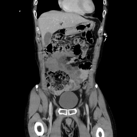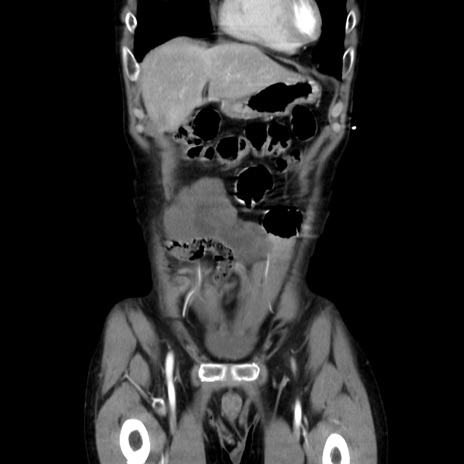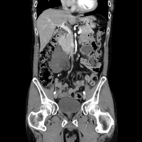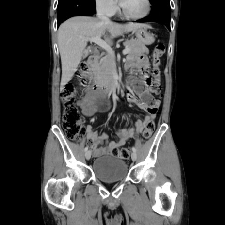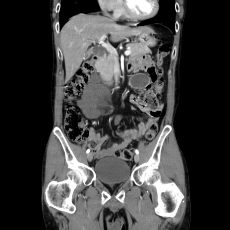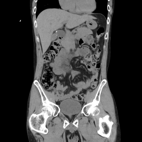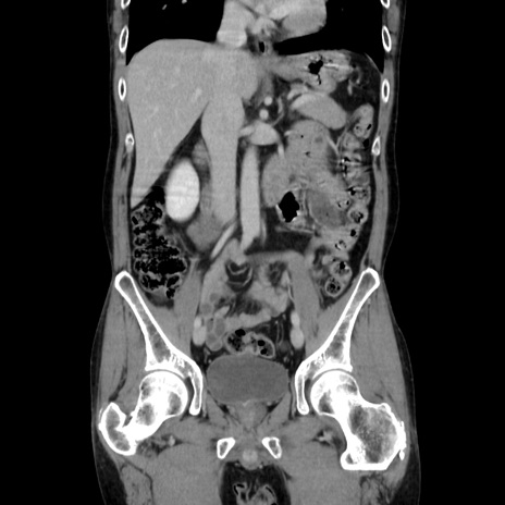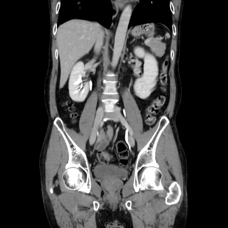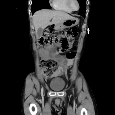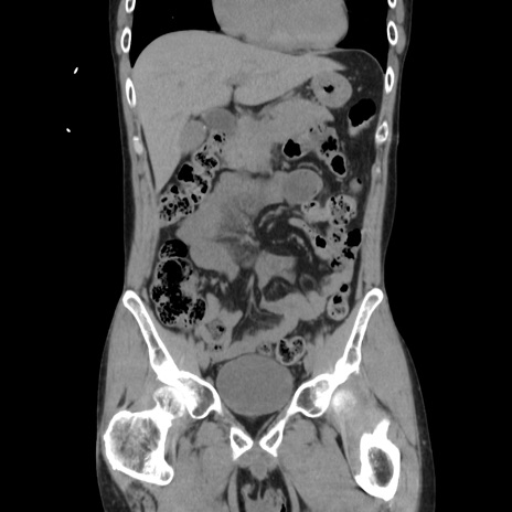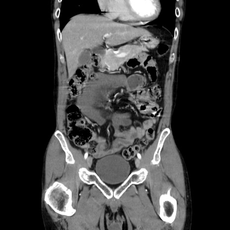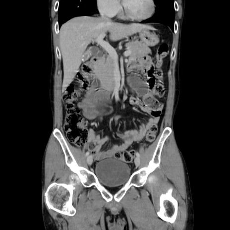 【症例】40歳代 男性 【主訴】腹痛 【現病歴】4時間ほど前に電車に乗車中に臍部上より腹痛出現。徐々に増悪し起立困難となり、救急外来受診。生ものは数日食べていない。今朝お雑煮を食べた。 【既往歴】なし 【身体所見】BT 36.8℃、BP 117/84mmHg、HR 91/min、SpO2 97%、苦悶様、腹部:臍上部広範囲圧痛あり、反跳痛± 【データ】WBC 8100、CRP 0.03