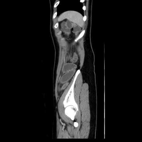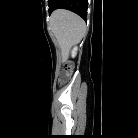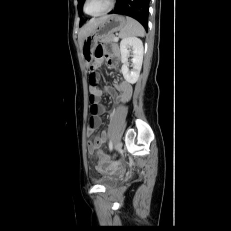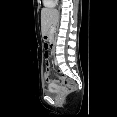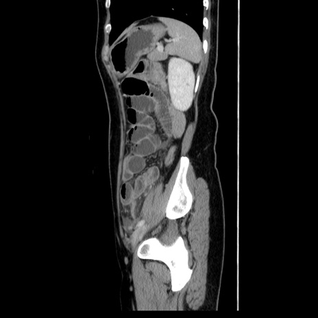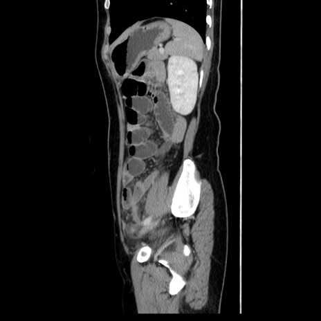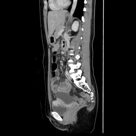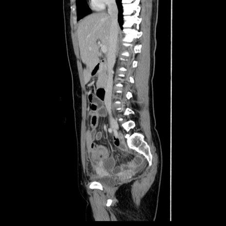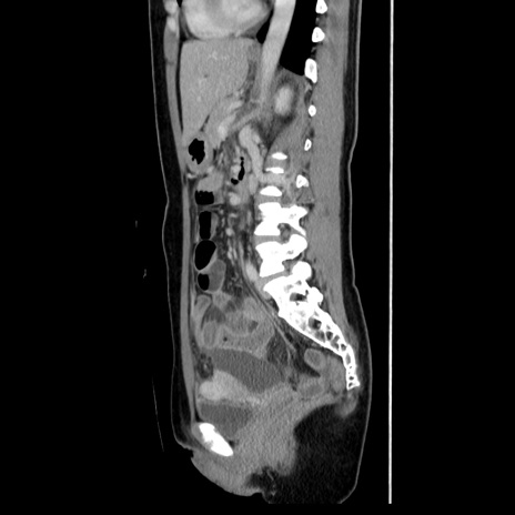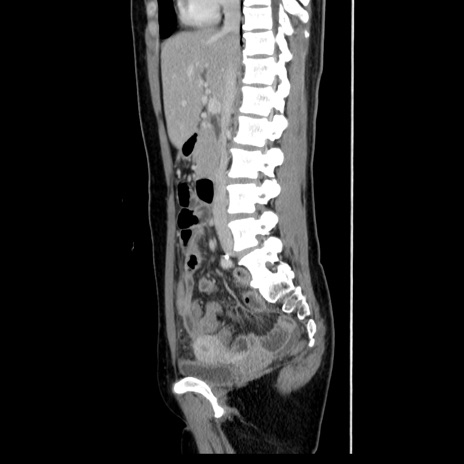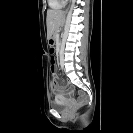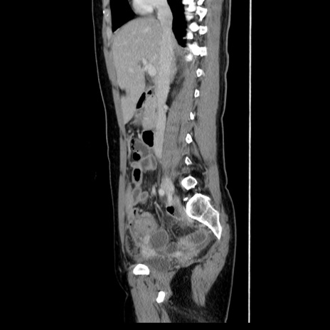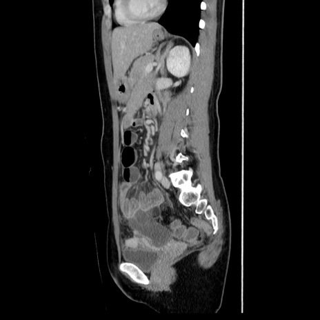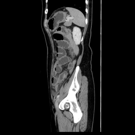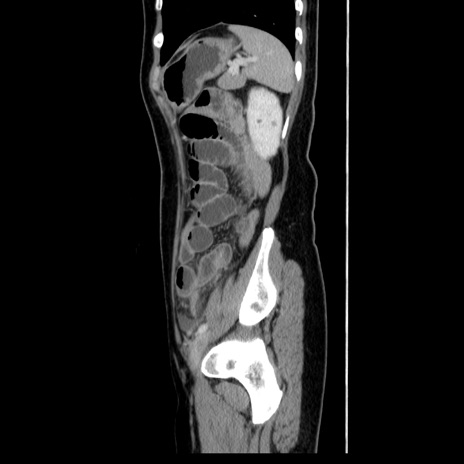 【現病歴】2日目から下腹部痛あり。夜間は痛みで眠れなかった。昨日より上腹部痛と下痢が出現。臥位で痛みは軽快したため、休んでいた。本日になって臥位でも立位でも痛みが強くなってきたため救急要請。