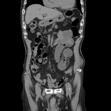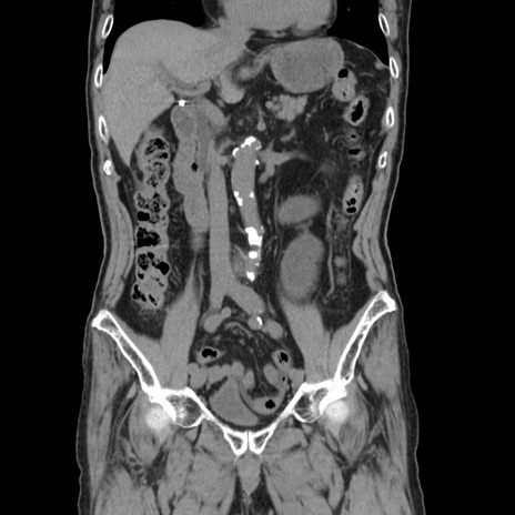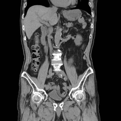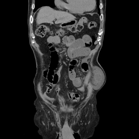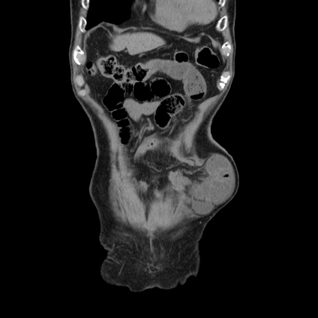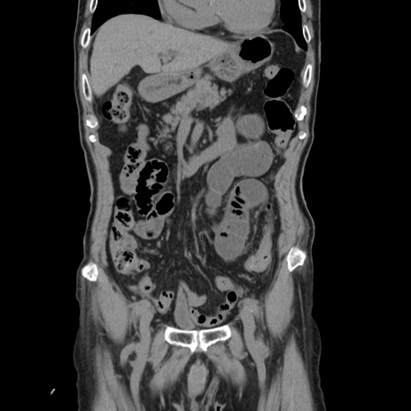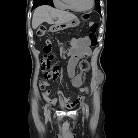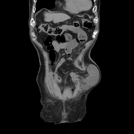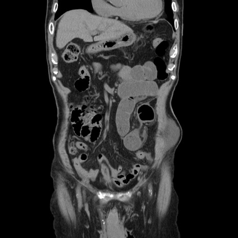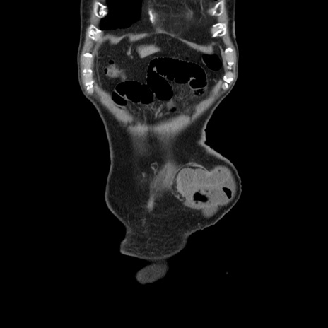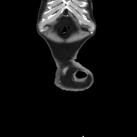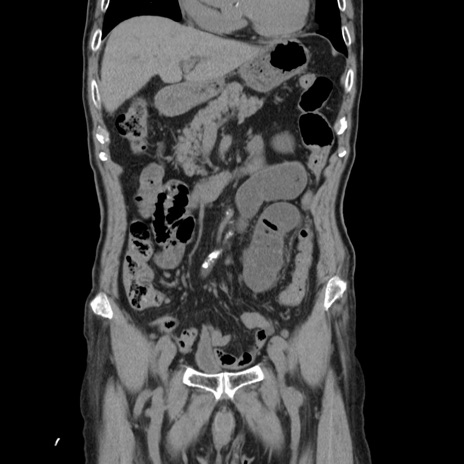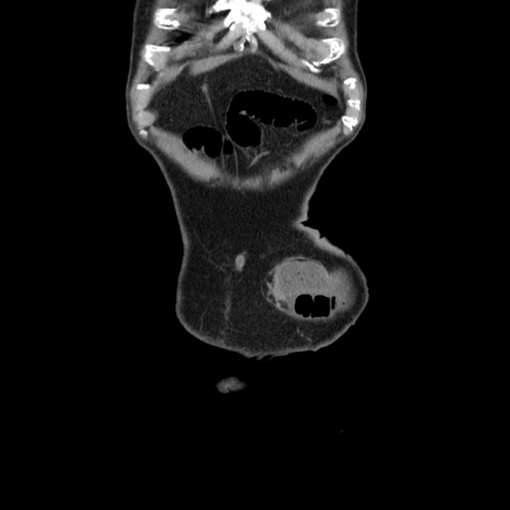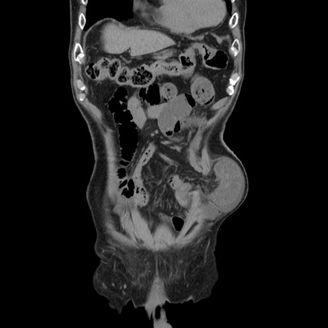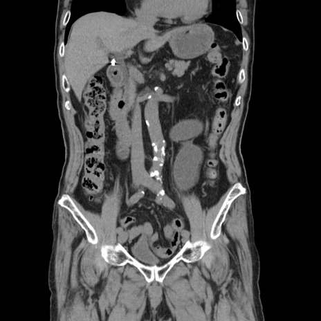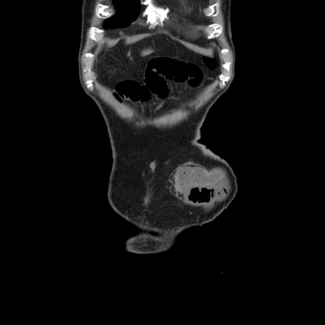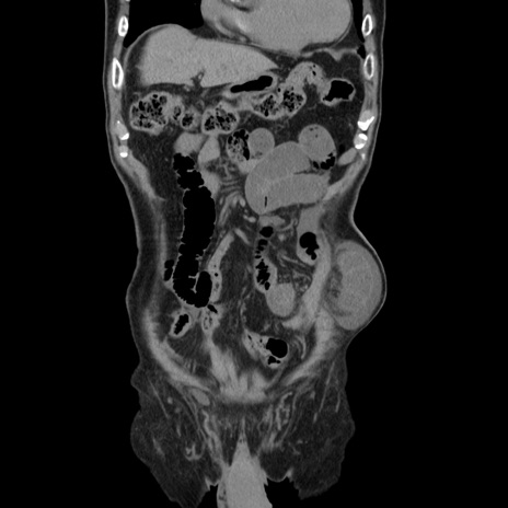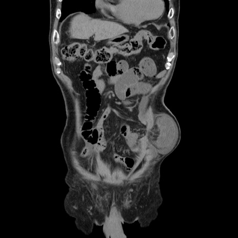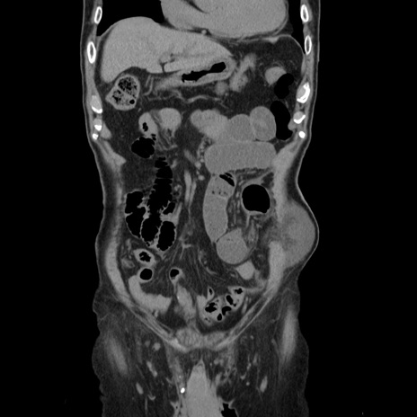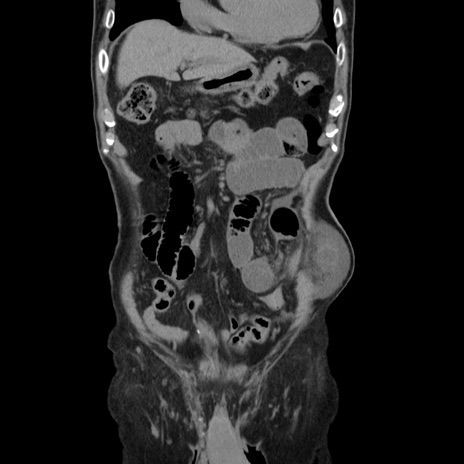 【症例】80歳代男性 【主訴】左側腹部痛、嘔吐 【現病歴】本日早朝より左腹部に痛みあり。昼頃嘔吐認めたため、救急要請。 【既往歴】直腸癌(Mile手術)、胆摘 【身体所見】意識清明、BT 35.9℃、BP 221/93mmHg、SpO2 97%(RA) 、腹部:左ストーマ周囲に限局性の腹部膨隆あり。 膨隆部自発痛・圧痛あり・軟。 【データ】WBC 7700、CRP 0.09