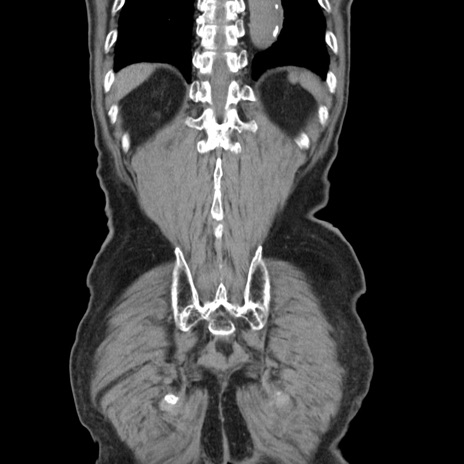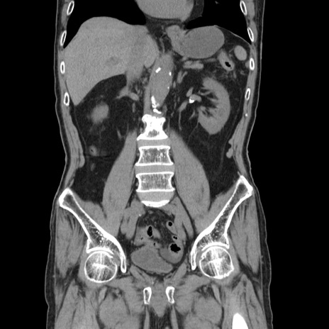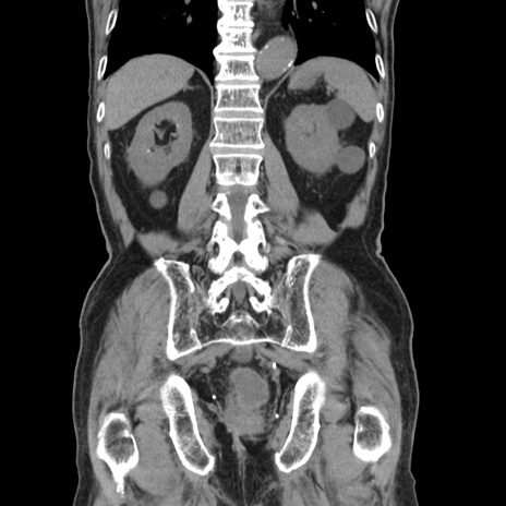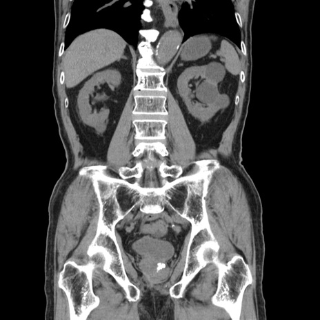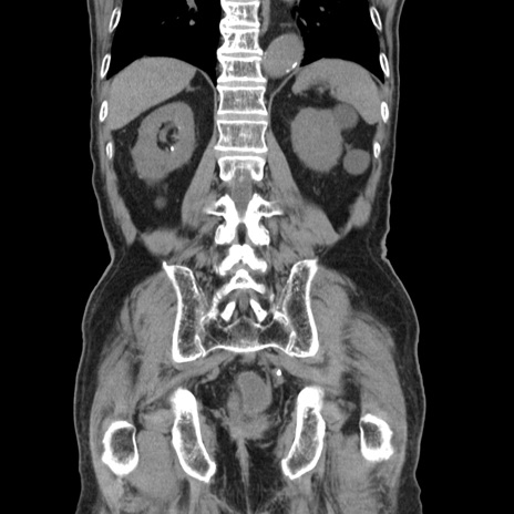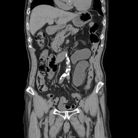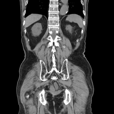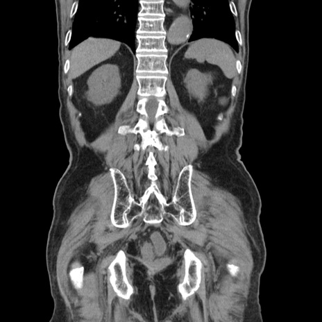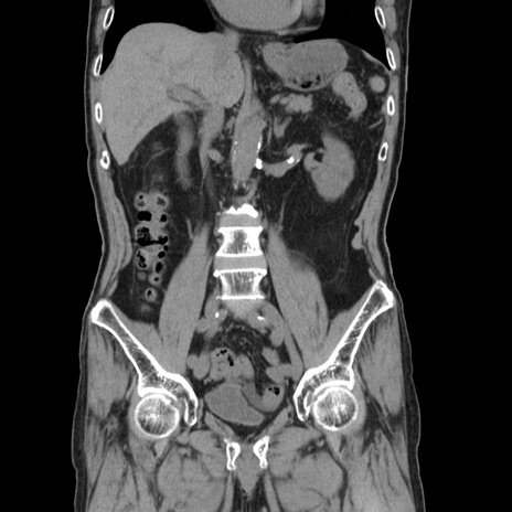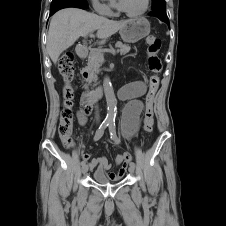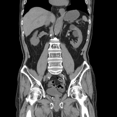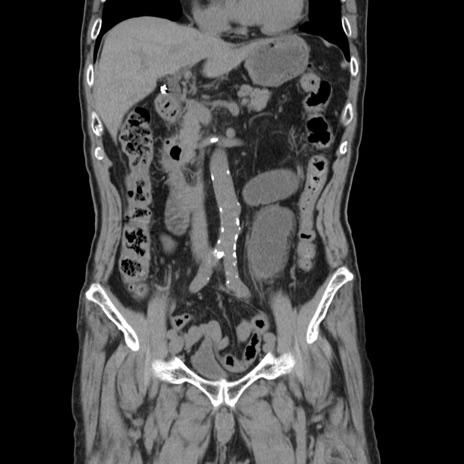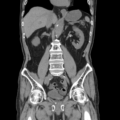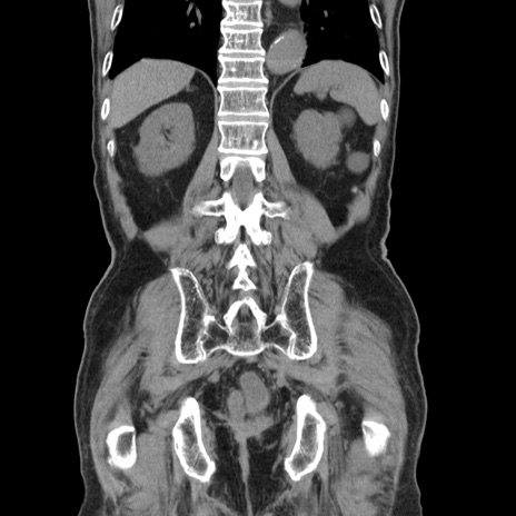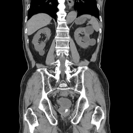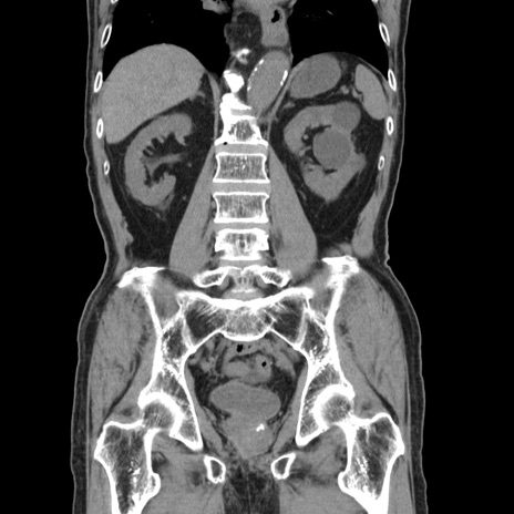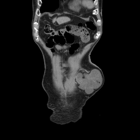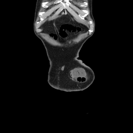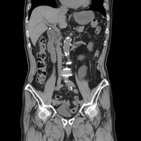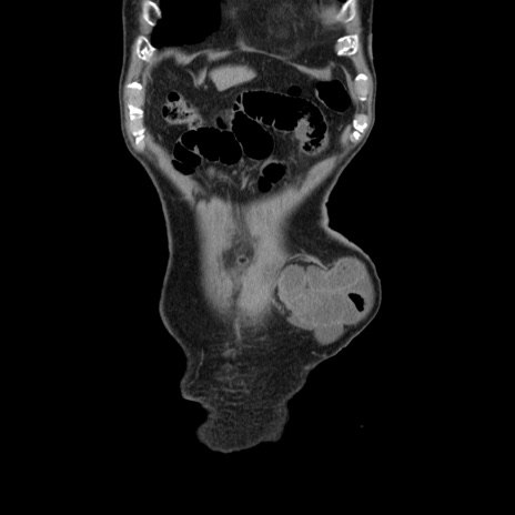 【症例】80歳代男性 【主訴】左側腹部痛、嘔吐 【現病歴】本日早朝より左腹部に痛みあり。昼頃嘔吐認めたため、救急要請。 【既往歴】直腸癌(Mile手術)、胆摘 【身体所見】意識清明、BT 35.9℃、BP 221/93mmHg、SpO2 97%(RA) 、腹部:左ストーマ周囲に限局性の腹部膨隆あり。 膨隆部自発痛・圧痛あり・軟。 【データ】WBC 7700、CRP 0.09
