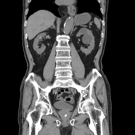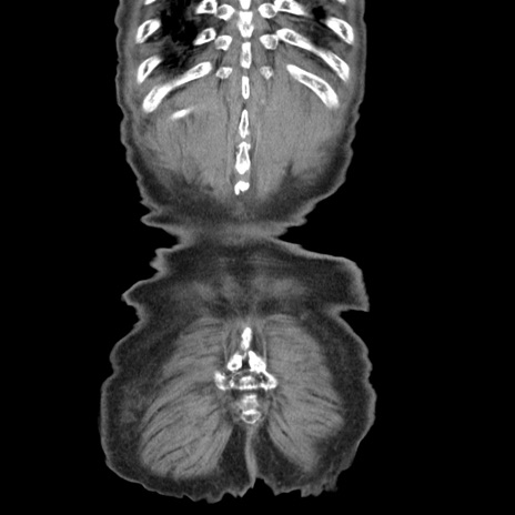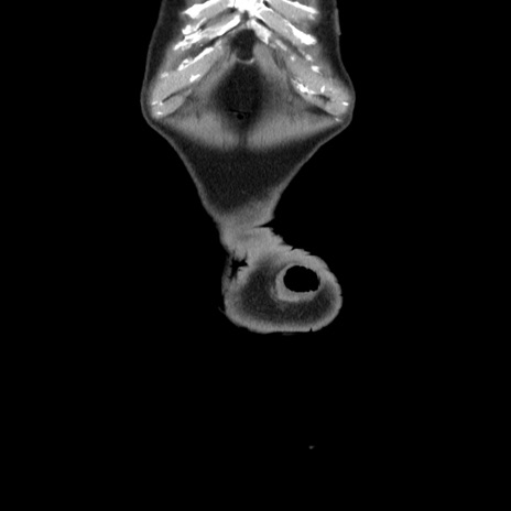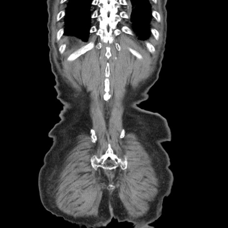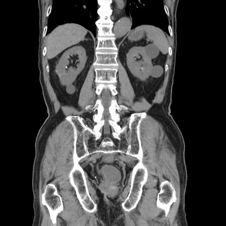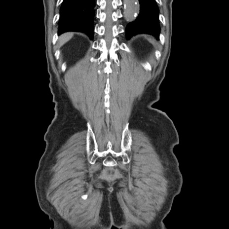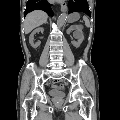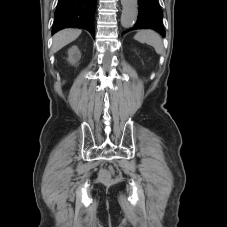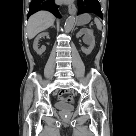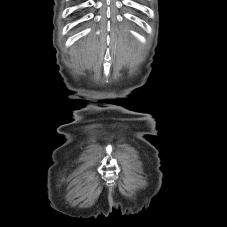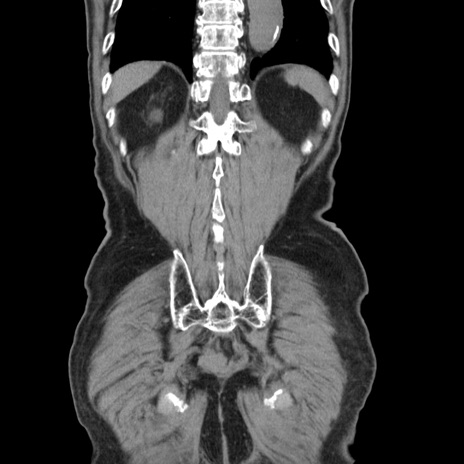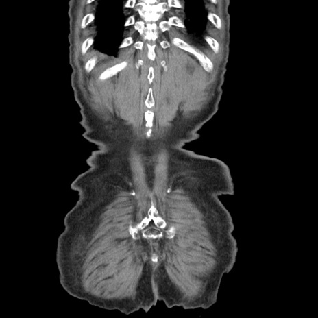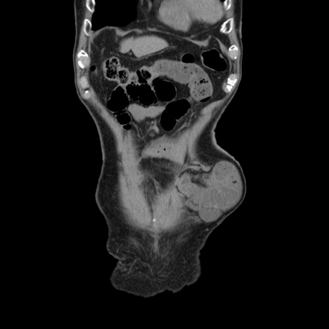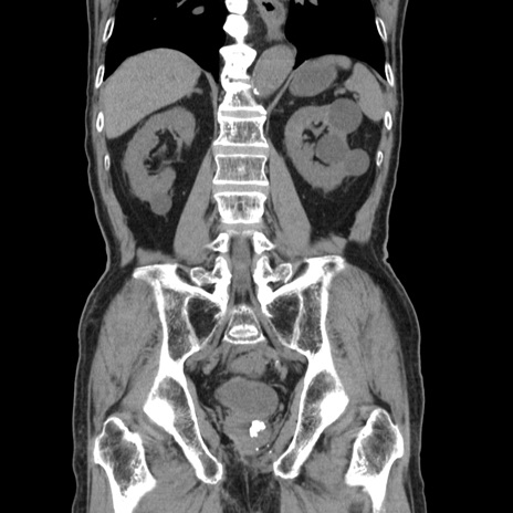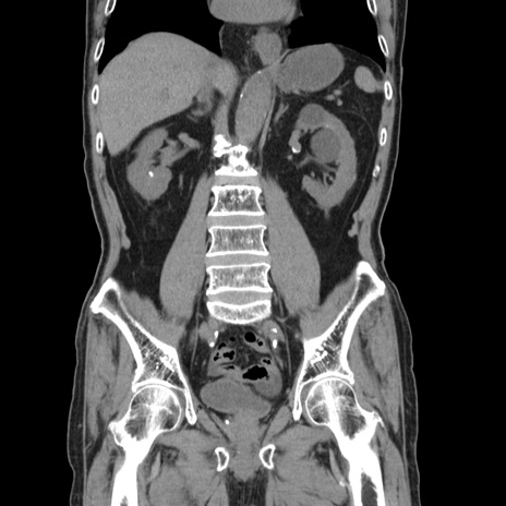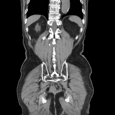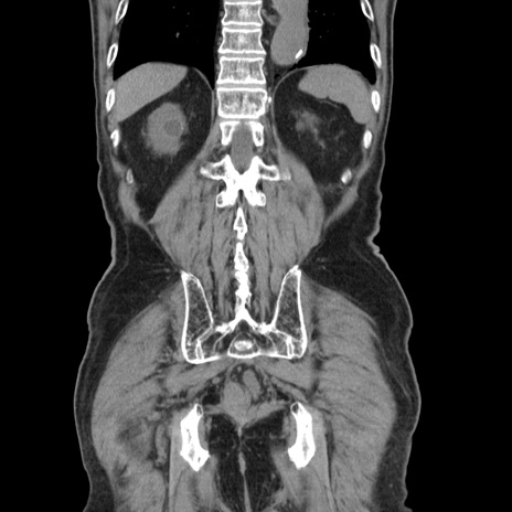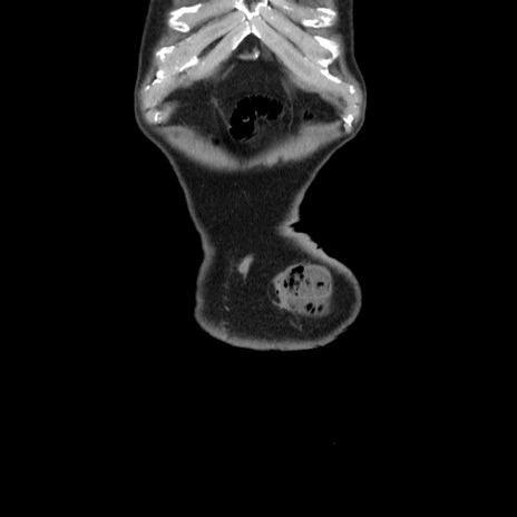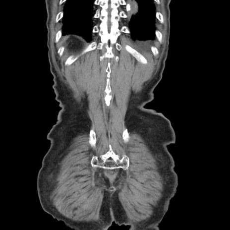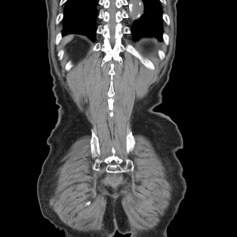 【症例】80歳代男性 【主訴】左側腹部痛、嘔吐 【現病歴】本日早朝より左腹部に痛みあり。昼頃嘔吐認めたため、救急要請。 【既往歴】直腸癌(Mile手術)、胆摘 【身体所見】意識清明、BT 35.9℃、BP 221/93mmHg、SpO2 97%(RA) 、腹部:左ストーマ周囲に限局性の腹部膨隆あり。 膨隆部自発痛・圧痛あり・軟。 【データ】WBC 7700、CRP 0.09