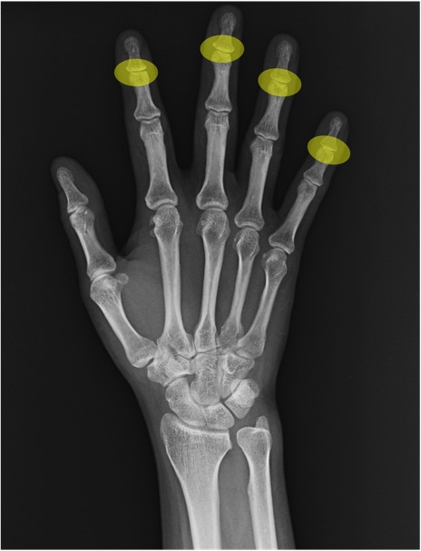 DIP関節(distal interphalangeal joint)の手関節レントゲン画像における正常解剖