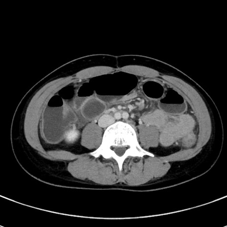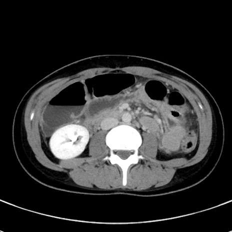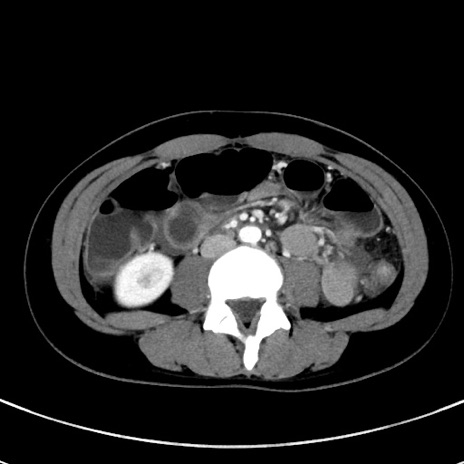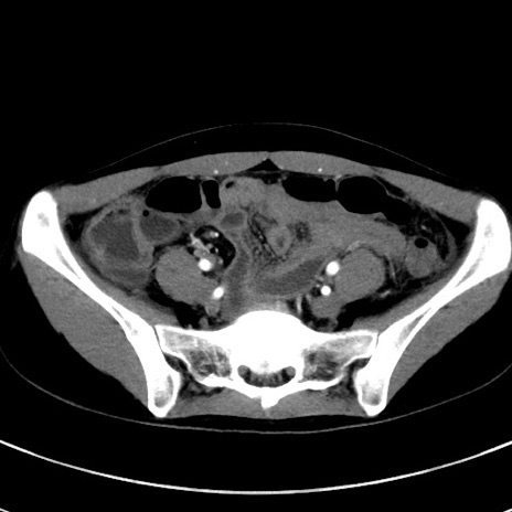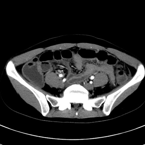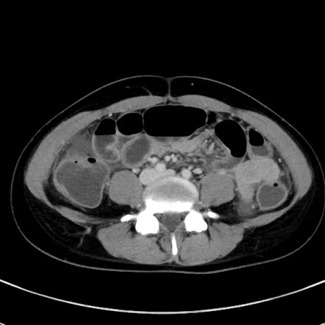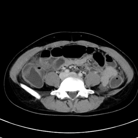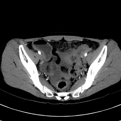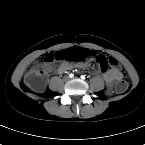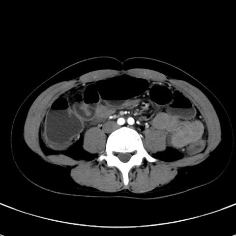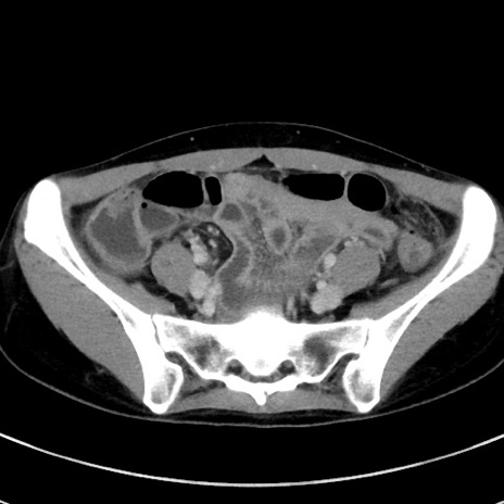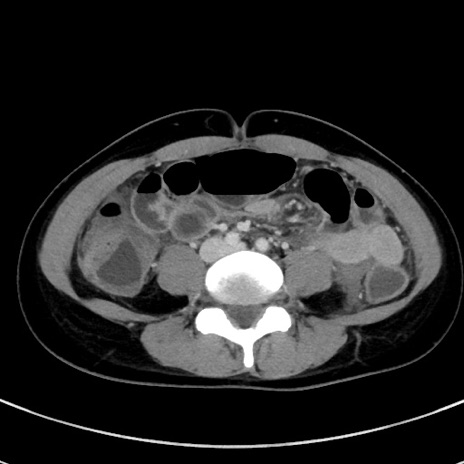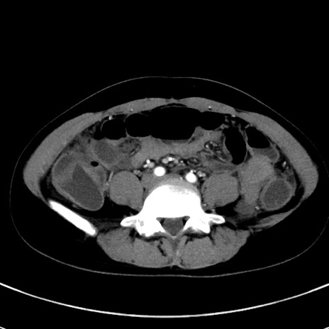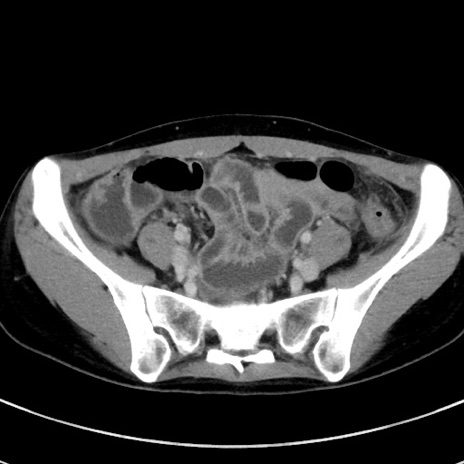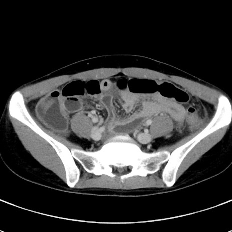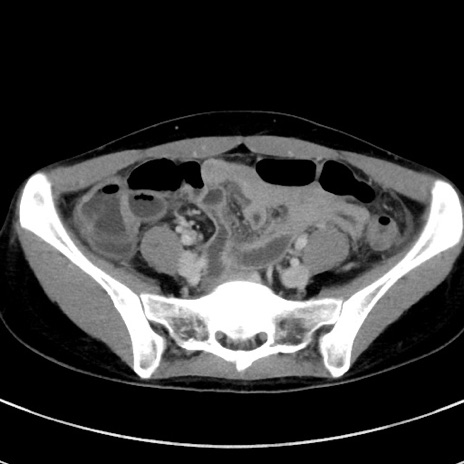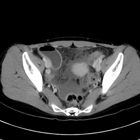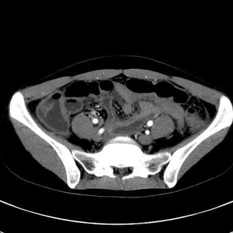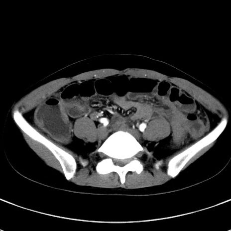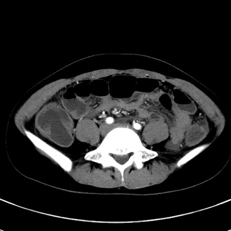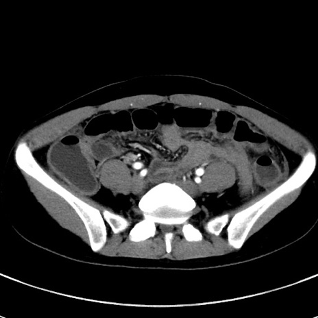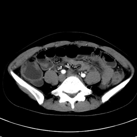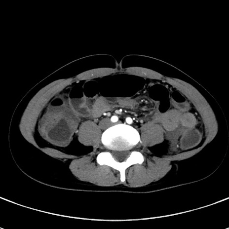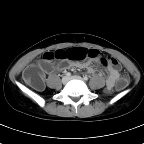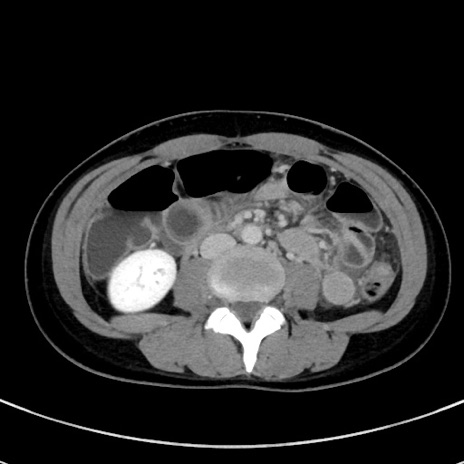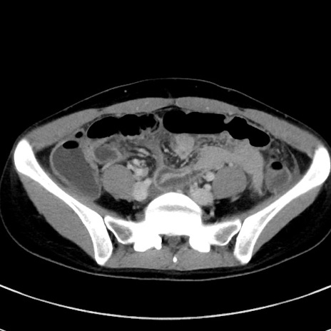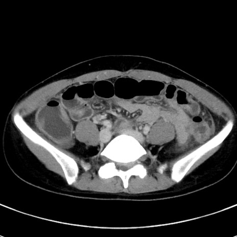 【症例】20歳代女性 【主訴】嘔吐、下腹部痛 【現病歴】昨日夕食後に嘔吐し下腹部痛が出現。本日になっても嘔吐持続し改善しないため来院。 【既往歴】なし。 【身体所見】意識清明、BT 37.2℃、BP 108/67mmHg、腹部:平坦、やや硬、下腹部正中から右にかけて圧痛あり、反跳痛軽度あり、tapping pain(+)。 【データ】WBC 13600、CRP 14.94