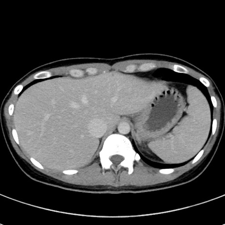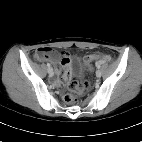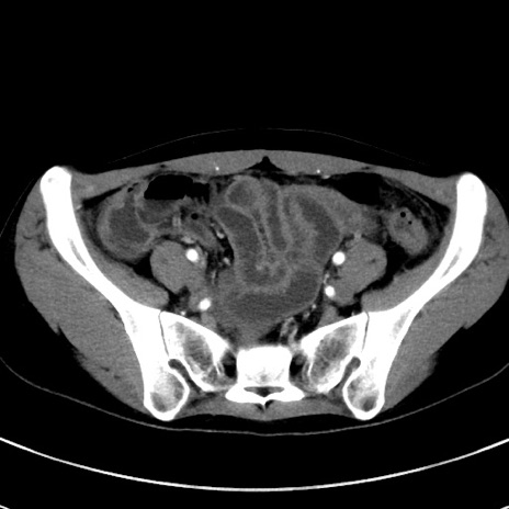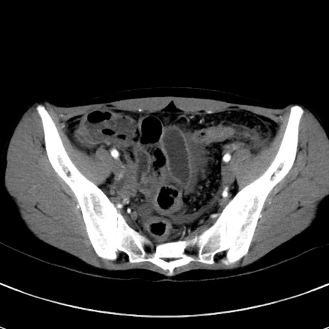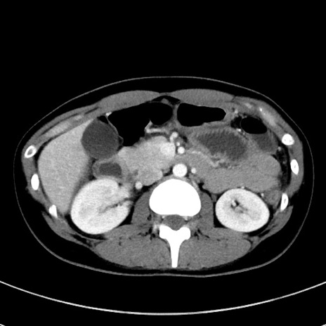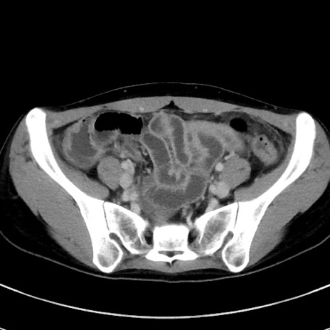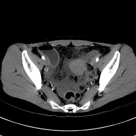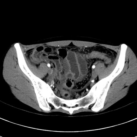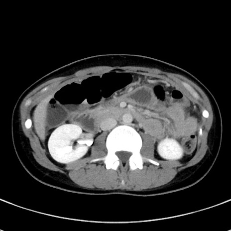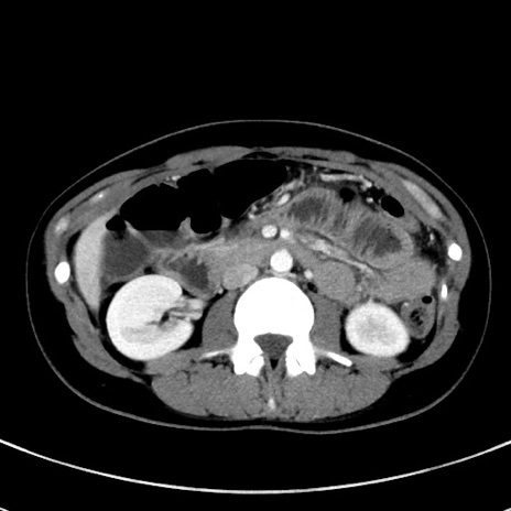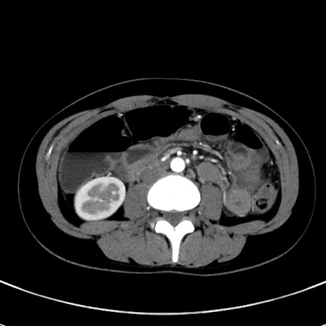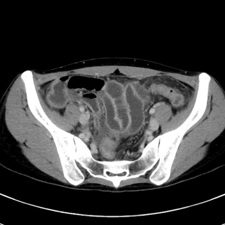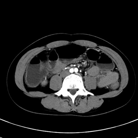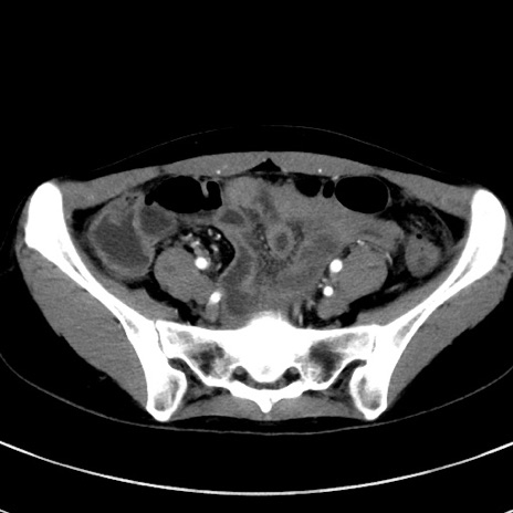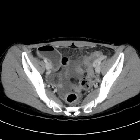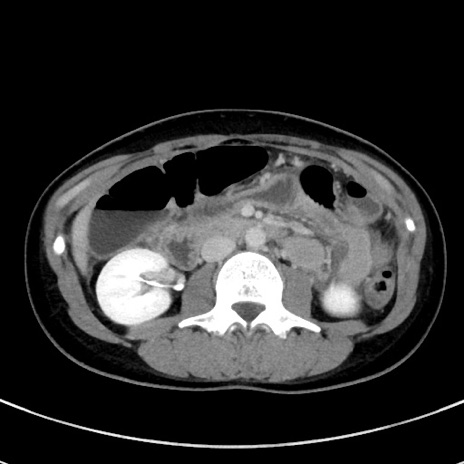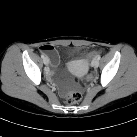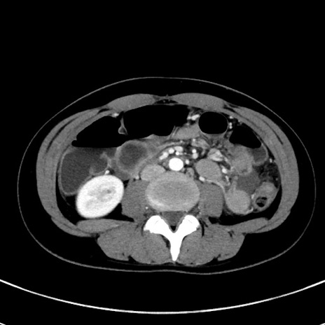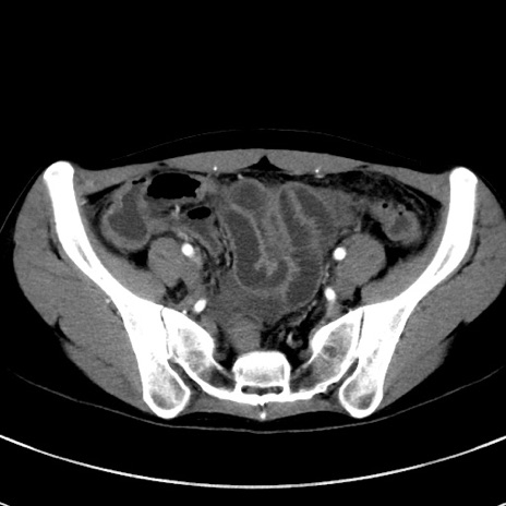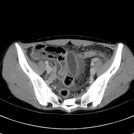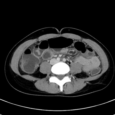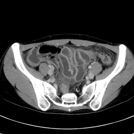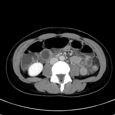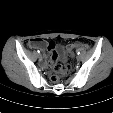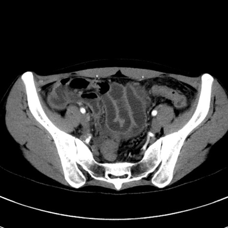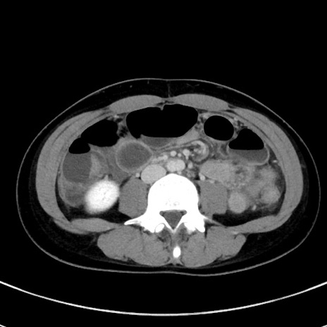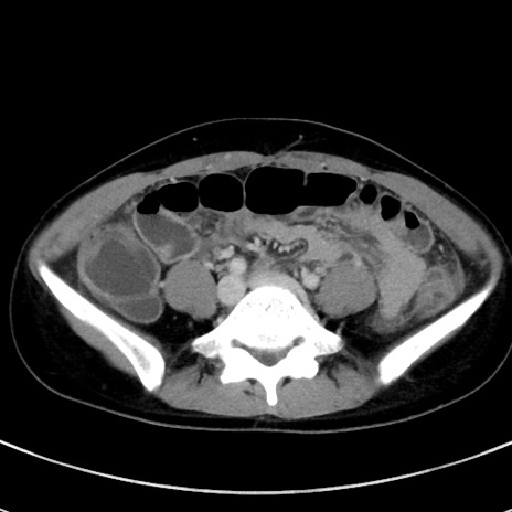 【症例】20歳代女性 【主訴】嘔吐、下腹部痛 【現病歴】昨日夕食後に嘔吐し下腹部痛が出現。本日になっても嘔吐持続し改善しないため来院。 【既往歴】なし。 【身体所見】意識清明、BT 37.2℃、BP 108/67mmHg、腹部:平坦、やや硬、下腹部正中から右にかけて圧痛あり、反跳痛軽度あり、tapping pain(+)。 【データ】WBC 13600、CRP 14.94