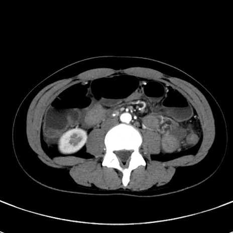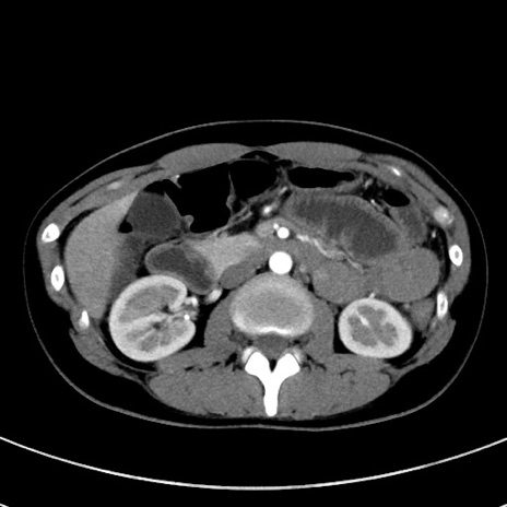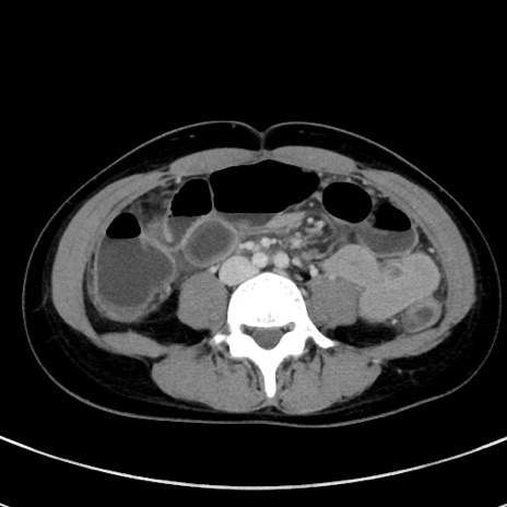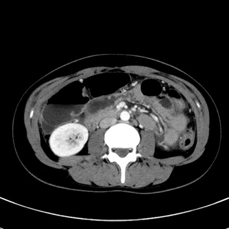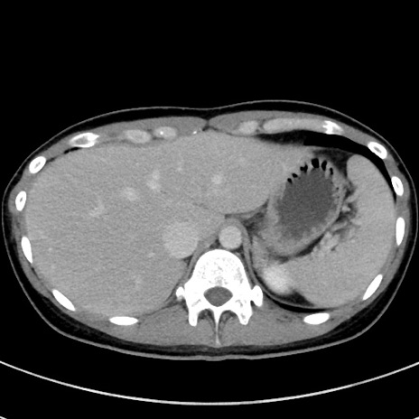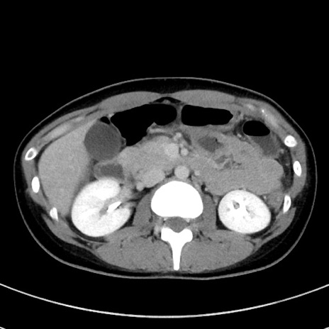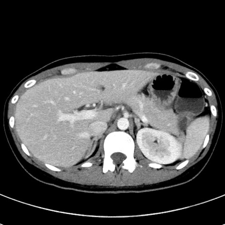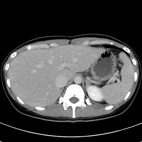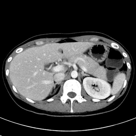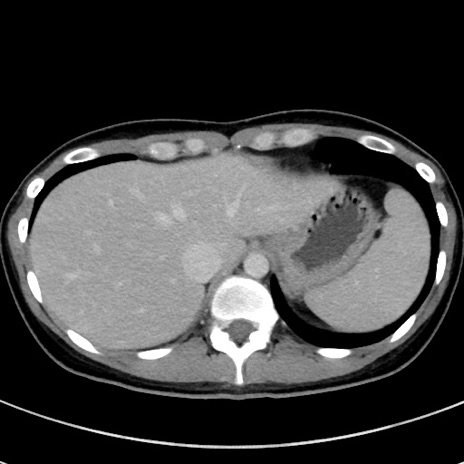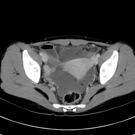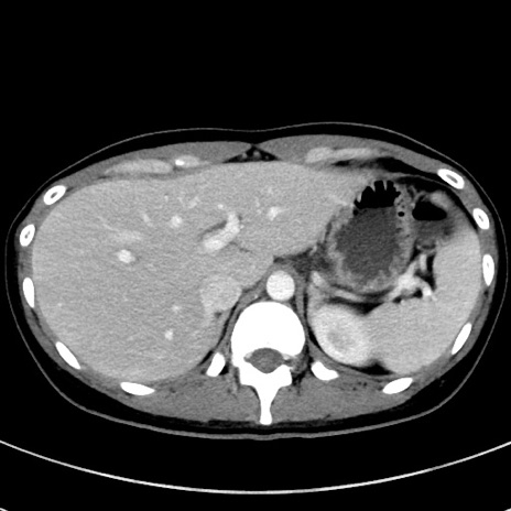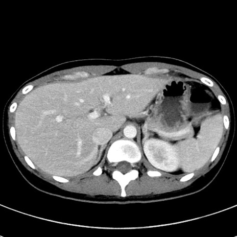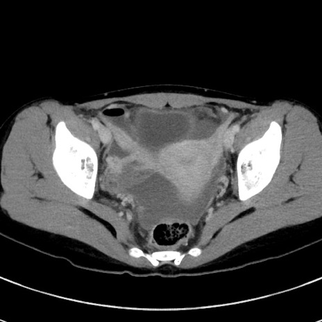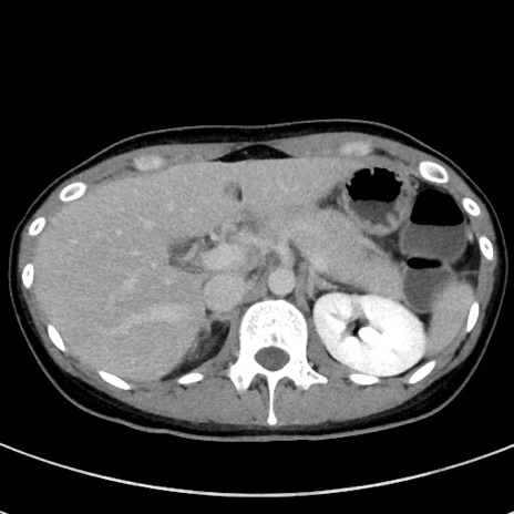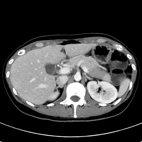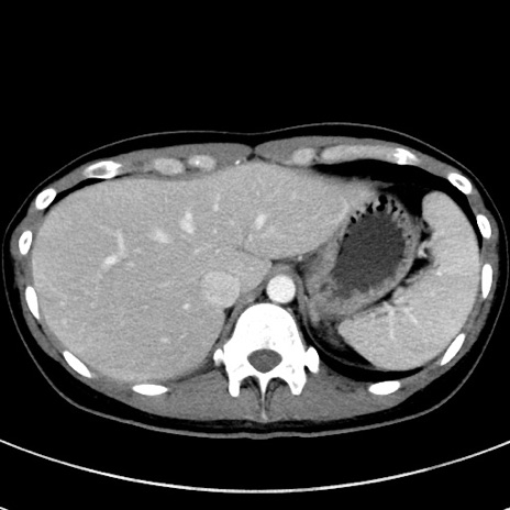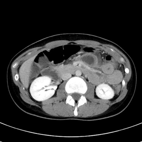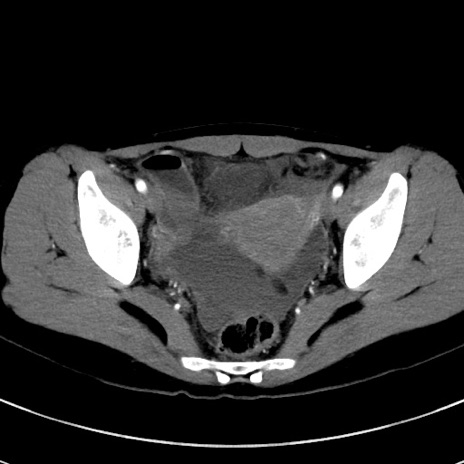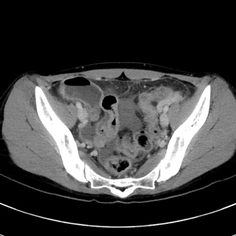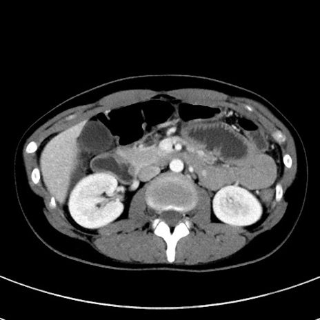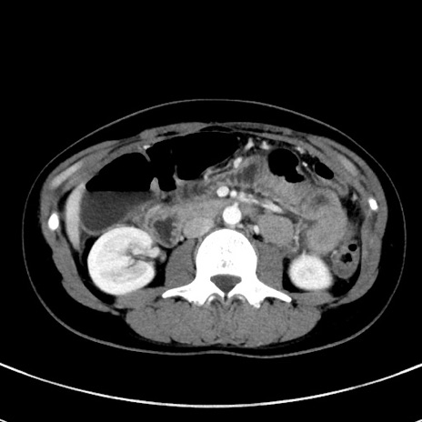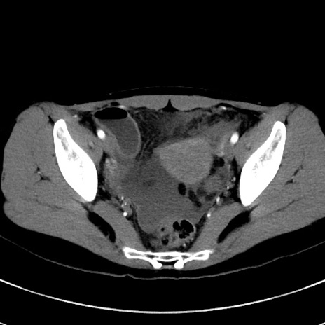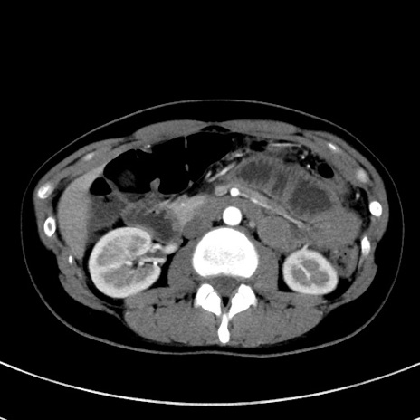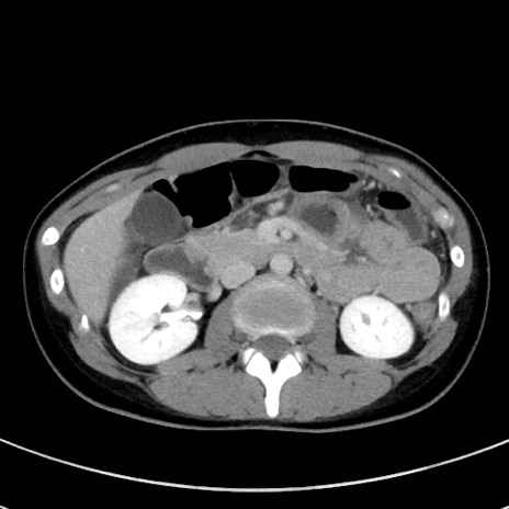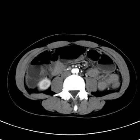 【症例】20歳代女性 【主訴】嘔吐、下腹部痛 【現病歴】昨日夕食後に嘔吐し下腹部痛が出現。本日になっても嘔吐持続し改善しないため来院。 【既往歴】なし。 【身体所見】意識清明、BT 37.2℃、BP 108/67mmHg、腹部:平坦、やや硬、下腹部正中から右にかけて圧痛あり、反跳痛軽度あり、tapping pain(+)。 【データ】WBC 13600、CRP 14.94