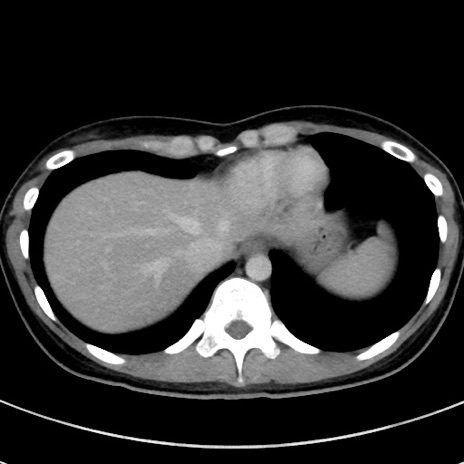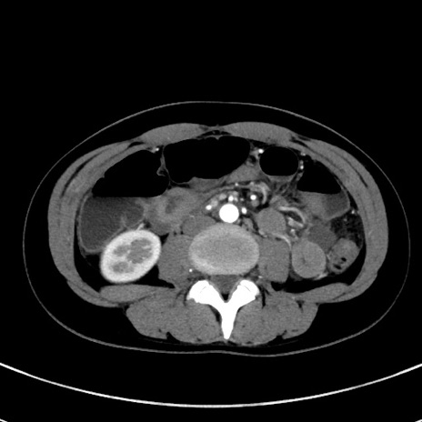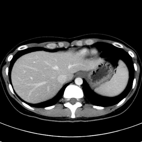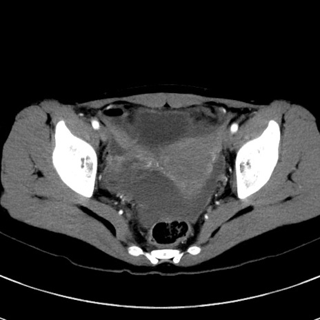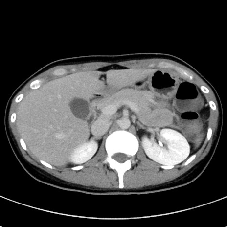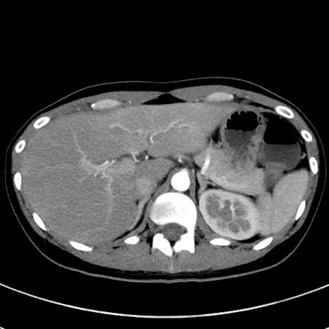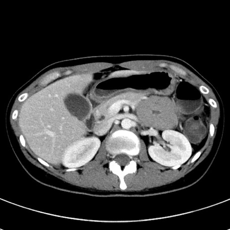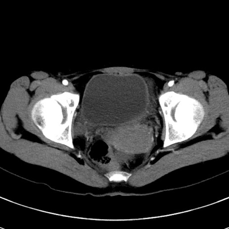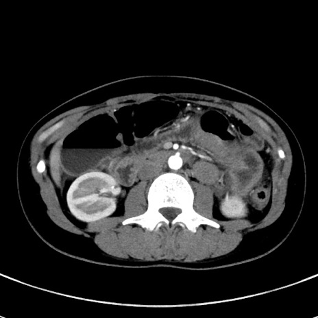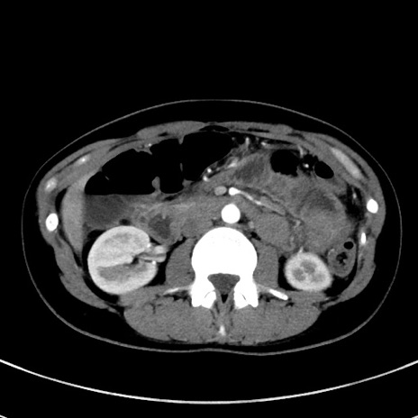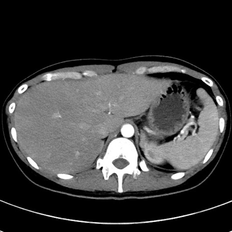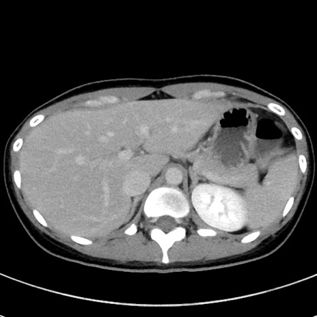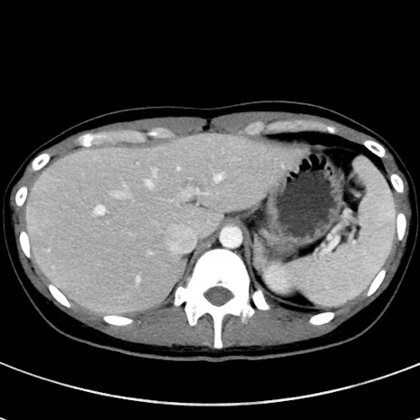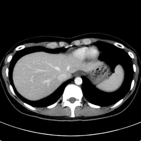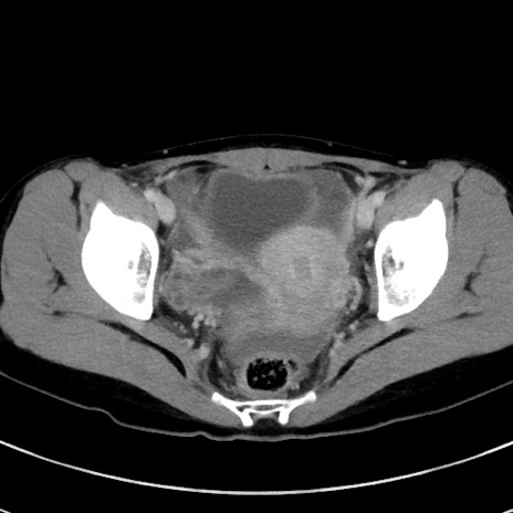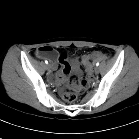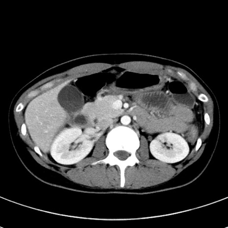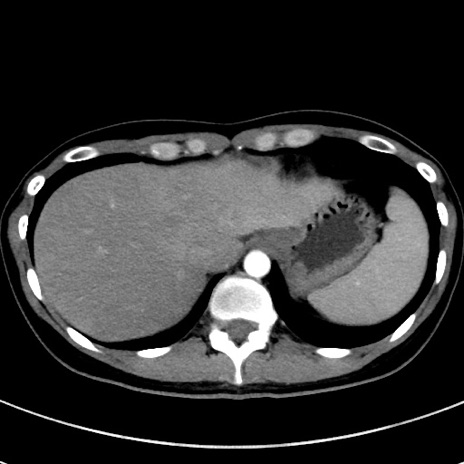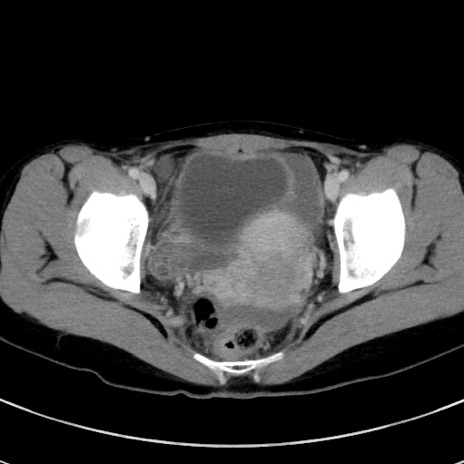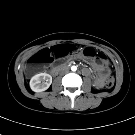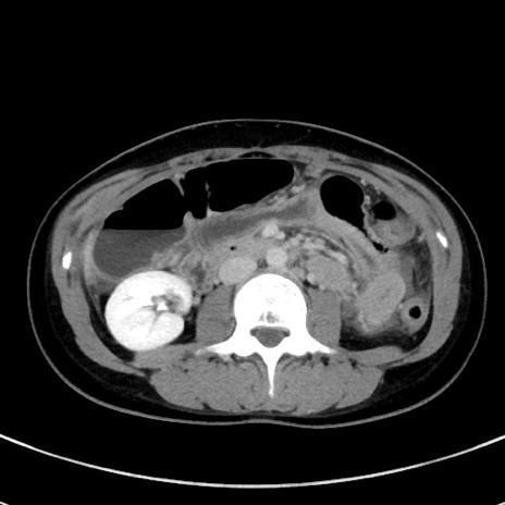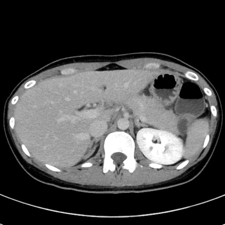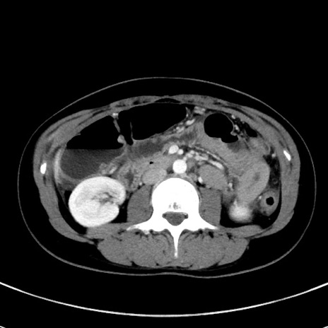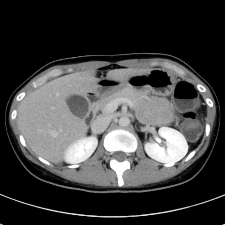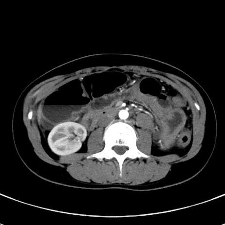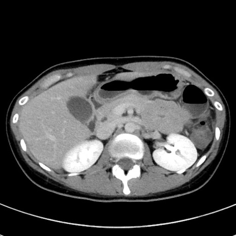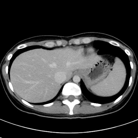 【症例】20歳代女性 【主訴】嘔吐、下腹部痛 【現病歴】昨日夕食後に嘔吐し下腹部痛が出現。本日になっても嘔吐持続し改善しないため来院。 【既往歴】なし。 【身体所見】意識清明、BT 37.2℃、BP 108/67mmHg、腹部:平坦、やや硬、下腹部正中から右にかけて圧痛あり、反跳痛軽度あり、tapping pain(+)。 【データ】WBC 13600、CRP 14.94