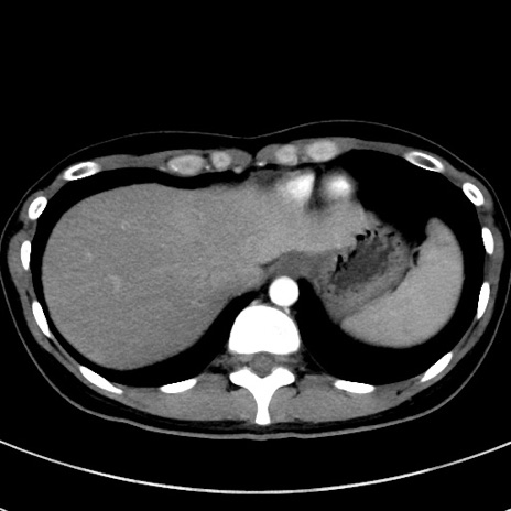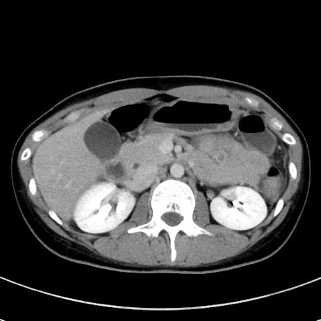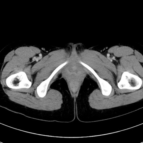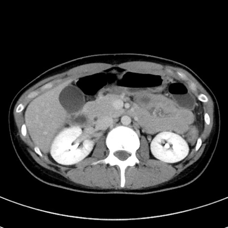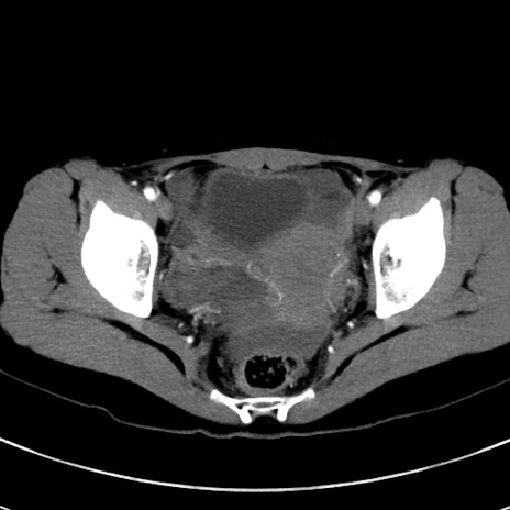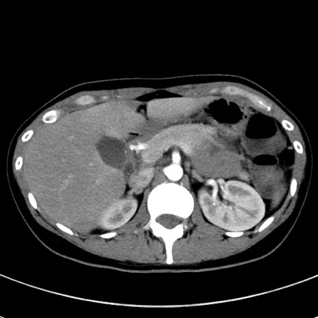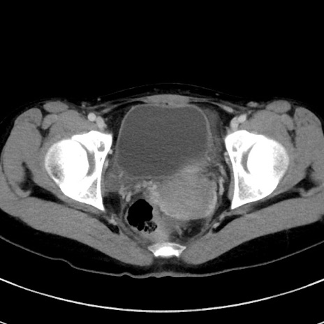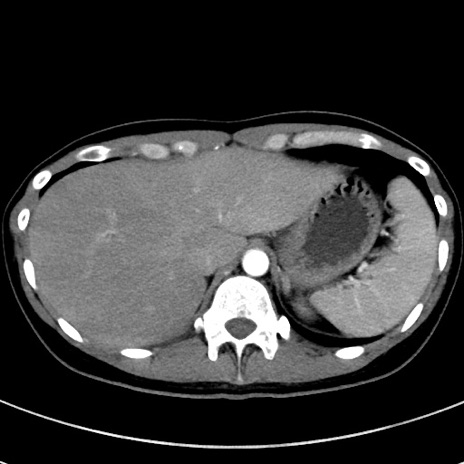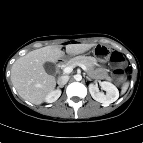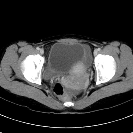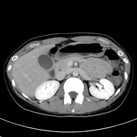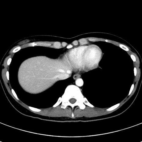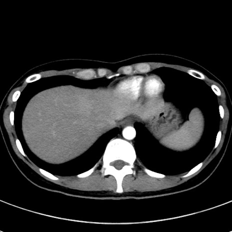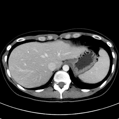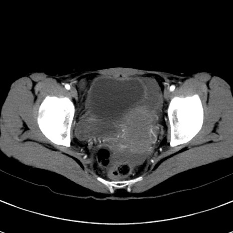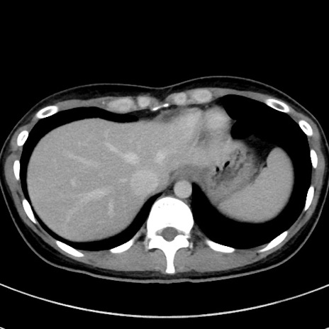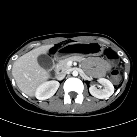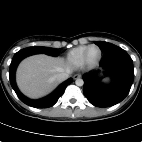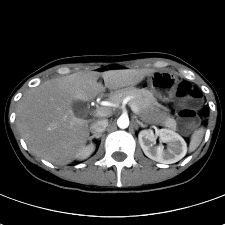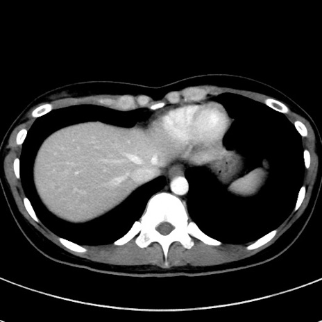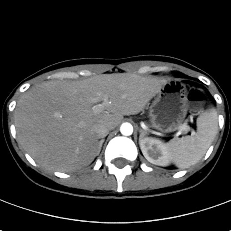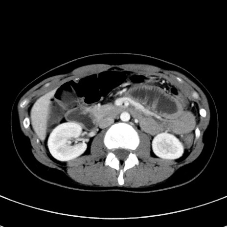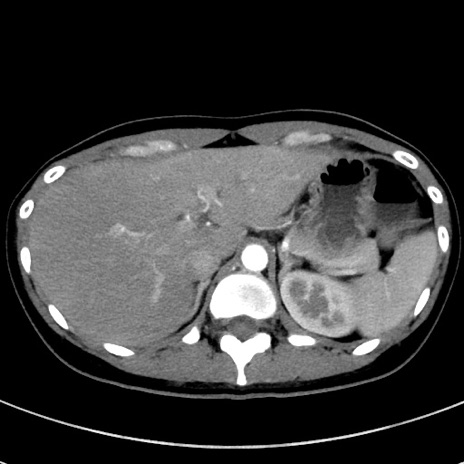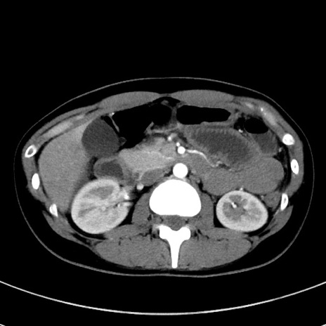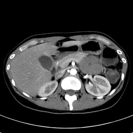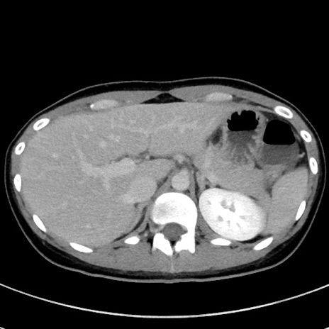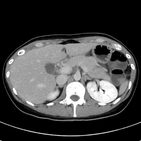 【症例】20歳代女性 【主訴】嘔吐、下腹部痛 【現病歴】昨日夕食後に嘔吐し下腹部痛が出現。本日になっても嘔吐持続し改善しないため来院。 【既往歴】なし。 【身体所見】意識清明、BT 37.2℃、BP 108/67mmHg、腹部:平坦、やや硬、下腹部正中から右にかけて圧痛あり、反跳痛軽度あり、tapping pain(+)。 【データ】WBC 13600、CRP 14.94