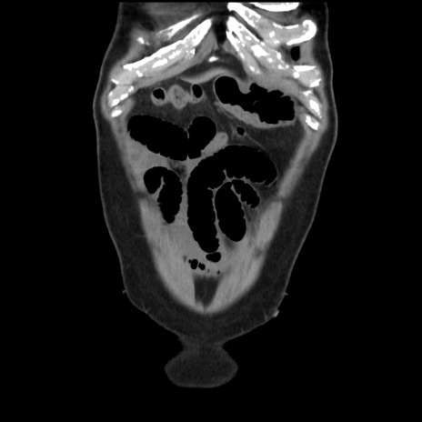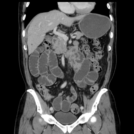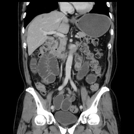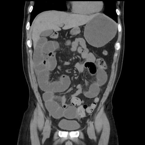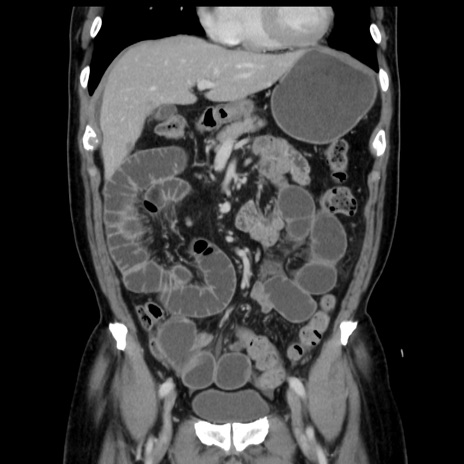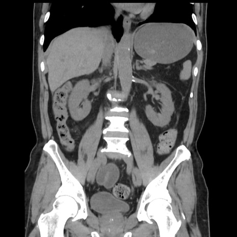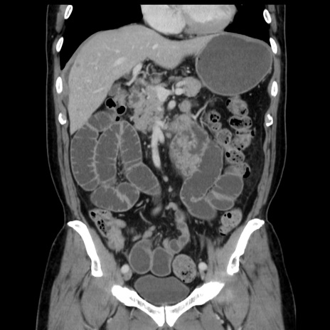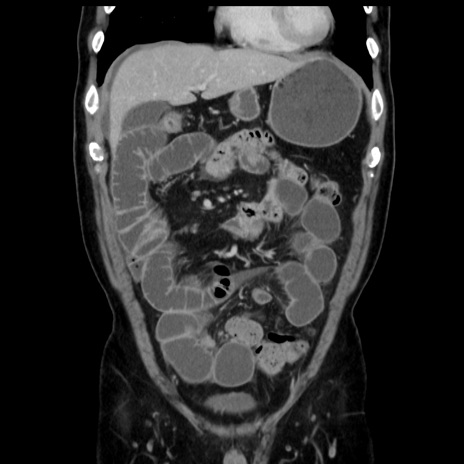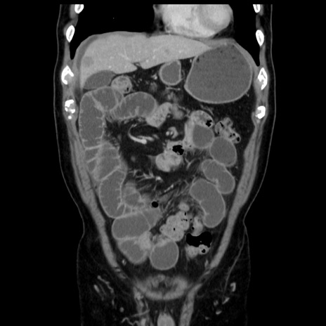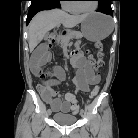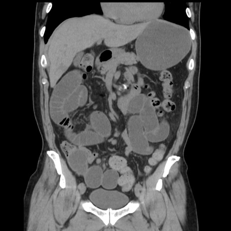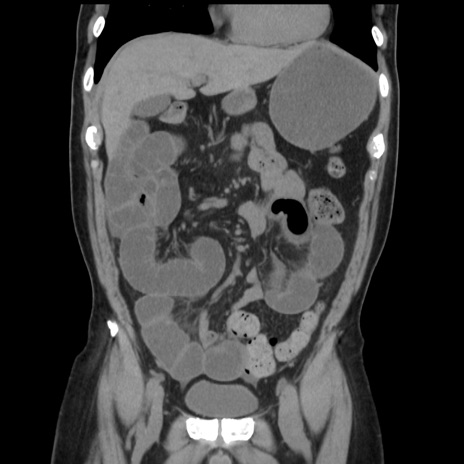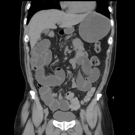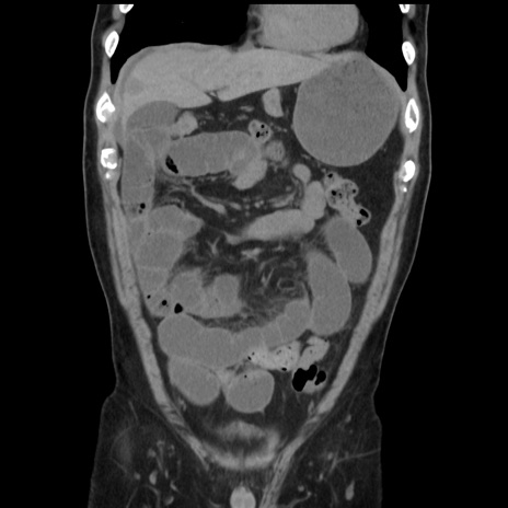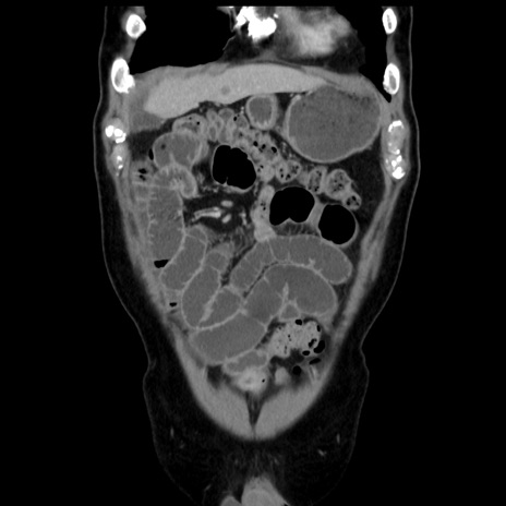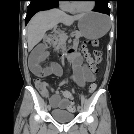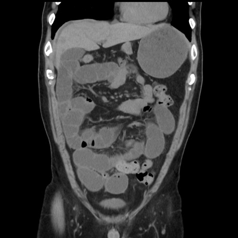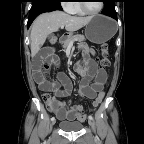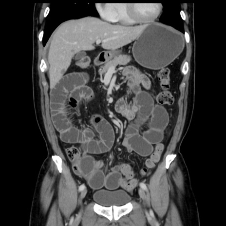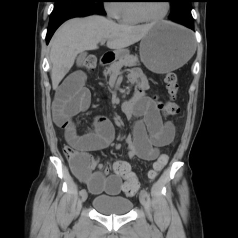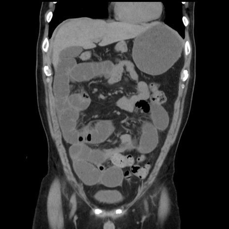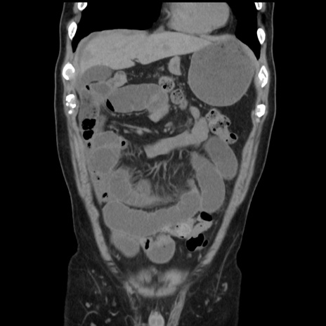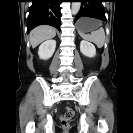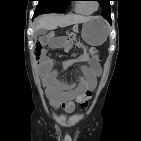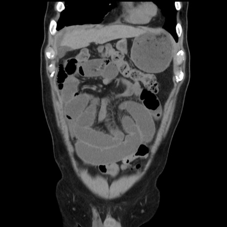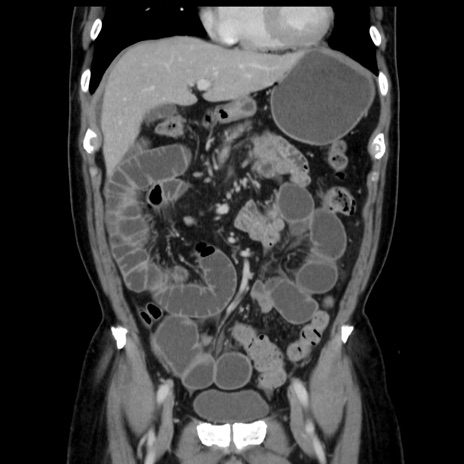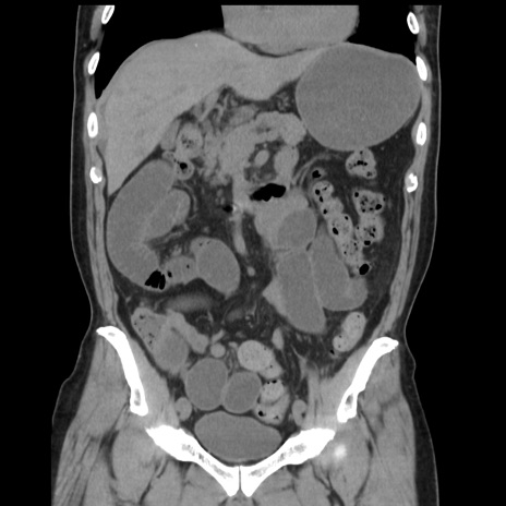 【現病歴】 約1ヶ月前より間欠的に腹痛と嘔吐あり、当院消化器内科を受診したところCTで多発する肝臓のLDAを指摘され、精査中であった。以降は消化器症状は安定していたが、2日前より嘔気と腹痛があり、同日より排便・排ガスが消失した。改善認めず、 本日、救急外来を受診した。