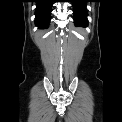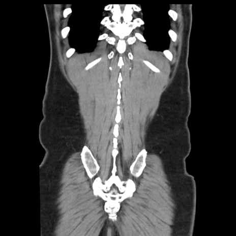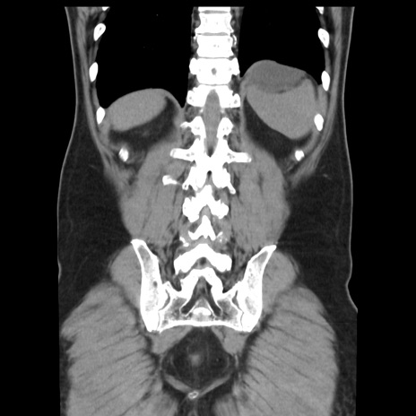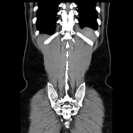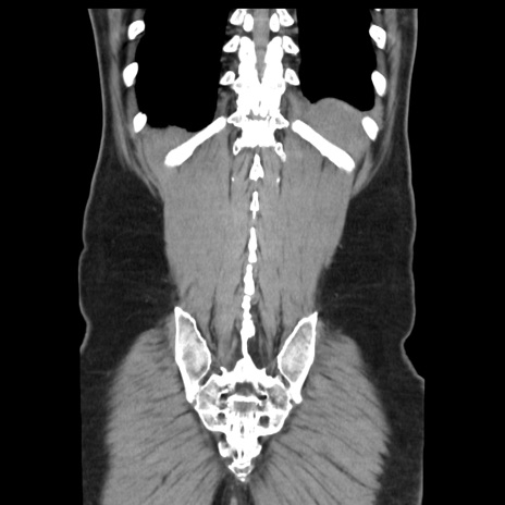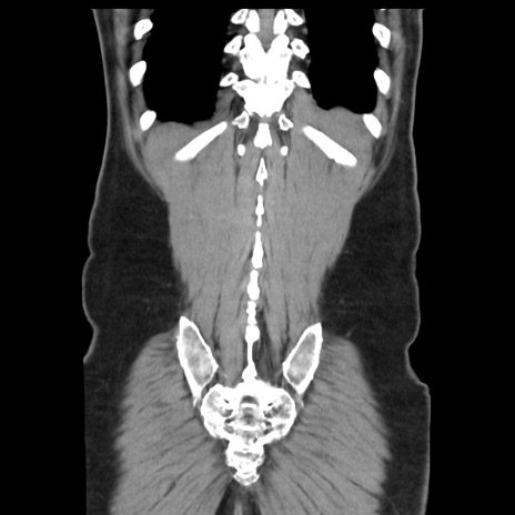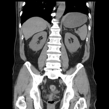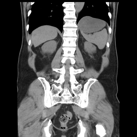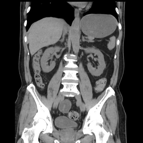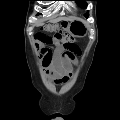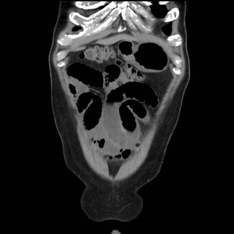 【身体所見】意識清明・会話良好、BT 36.3℃、BP 127/80mmHg、 P 80bpm、腹部:膨満あり、平坦・軟、上腹部正中および下腹部正中に圧痛あり、反跳痛なし、筋性防御なし。