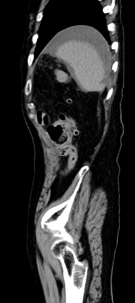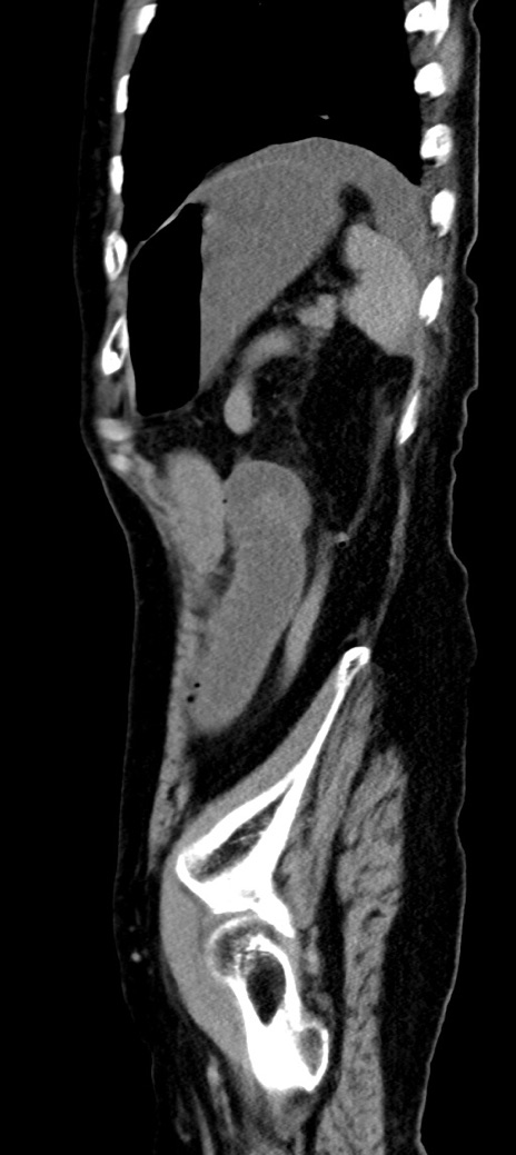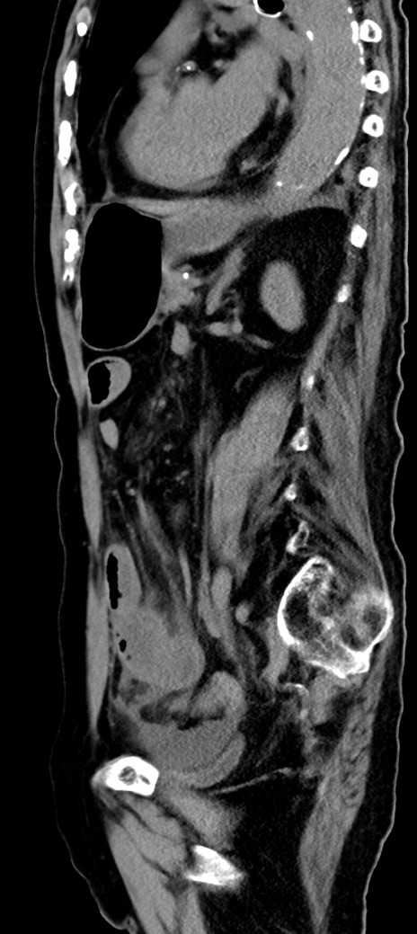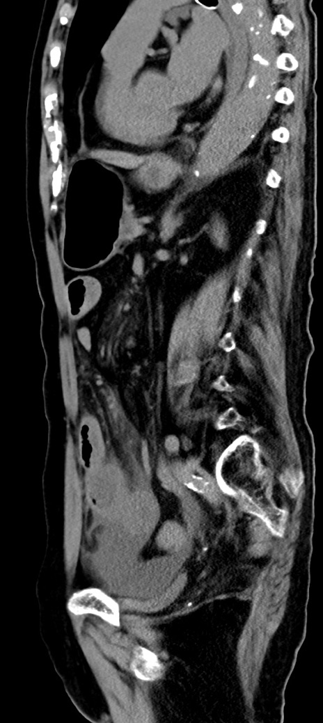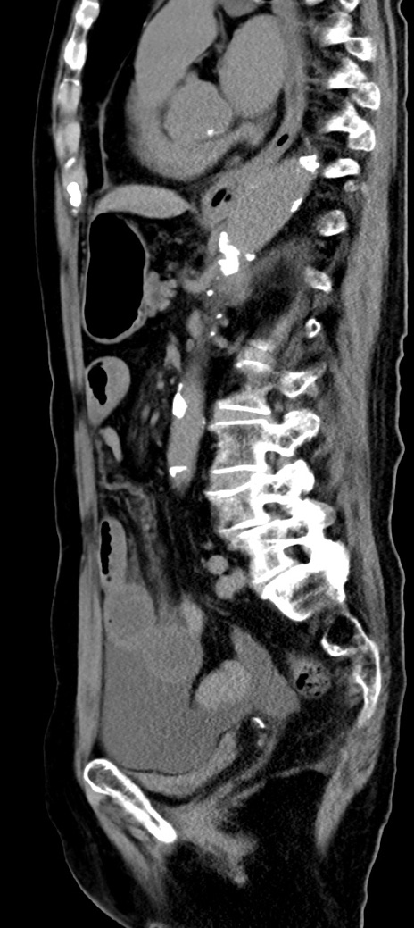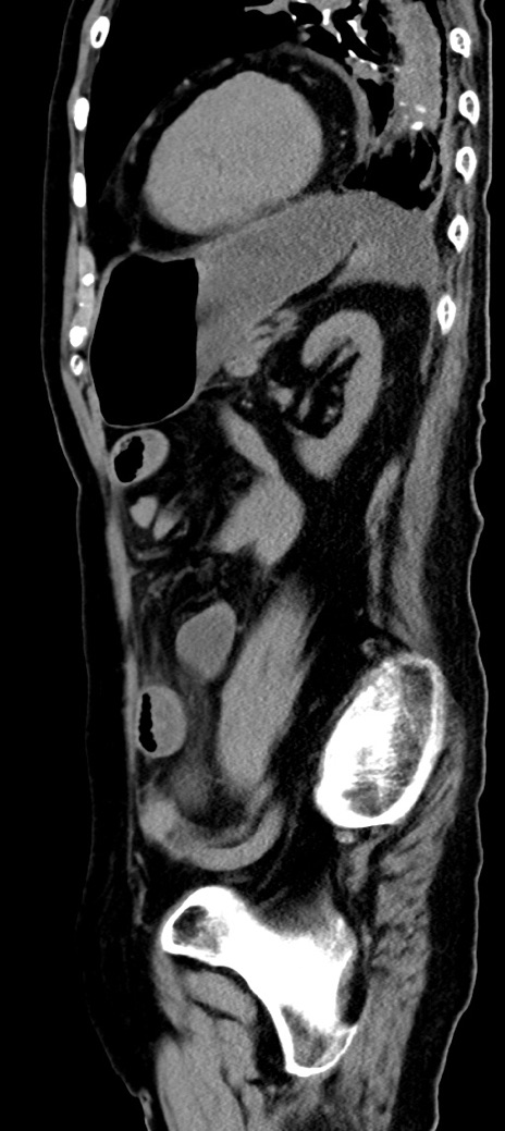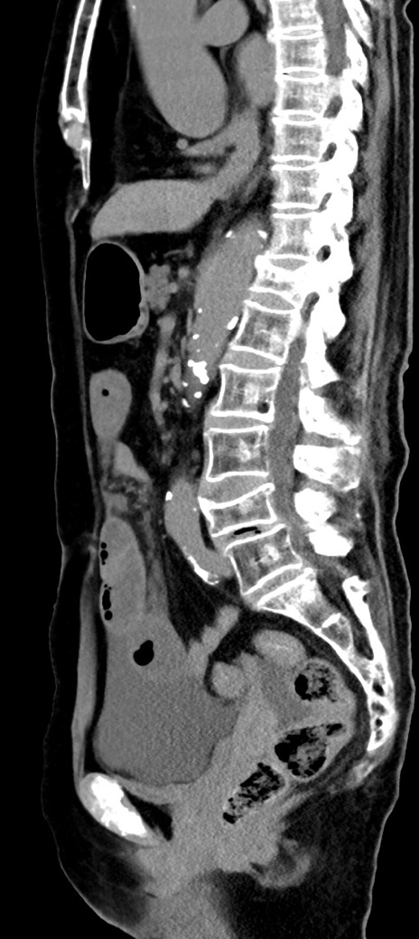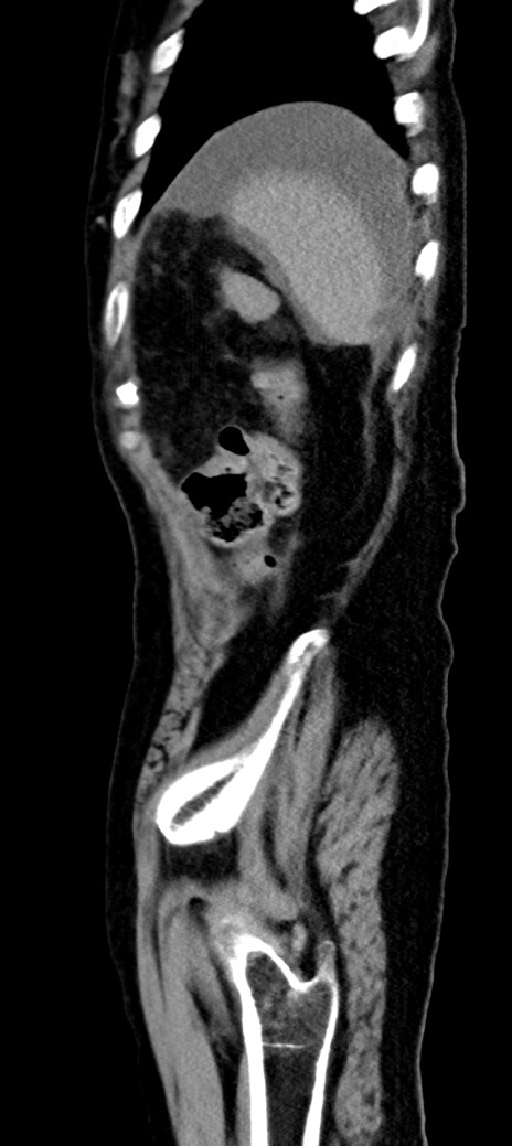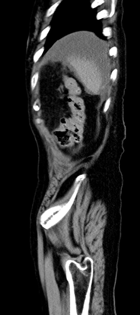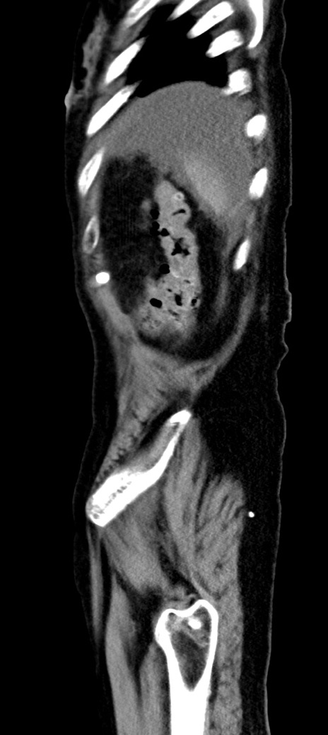 【症例】90歳代女性 【主訴】腹痛・嘔吐 【現病歴】 食欲低下、嘔吐があり昨日他院受診。肺炎と診断され入院となる。入院後より腹部全体に圧痛あり。胃管留置され経過みていたが、症状持続するため、当院転院となる。 【既往歴】胸椎圧迫骨折、胆石症 【身体所見】腹部:中央に激痛あり、圧痛あり、反跳痛不明 【データ】WBC 17100、CRP 18.82