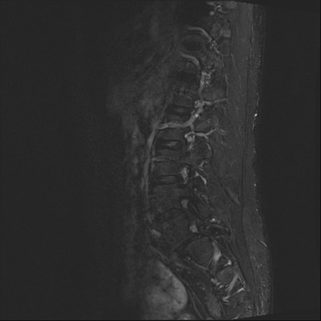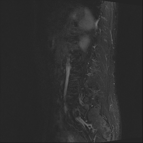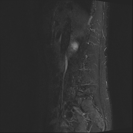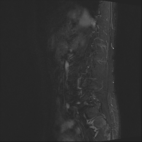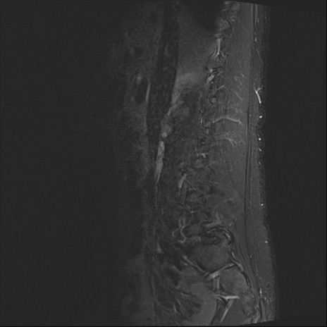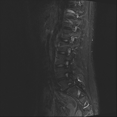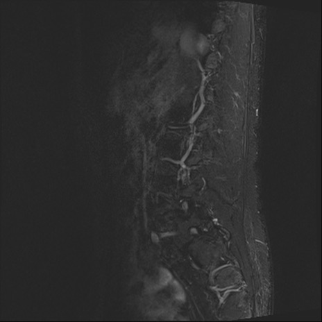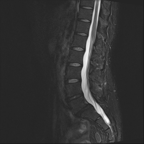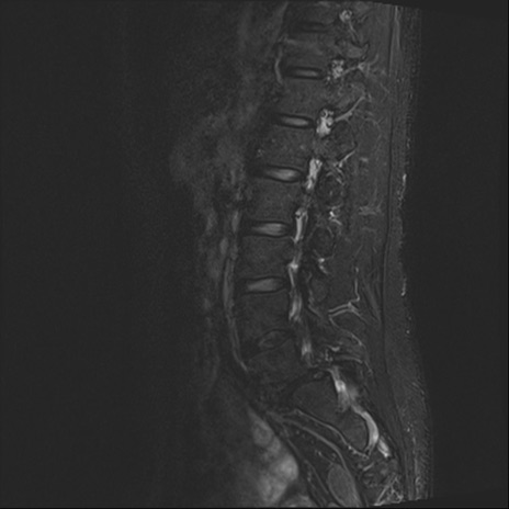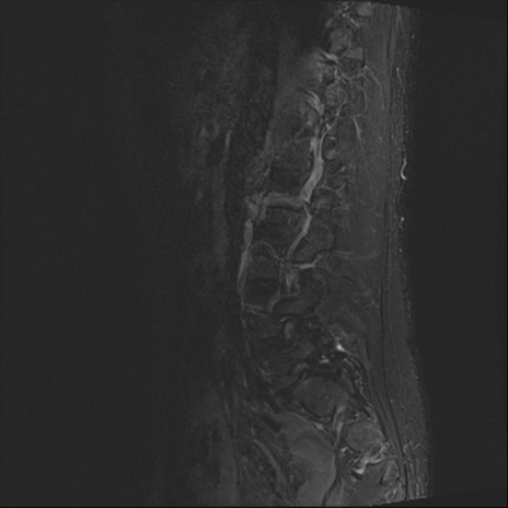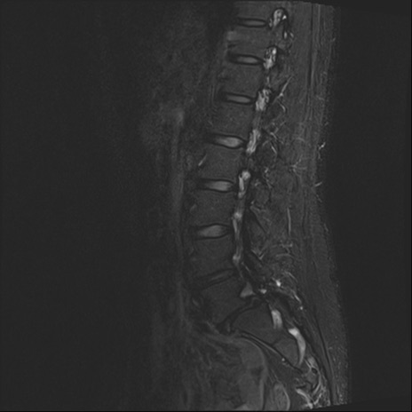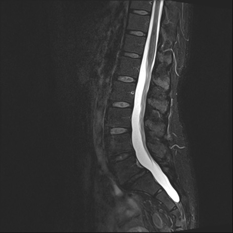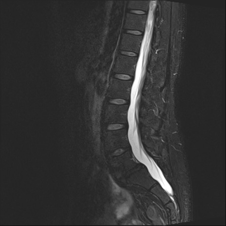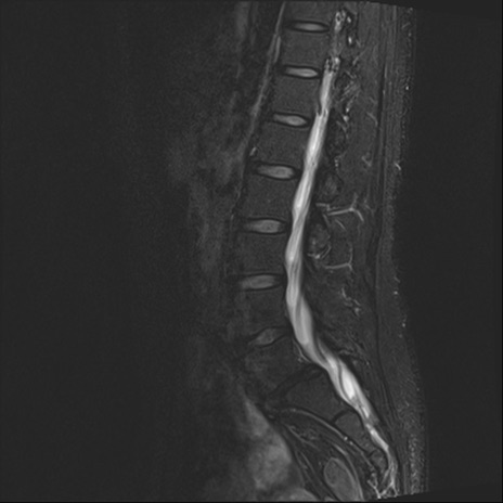 【症例】30歳代男性 【主訴】腰痛、両大腿後面の痛み 【現病歴】高校時代に●●を指摘されたが経過観察されてきた。体動時の腰痛があり、長時間立位、坐位にて両大腿後面の痛みを感じる。外来にて経過観察されてきたが改善ない。 【身体所見】SLR 60/60、TA5/5,EHL 5/5,FHL 5/5、psoas 5/5、quad 5/5、PTR+/+、ATR+/+、babinski-/-、長時間歩行で症状あるがなんとか歩いている。安静時痛なし。体動時、長時間立位、坐位にて症状あり。