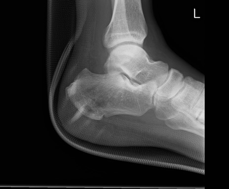 【症例】50歳代男性 【主訴】左踵部の痛み、腫脹 【現病歴】4日前に1.5m程度の高さのトラックの荷台から荷物と一緒に転落し、左足部を打撲。近医受診し、当院へ紹介受診となる。 【身体所見】左踵部の腫脹、圧痛あり。