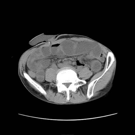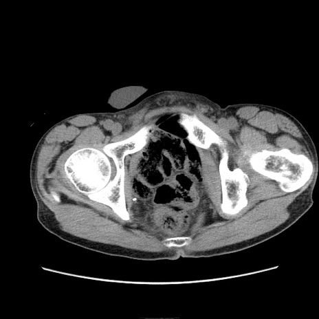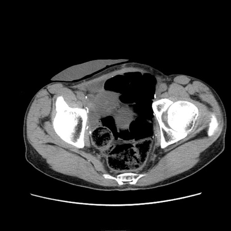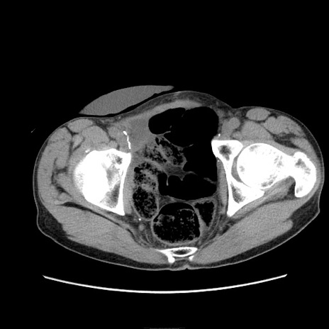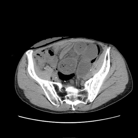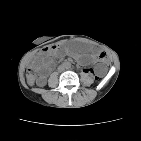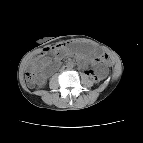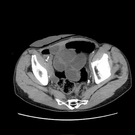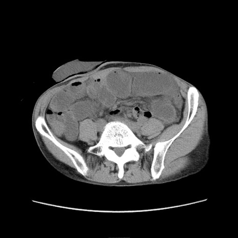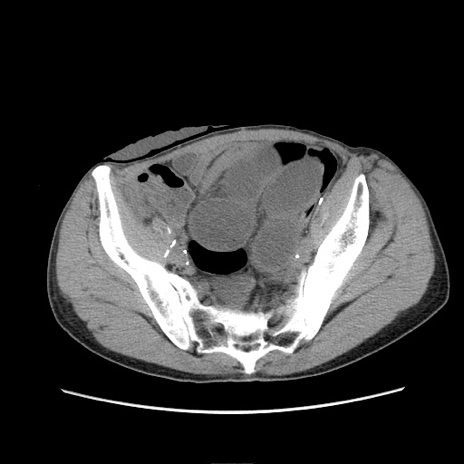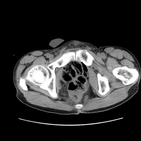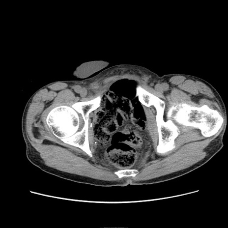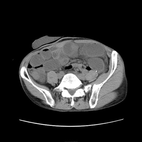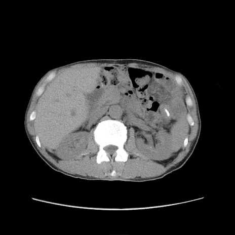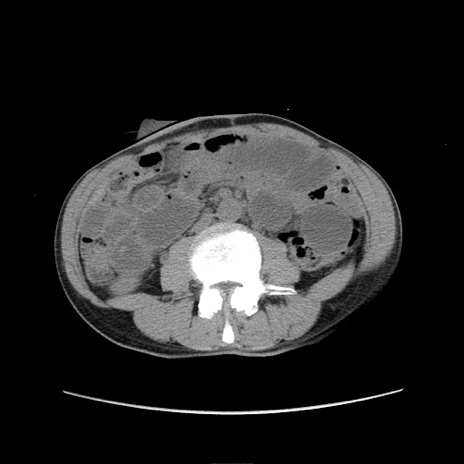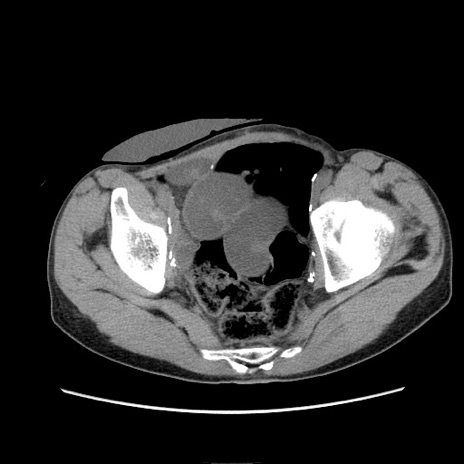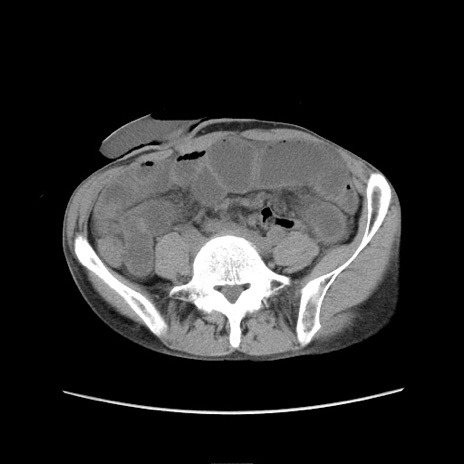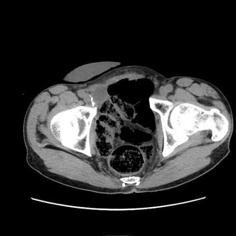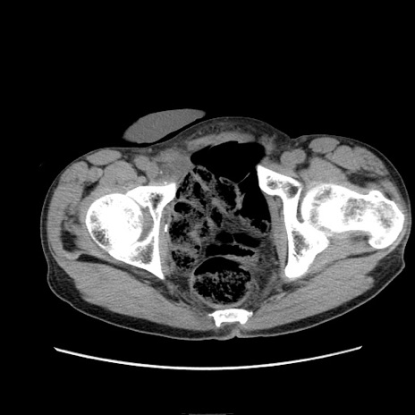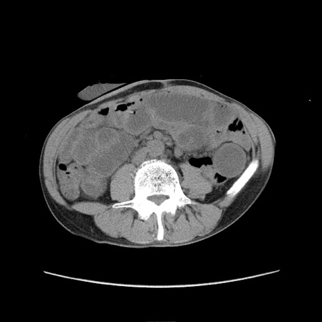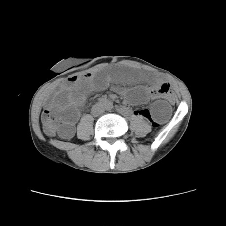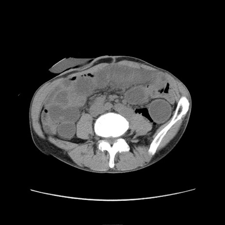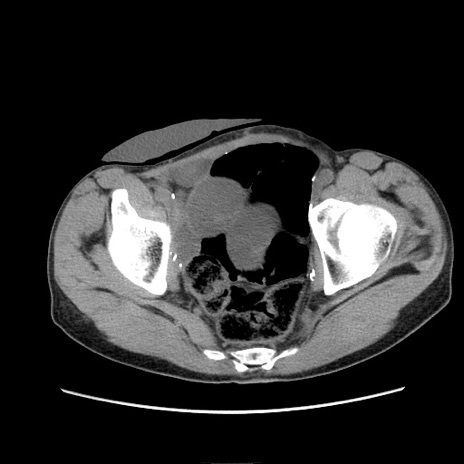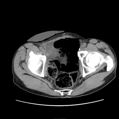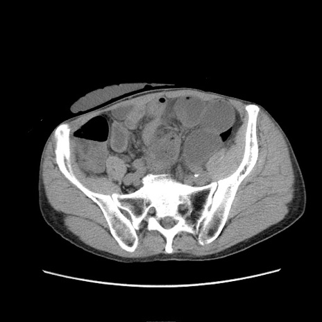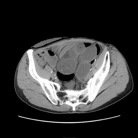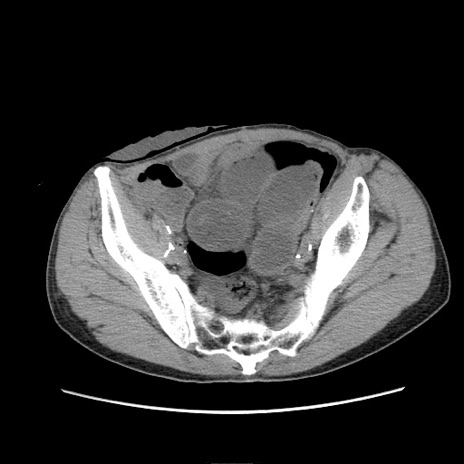 【症例】 60歳代男性 【主訴】 下腹部痛 【現病歴】 本日夜中より下腹部痛の症状認め、受診。 【既往歴】 膀胱癌(膀胱全摘+尿管皮膚瘻術) 、胃癌術後 【身体所見】 BT 35.3℃、PR 58/min、BP 136/98mHg、腹部平坦、軟、腸蠕動音±、ストマ留置あり、左上腹部~正中部に圧痛あり、反跳痛なし。 【データ】WBC 5100、CRP0.01