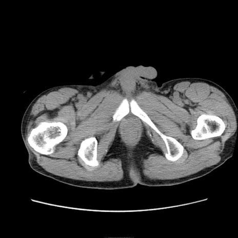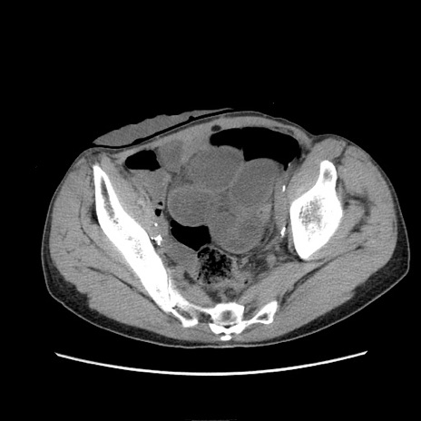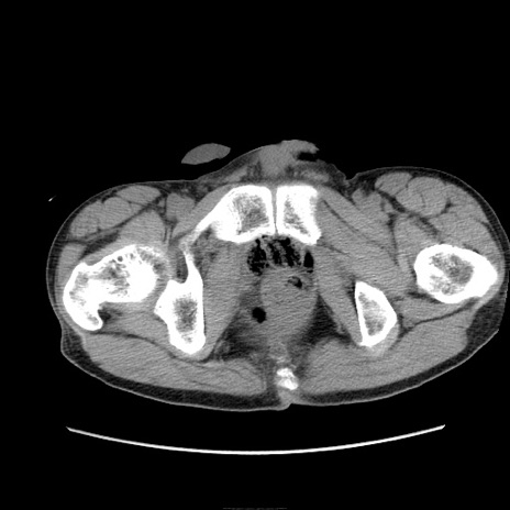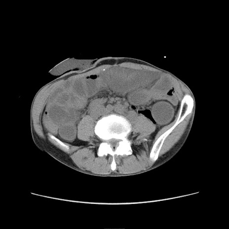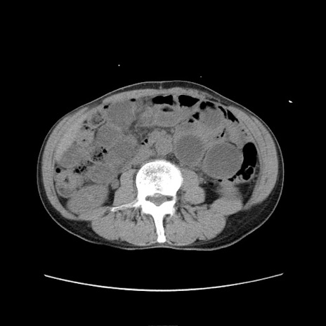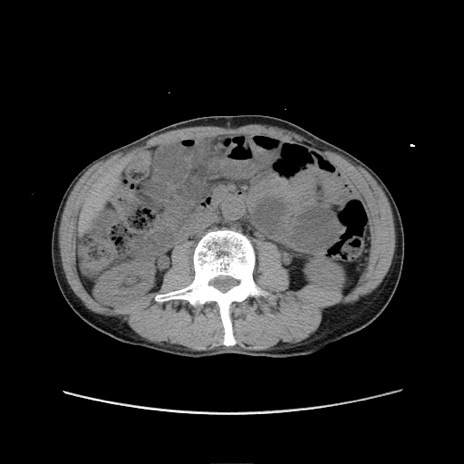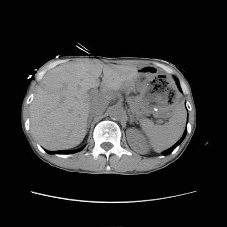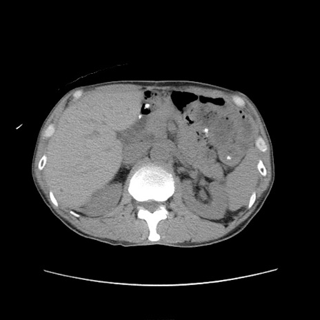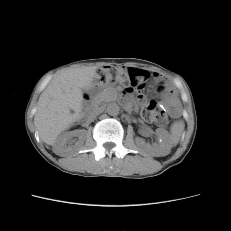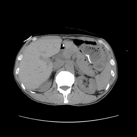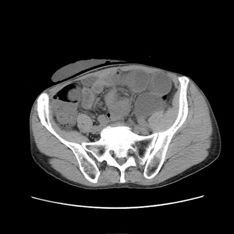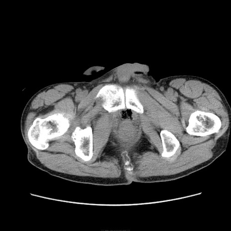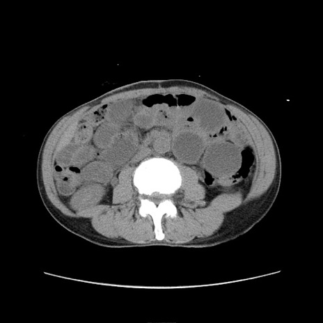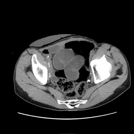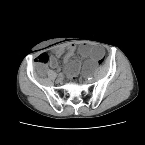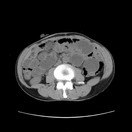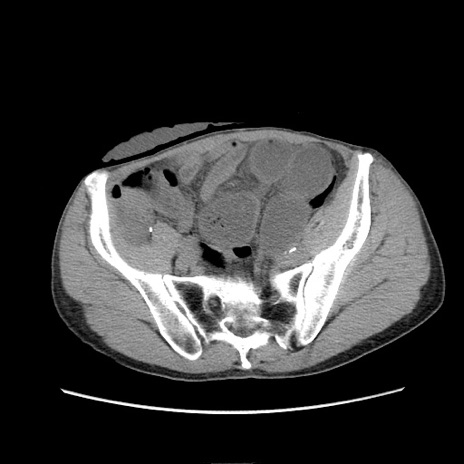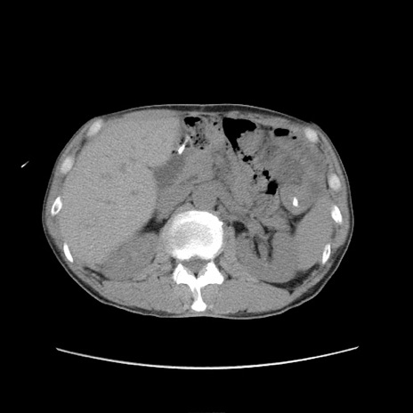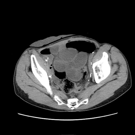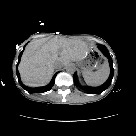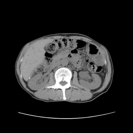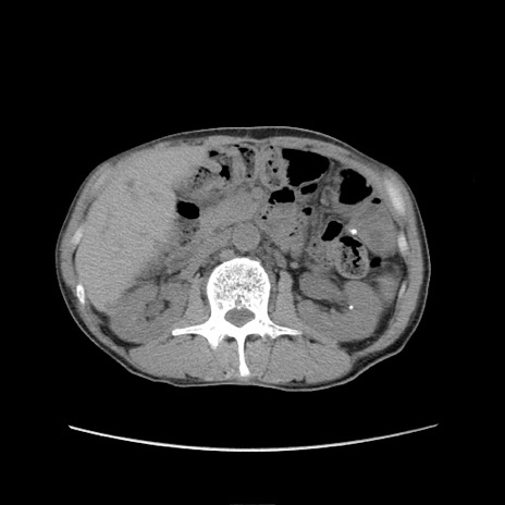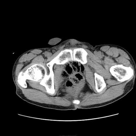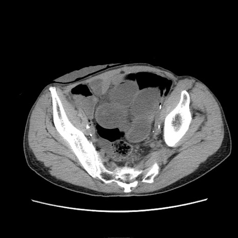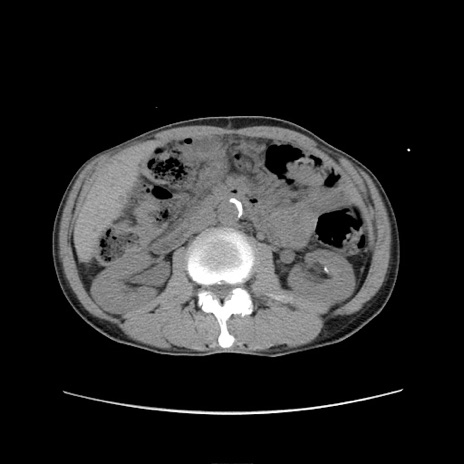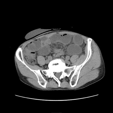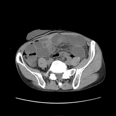 【症例】 60歳代男性 【主訴】 下腹部痛 【現病歴】 本日夜中より下腹部痛の症状認め、受診。 【既往歴】 膀胱癌(膀胱全摘+尿管皮膚瘻術) 、胃癌術後 【身体所見】 BT 35.3℃、PR 58/min、BP 136/98mHg、腹部平坦、軟、腸蠕動音±、ストマ留置あり、左上腹部~正中部に圧痛あり、反跳痛なし。 【データ】WBC 5100、CRP0.01