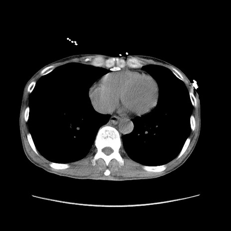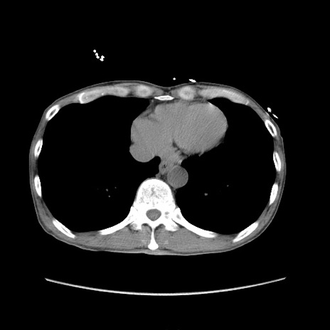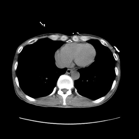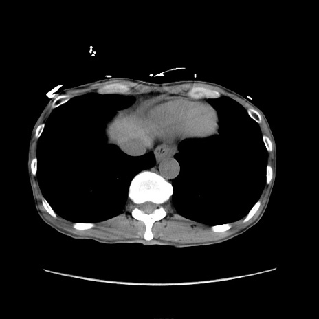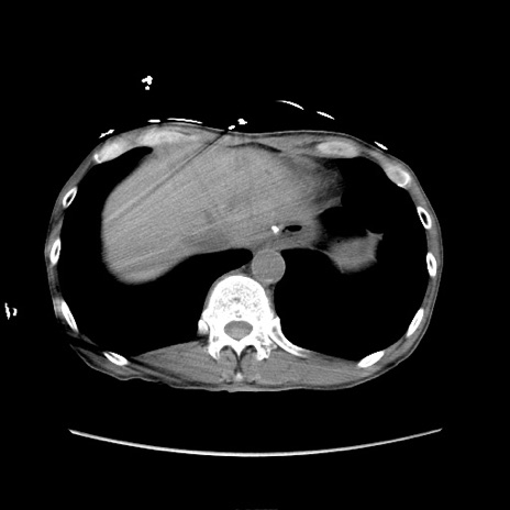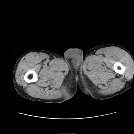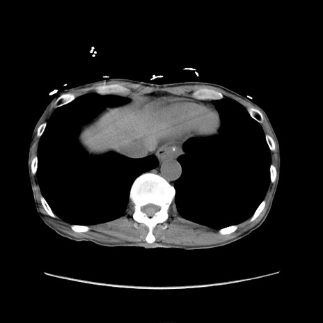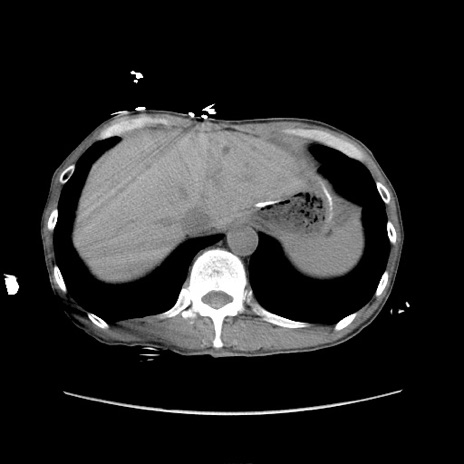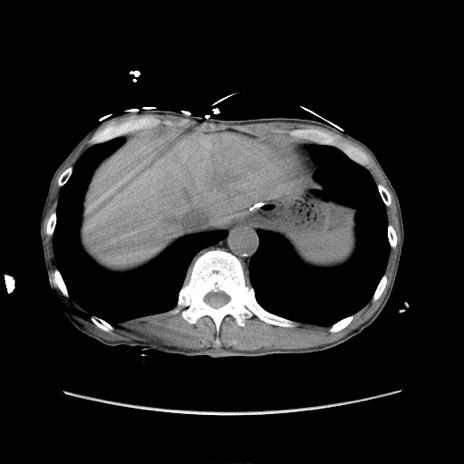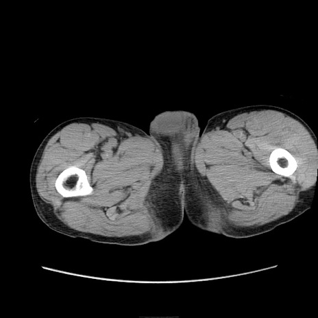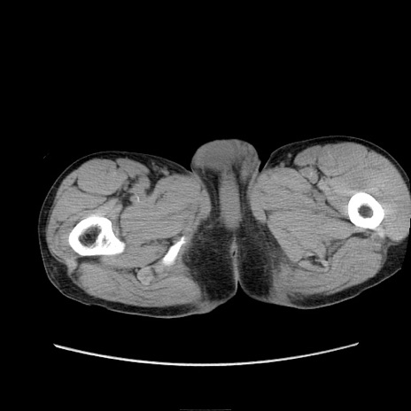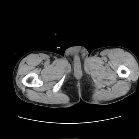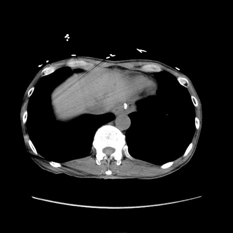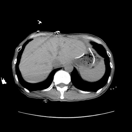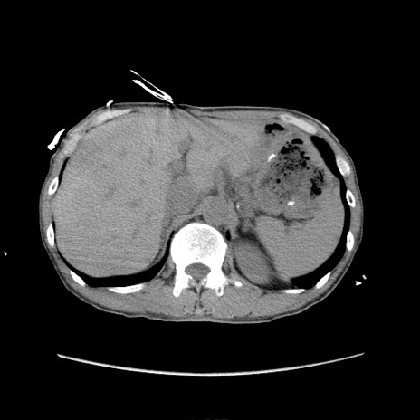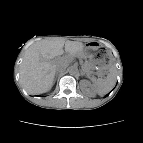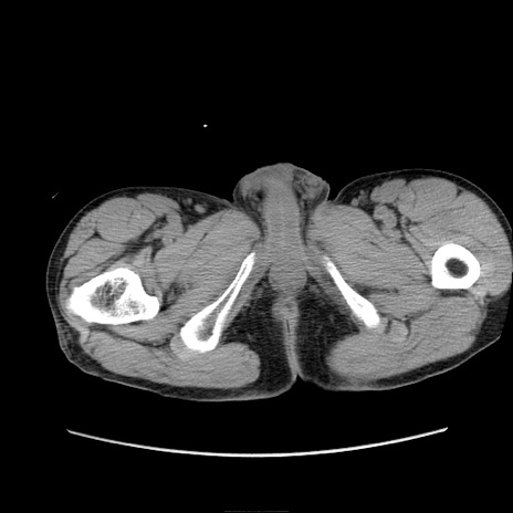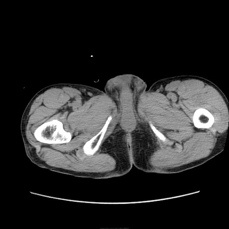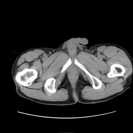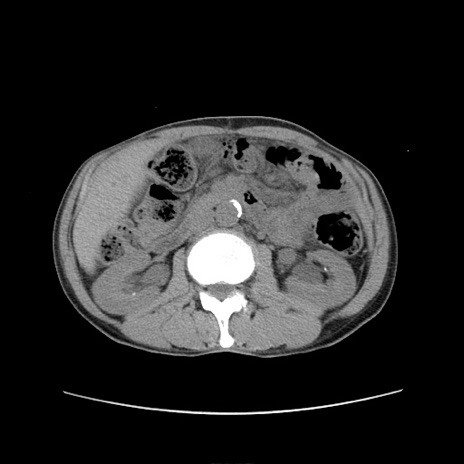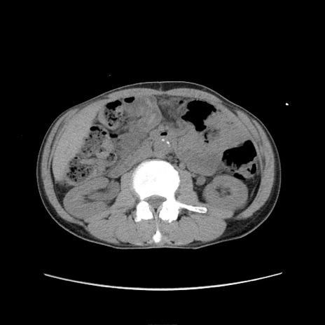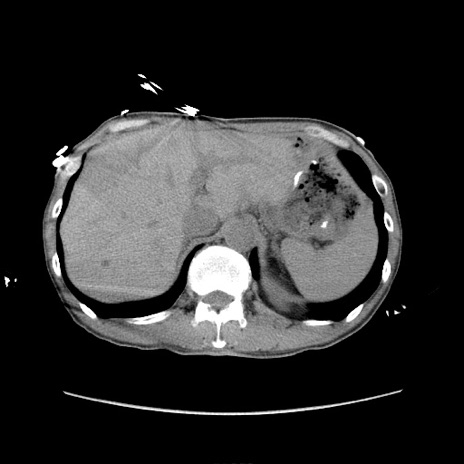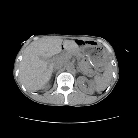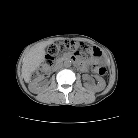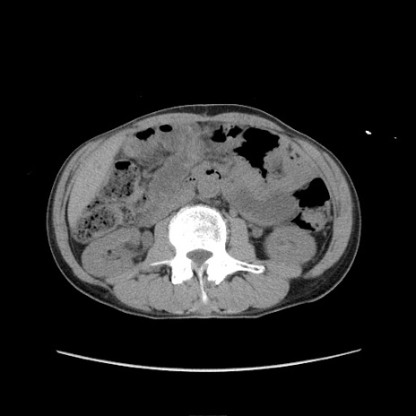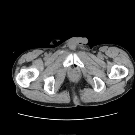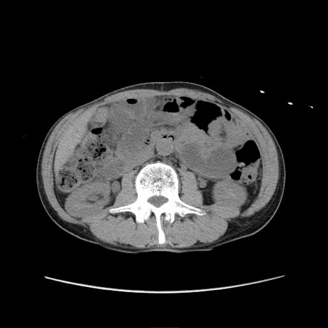 【症例】 60歳代男性 【主訴】 下腹部痛 【現病歴】 本日夜中より下腹部痛の症状認め、受診。 【既往歴】 膀胱癌(膀胱全摘+尿管皮膚瘻術) 、胃癌術後 【身体所見】 BT 35.3℃、PR 58/min、BP 136/98mHg、腹部平坦、軟、腸蠕動音±、ストマ留置あり、左上腹部~正中部に圧痛あり、反跳痛なし。 【データ】WBC 5100、CRP0.01