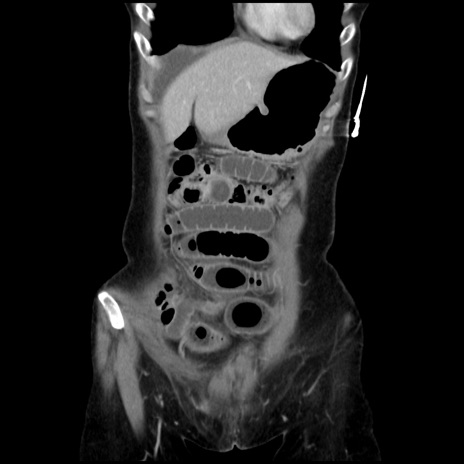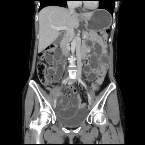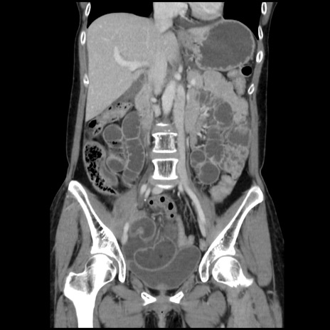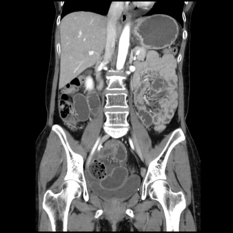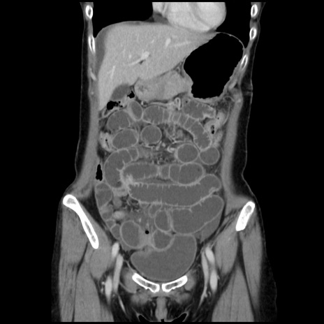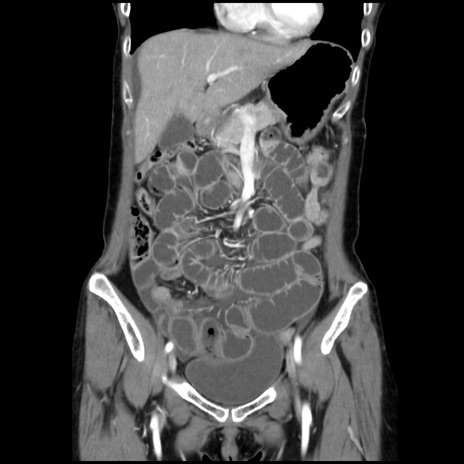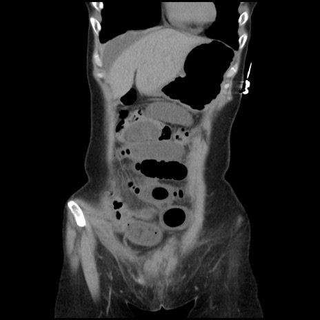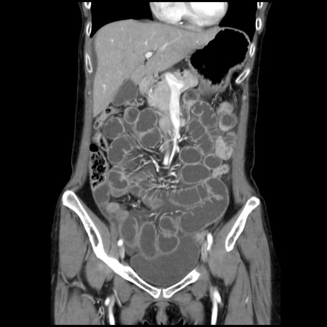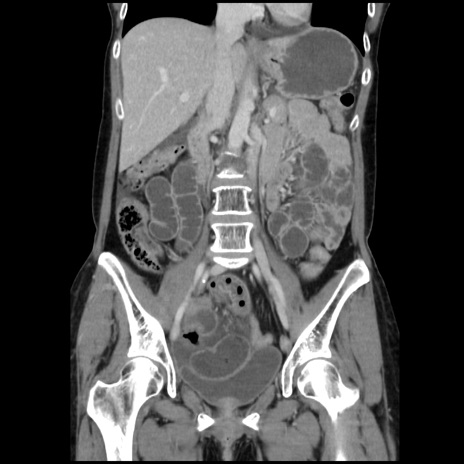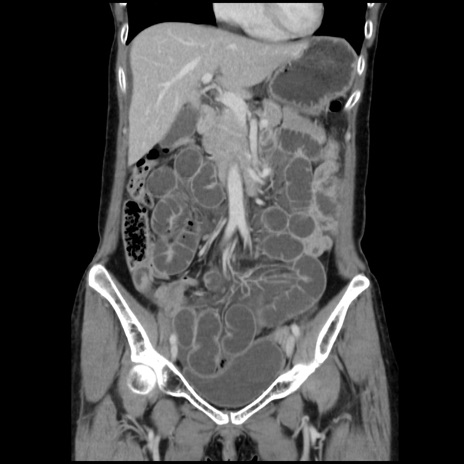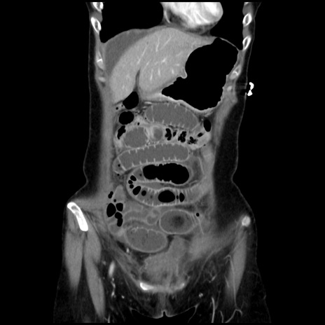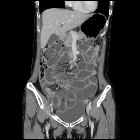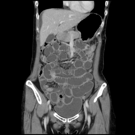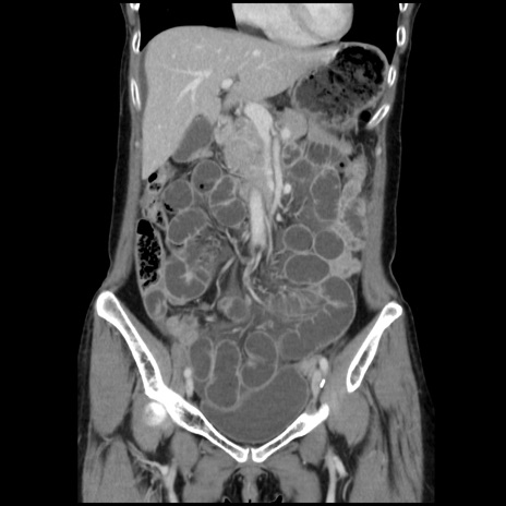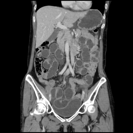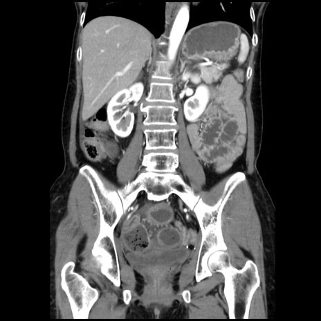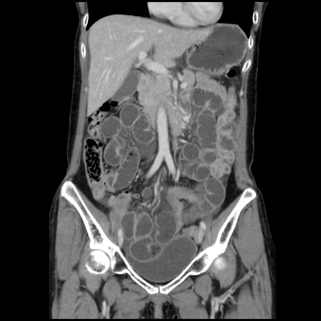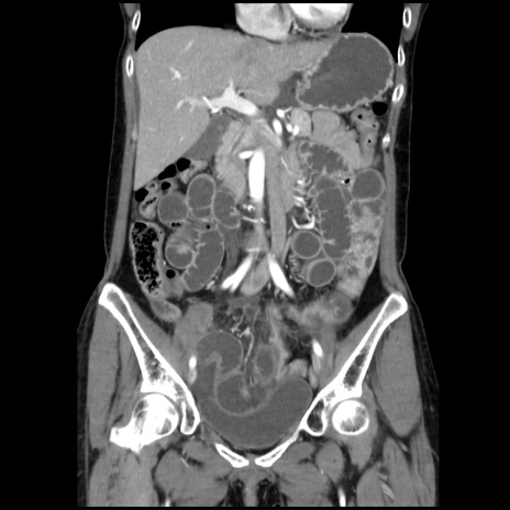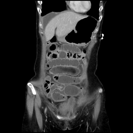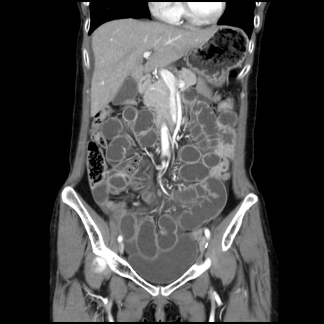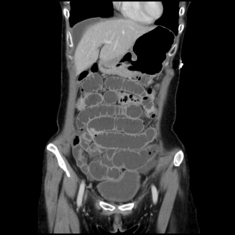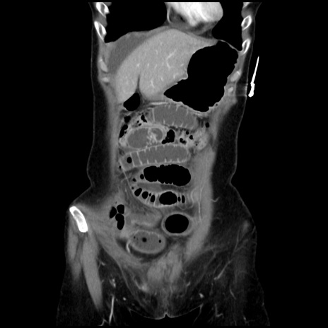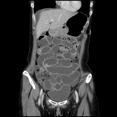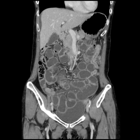 【症例】40歳代 女性 【主訴】上腹部痛、嘔気・嘔吐 【現病歴】約9時間前頃から急に上腹部痛、嘔気、嘔吐が出現。改善しないため救急要請。 【既往歴】子宮頚癌(広汎子宮全摘術、放射線療法)、腸閉塞 【身体所見】腹部:平坦、軟、腸雑音亢進、上腹部を中心に腹部全体に圧痛あり。 【データ】WBC 8400、CRP 0.03
