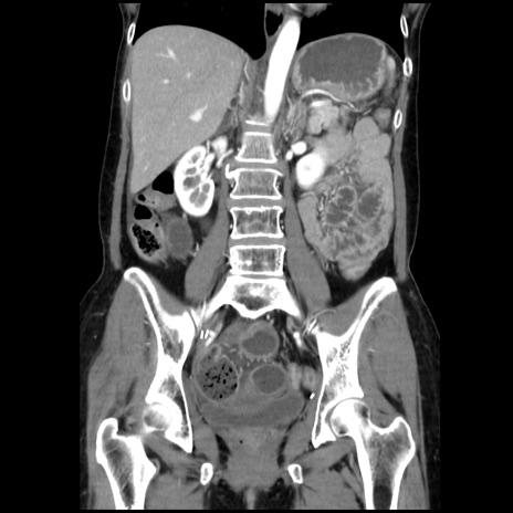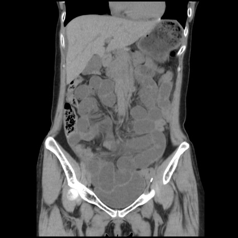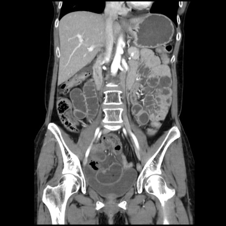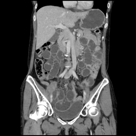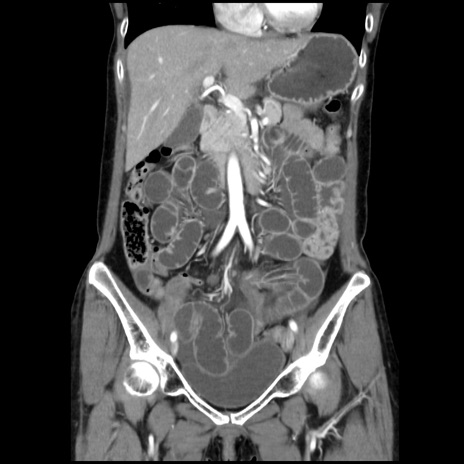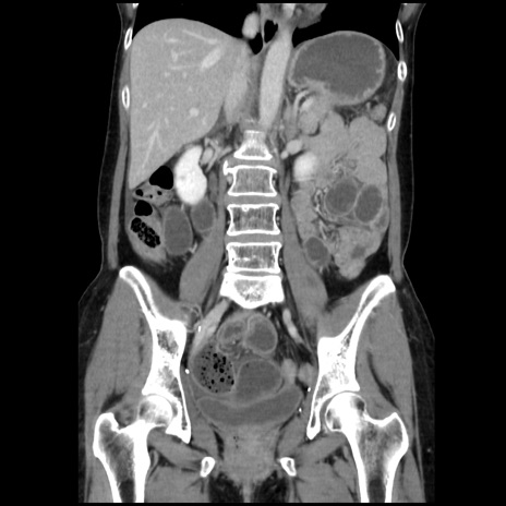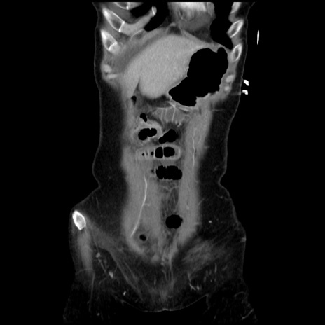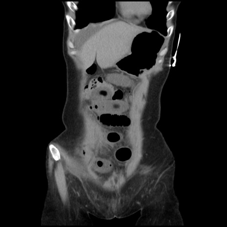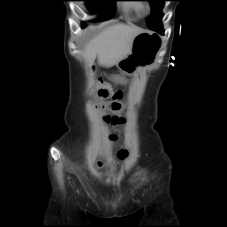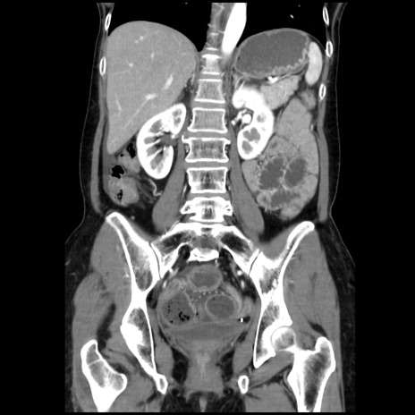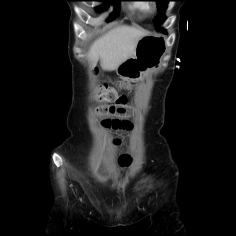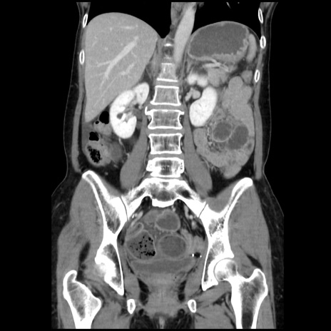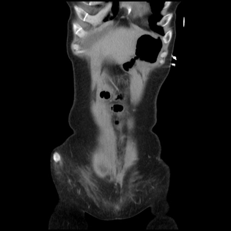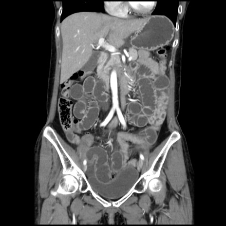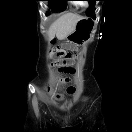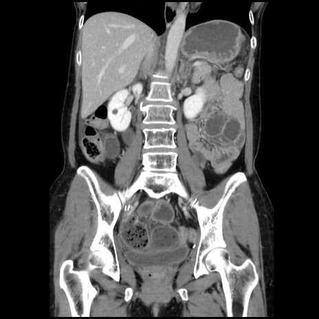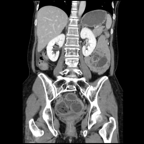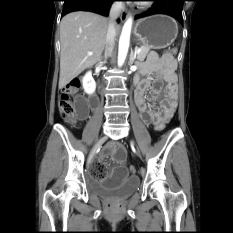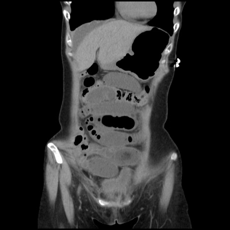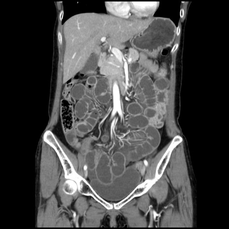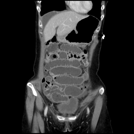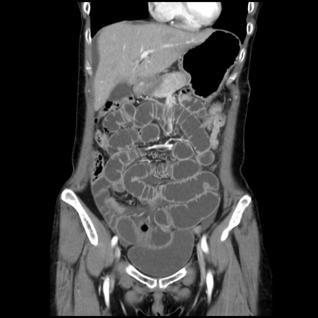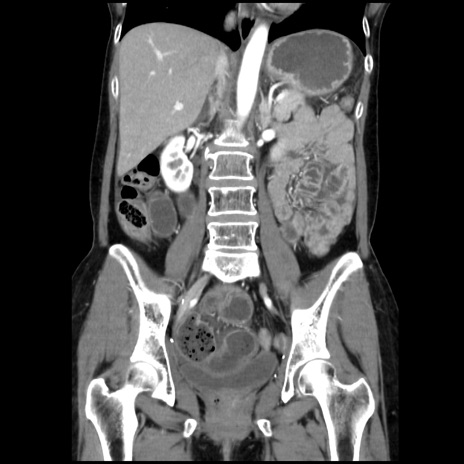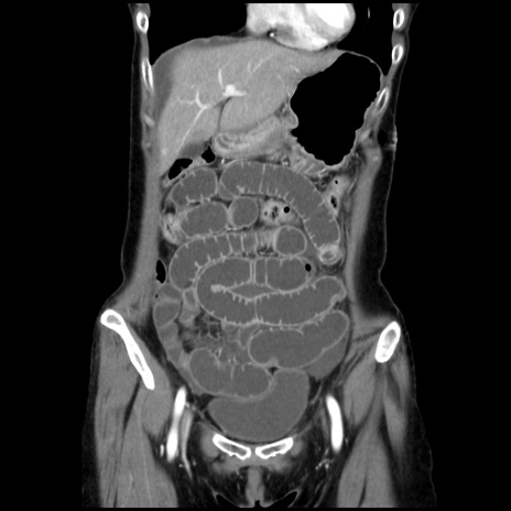 【症例】40歳代 女性 【主訴】上腹部痛、嘔気・嘔吐 【現病歴】約9時間前頃から急に上腹部痛、嘔気、嘔吐が出現。改善しないため救急要請。 【既往歴】子宮頚癌(広汎子宮全摘術、放射線療法)、腸閉塞 【身体所見】腹部:平坦、軟、腸雑音亢進、上腹部を中心に腹部全体に圧痛あり。 【データ】WBC 8400、CRP 0.03