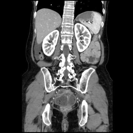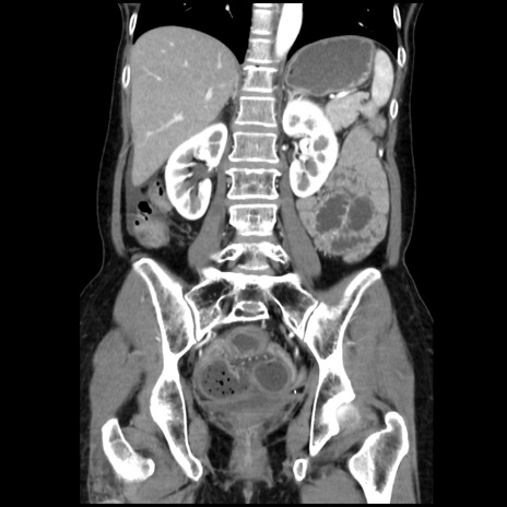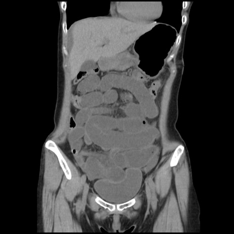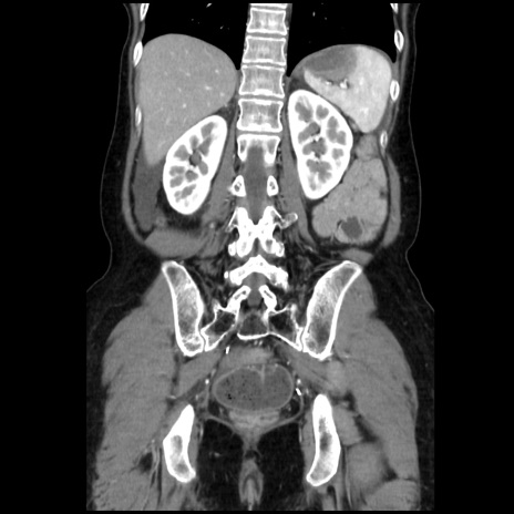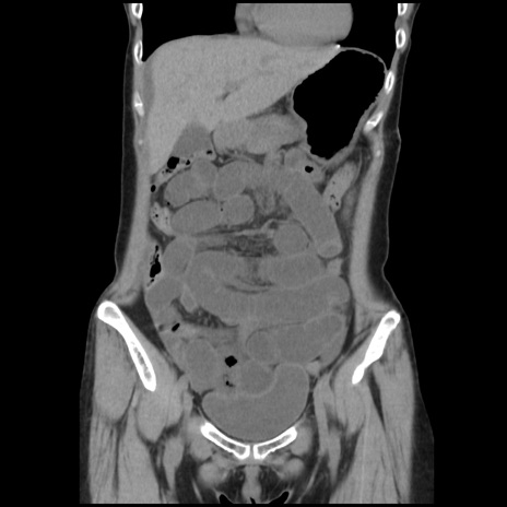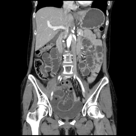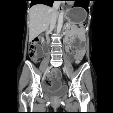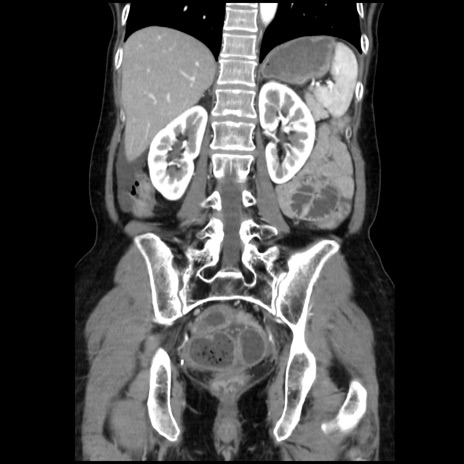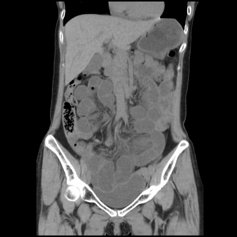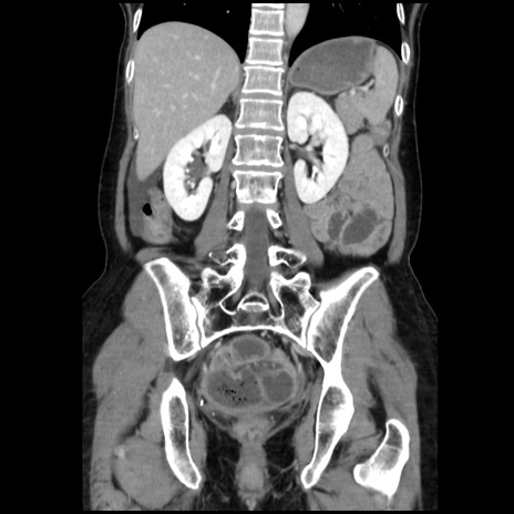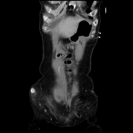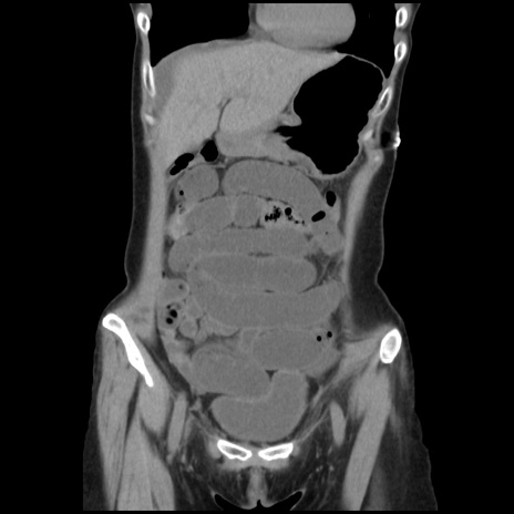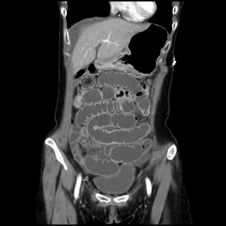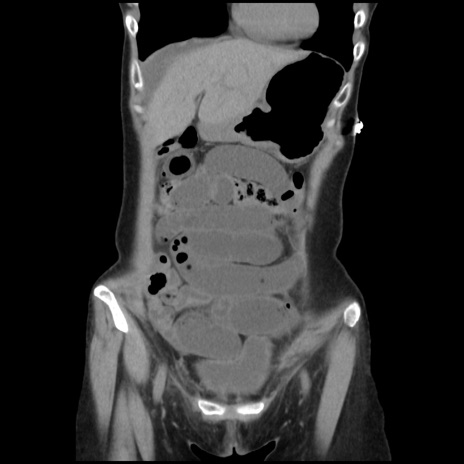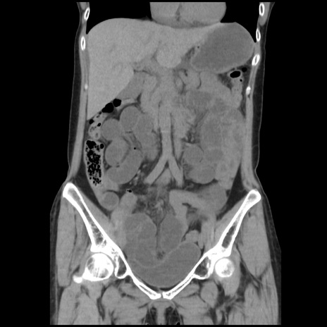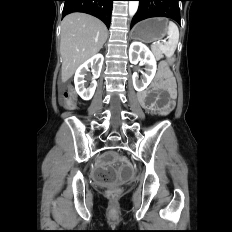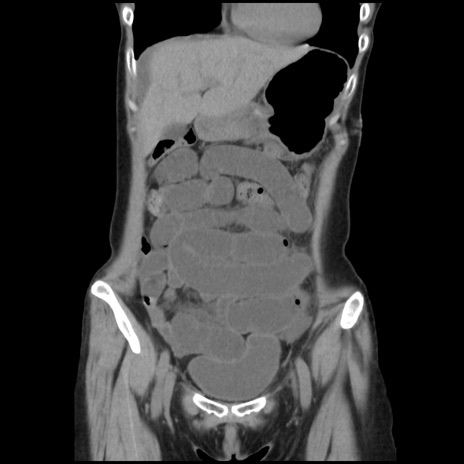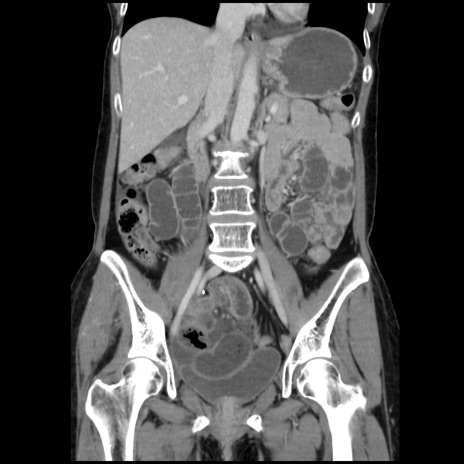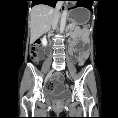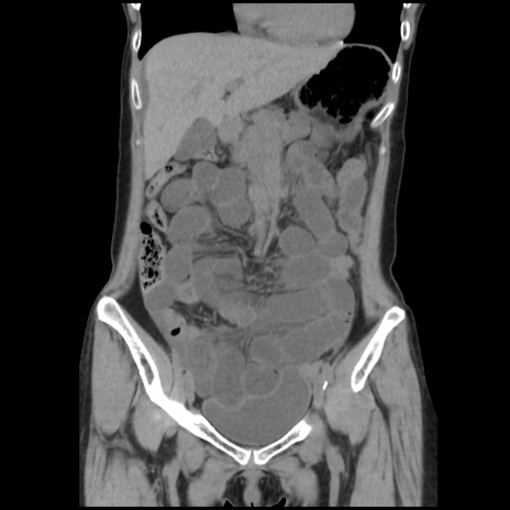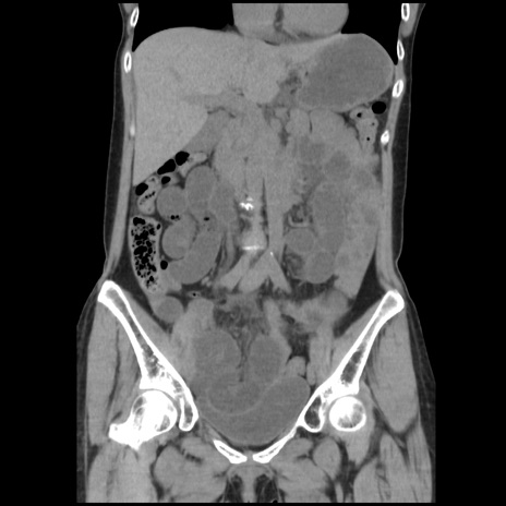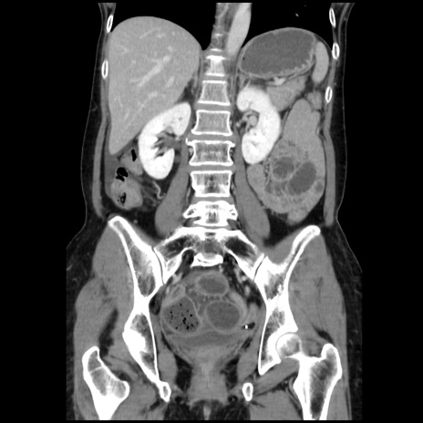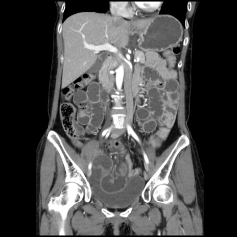 【症例】40歳代 女性 【主訴】上腹部痛、嘔気・嘔吐 【現病歴】約9時間前頃から急に上腹部痛、嘔気、嘔吐が出現。改善しないため救急要請。 【既往歴】子宮頚癌(広汎子宮全摘術、放射線療法)、腸閉塞 【身体所見】腹部:平坦、軟、腸雑音亢進、上腹部を中心に腹部全体に圧痛あり。 【データ】WBC 8400、CRP 0.03