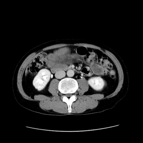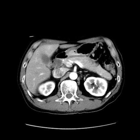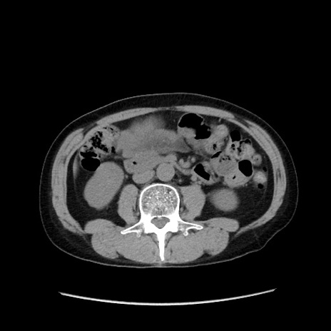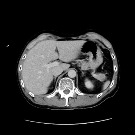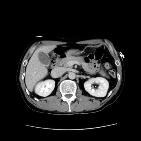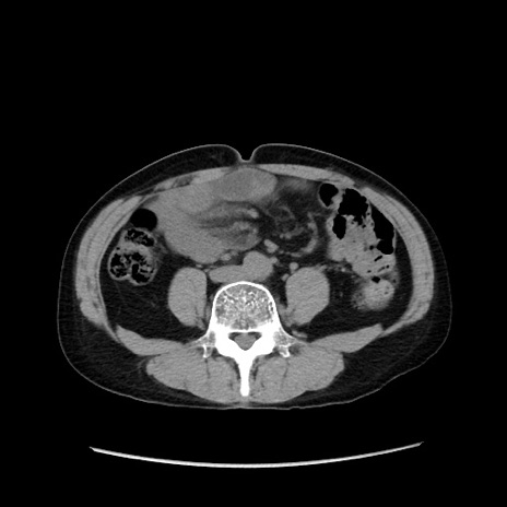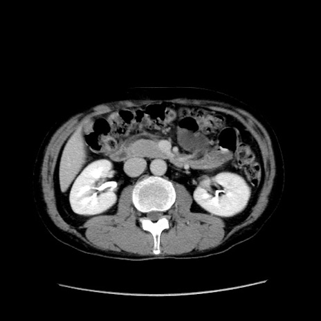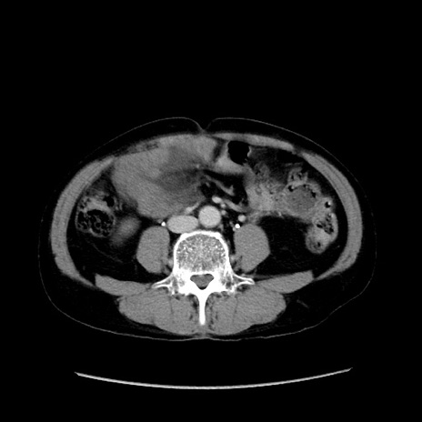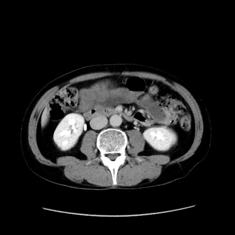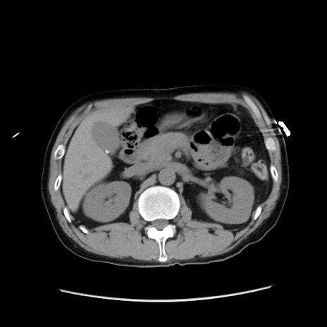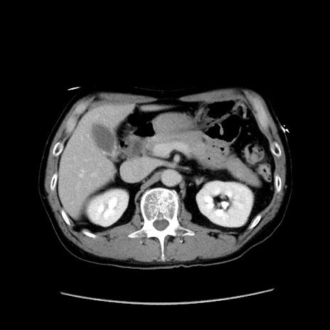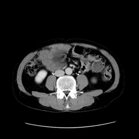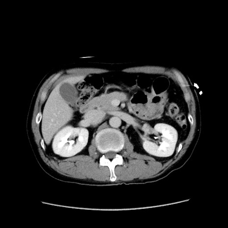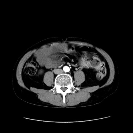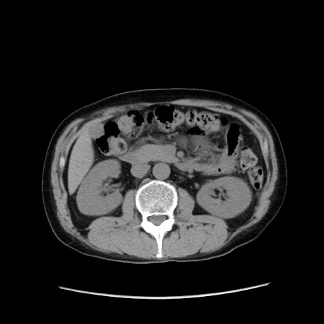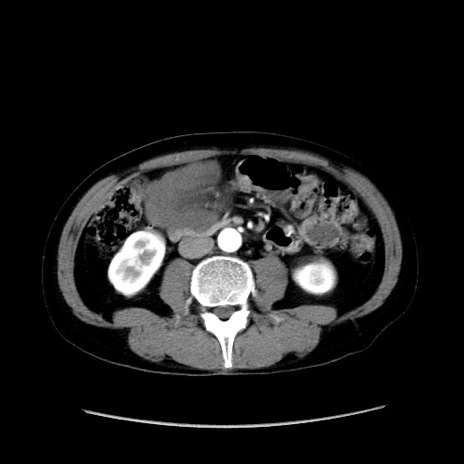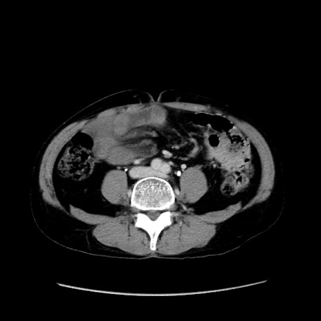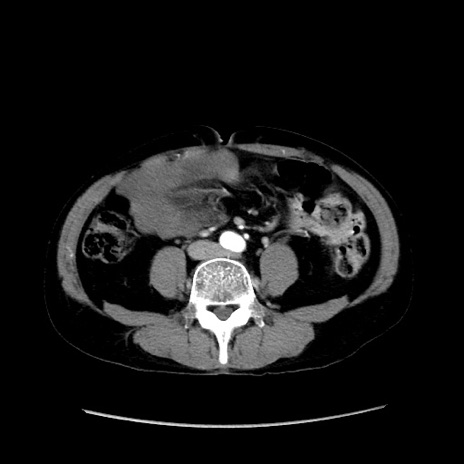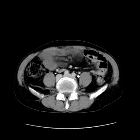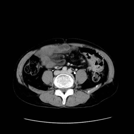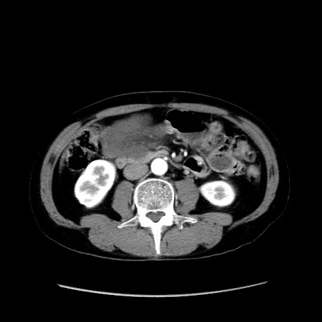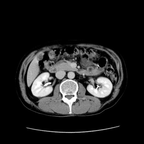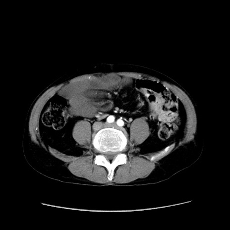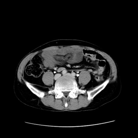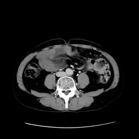 【症例】40歳代 男性 【主訴】腹痛 【現病歴】4時間ほど前に電車に乗車中に臍部上より腹痛出現。徐々に増悪し起立困難となり、救急外来受診。生ものは数日食べていない。今朝お雑煮を食べた。 【既往歴】なし 【身体所見】BT 36.8℃、BP 117/84mmHg、HR 91/min、SpO2 97%、苦悶様、腹部:臍上部広範囲圧痛あり、反跳痛± 【データ】WBC 8100、CRP 0.03