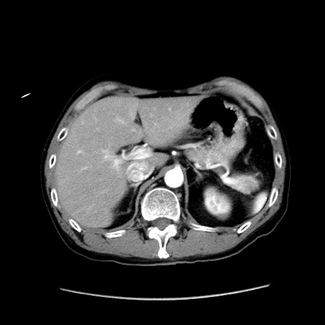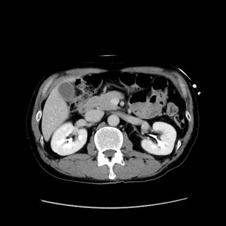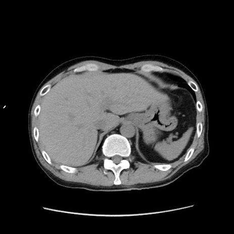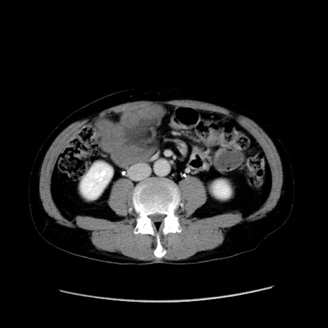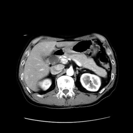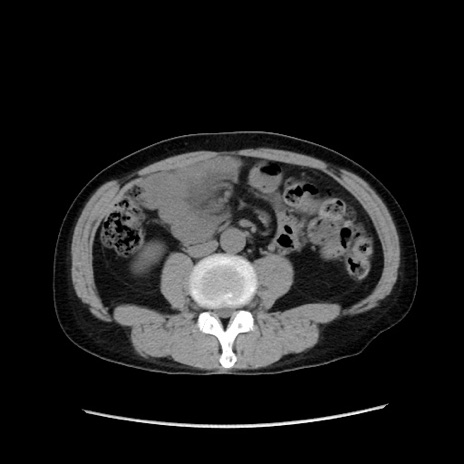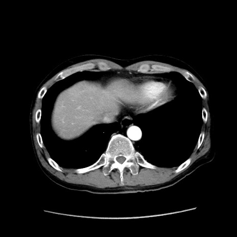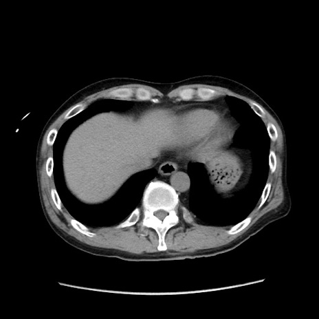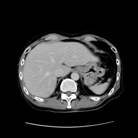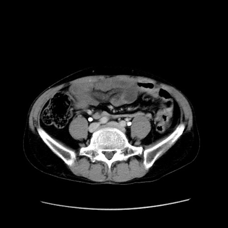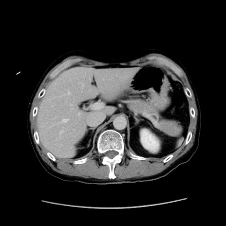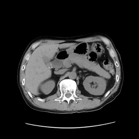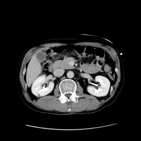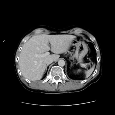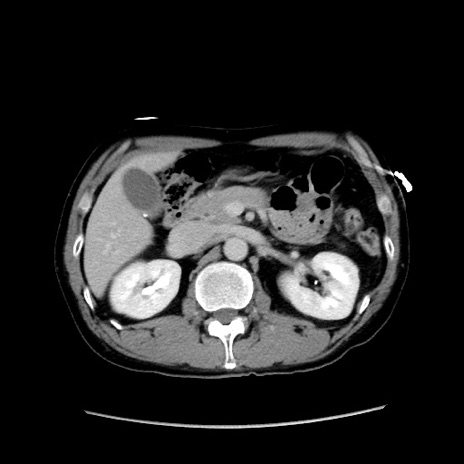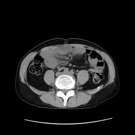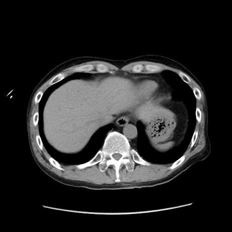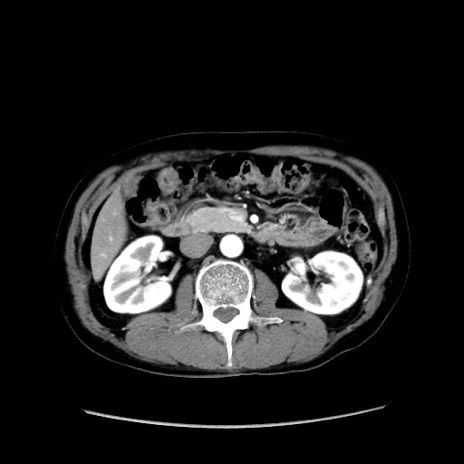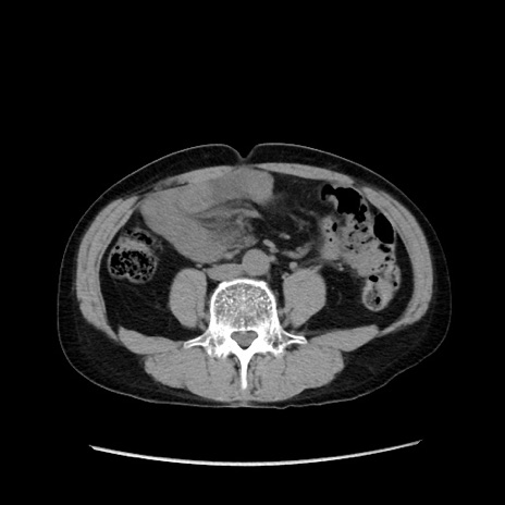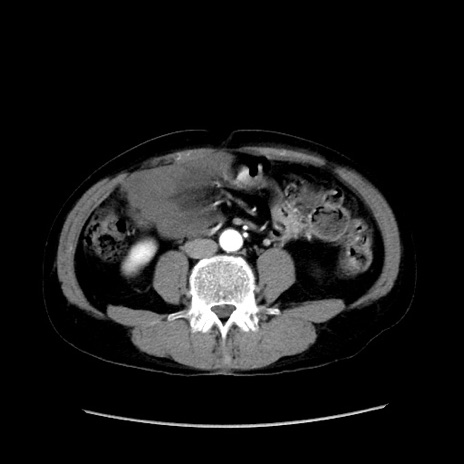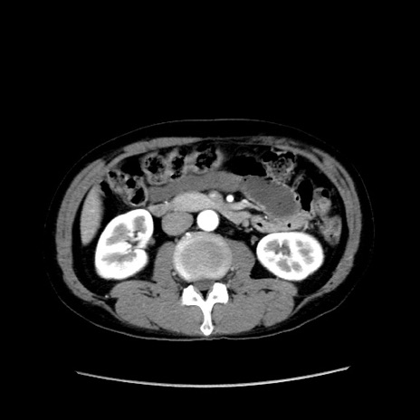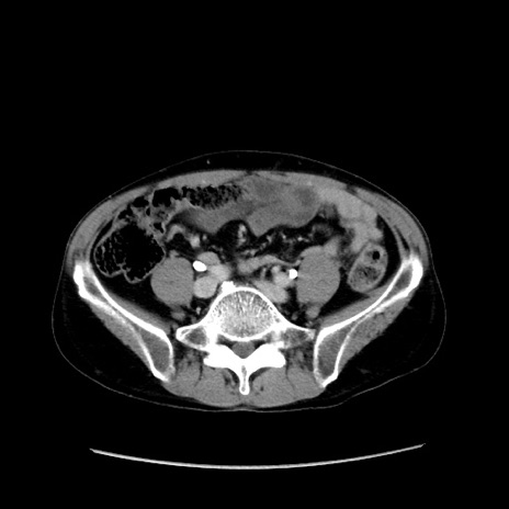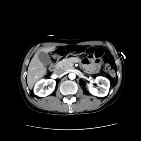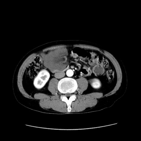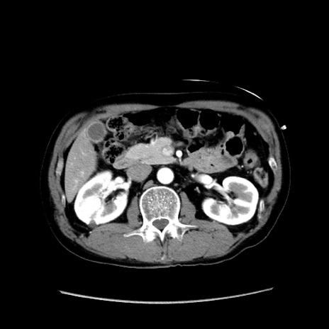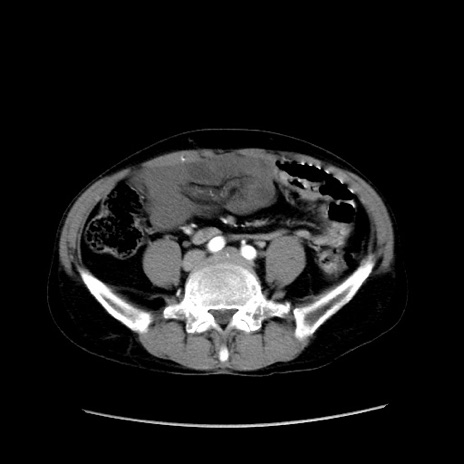 【症例】40歳代 男性 【主訴】腹痛 【現病歴】4時間ほど前に電車に乗車中に臍部上より腹痛出現。徐々に増悪し起立困難となり、救急外来受診。生ものは数日食べていない。今朝お雑煮を食べた。 【既往歴】なし 【身体所見】BT 36.8℃、BP 117/84mmHg、HR 91/min、SpO2 97%、苦悶様、腹部:臍上部広範囲圧痛あり、反跳痛± 【データ】WBC 8100、CRP 0.03