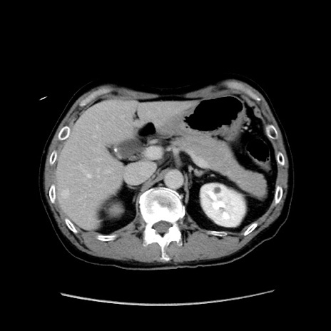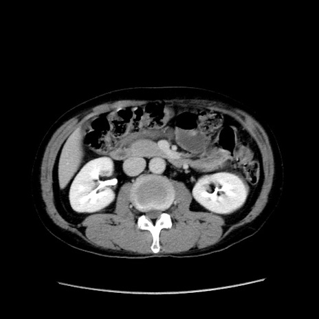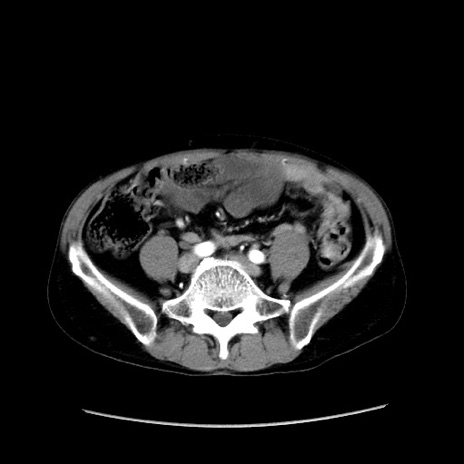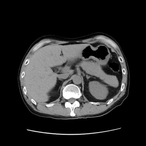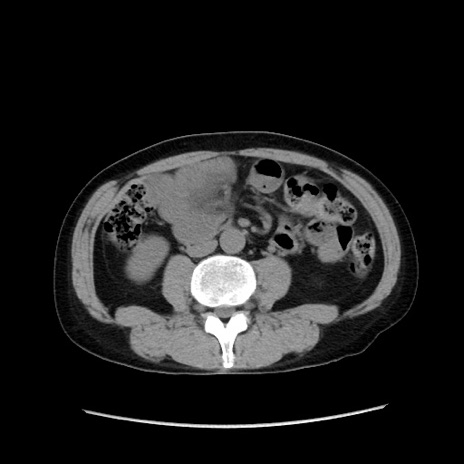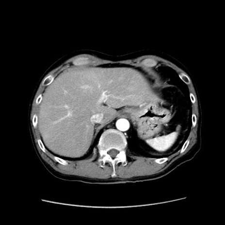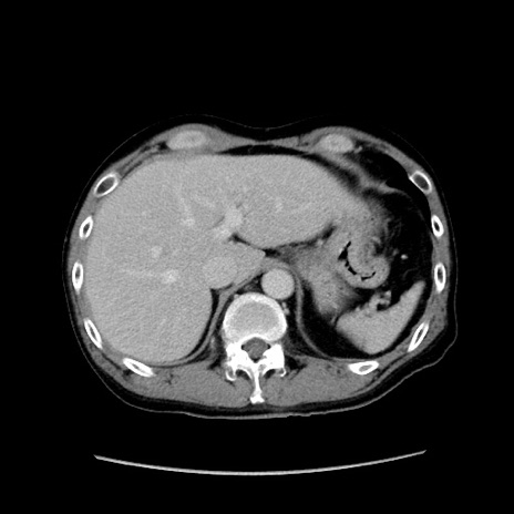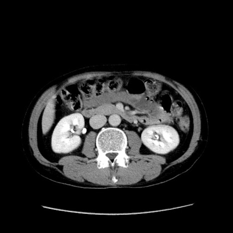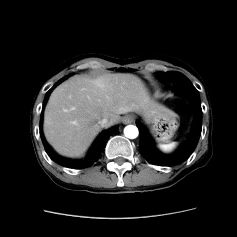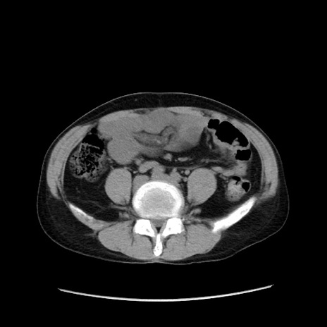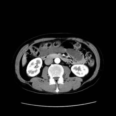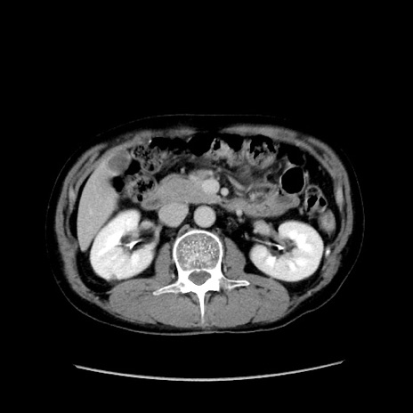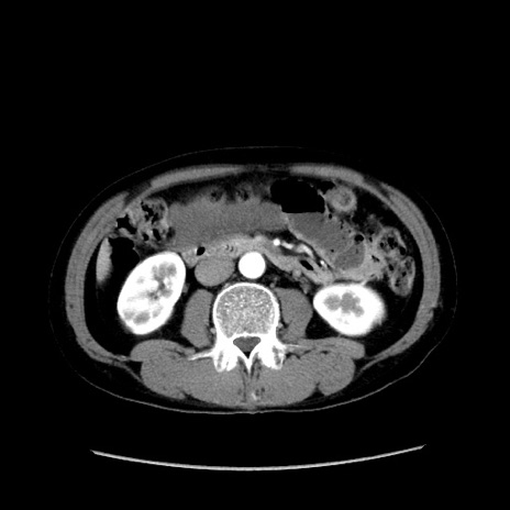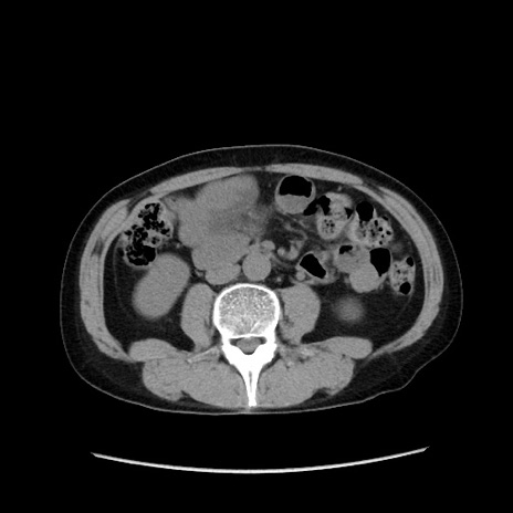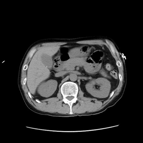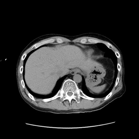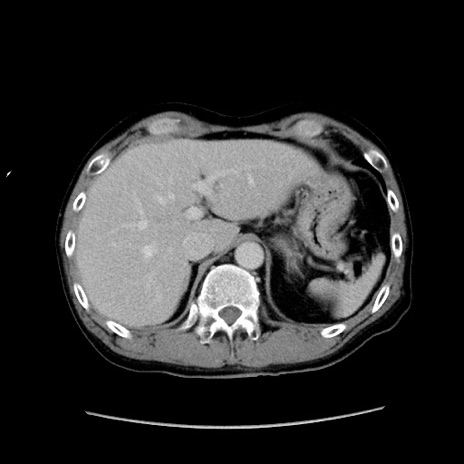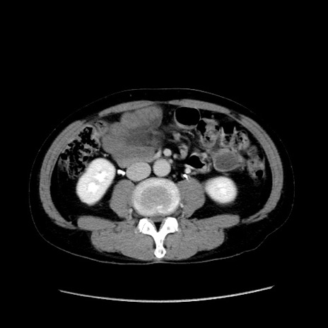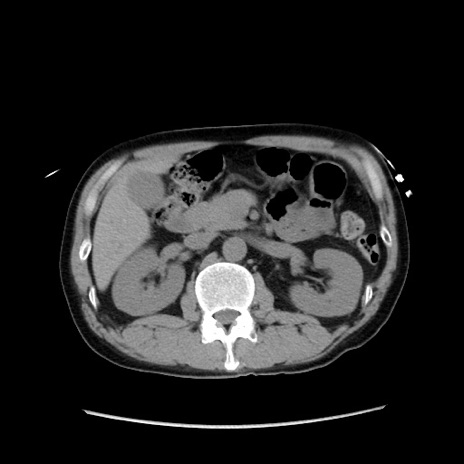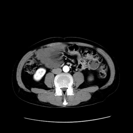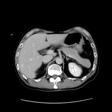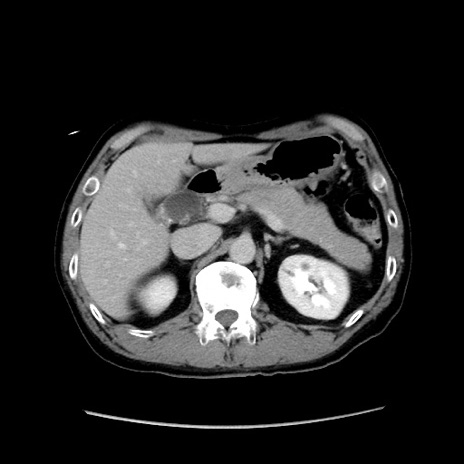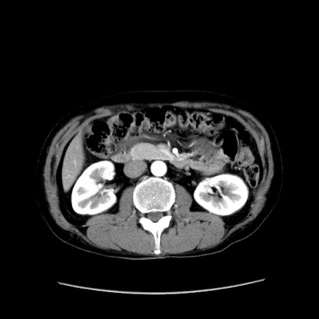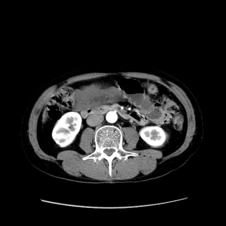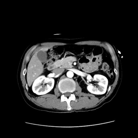 【症例】40歳代 男性 【主訴】腹痛 【現病歴】4時間ほど前に電車に乗車中に臍部上より腹痛出現。徐々に増悪し起立困難となり、救急外来受診。生ものは数日食べていない。今朝お雑煮を食べた。 【既往歴】なし 【身体所見】BT 36.8℃、BP 117/84mmHg、HR 91/min、SpO2 97%、苦悶様、腹部:臍上部広範囲圧痛あり、反跳痛± 【データ】WBC 8100、CRP 0.03