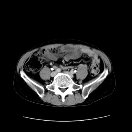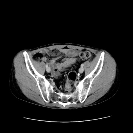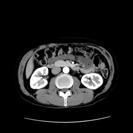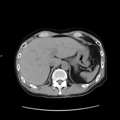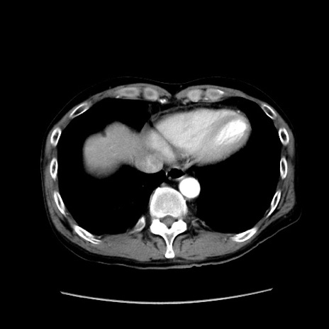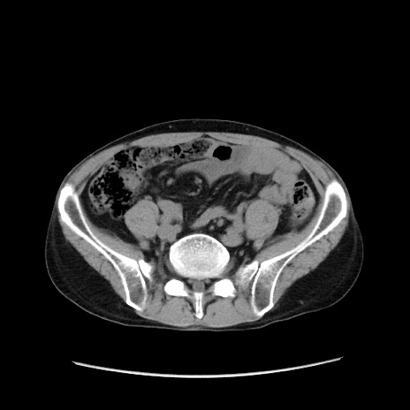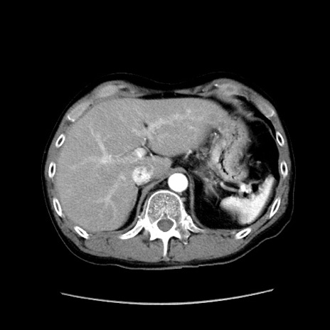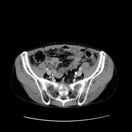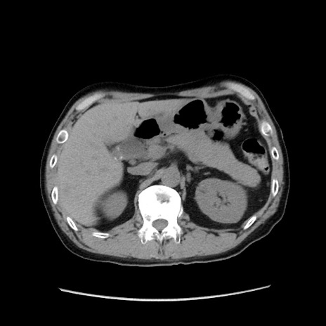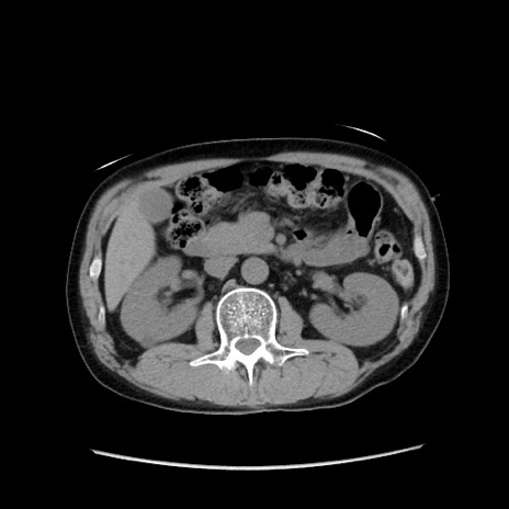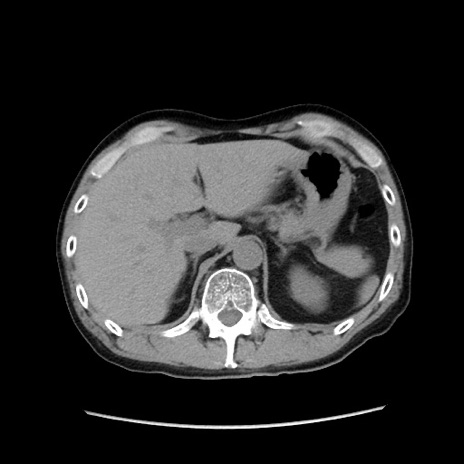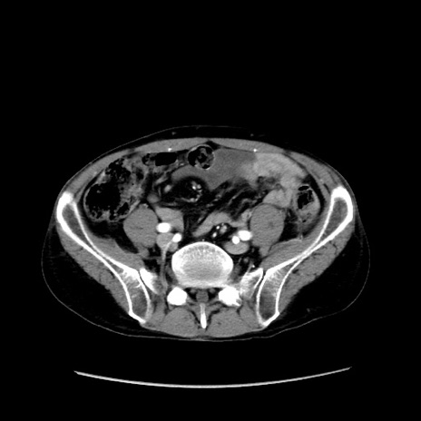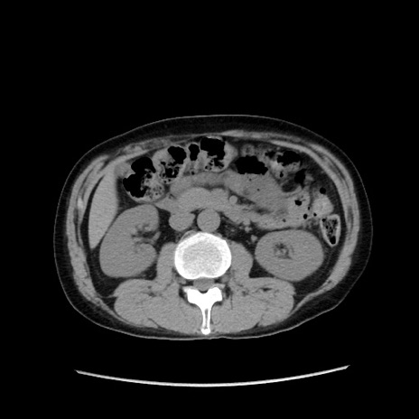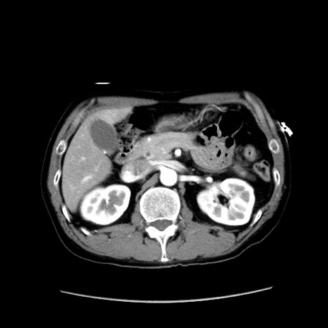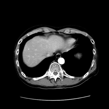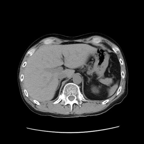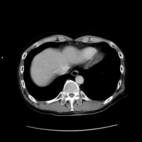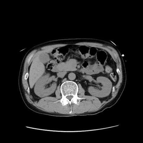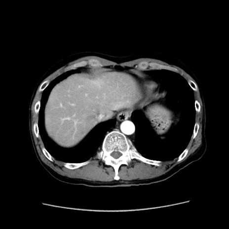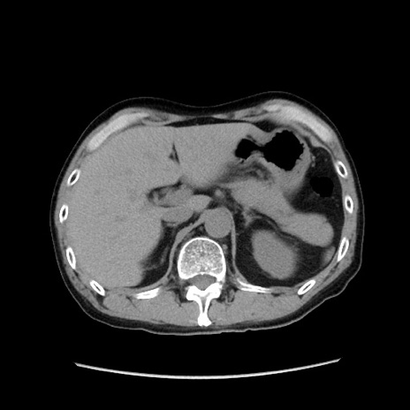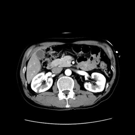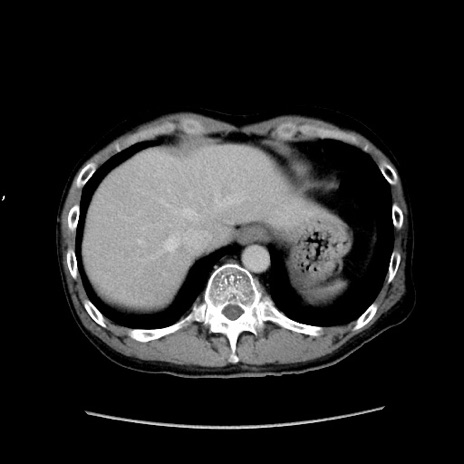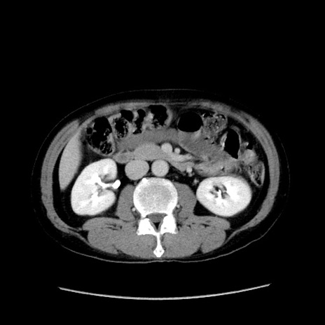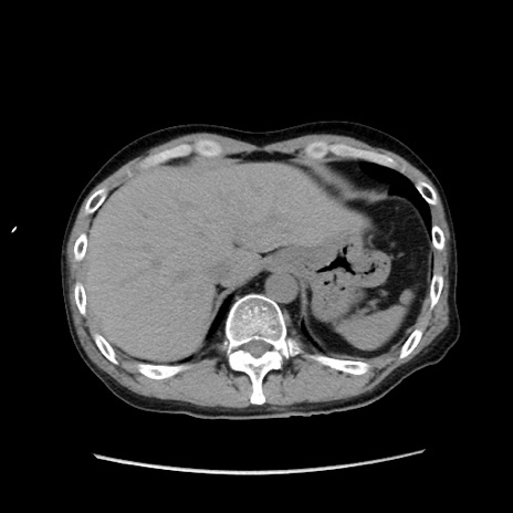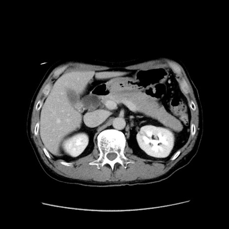 【症例】40歳代 男性 【主訴】腹痛 【現病歴】4時間ほど前に電車に乗車中に臍部上より腹痛出現。徐々に増悪し起立困難となり、救急外来受診。生ものは数日食べていない。今朝お雑煮を食べた。 【既往歴】なし 【身体所見】BT 36.8℃、BP 117/84mmHg、HR 91/min、SpO2 97%、苦悶様、腹部:臍上部広範囲圧痛あり、反跳痛± 【データ】WBC 8100、CRP 0.03