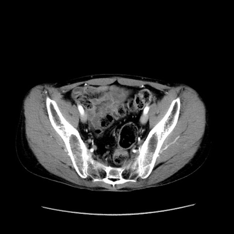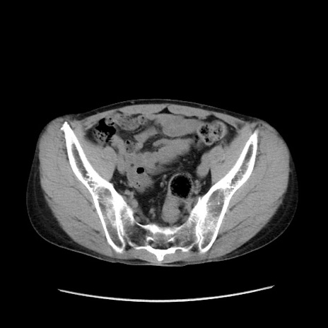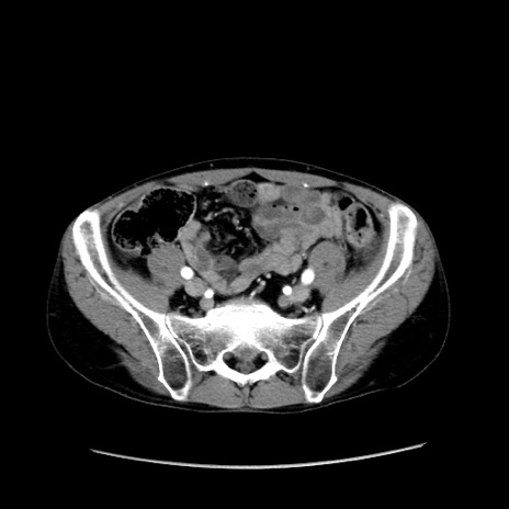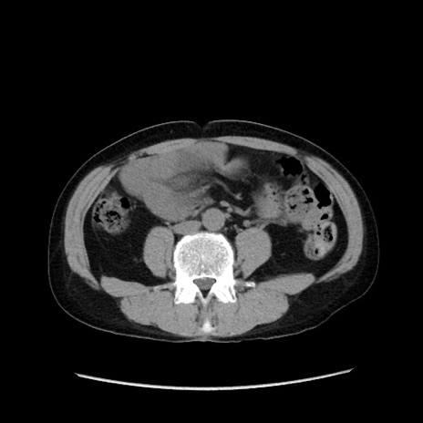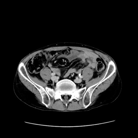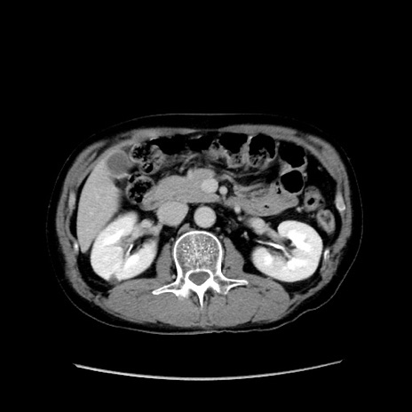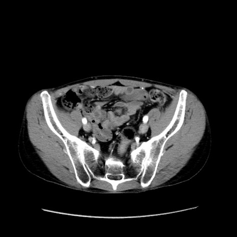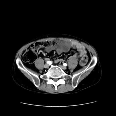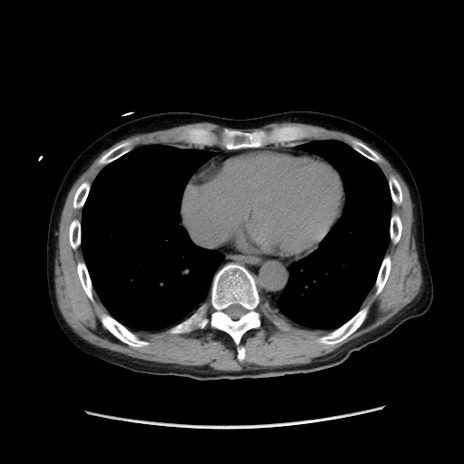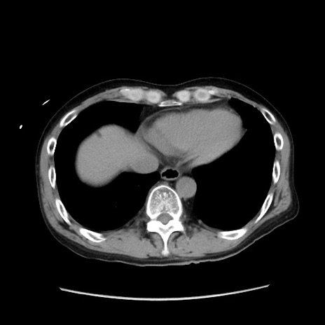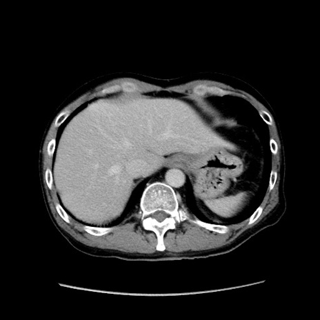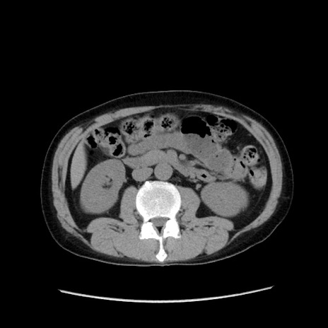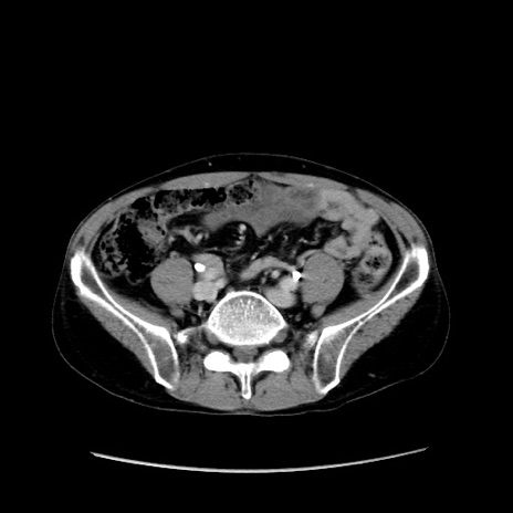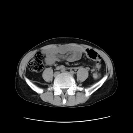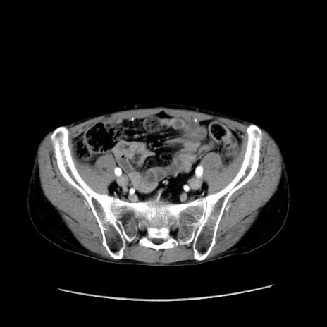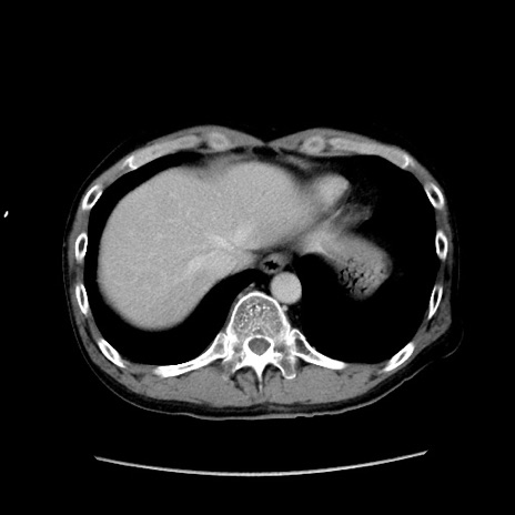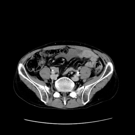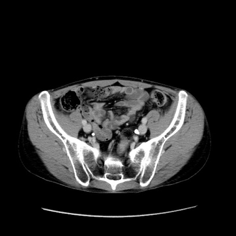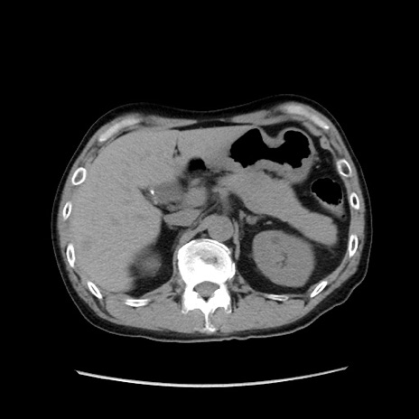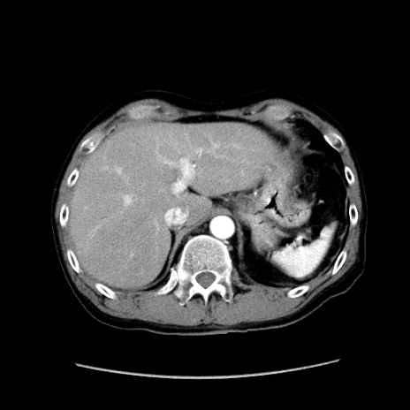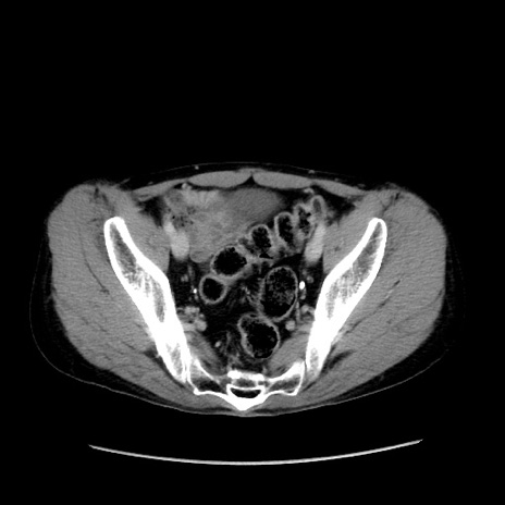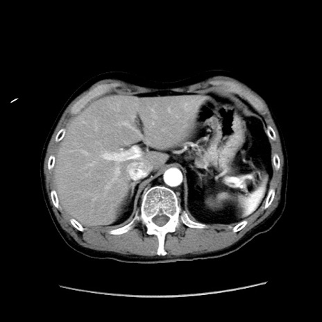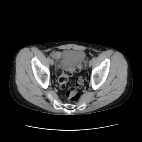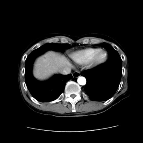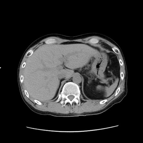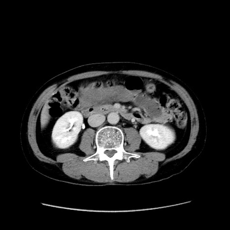 【症例】40歳代 男性 【主訴】腹痛 【現病歴】4時間ほど前に電車に乗車中に臍部上より腹痛出現。徐々に増悪し起立困難となり、救急外来受診。生ものは数日食べていない。今朝お雑煮を食べた。 【既往歴】なし 【身体所見】BT 36.8℃、BP 117/84mmHg、HR 91/min、SpO2 97%、苦悶様、腹部:臍上部広範囲圧痛あり、反跳痛± 【データ】WBC 8100、CRP 0.03