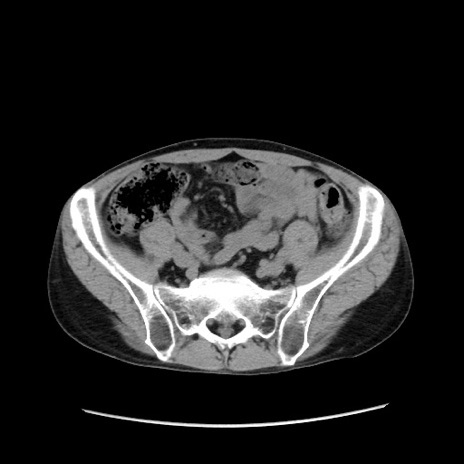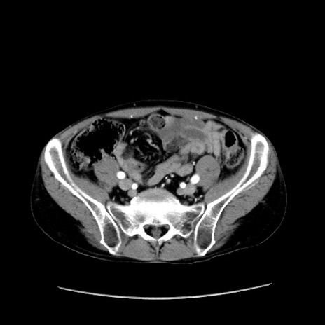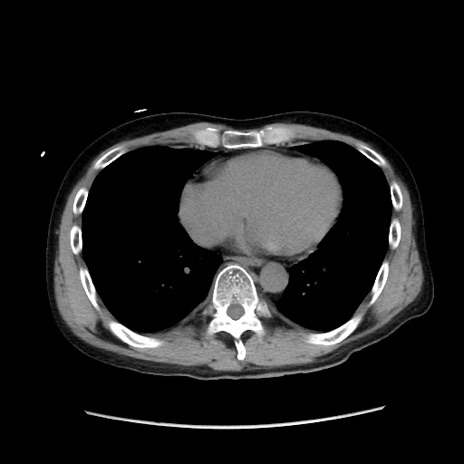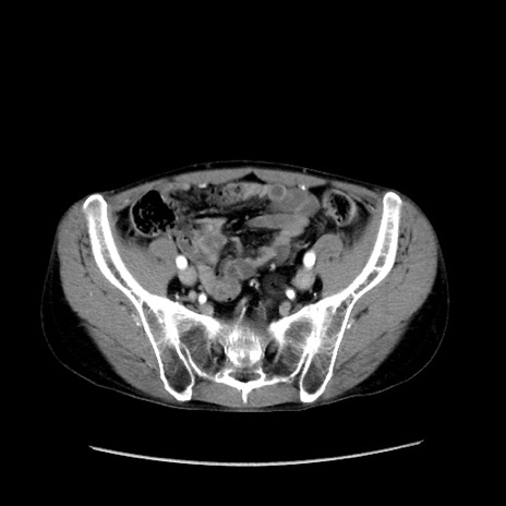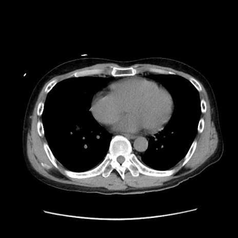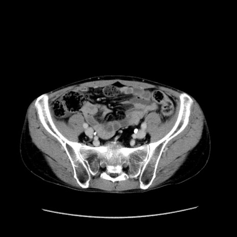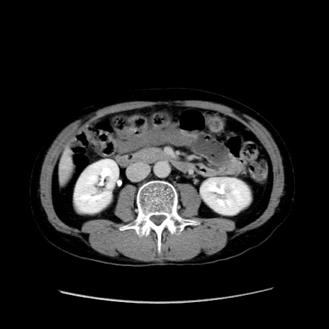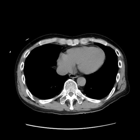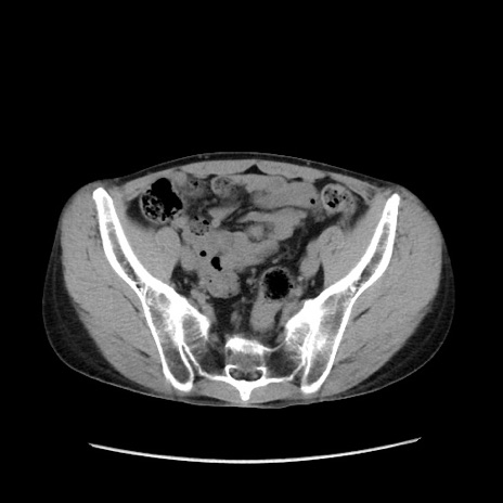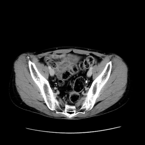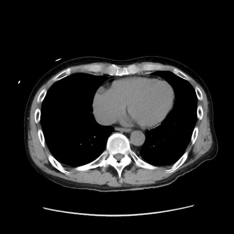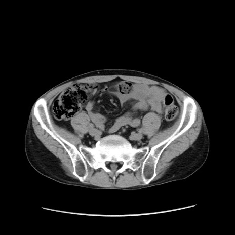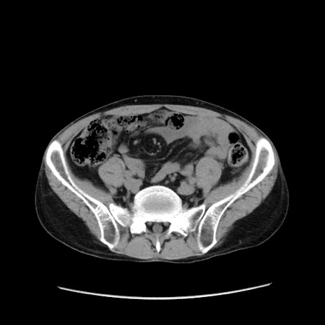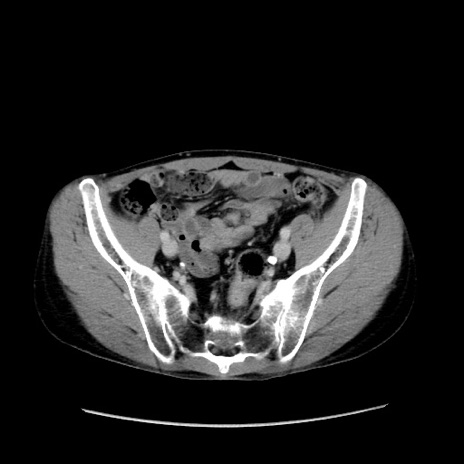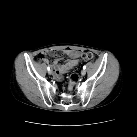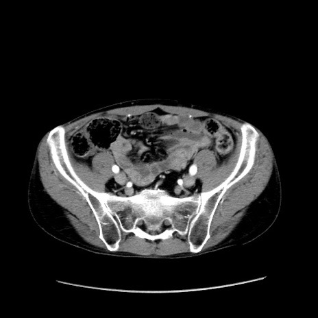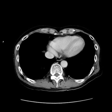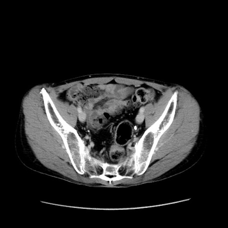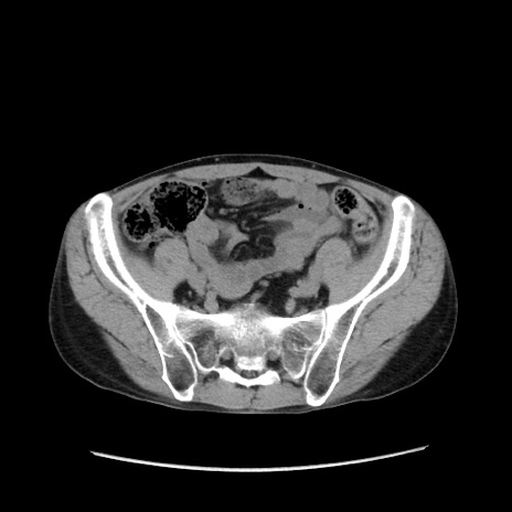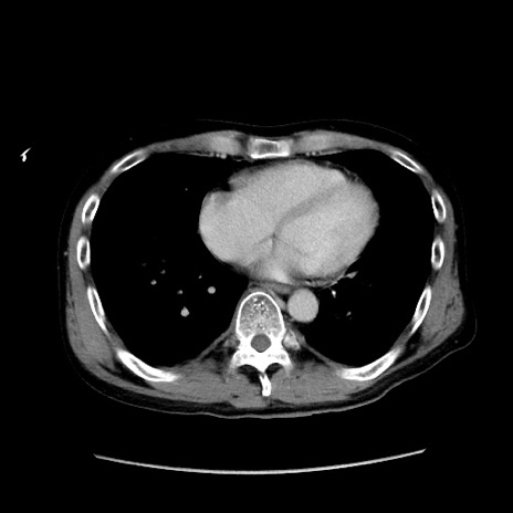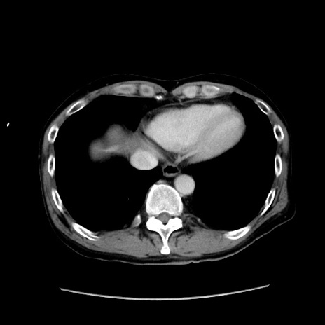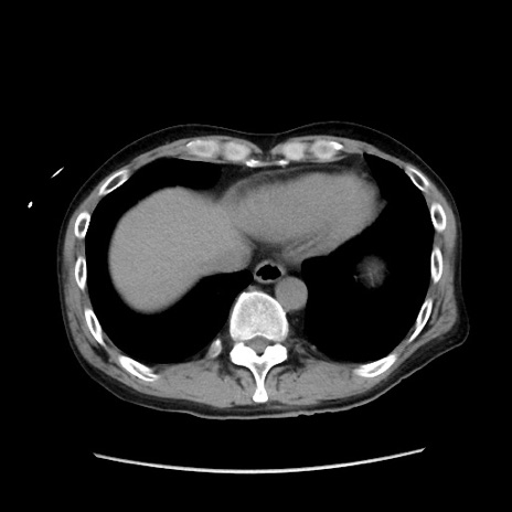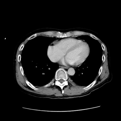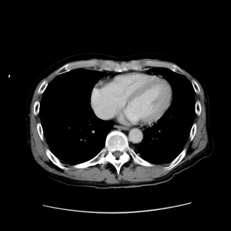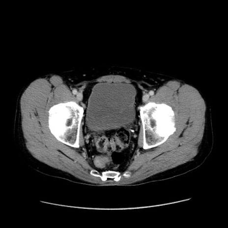 【症例】40歳代 男性 【主訴】腹痛 【現病歴】4時間ほど前に電車に乗車中に臍部上より腹痛出現。徐々に増悪し起立困難となり、救急外来受診。生ものは数日食べていない。今朝お雑煮を食べた。 【既往歴】なし 【身体所見】BT 36.8℃、BP 117/84mmHg、HR 91/min、SpO2 97%、苦悶様、腹部:臍上部広範囲圧痛あり、反跳痛± 【データ】WBC 8100、CRP 0.03