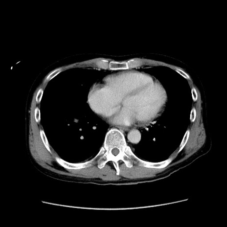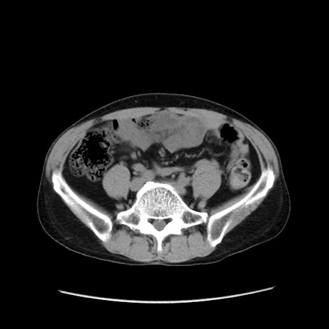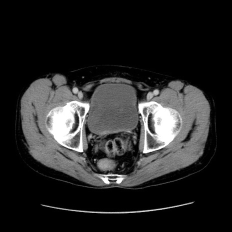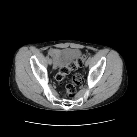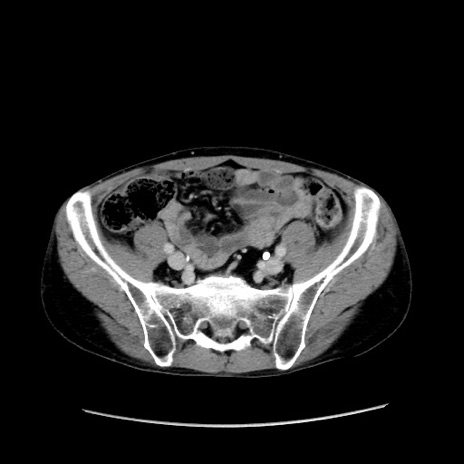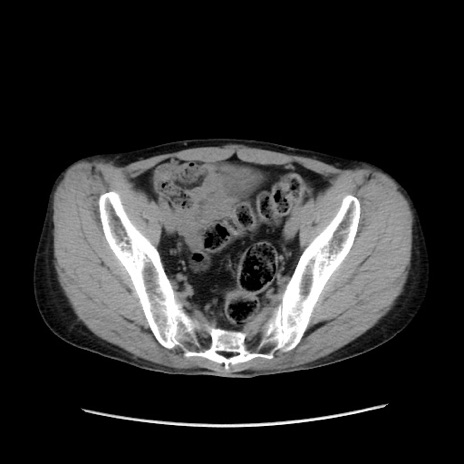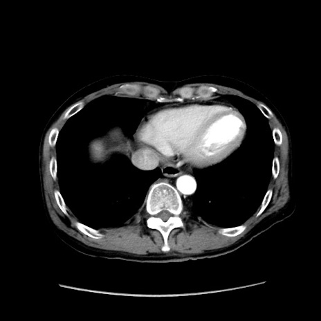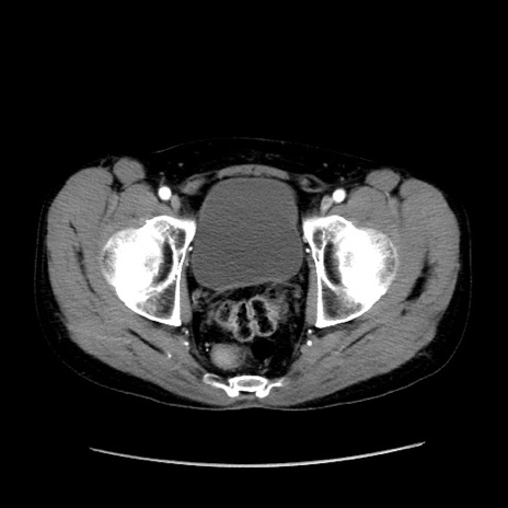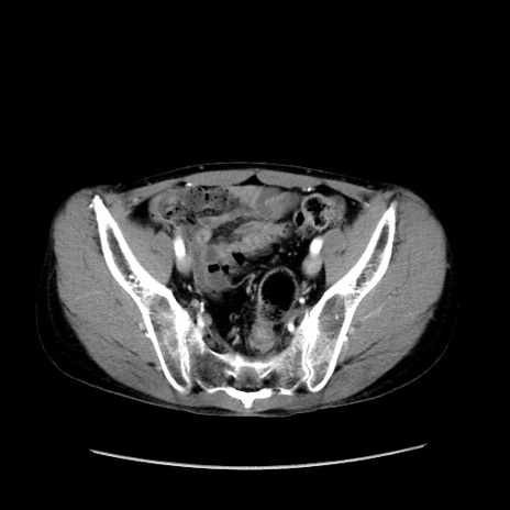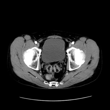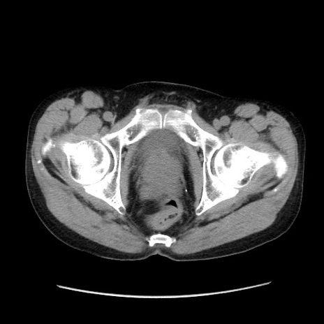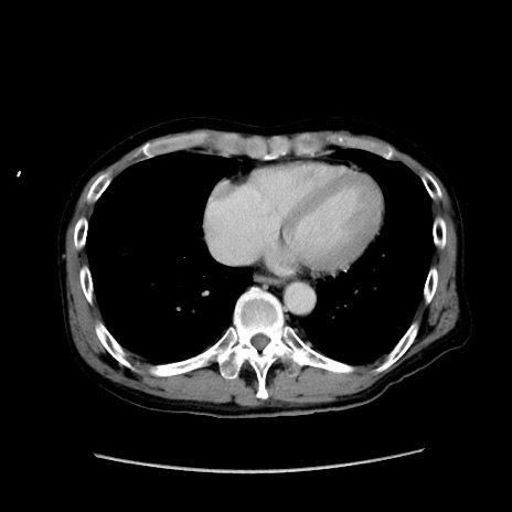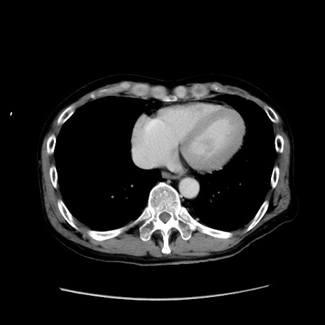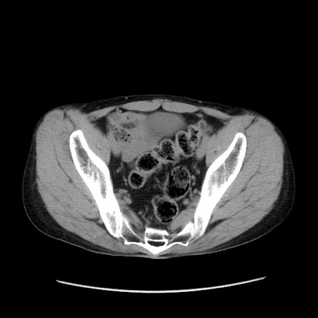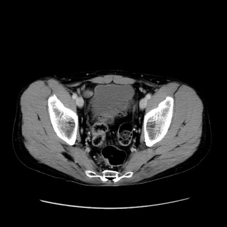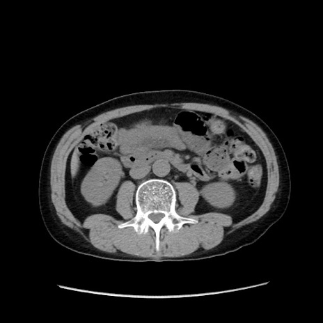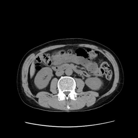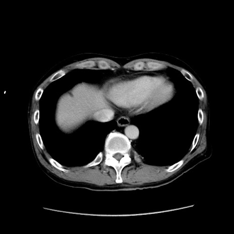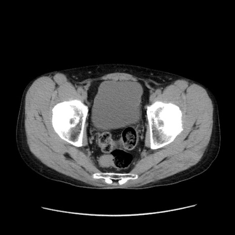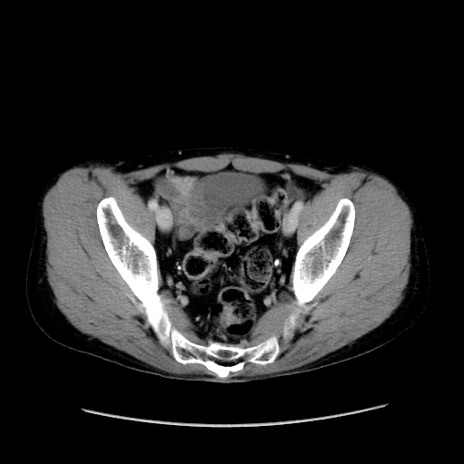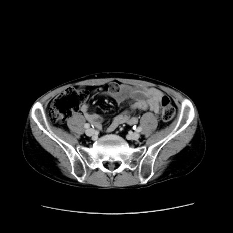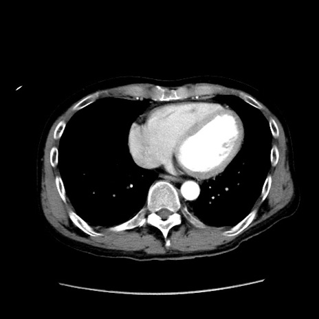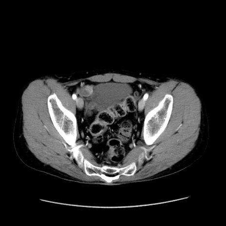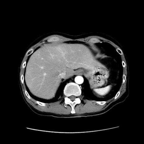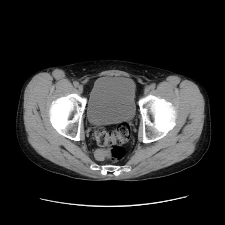 【症例】40歳代 男性 【主訴】腹痛 【現病歴】4時間ほど前に電車に乗車中に臍部上より腹痛出現。徐々に増悪し起立困難となり、救急外来受診。生ものは数日食べていない。今朝お雑煮を食べた。 【既往歴】なし 【身体所見】BT 36.8℃、BP 117/84mmHg、HR 91/min、SpO2 97%、苦悶様、腹部:臍上部広範囲圧痛あり、反跳痛± 【データ】WBC 8100、CRP 0.03