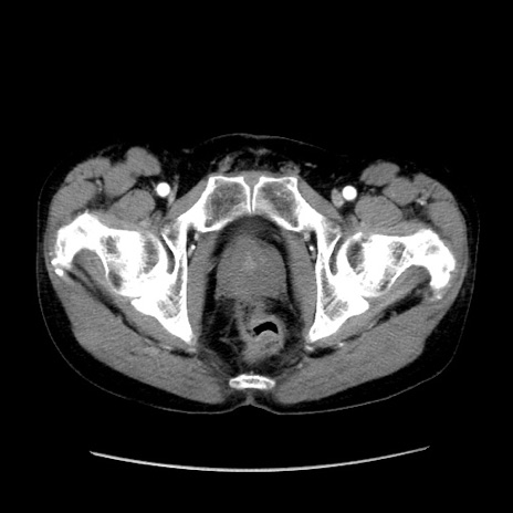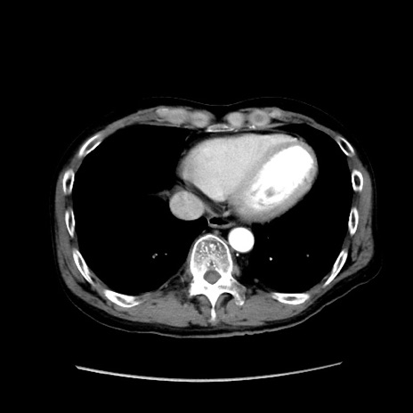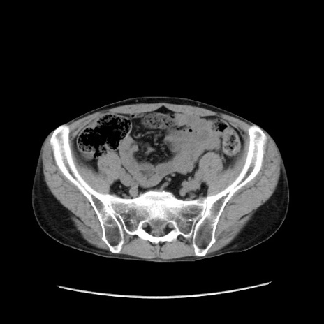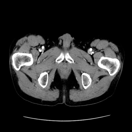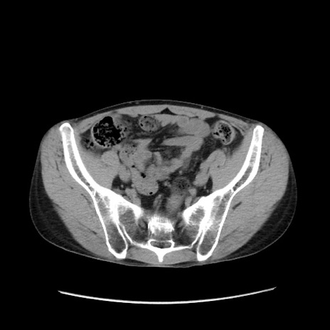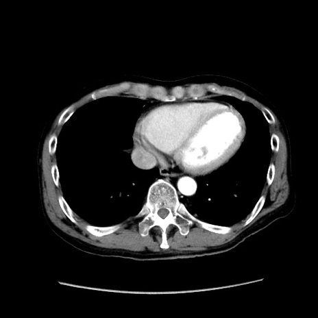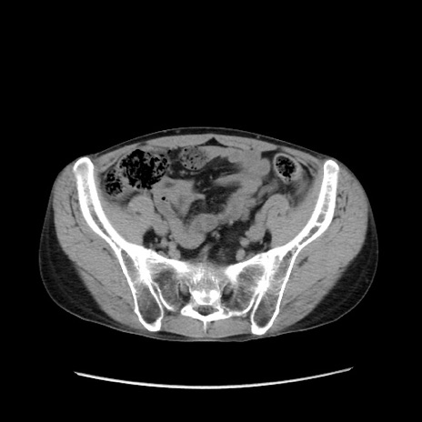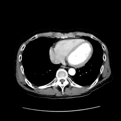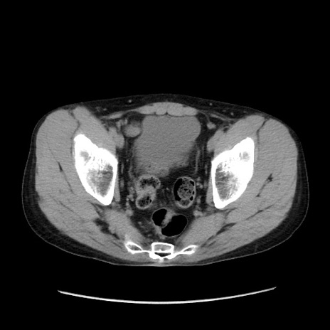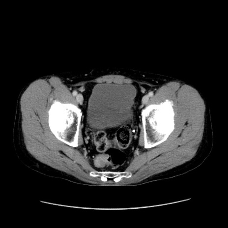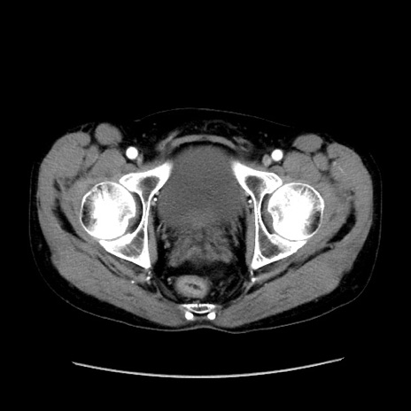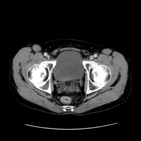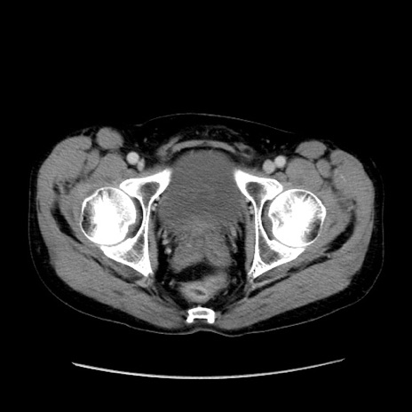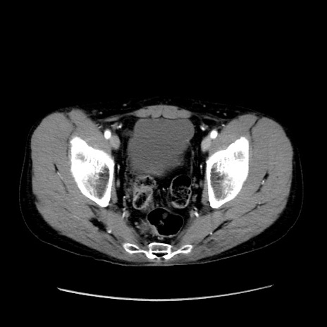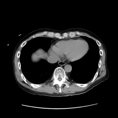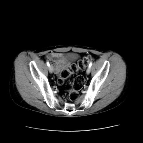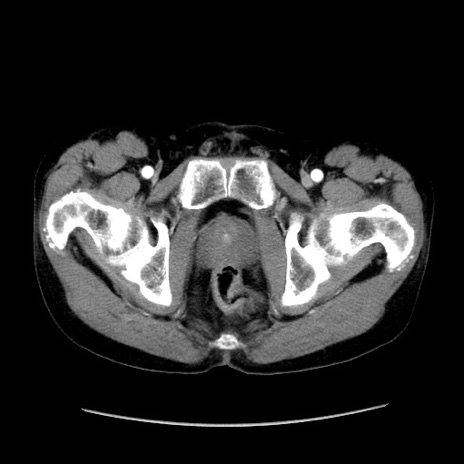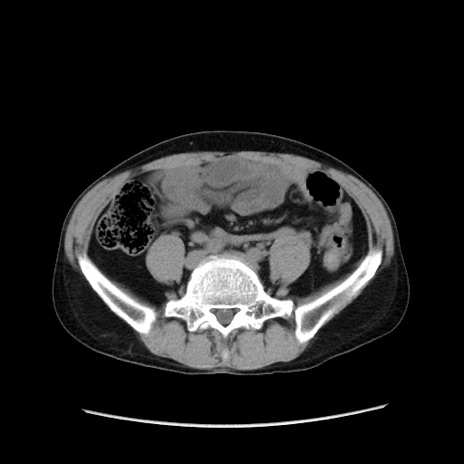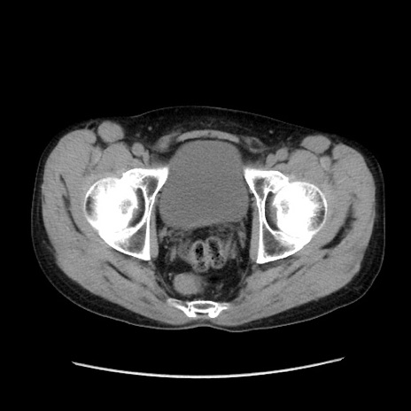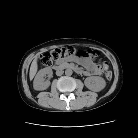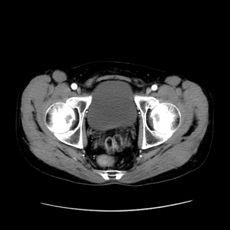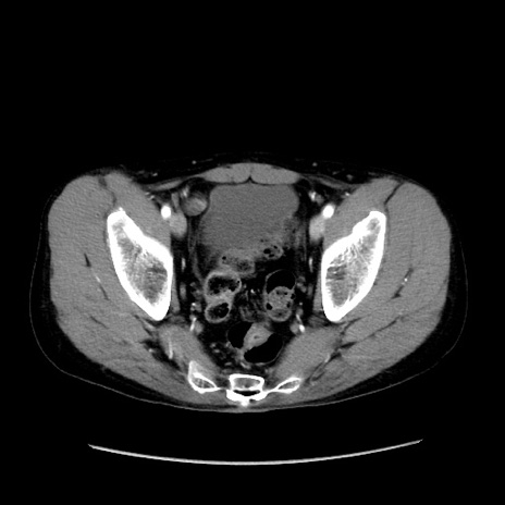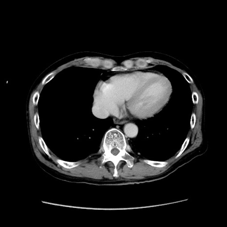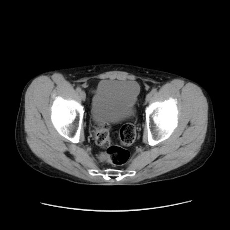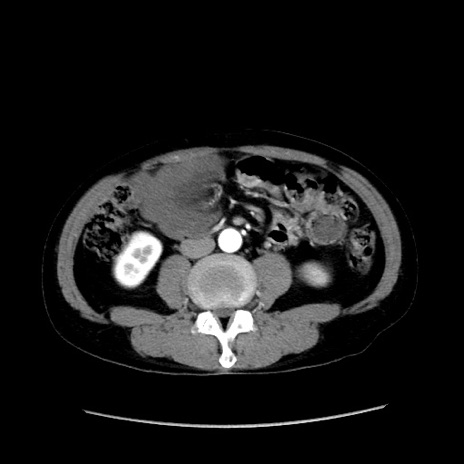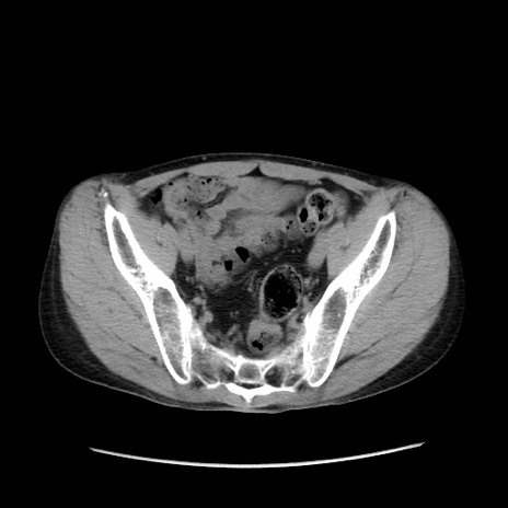 【症例】40歳代 男性 【主訴】腹痛 【現病歴】4時間ほど前に電車に乗車中に臍部上より腹痛出現。徐々に増悪し起立困難となり、救急外来受診。生ものは数日食べていない。今朝お雑煮を食べた。 【既往歴】なし 【身体所見】BT 36.8℃、BP 117/84mmHg、HR 91/min、SpO2 97%、苦悶様、腹部:臍上部広範囲圧痛あり、反跳痛± 【データ】WBC 8100、CRP 0.03