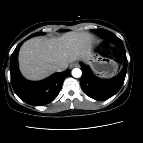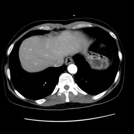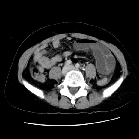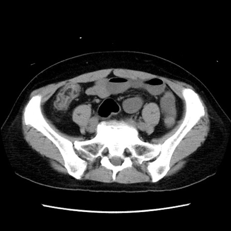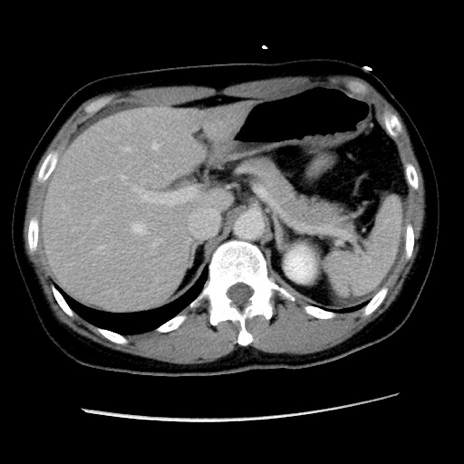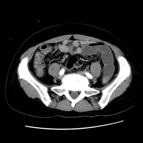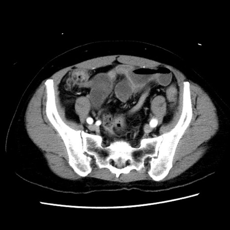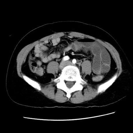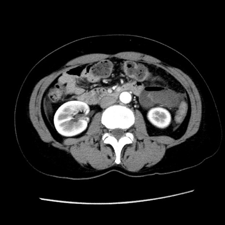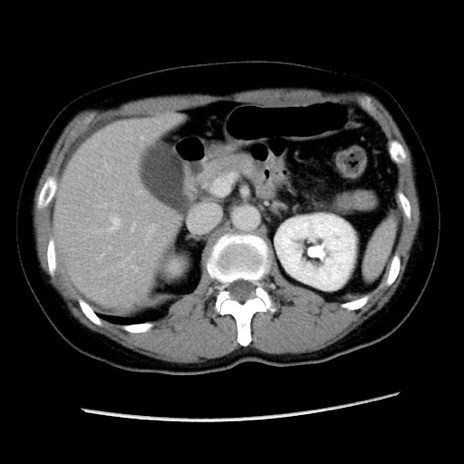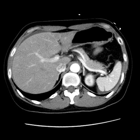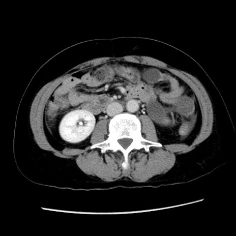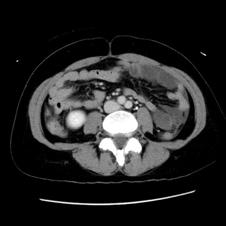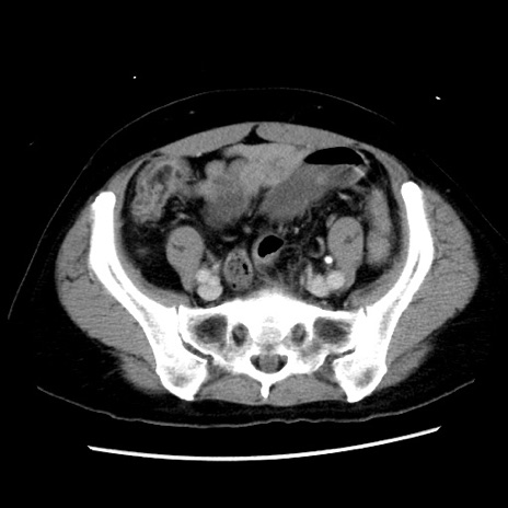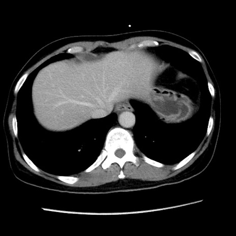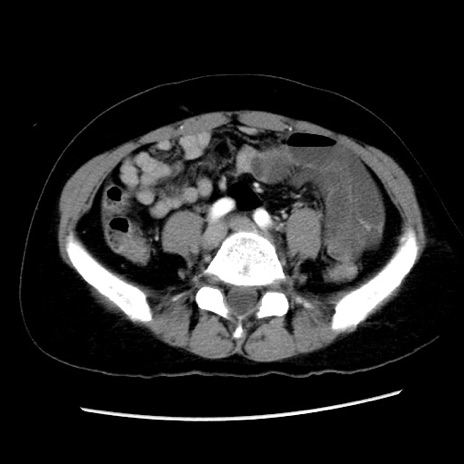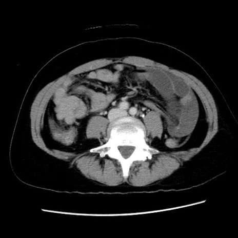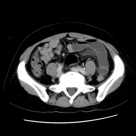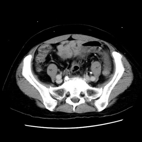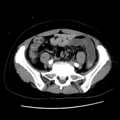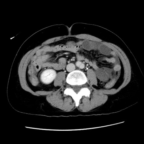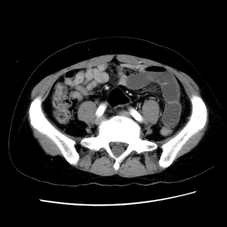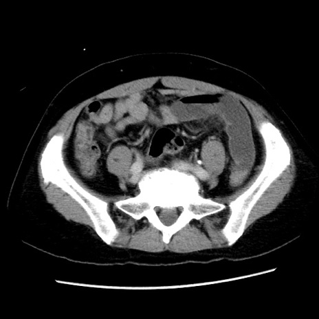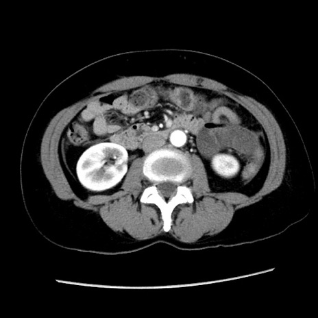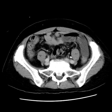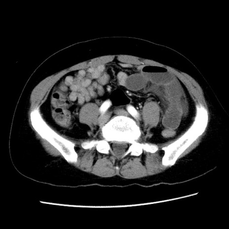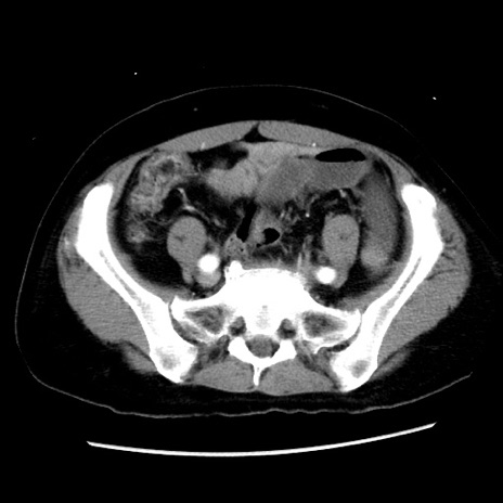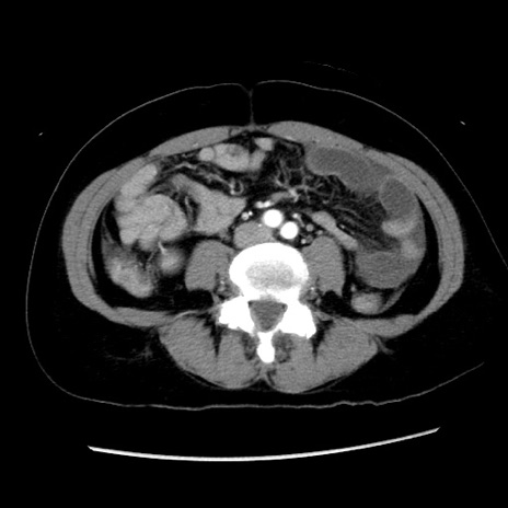 【症例】 50歳代女性 【主訴】 腹痛 【現病歴】前日生レバーを食べた。今朝に排便あり。 昼前に突然発症の腹痛を生じ、当院救急外来を受診した。 【既往歴】 子宮筋腫にてで子宮全摘後 【身体所見】 意識清明、腹部:平坦、軟、下腹部やや左を中心に圧痛・反跳痛あり、筋性防御あり 【データ】WBC 7800、CRP 0.07
