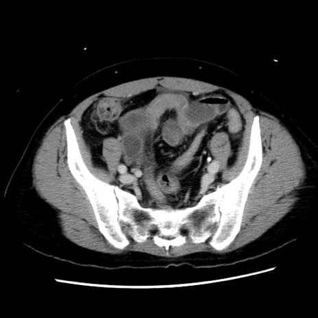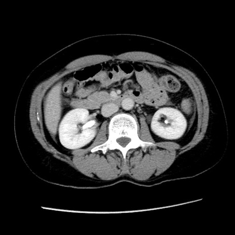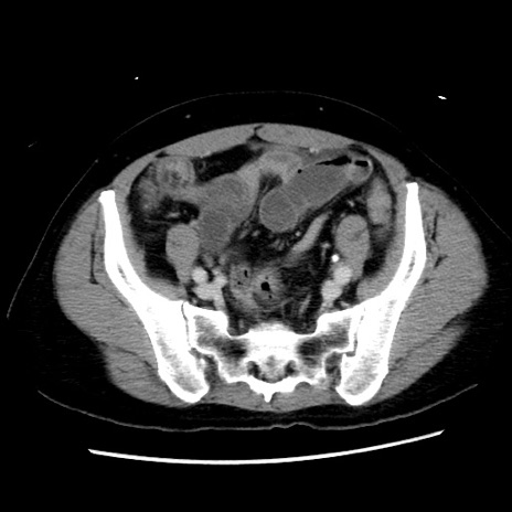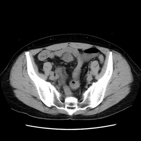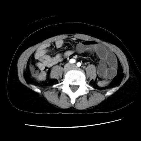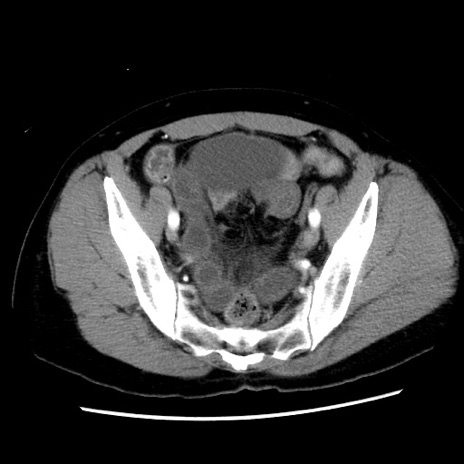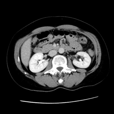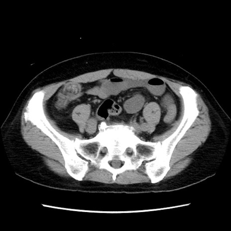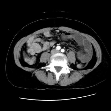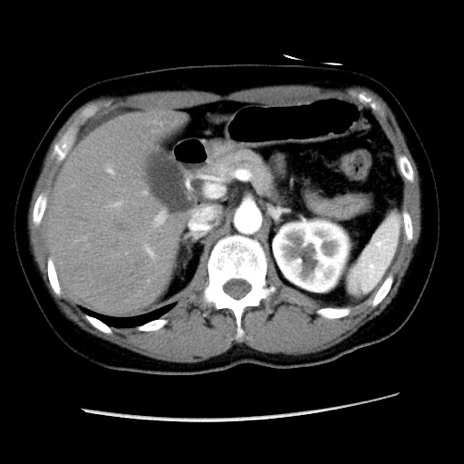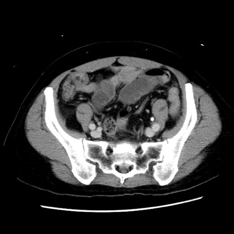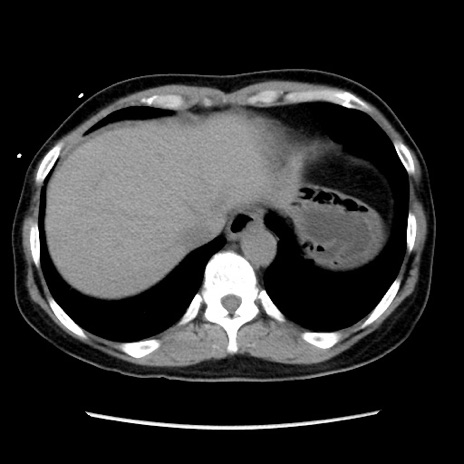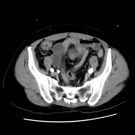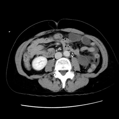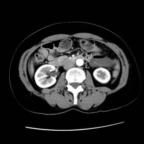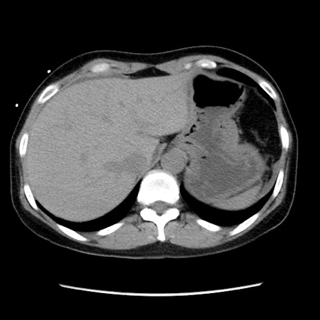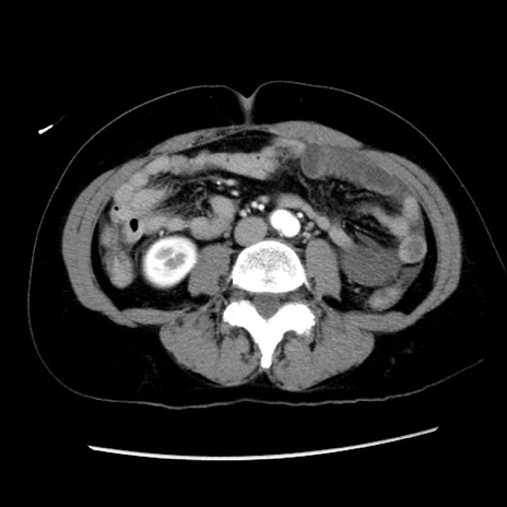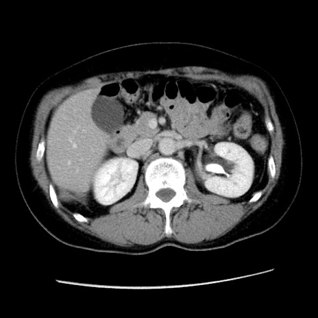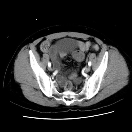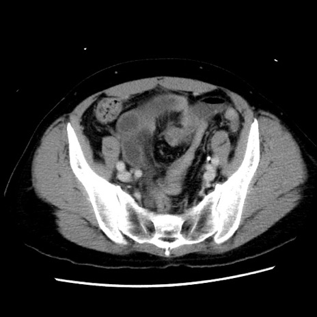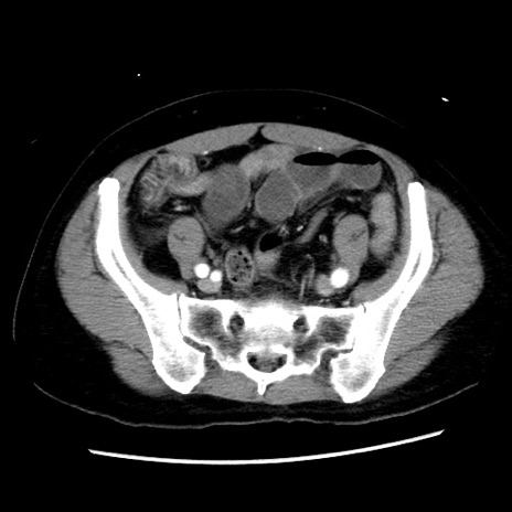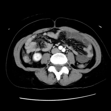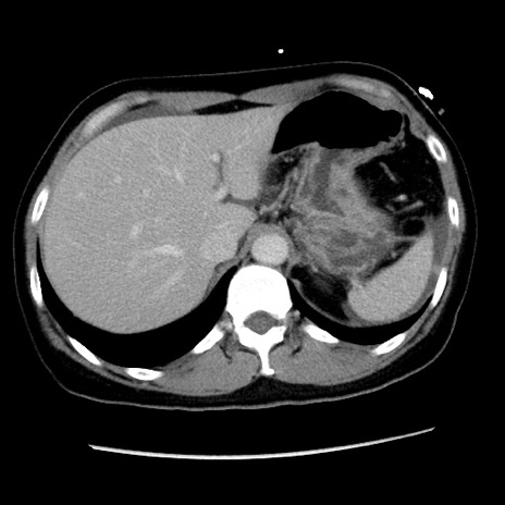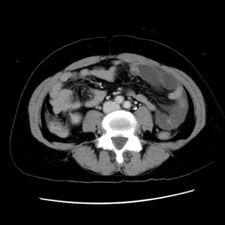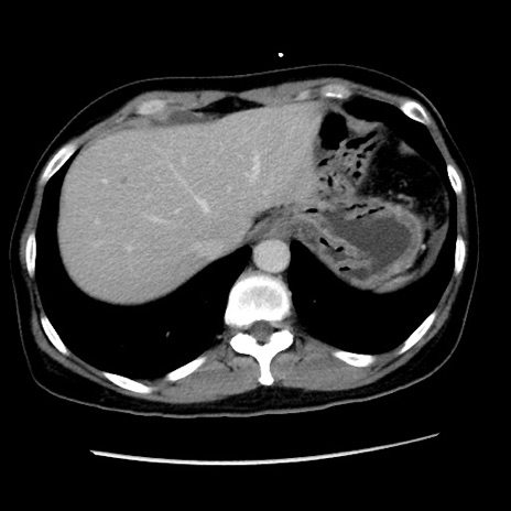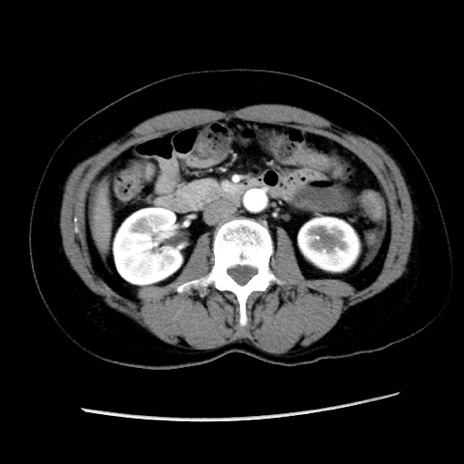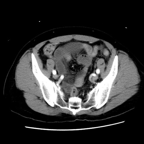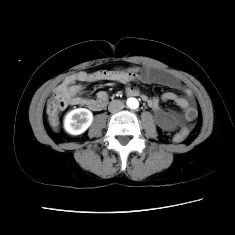 【症例】 50歳代女性 【主訴】 腹痛 【現病歴】前日生レバーを食べた。今朝に排便あり。 昼前に突然発症の腹痛を生じ、当院救急外来を受診した。 【既往歴】 子宮筋腫にてで子宮全摘後 【身体所見】 意識清明、腹部:平坦、軟、下腹部やや左を中心に圧痛・反跳痛あり、筋性防御あり 【データ】WBC 7800、CRP 0.07