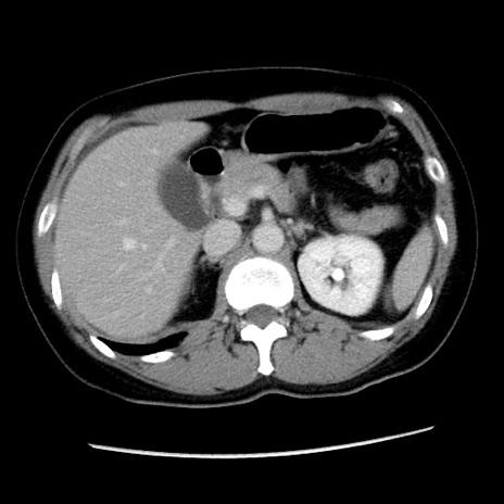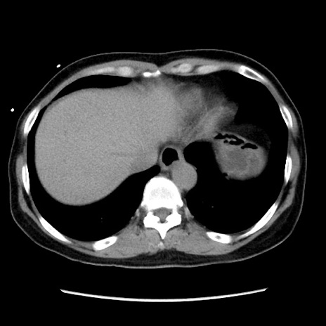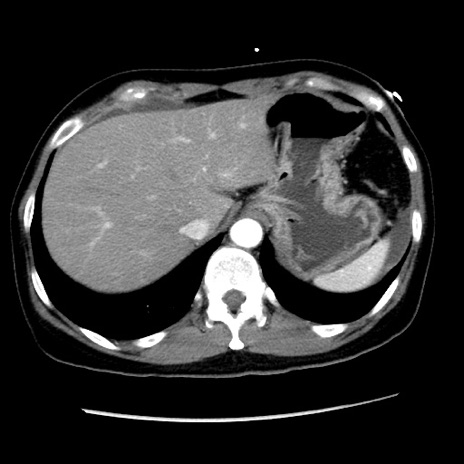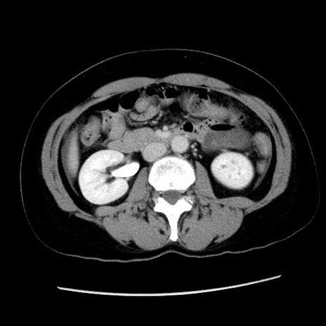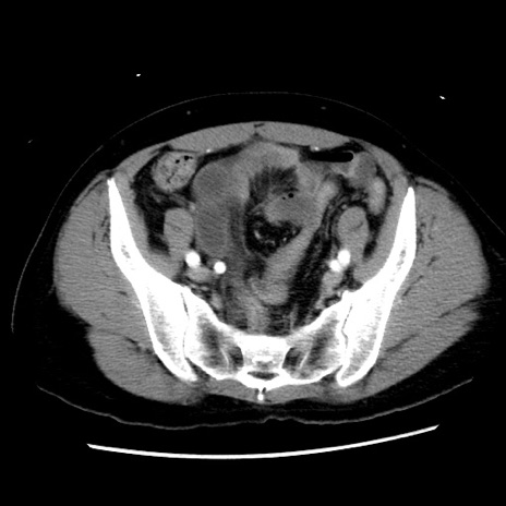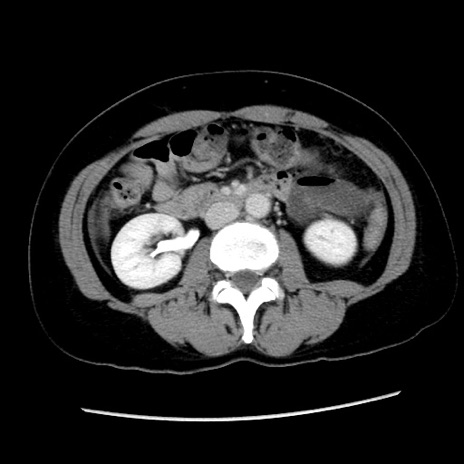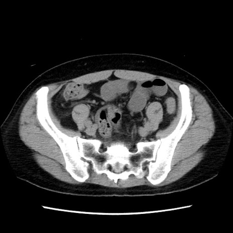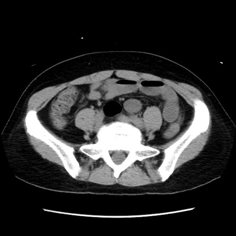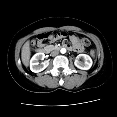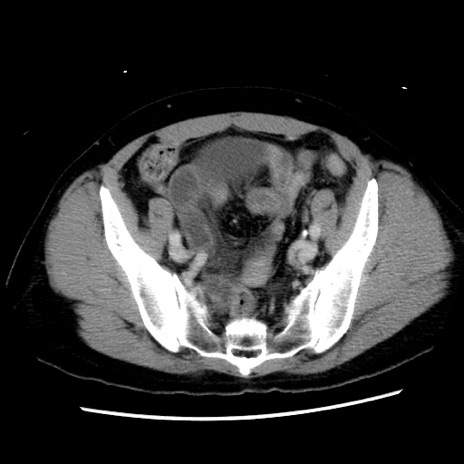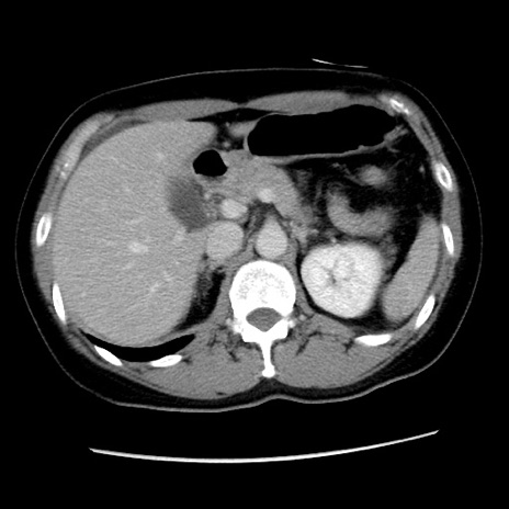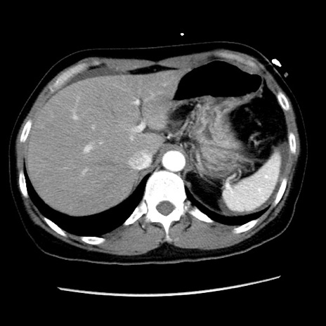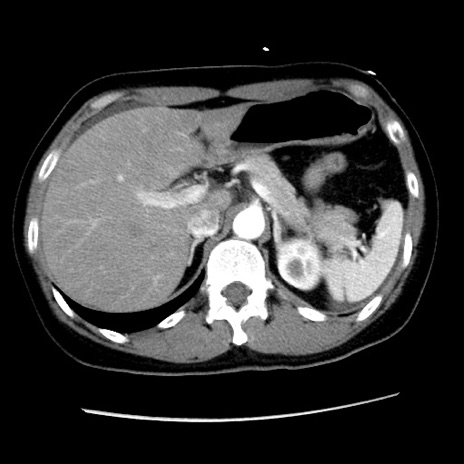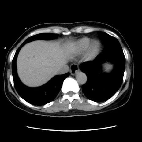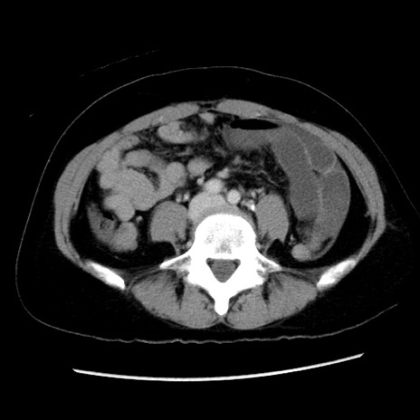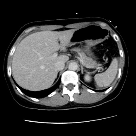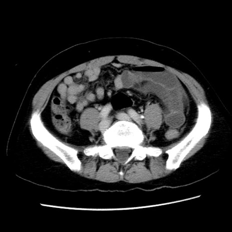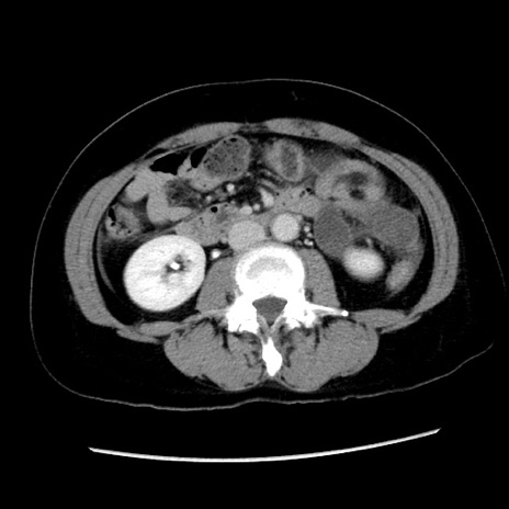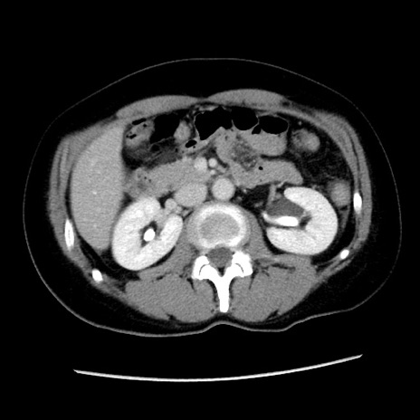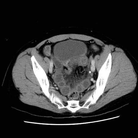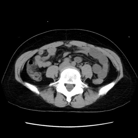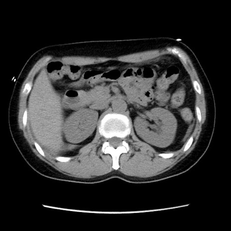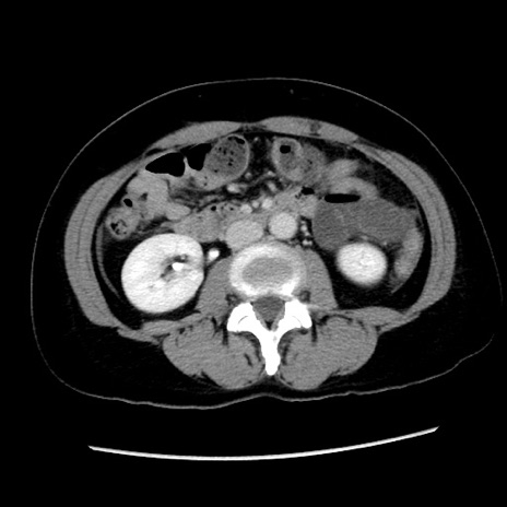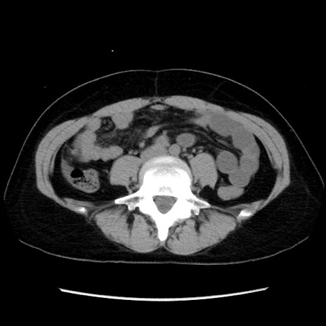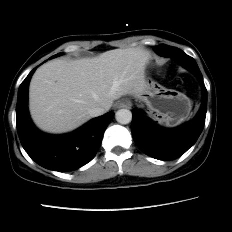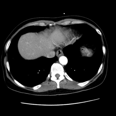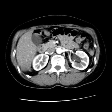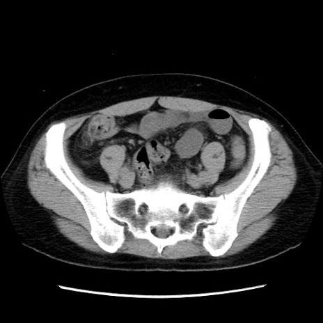 【症例】 50歳代女性 【主訴】 腹痛 【現病歴】前日生レバーを食べた。今朝に排便あり。 昼前に突然発症の腹痛を生じ、当院救急外来を受診した。 【既往歴】 子宮筋腫にてで子宮全摘後 【身体所見】 意識清明、腹部:平坦、軟、下腹部やや左を中心に圧痛・反跳痛あり、筋性防御あり 【データ】WBC 7800、CRP 0.07