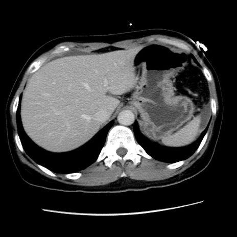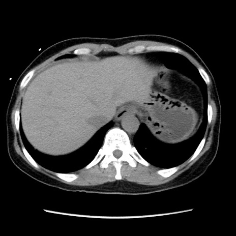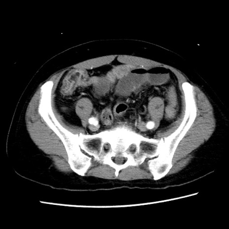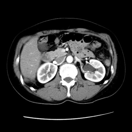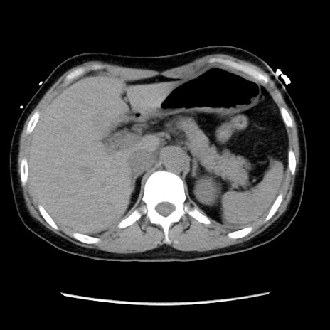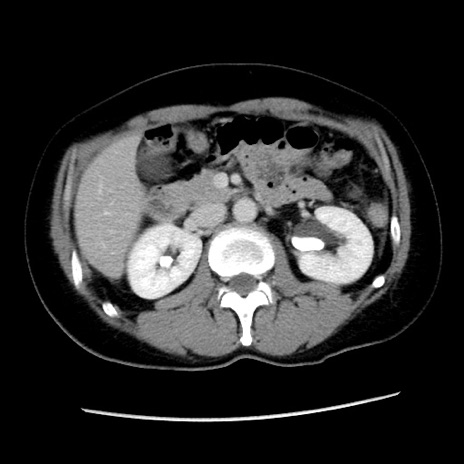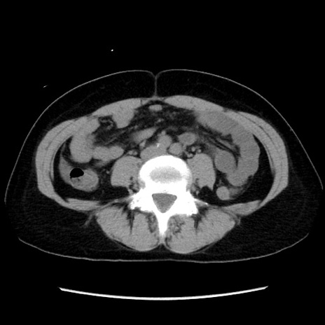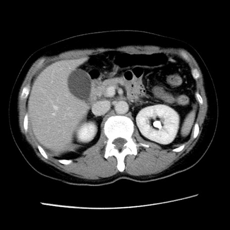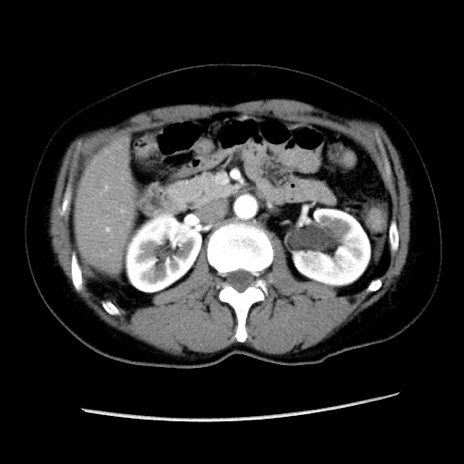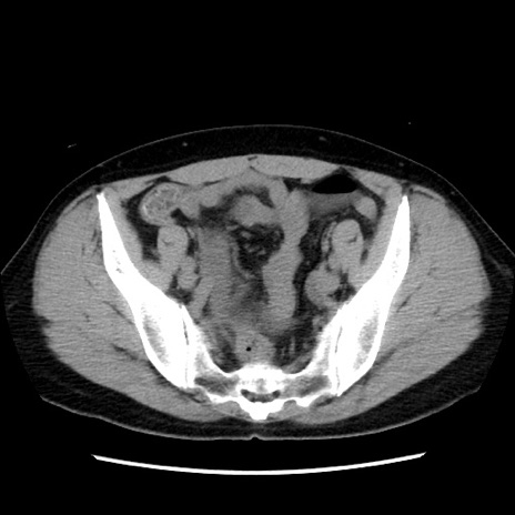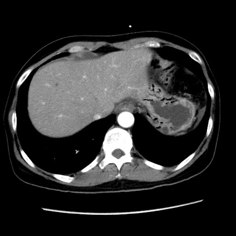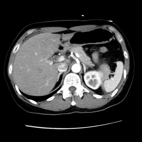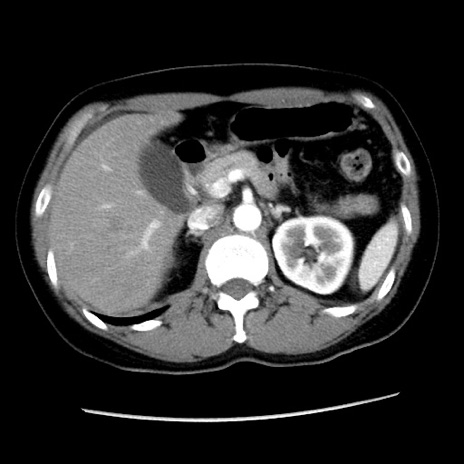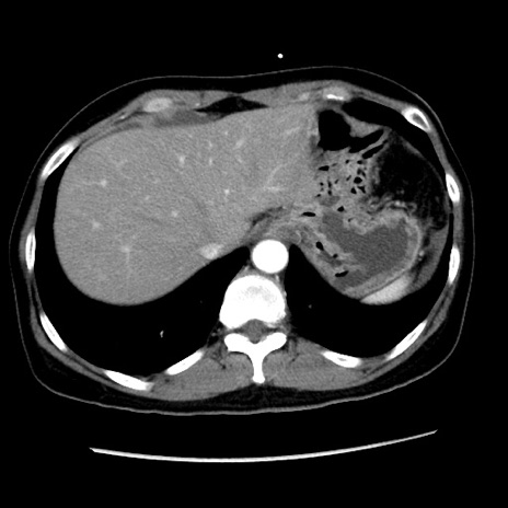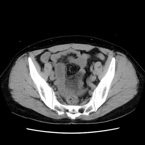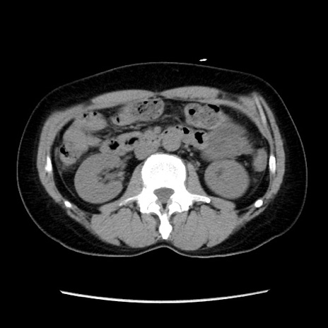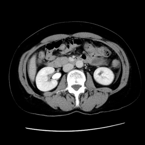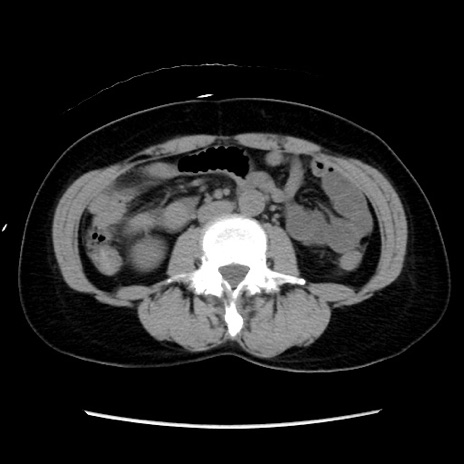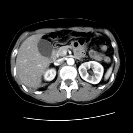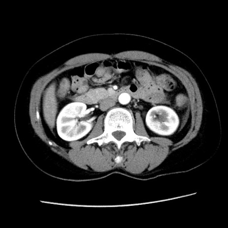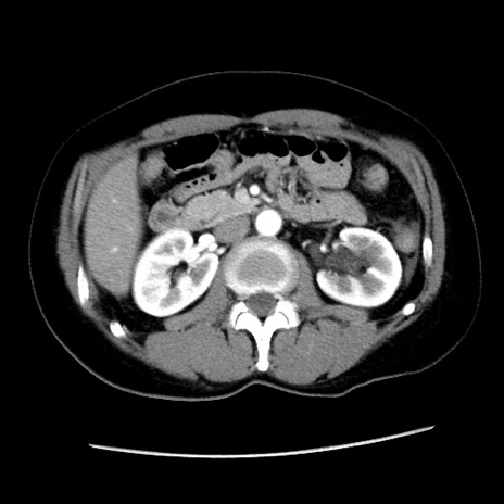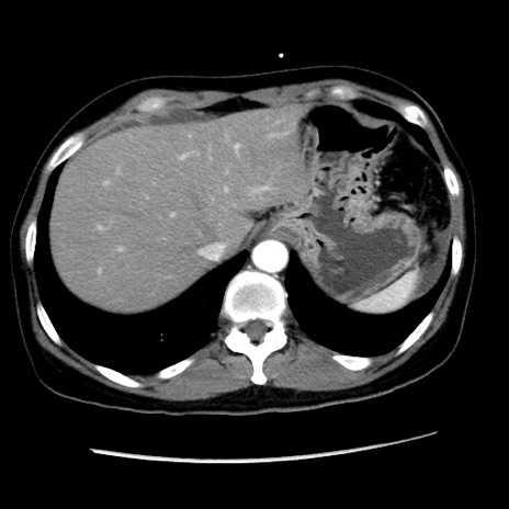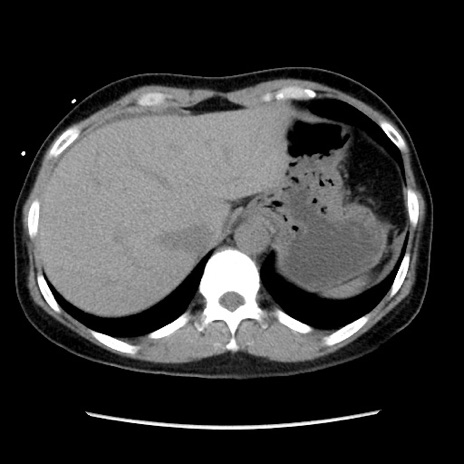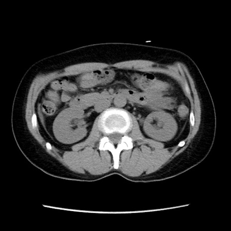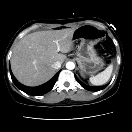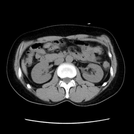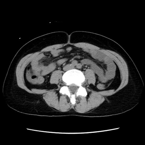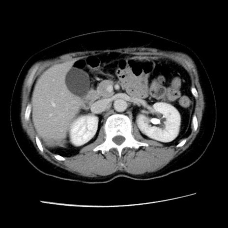 【症例】 50歳代女性 【主訴】 腹痛 【現病歴】前日生レバーを食べた。今朝に排便あり。 昼前に突然発症の腹痛を生じ、当院救急外来を受診した。 【既往歴】 子宮筋腫にてで子宮全摘後 【身体所見】 意識清明、腹部:平坦、軟、下腹部やや左を中心に圧痛・反跳痛あり、筋性防御あり 【データ】WBC 7800、CRP 0.07