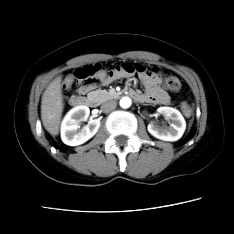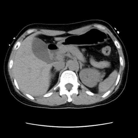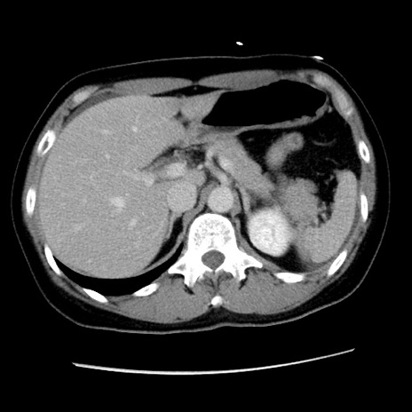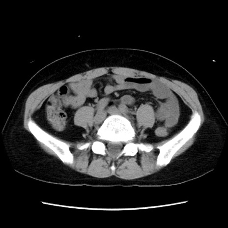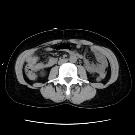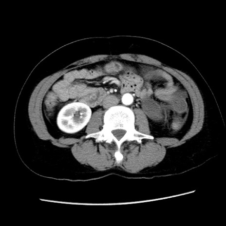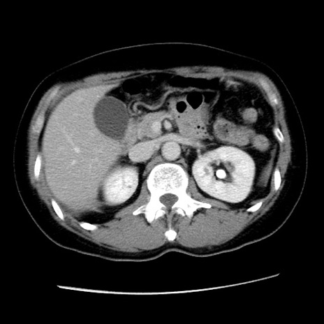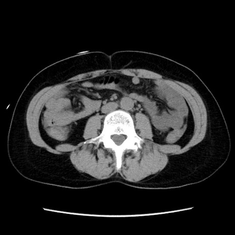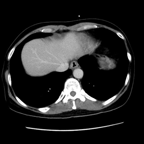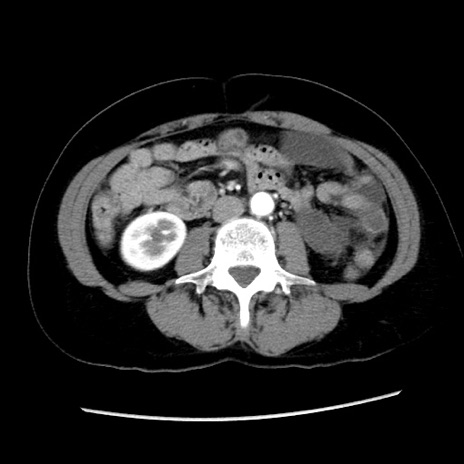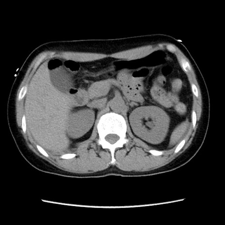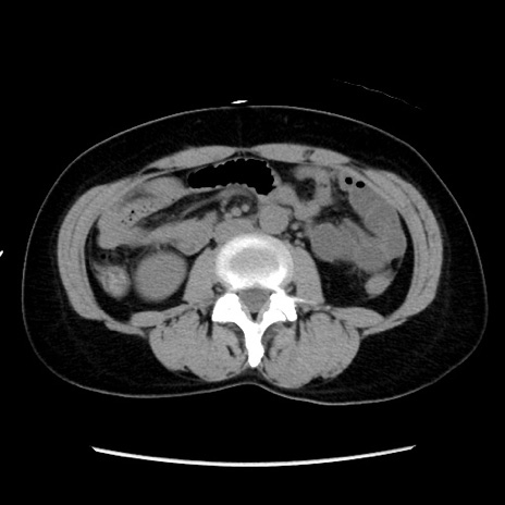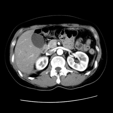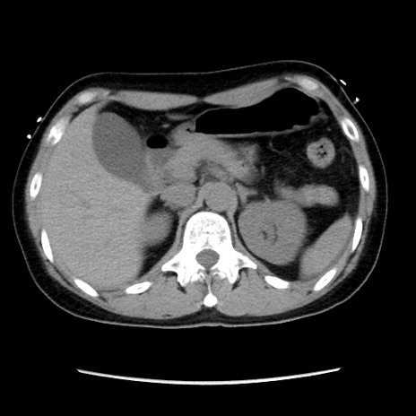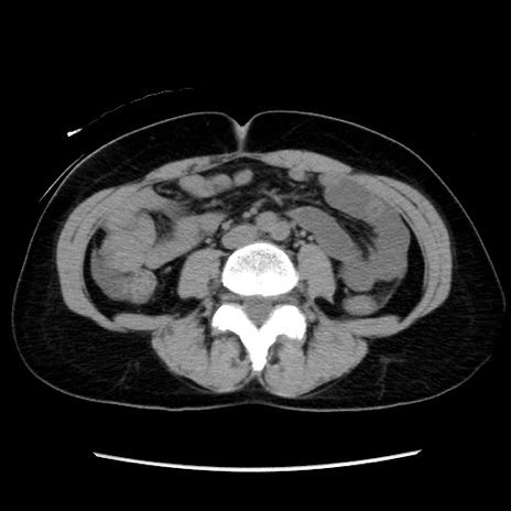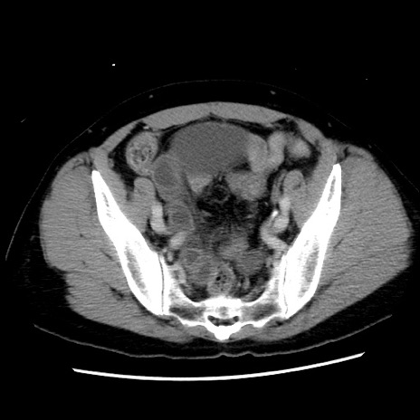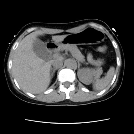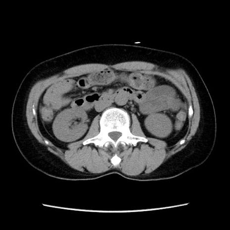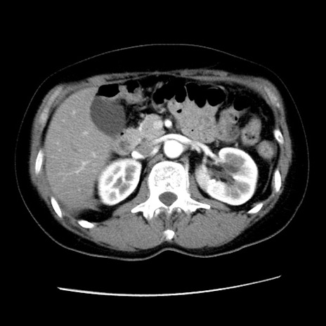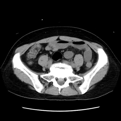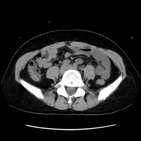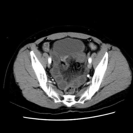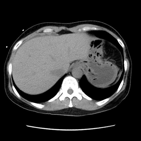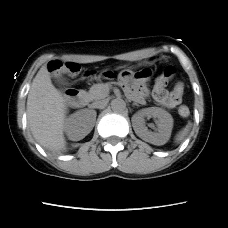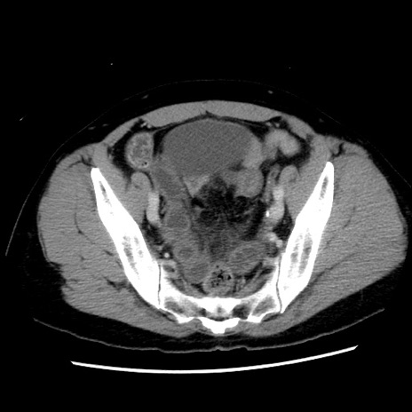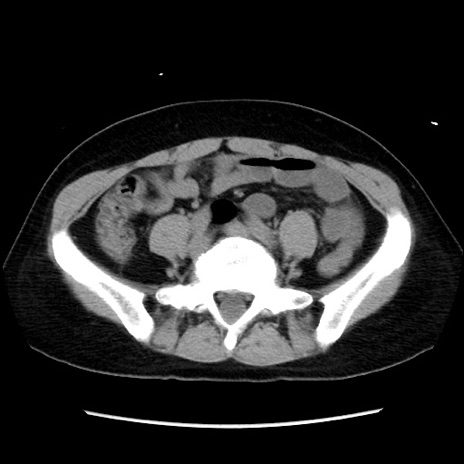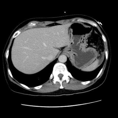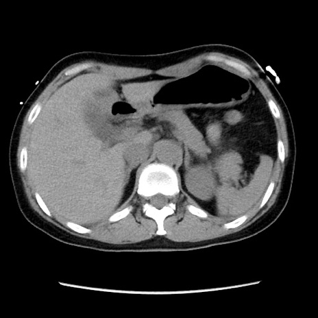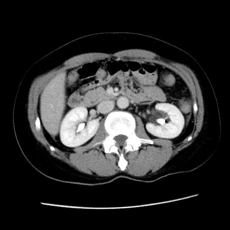 【症例】 50歳代女性 【主訴】 腹痛 【現病歴】前日生レバーを食べた。今朝に排便あり。 昼前に突然発症の腹痛を生じ、当院救急外来を受診した。 【既往歴】 子宮筋腫にてで子宮全摘後 【身体所見】 意識清明、腹部:平坦、軟、下腹部やや左を中心に圧痛・反跳痛あり、筋性防御あり 【データ】WBC 7800、CRP 0.07