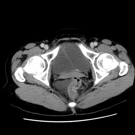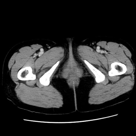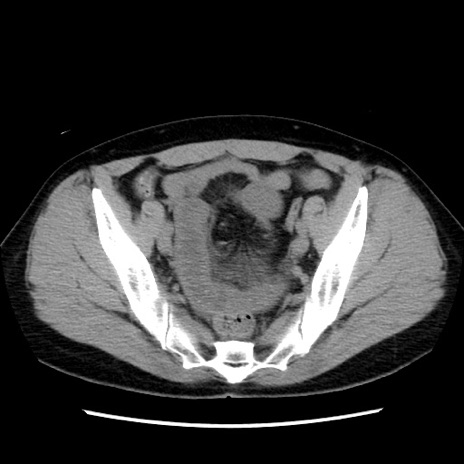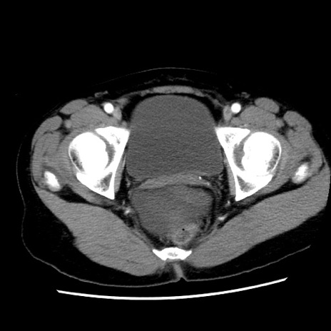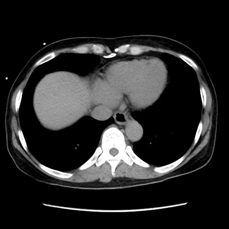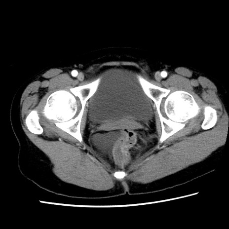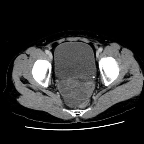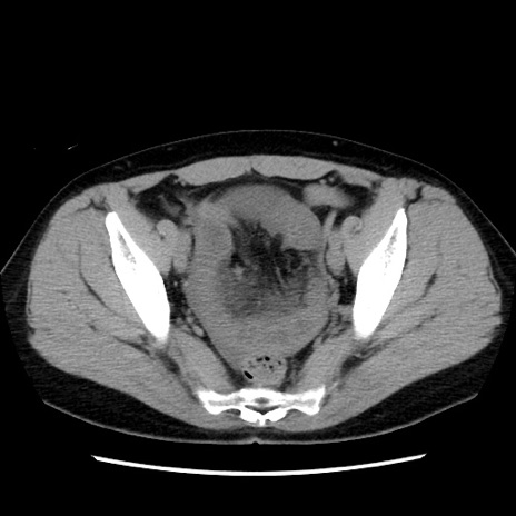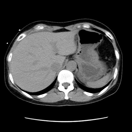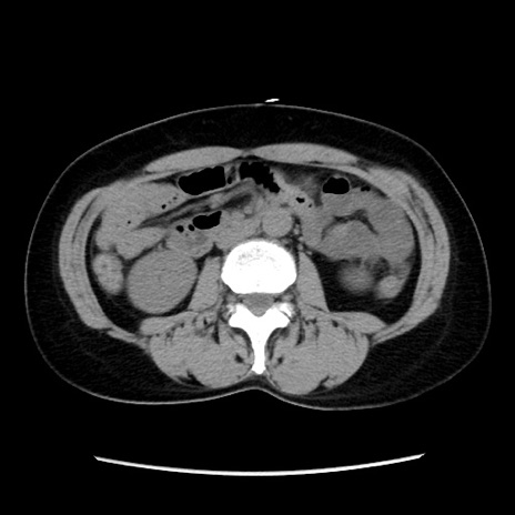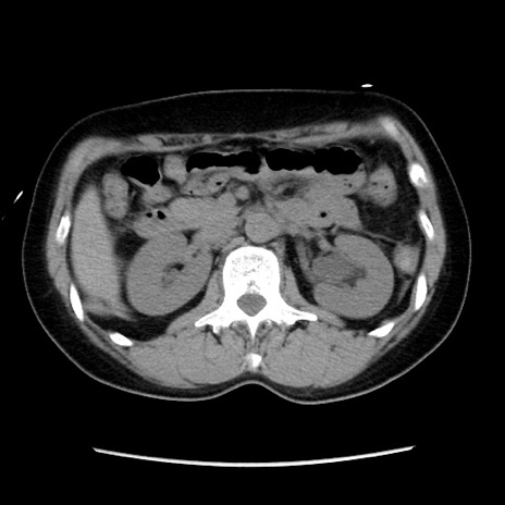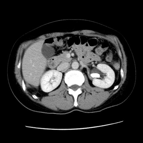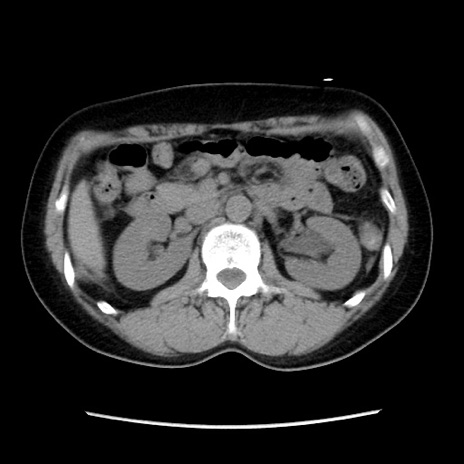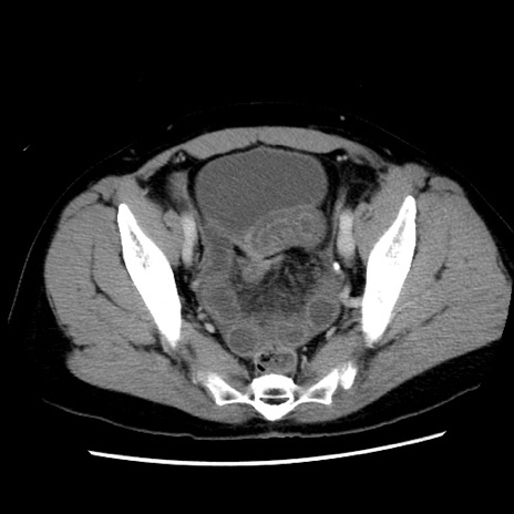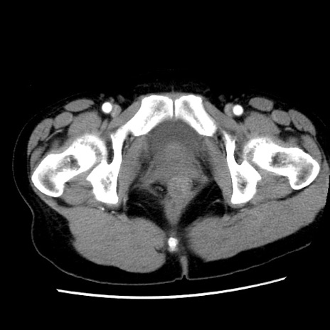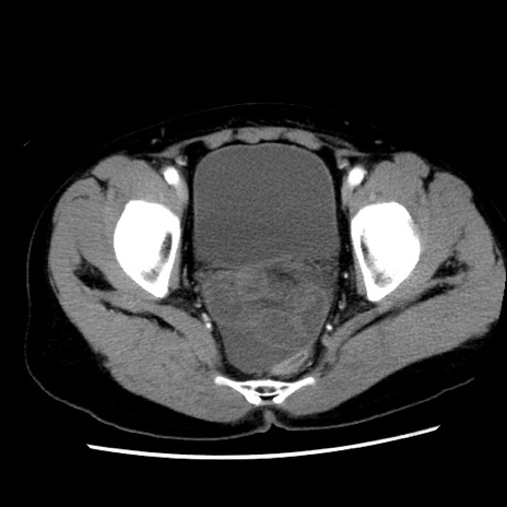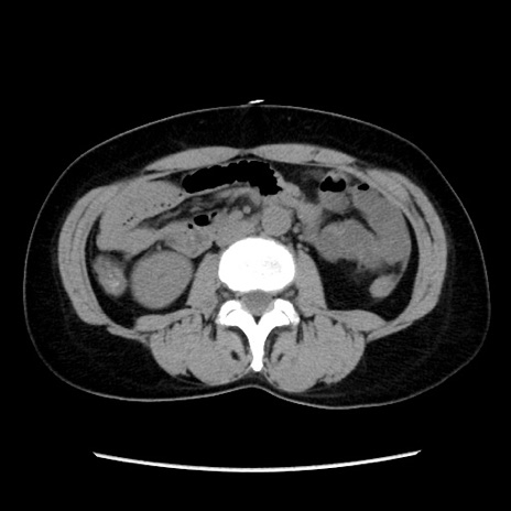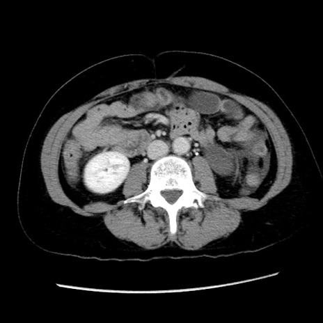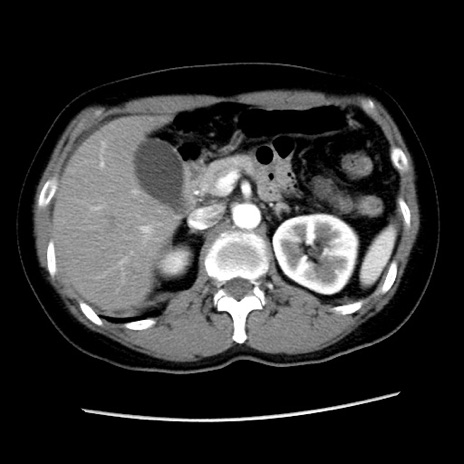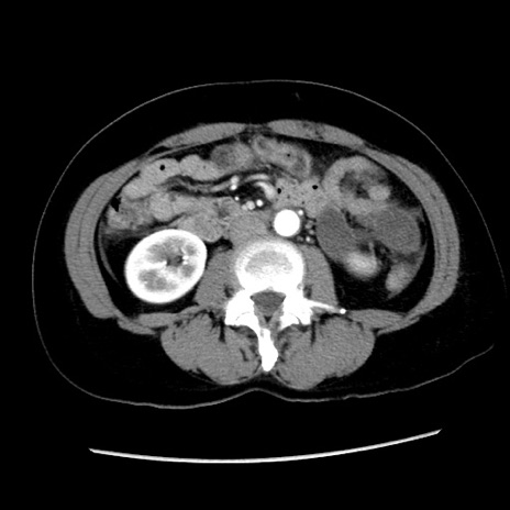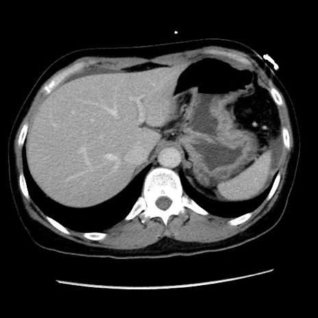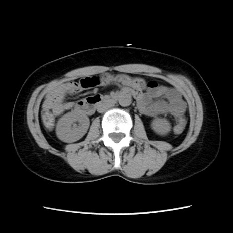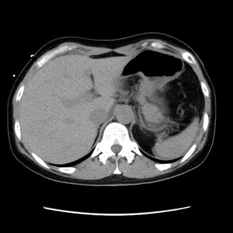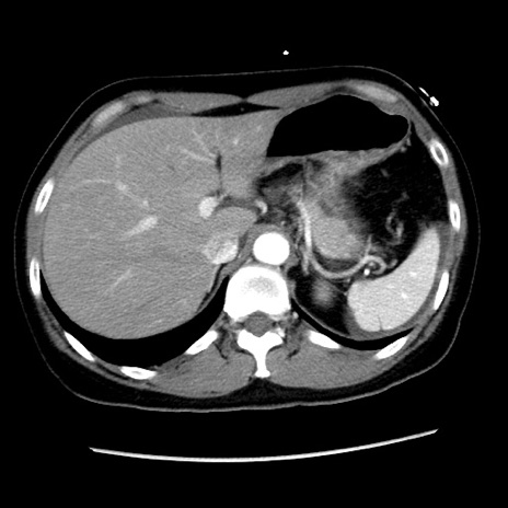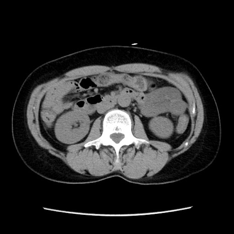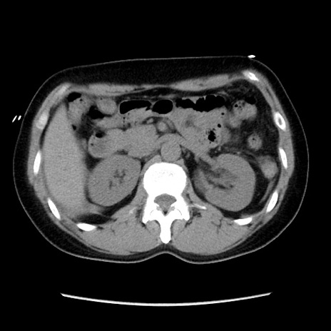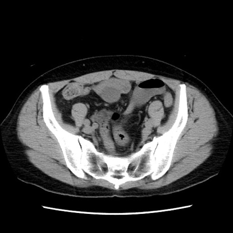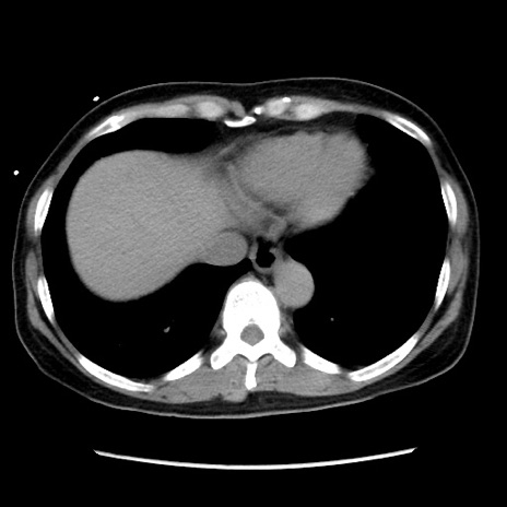 【症例】 50歳代女性 【主訴】 腹痛 【現病歴】前日生レバーを食べた。今朝に排便あり。 昼前に突然発症の腹痛を生じ、当院救急外来を受診した。 【既往歴】 子宮筋腫にてで子宮全摘後 【身体所見】 意識清明、腹部:平坦、軟、下腹部やや左を中心に圧痛・反跳痛あり、筋性防御あり 【データ】WBC 7800、CRP 0.07