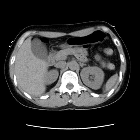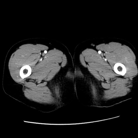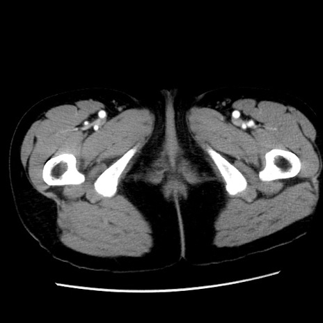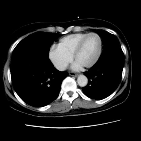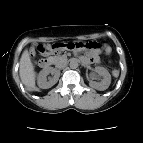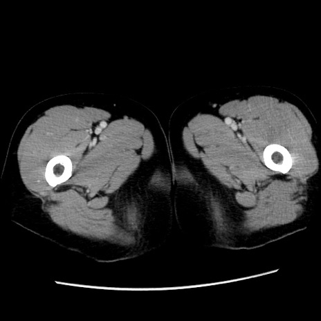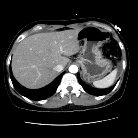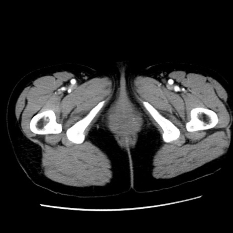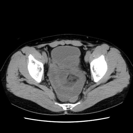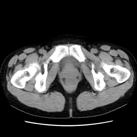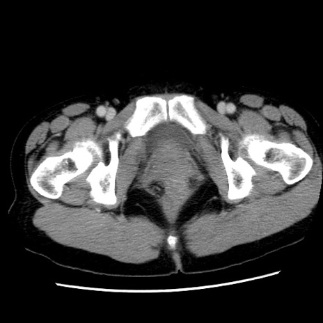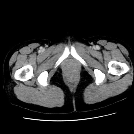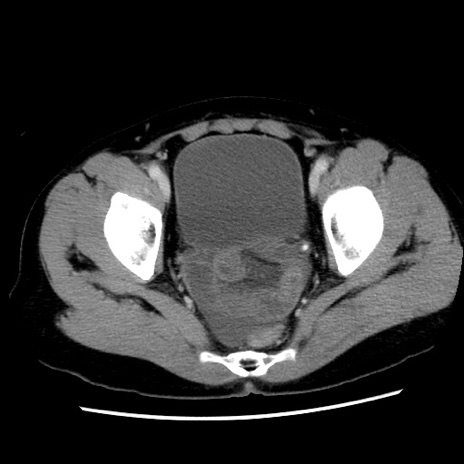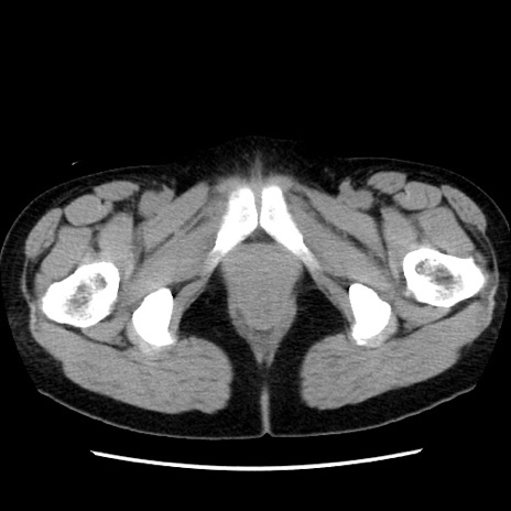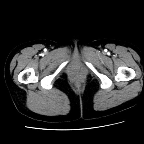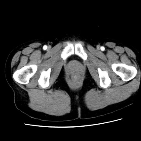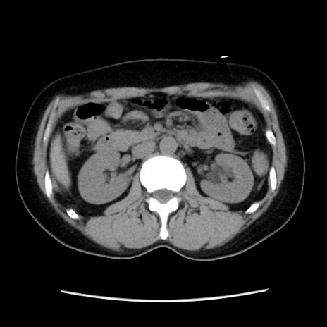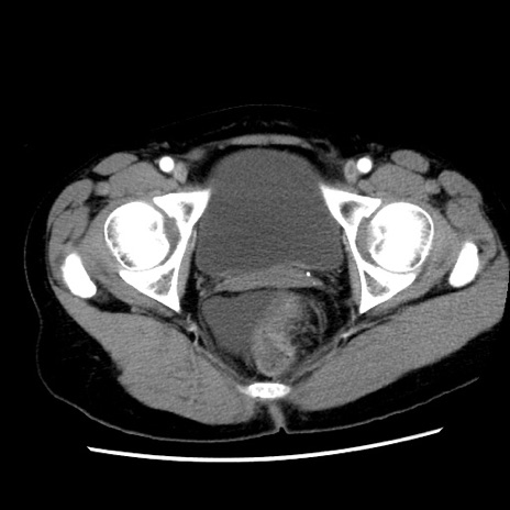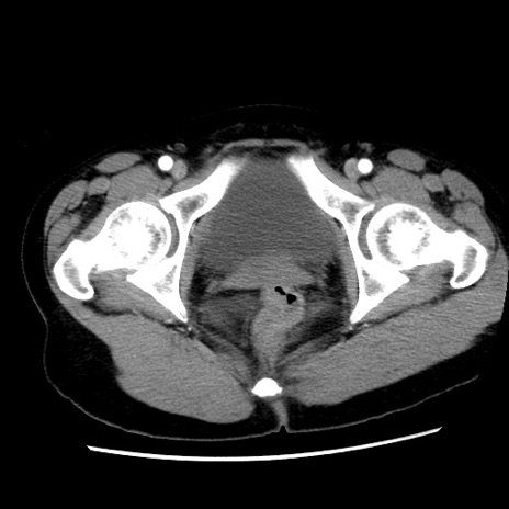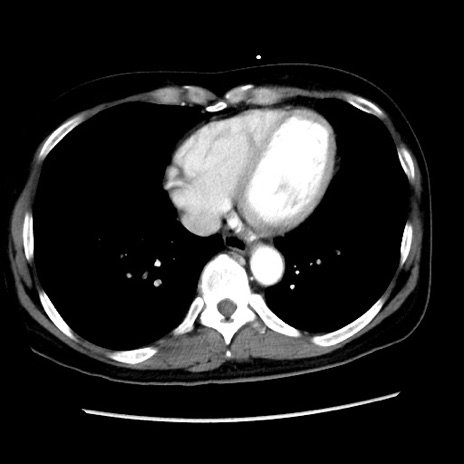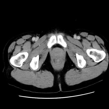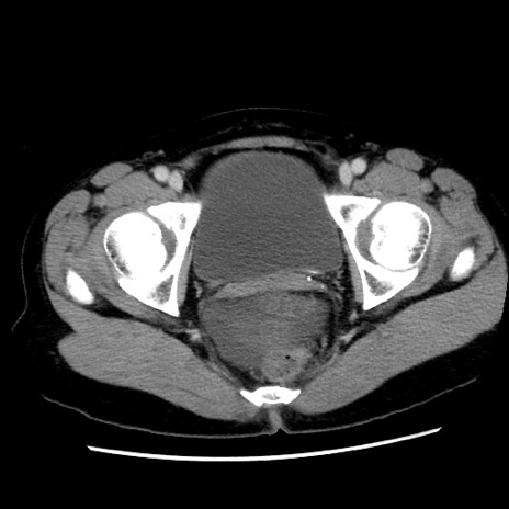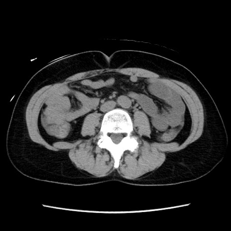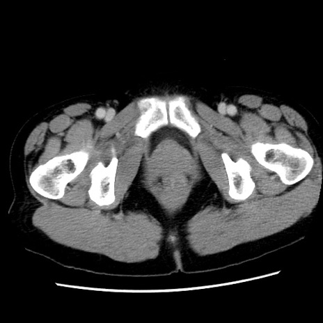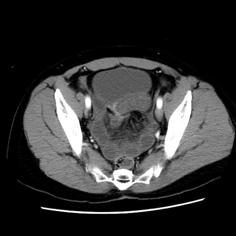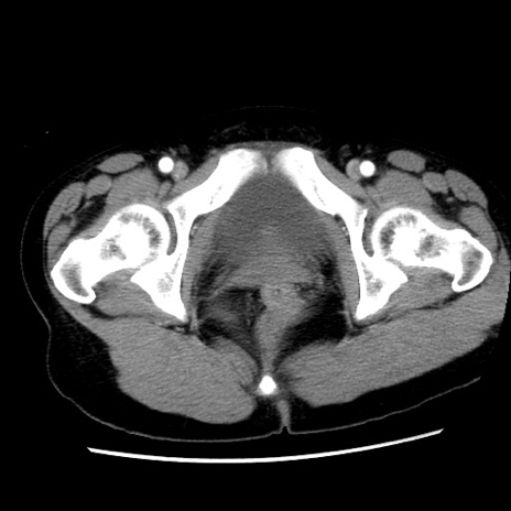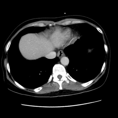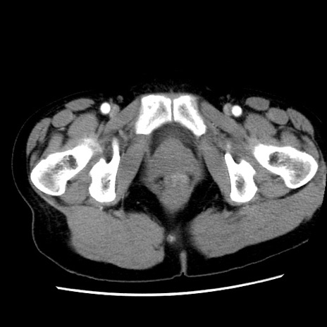 【症例】 50歳代女性 【主訴】 腹痛 【現病歴】前日生レバーを食べた。今朝に排便あり。 昼前に突然発症の腹痛を生じ、当院救急外来を受診した。 【既往歴】 子宮筋腫にてで子宮全摘後 【身体所見】 意識清明、腹部:平坦、軟、下腹部やや左を中心に圧痛・反跳痛あり、筋性防御あり 【データ】WBC 7800、CRP 0.07