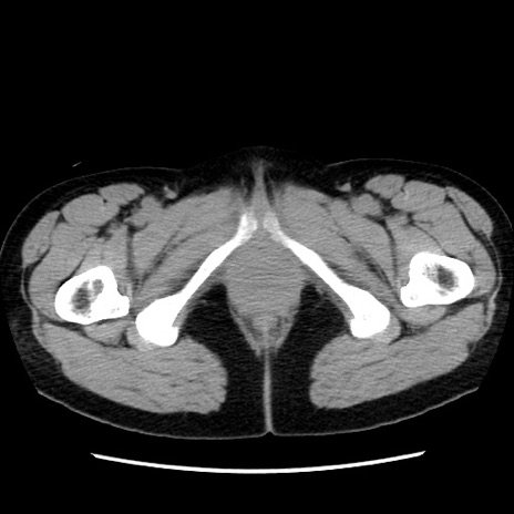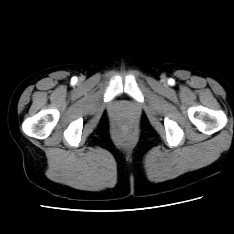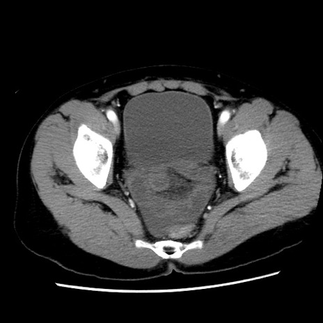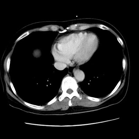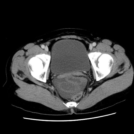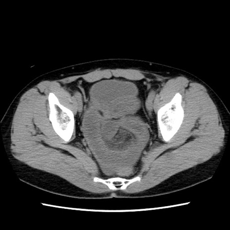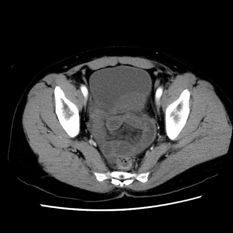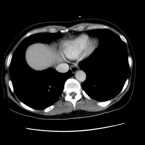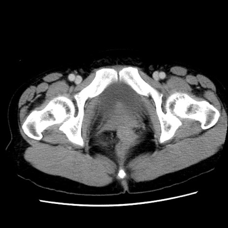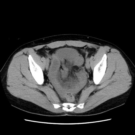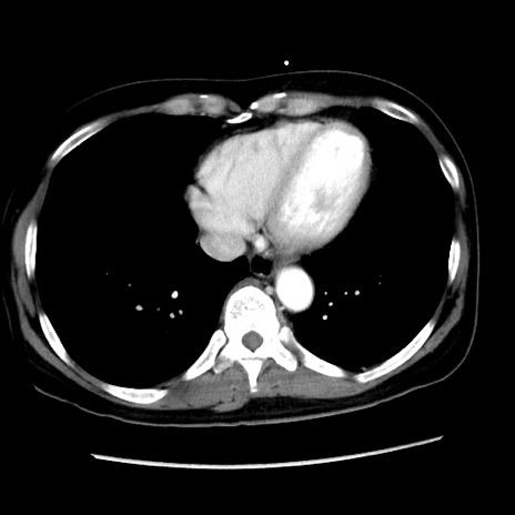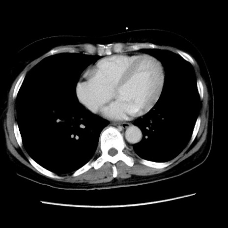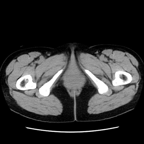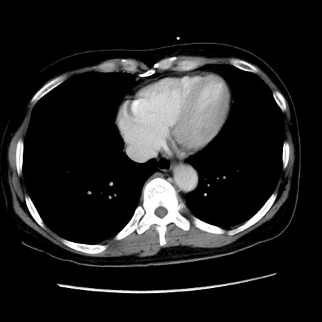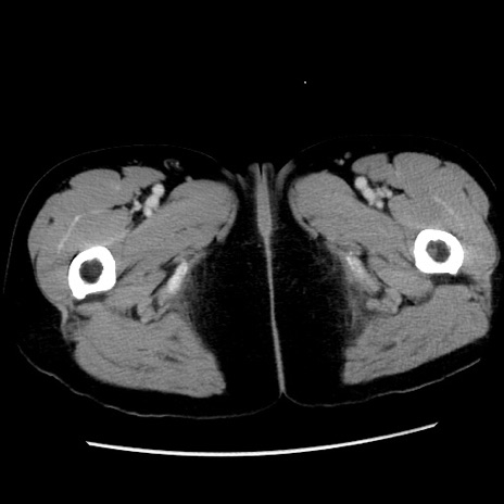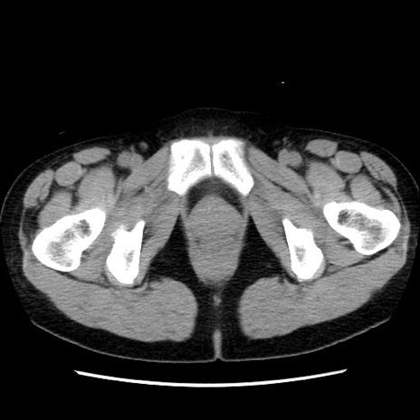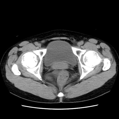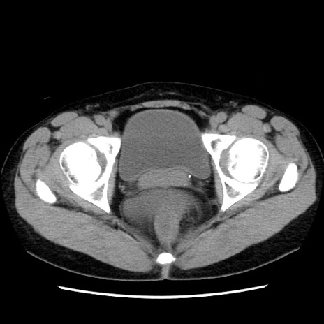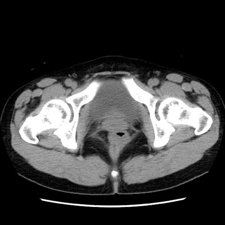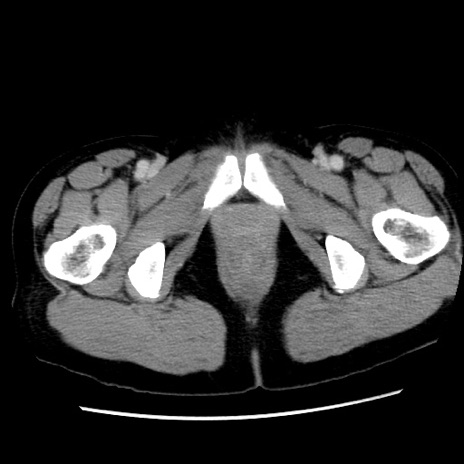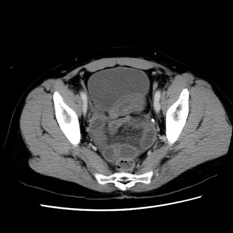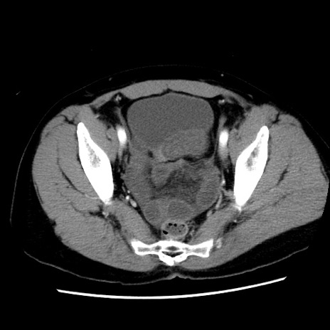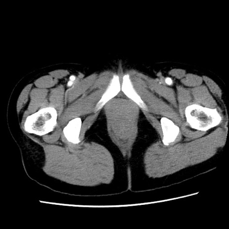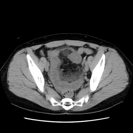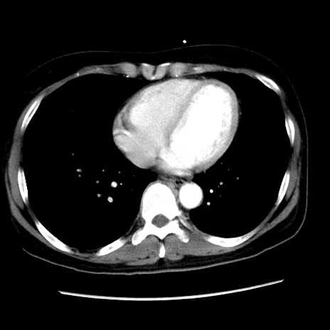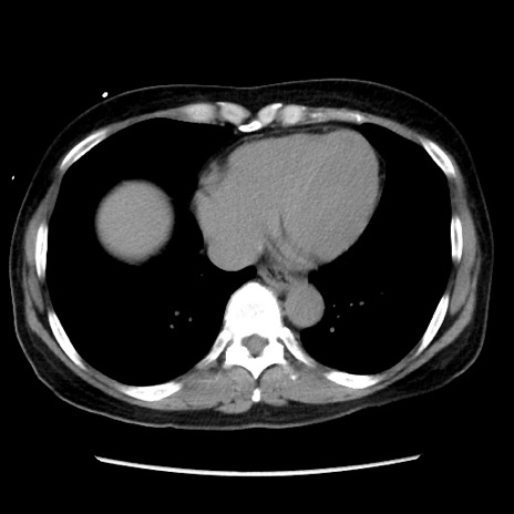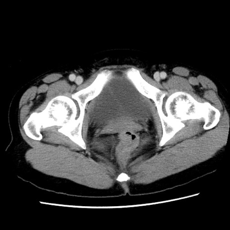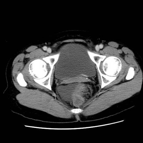 【症例】 50歳代女性 【主訴】 腹痛 【現病歴】前日生レバーを食べた。今朝に排便あり。 昼前に突然発症の腹痛を生じ、当院救急外来を受診した。 【既往歴】 子宮筋腫にてで子宮全摘後 【身体所見】 意識清明、腹部:平坦、軟、下腹部やや左を中心に圧痛・反跳痛あり、筋性防御あり 【データ】WBC 7800、CRP 0.07